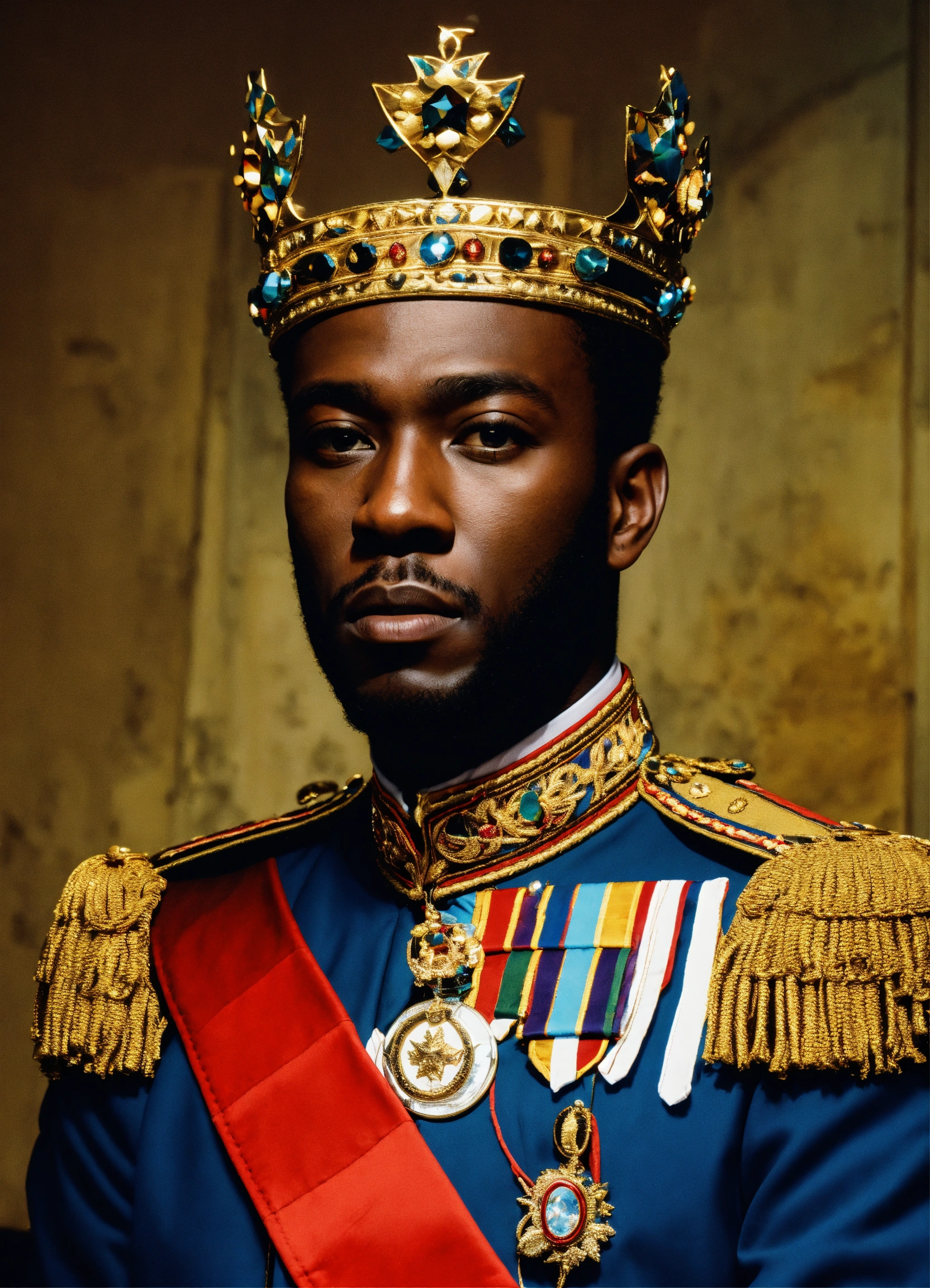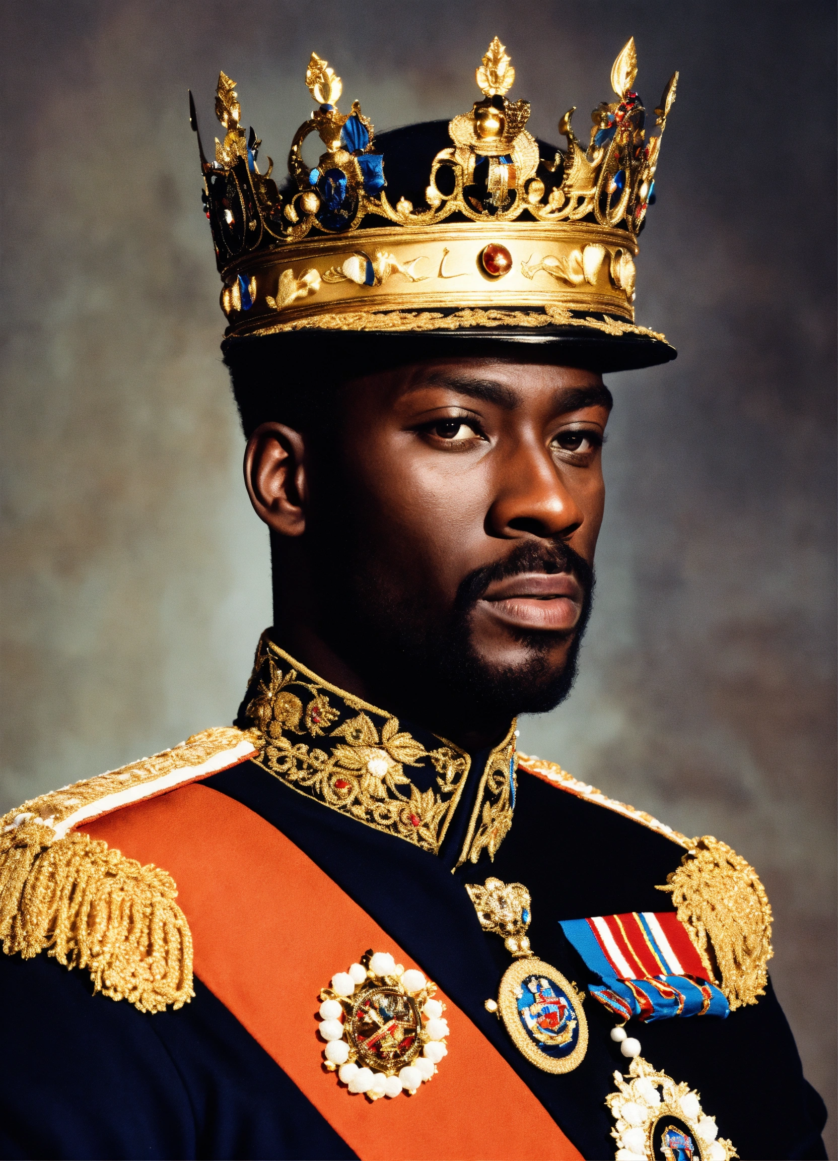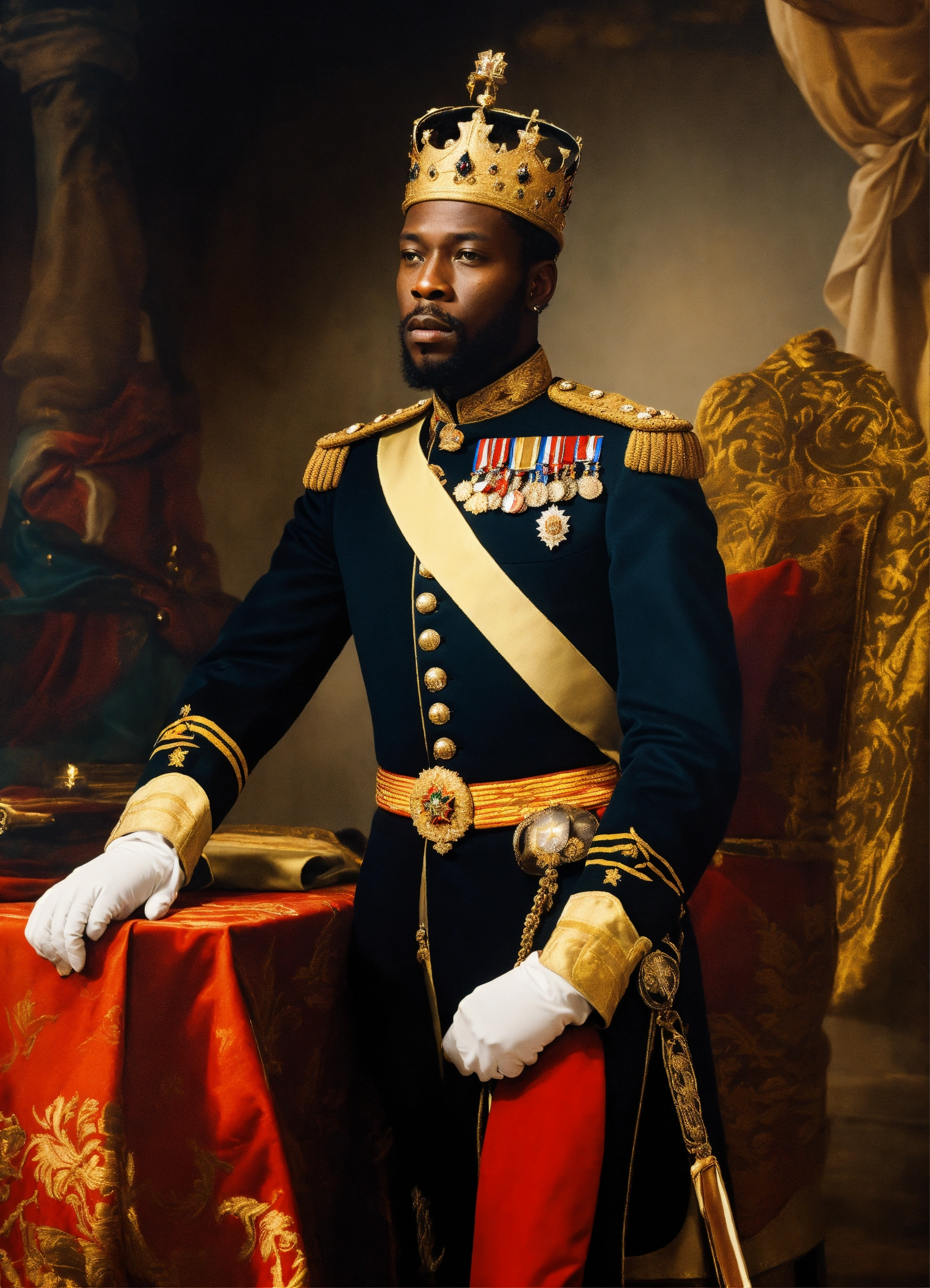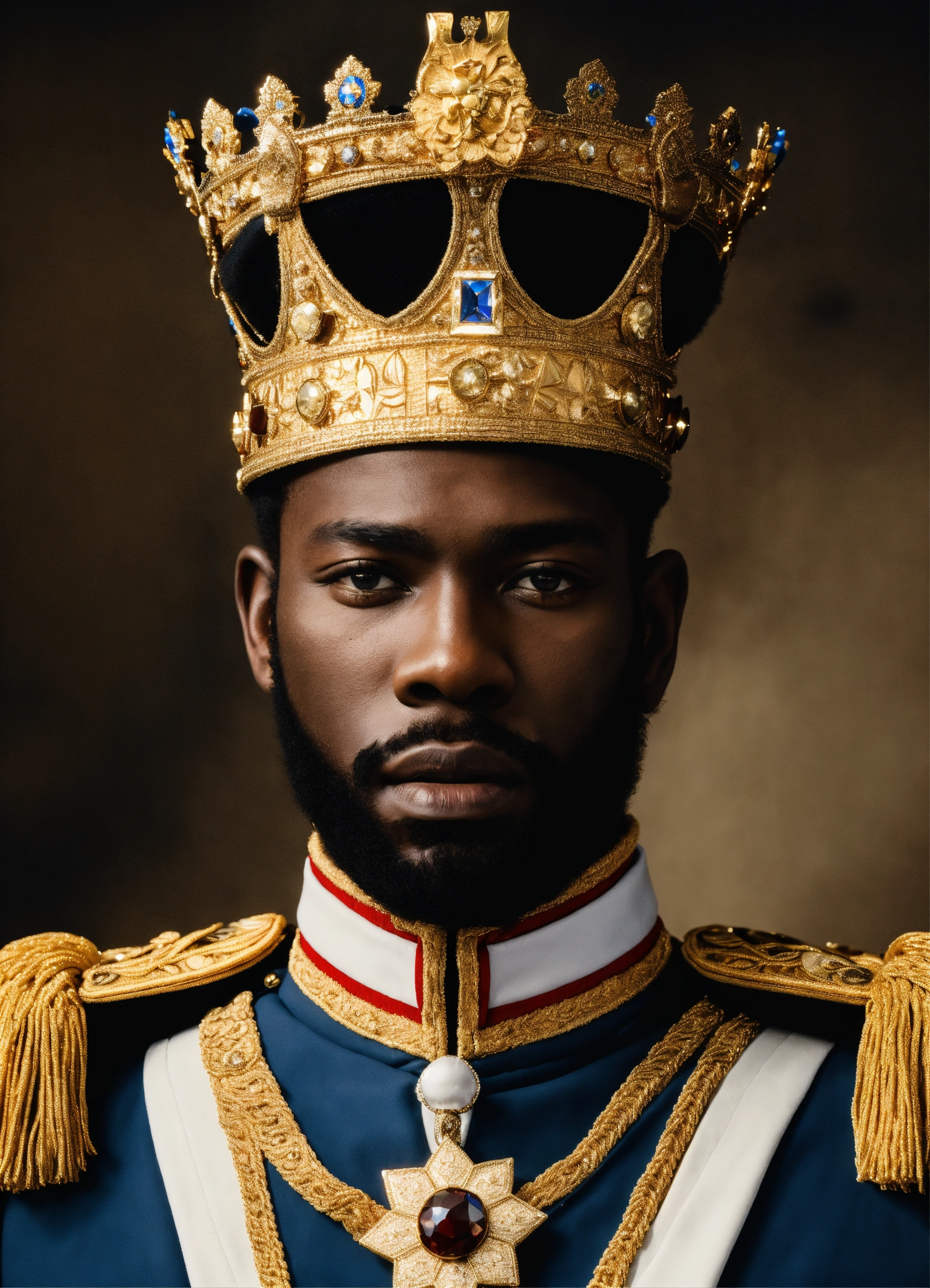 A black king wearing a crown in a military uniform
