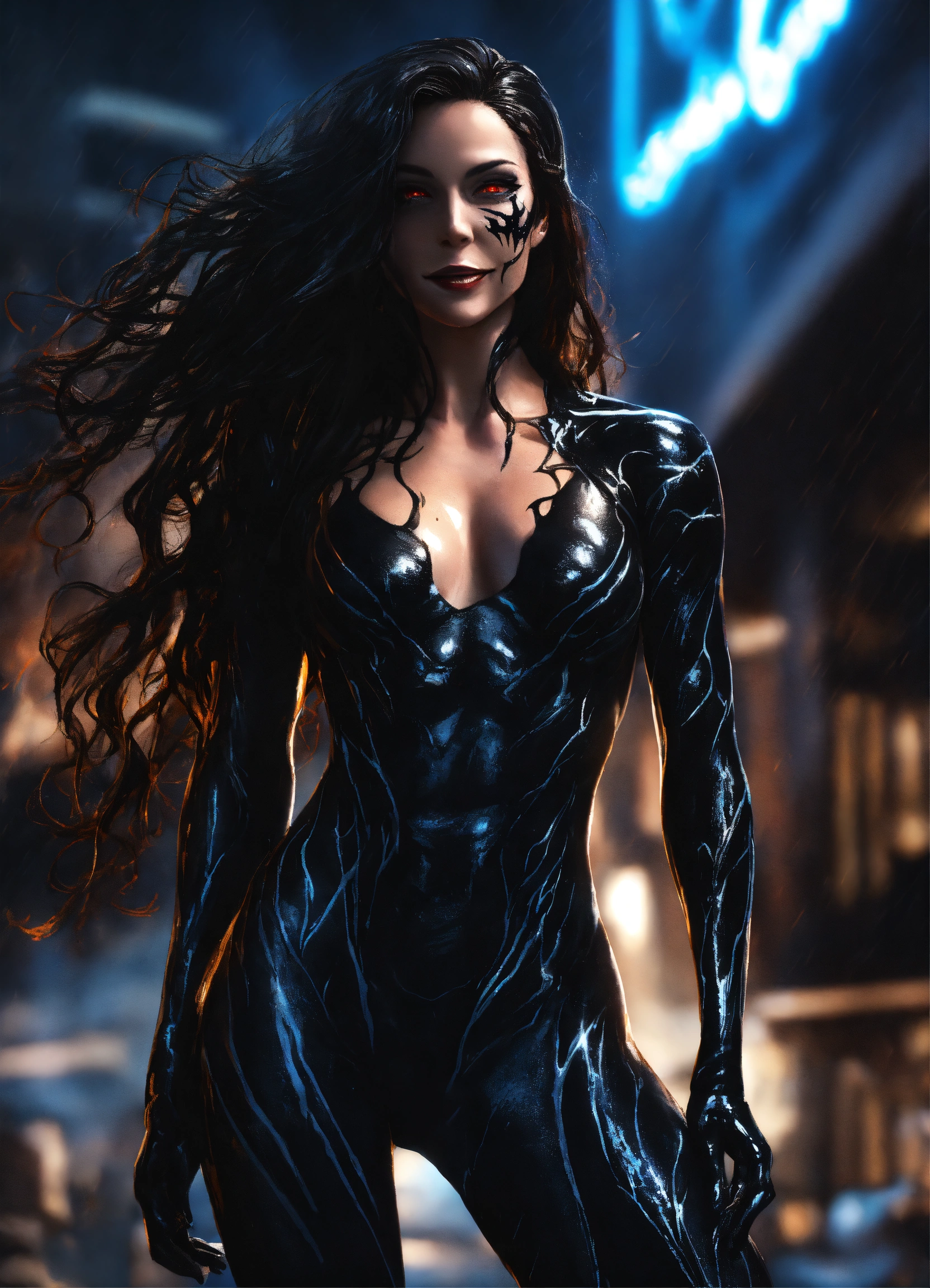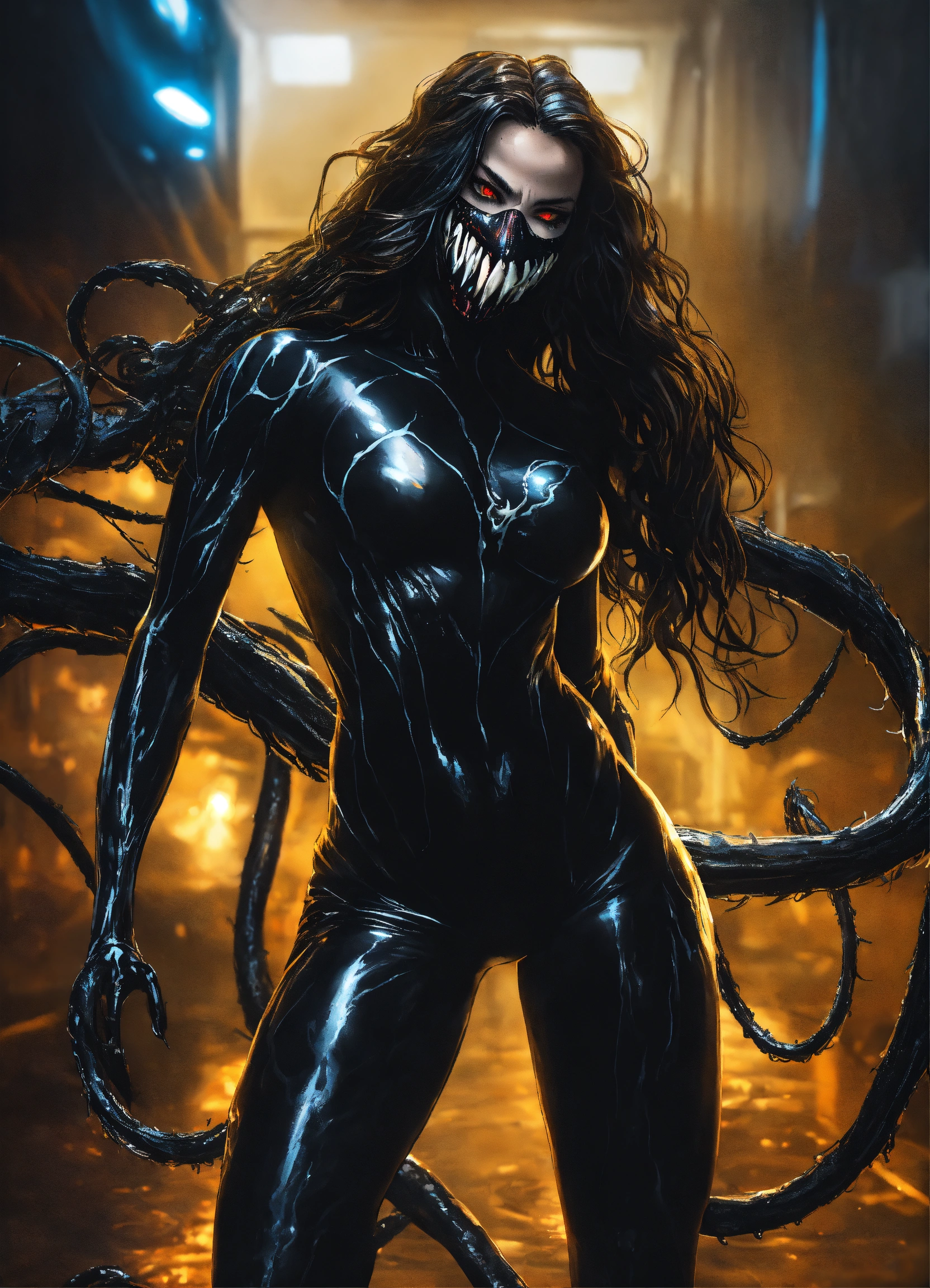 An ultrarealistic full body photograph of woman venom symbiote, laying in dark black liquid, long hair, evil smile, evil glowing eyes, venom symbiote on skin, liquid short top, liquid short pants, venom symbiote, 8k