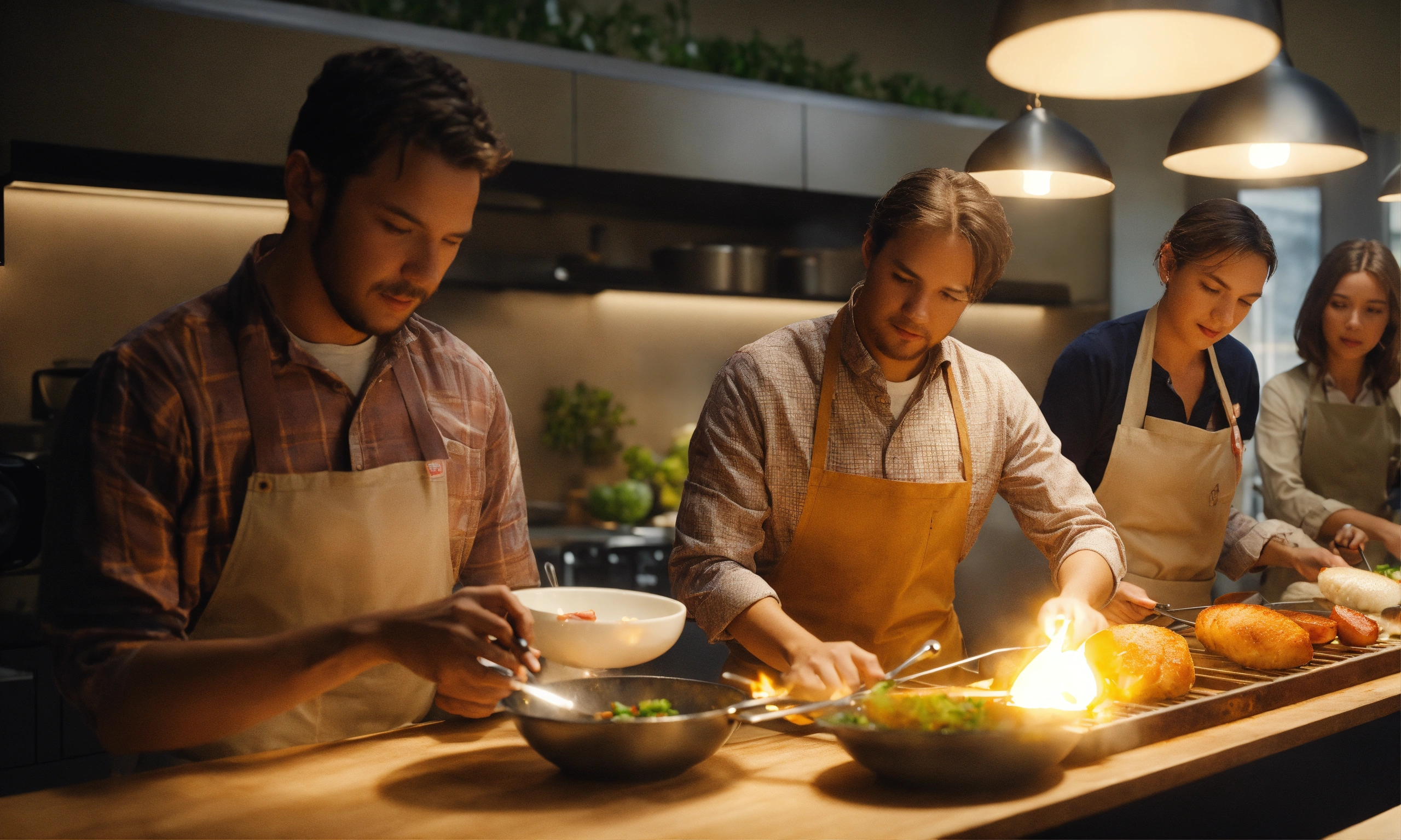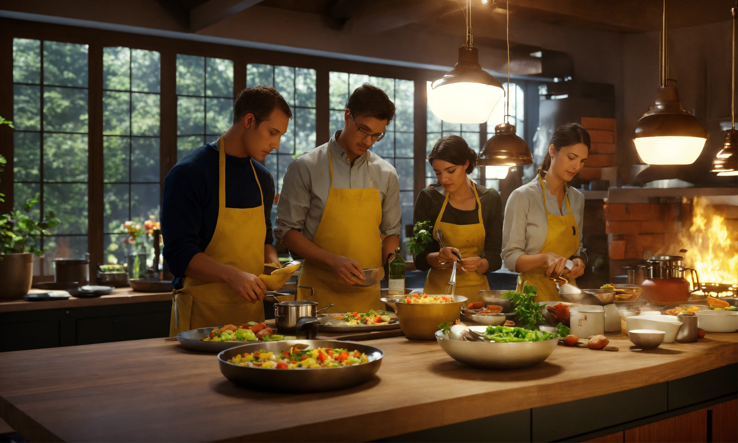 Team of people. teacher's master class for a group of people on cooking. octane render, trending on artstation, highly detailed, lighting, professional, realistic, sharp focus, 4k, 8k, high resolution, candid, personal, –testp, bright lighting, ultra-detailed, bright lighting, photo, high quality photo, cinematic shot, volumetric light, imax