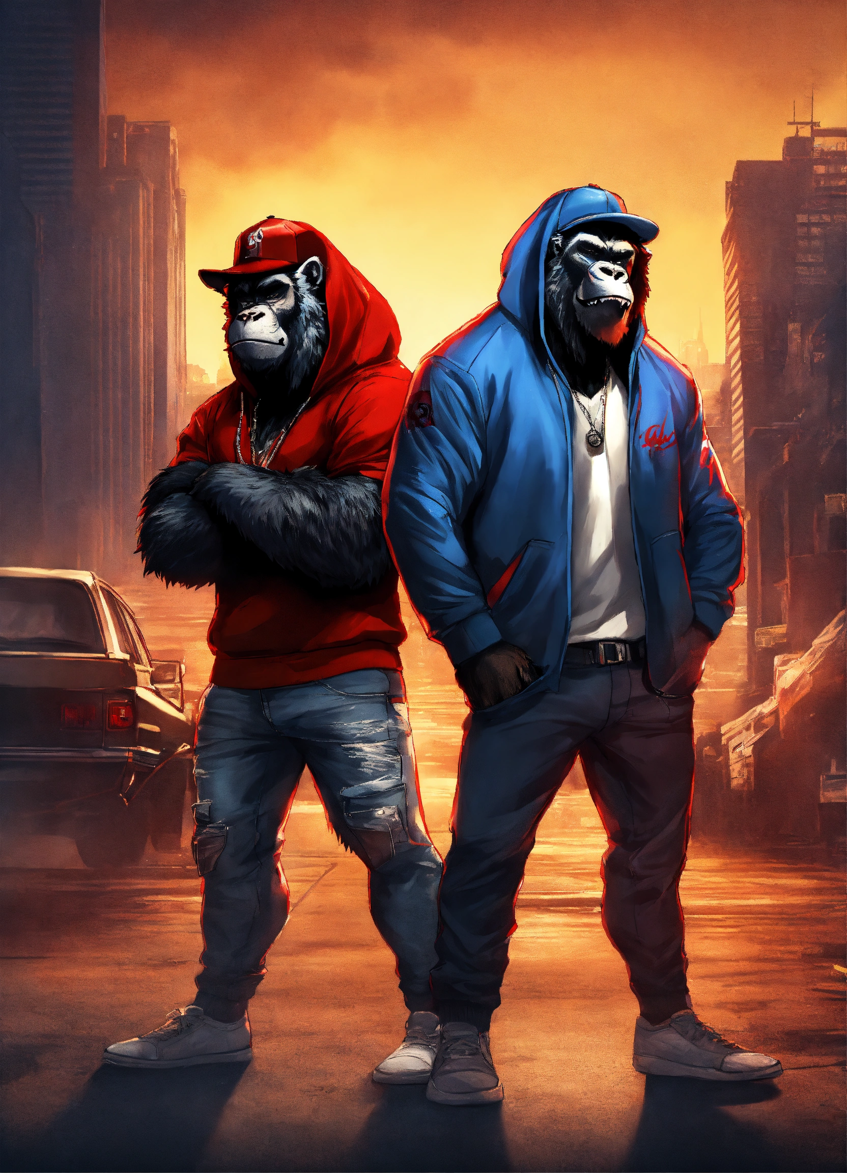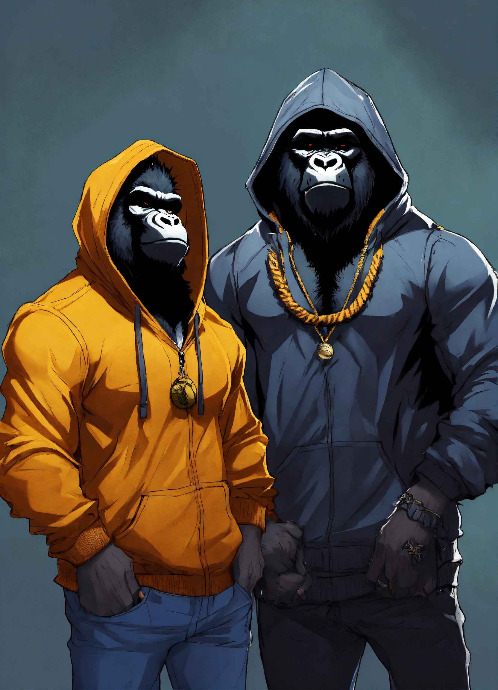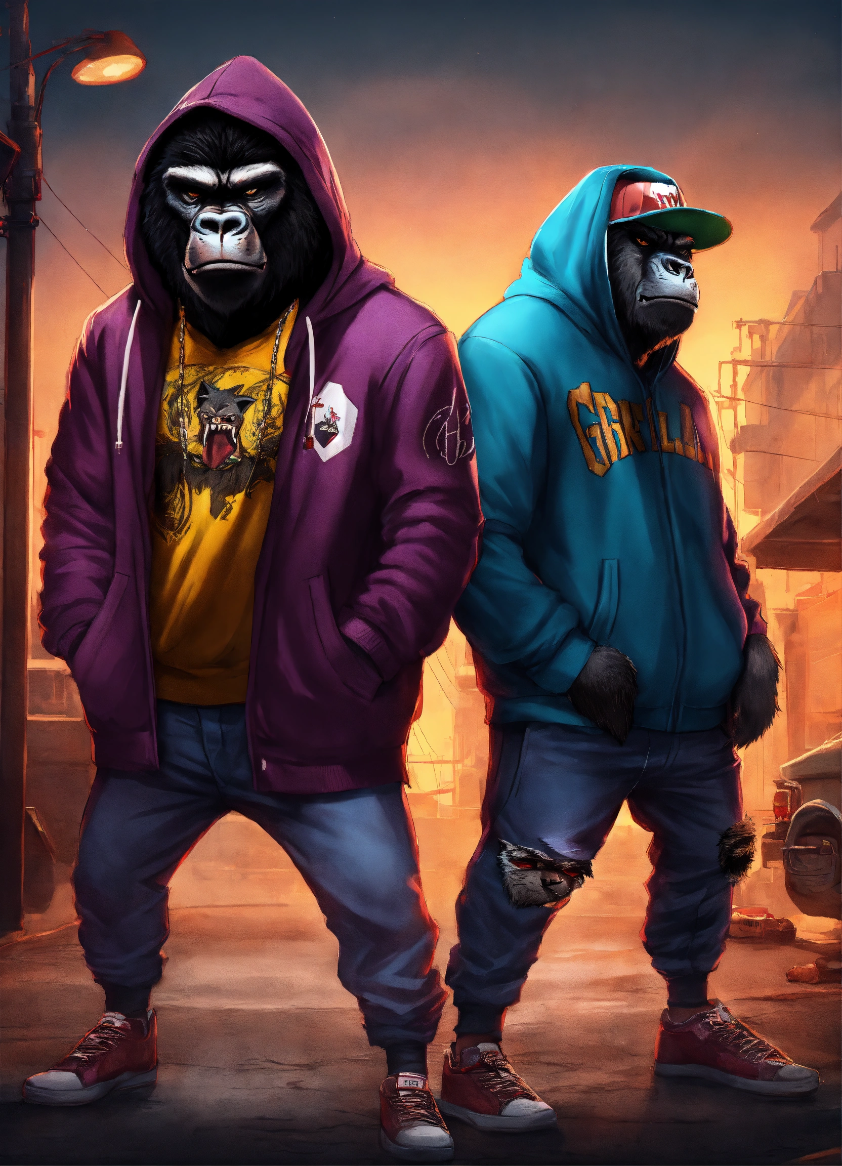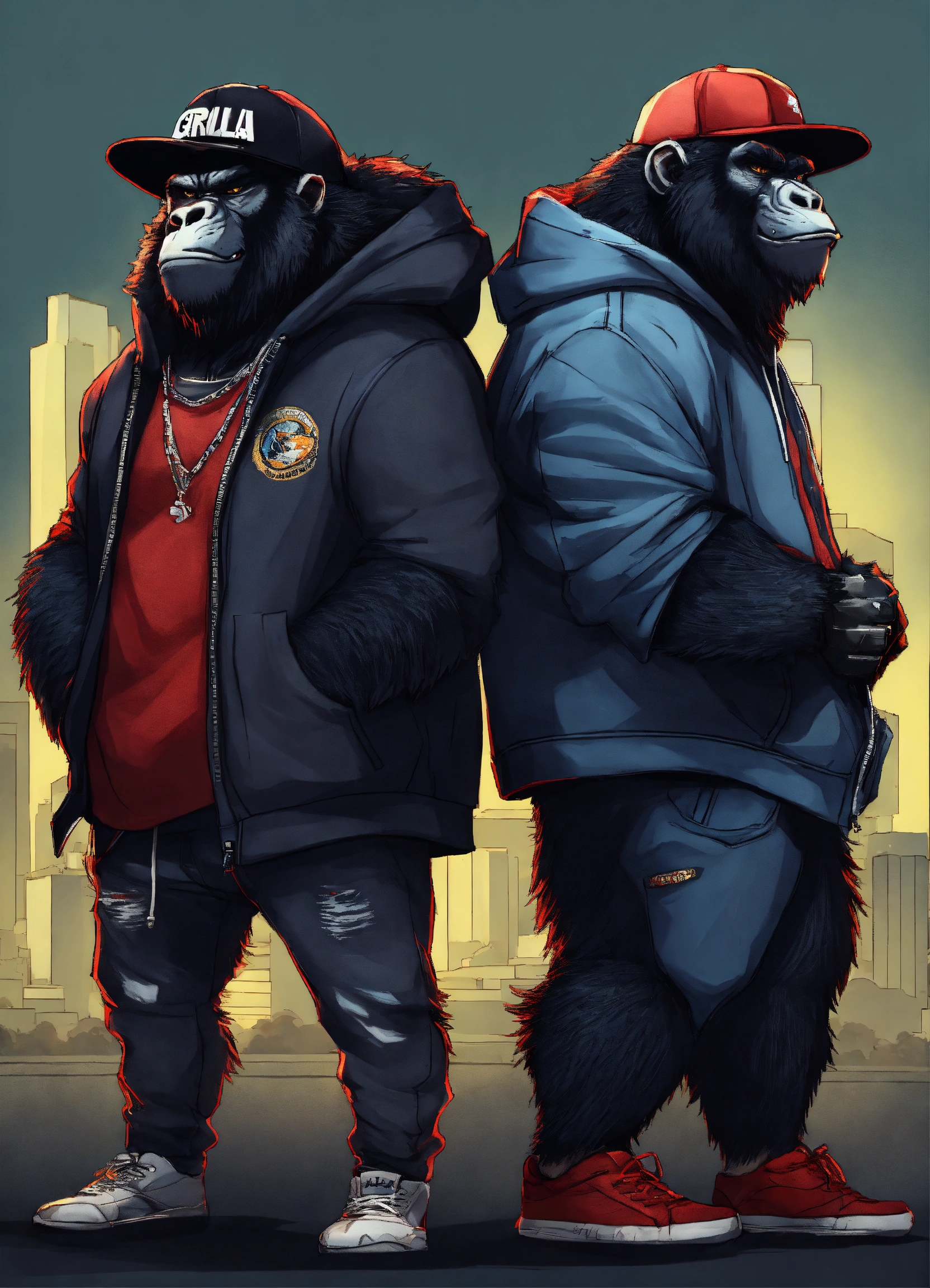 Gangster werewolf and gangster gorilla wearing hoodies and baseball cap standing back to back