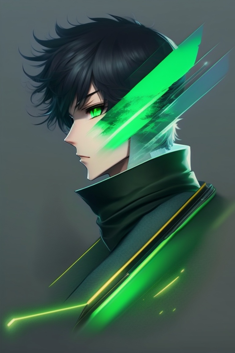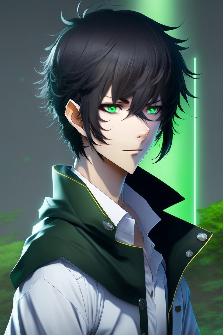Anime boy with black hair one curl colored green, swamp eyes white t-shirt black mask and white gloves