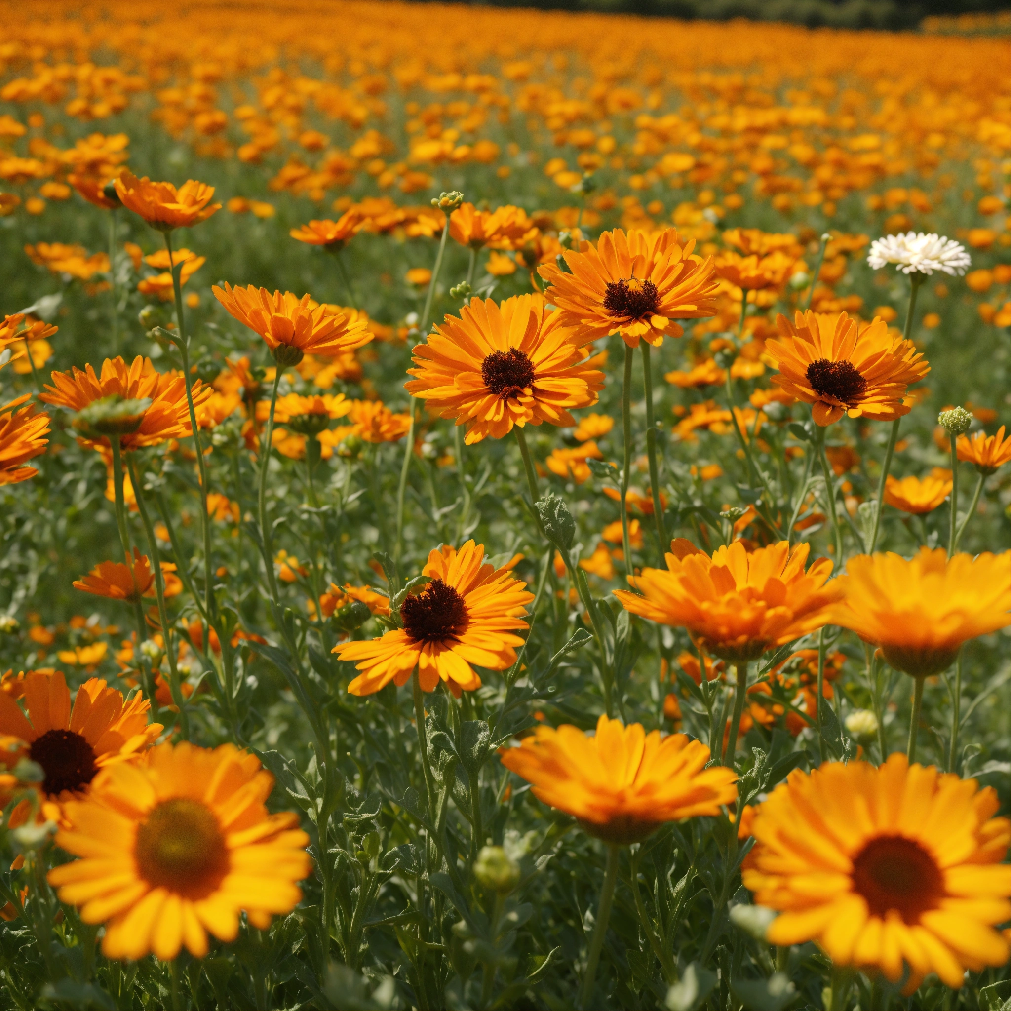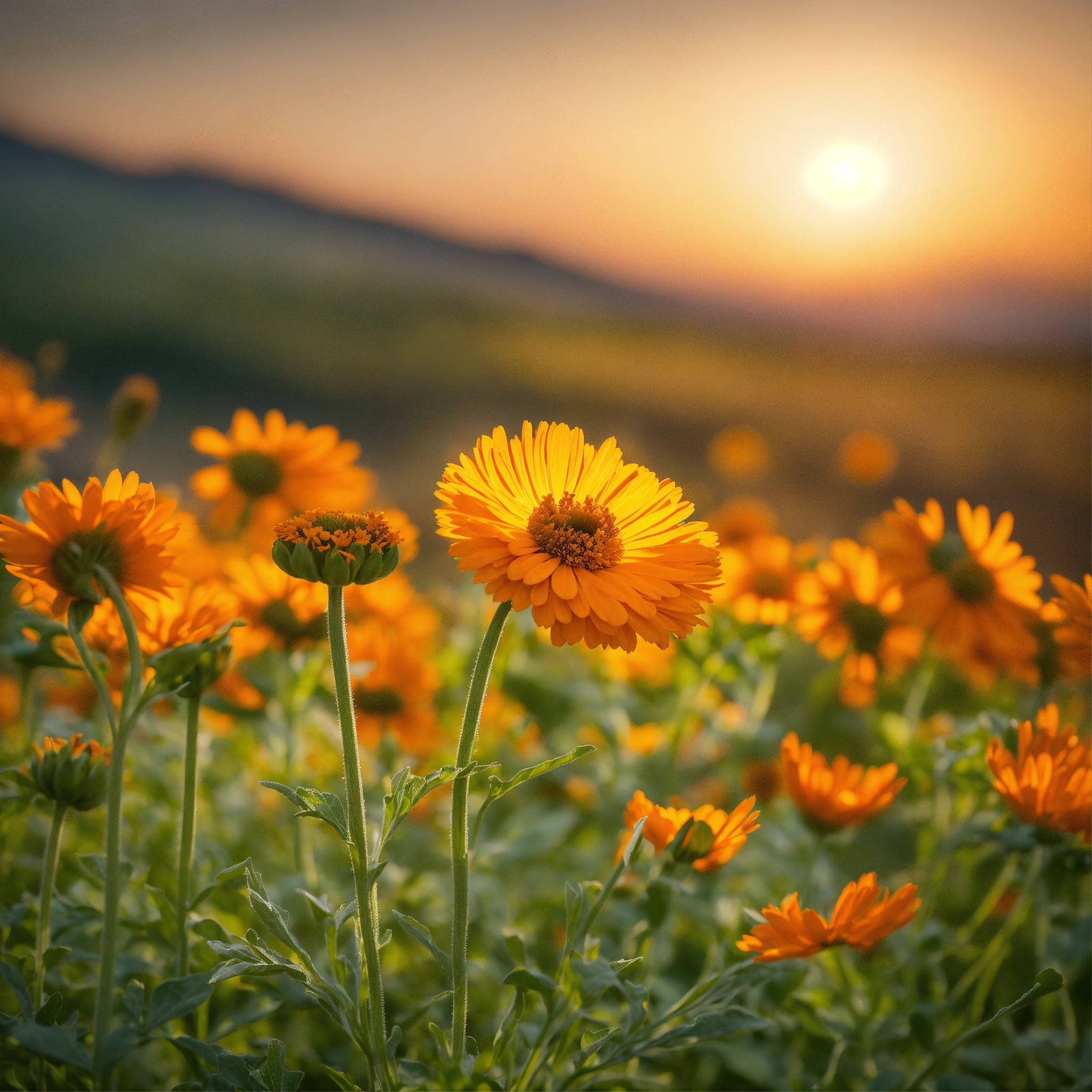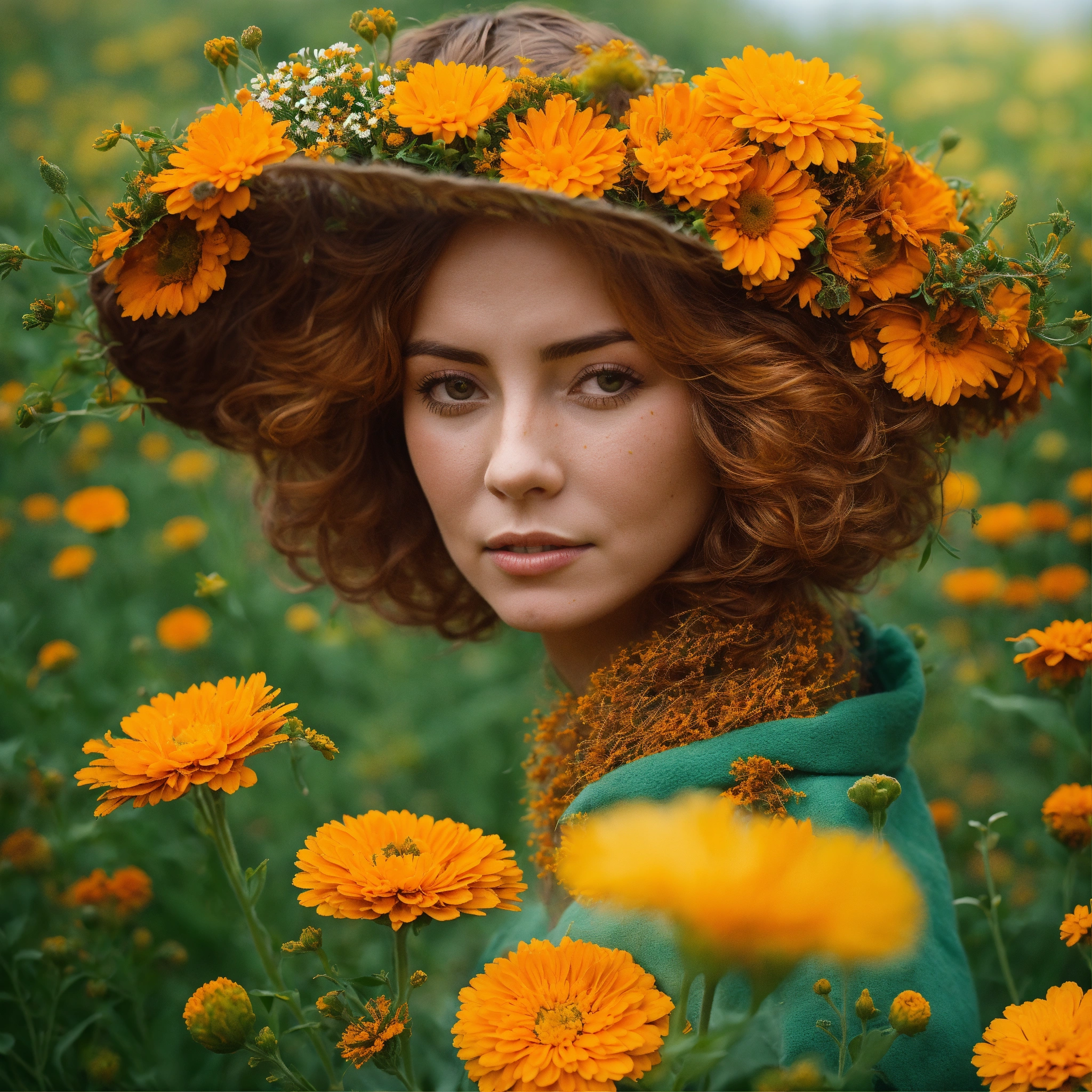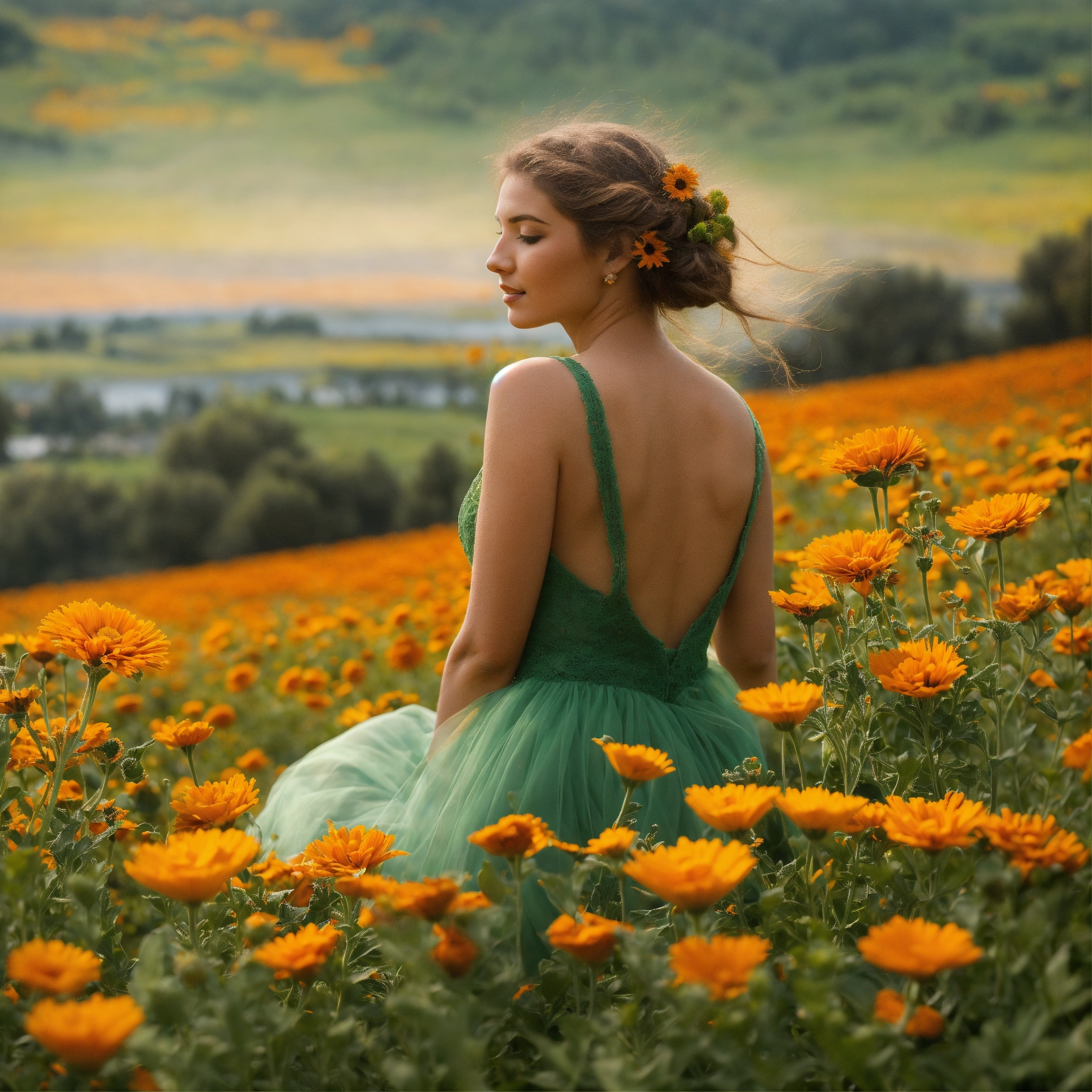 Dama sofisticata che ammira silenziosamente i fiori di calendula sulla collina verde, trasmettendo gioia e felicità.