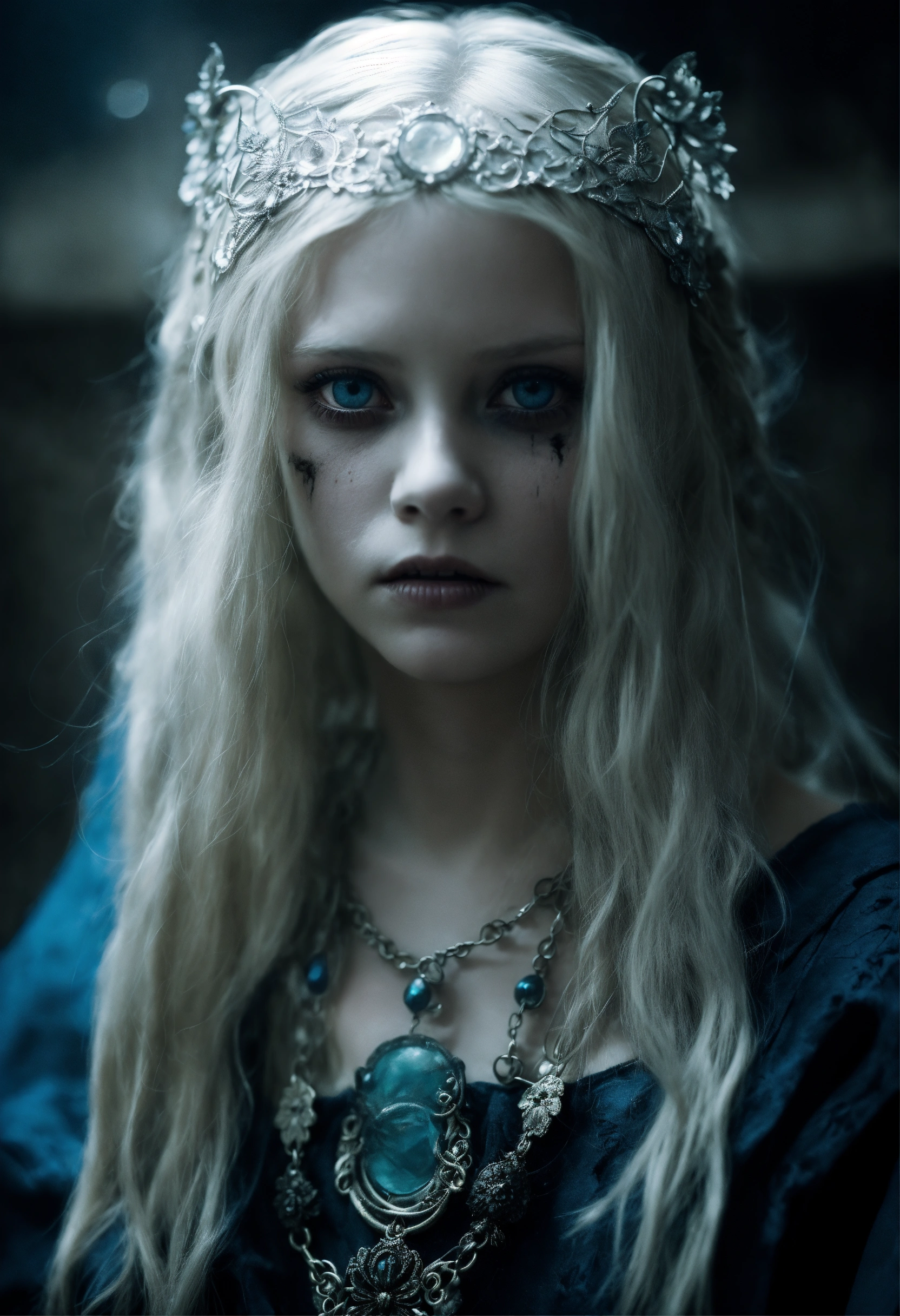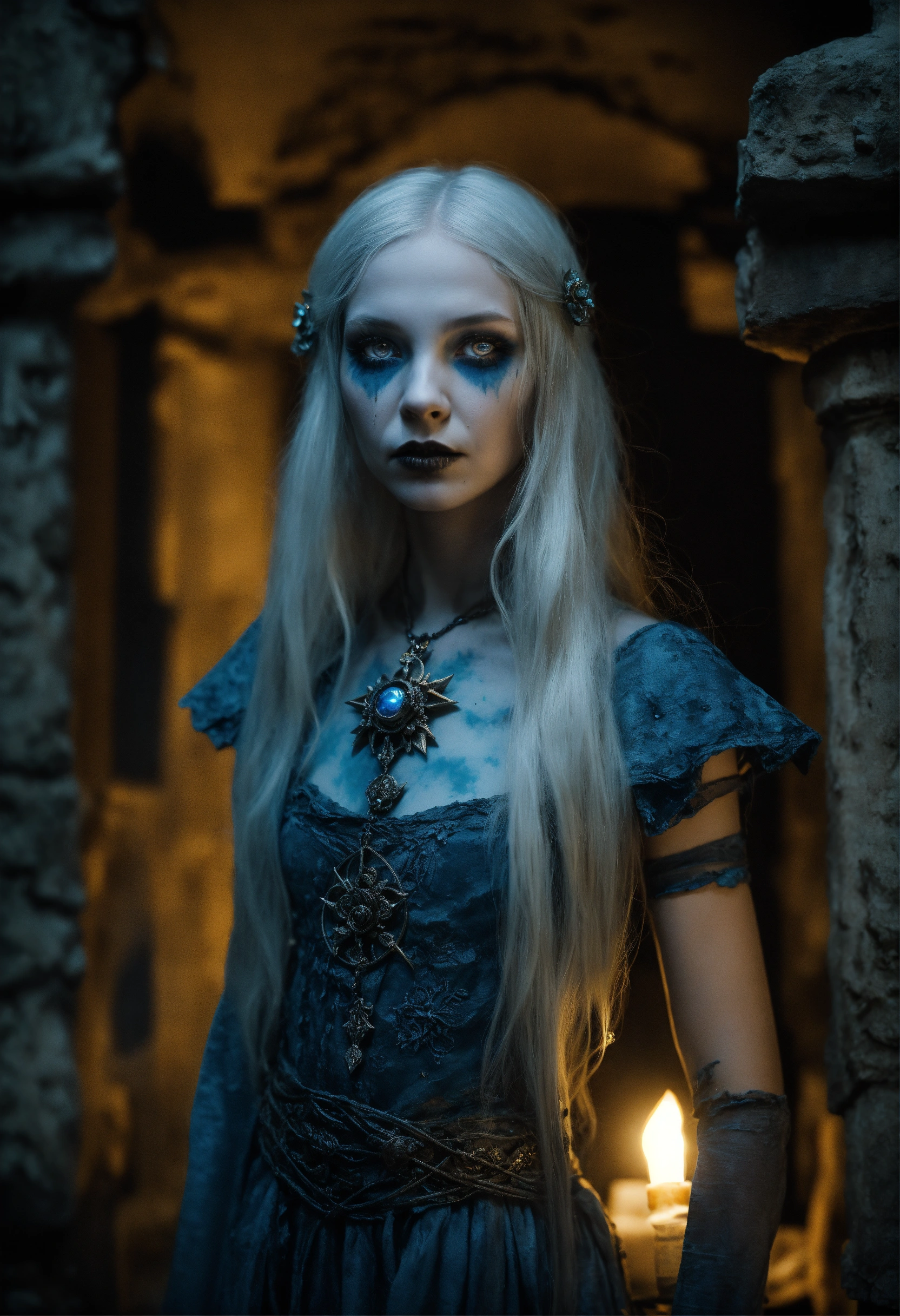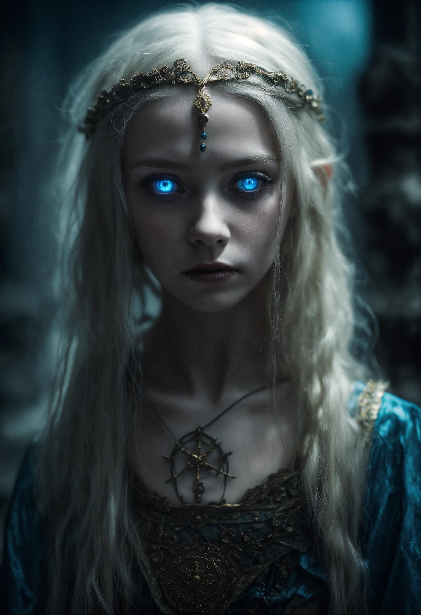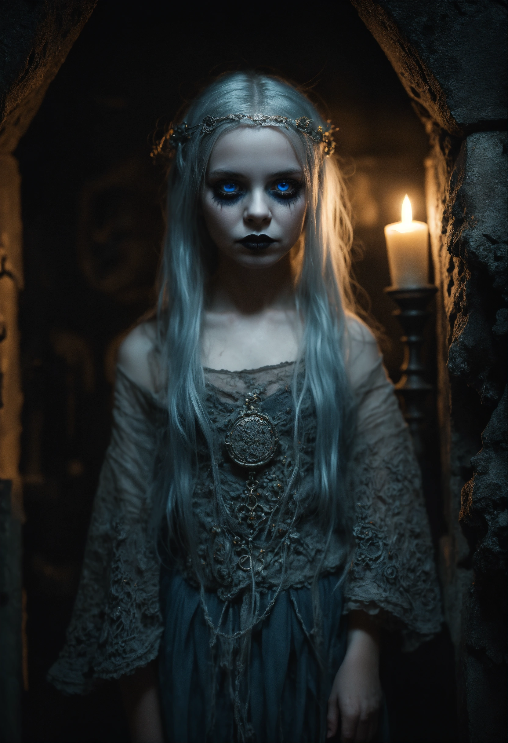 Body portrait, eleven year old childish female goth necromancer, very skinny and emaciated with long silverwhite hair and alabaster skin pale as a corpse and glowing blue eyes is overcome by darkness in a gloomy crypt, slim face, innocent looking, graceful, wispy, glowing blue eyes, ghostly, rotting flesh, dead, evil, demonic, undead, darkness, grotesque, mysterious, dark, cold ambient lighting, focus on face, extremely detailed, fantasy, medieval setting