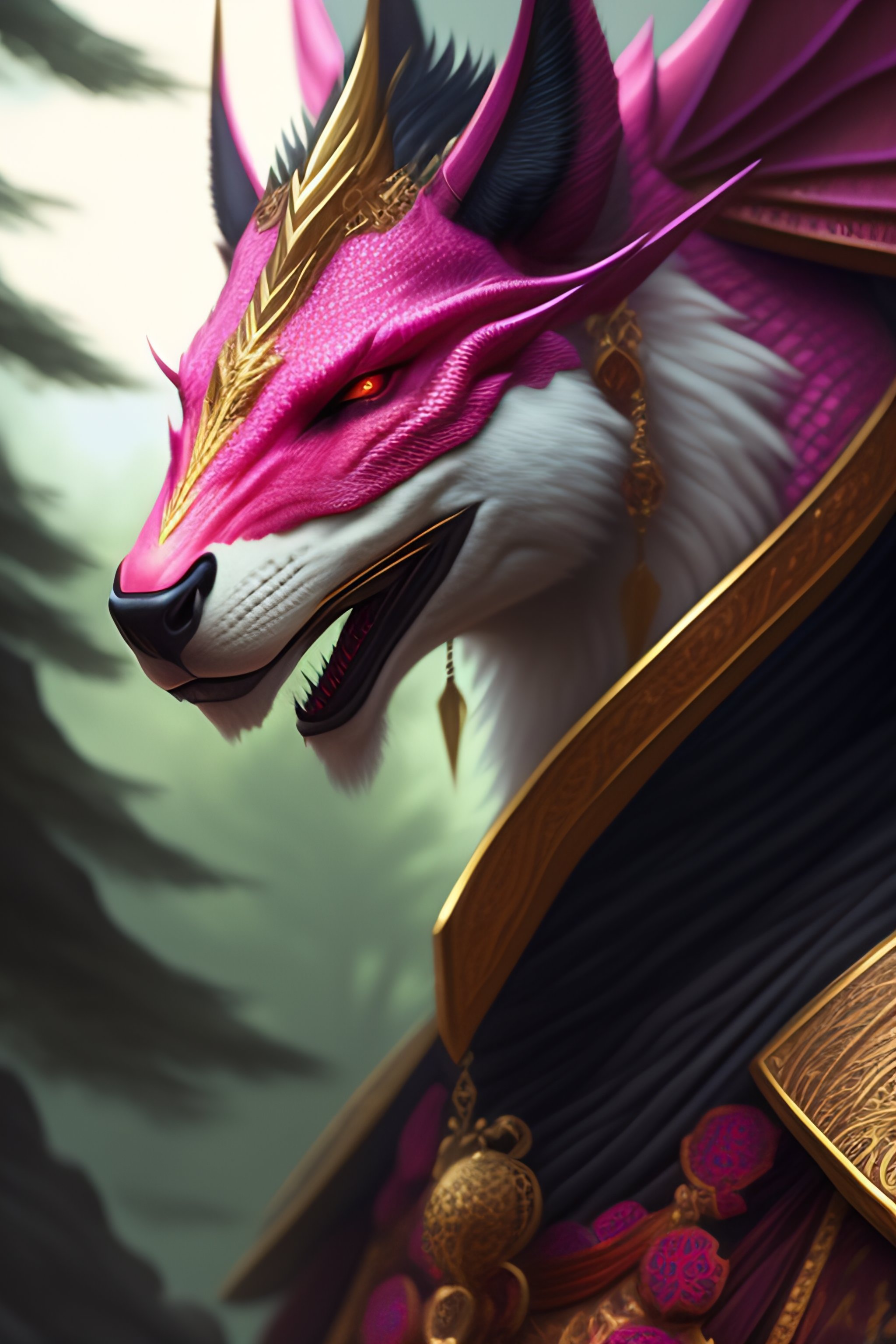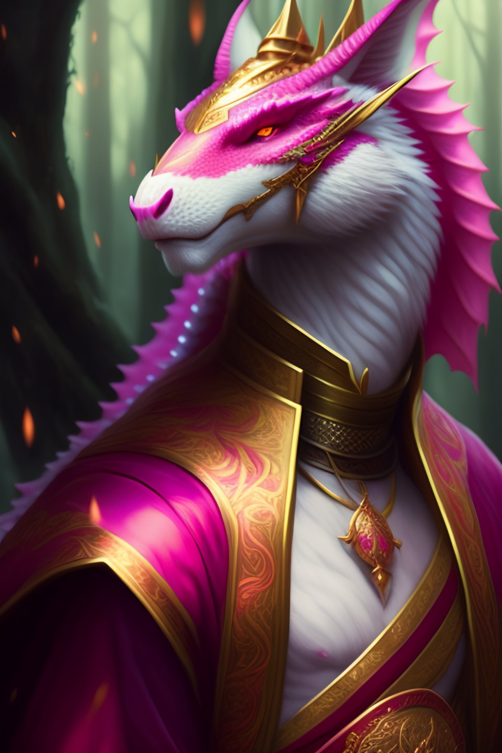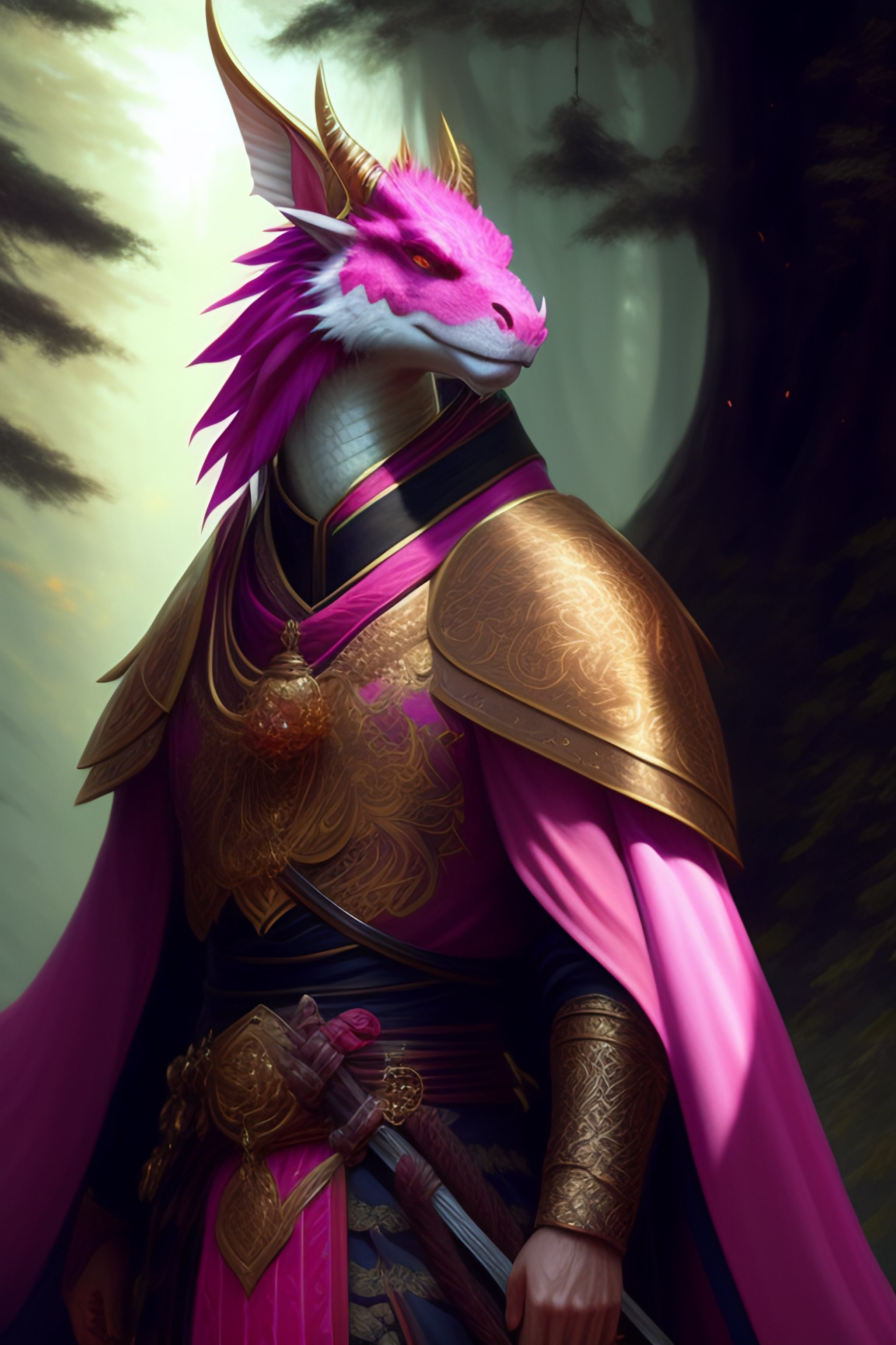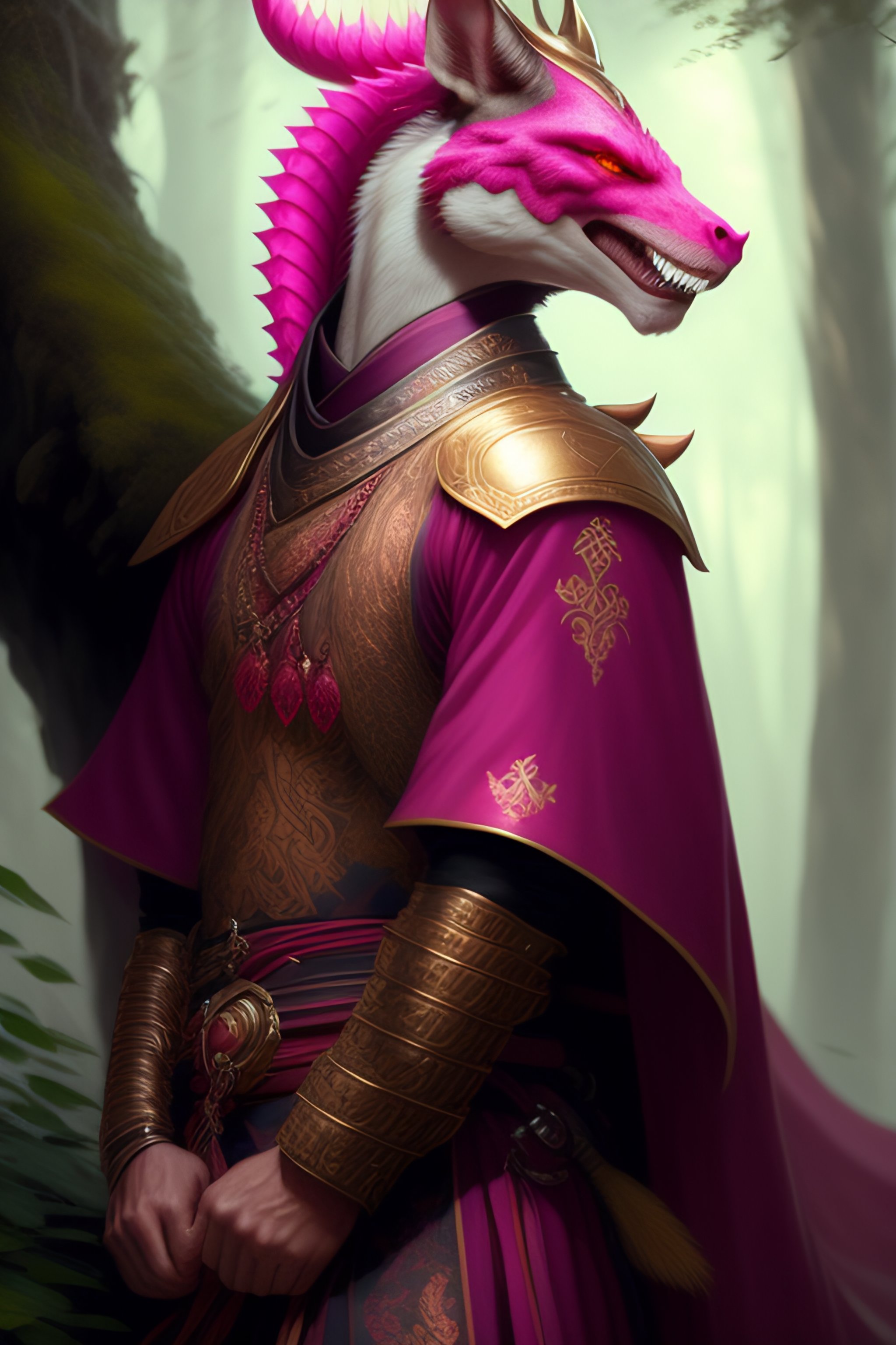 Anthropomorphic male pink dragon wearing samurai clothes, soft draconic features, highly detailed draconic face, fantasy, artstation, d & d, smooth, illustration, forest background, digital art painting by greg rutkowski and alphonse mucha