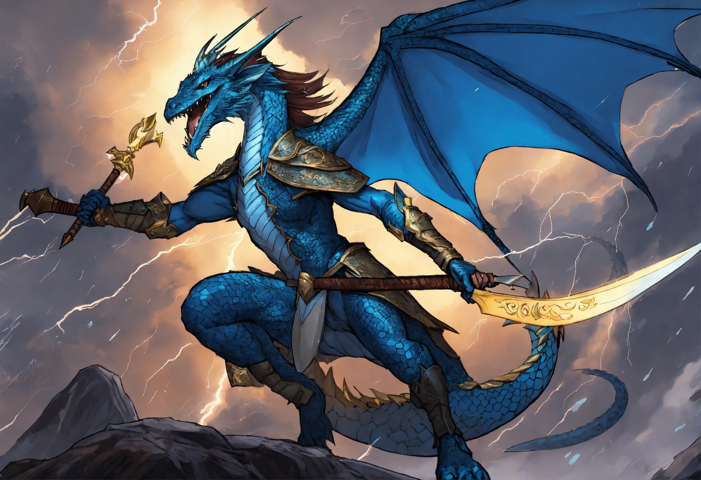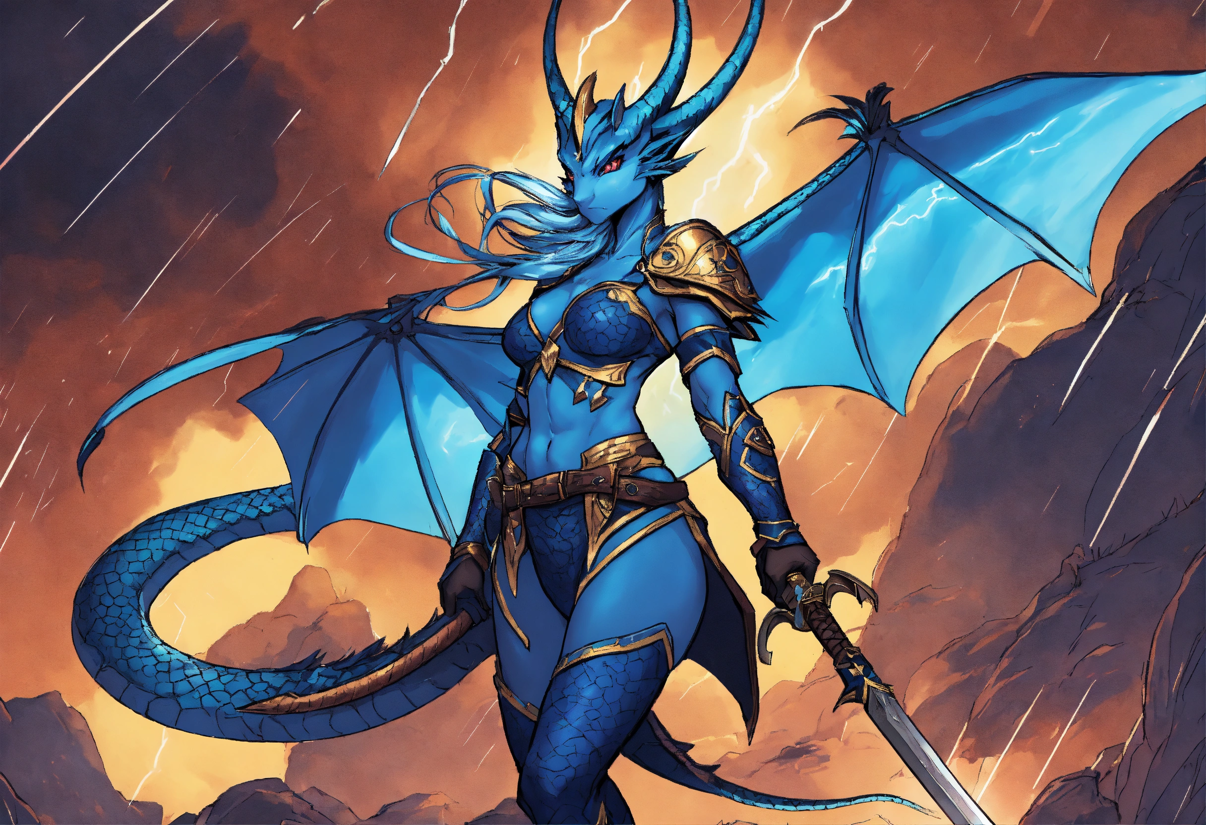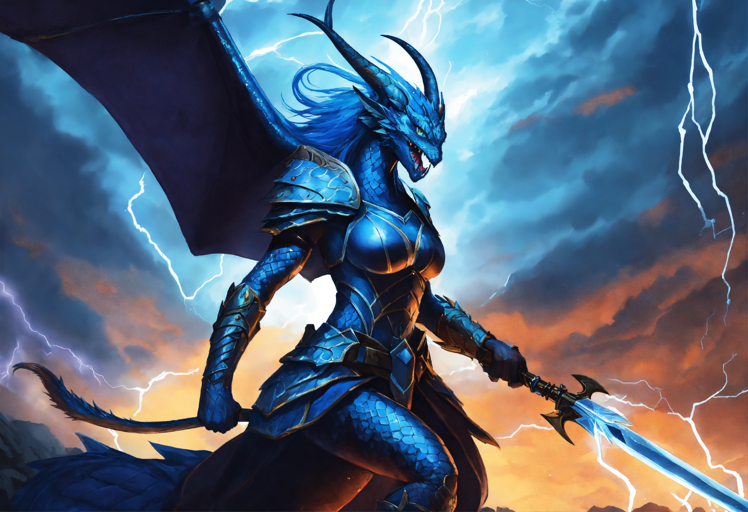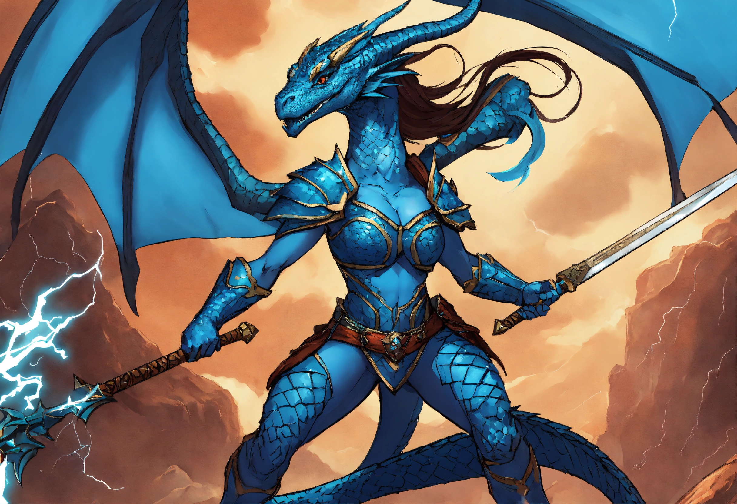 A body shot of a female blue-scaled dragoness warrior, with a tail, wielding a glaive, powerful, shrouded in lightning storm in graphic novel art form