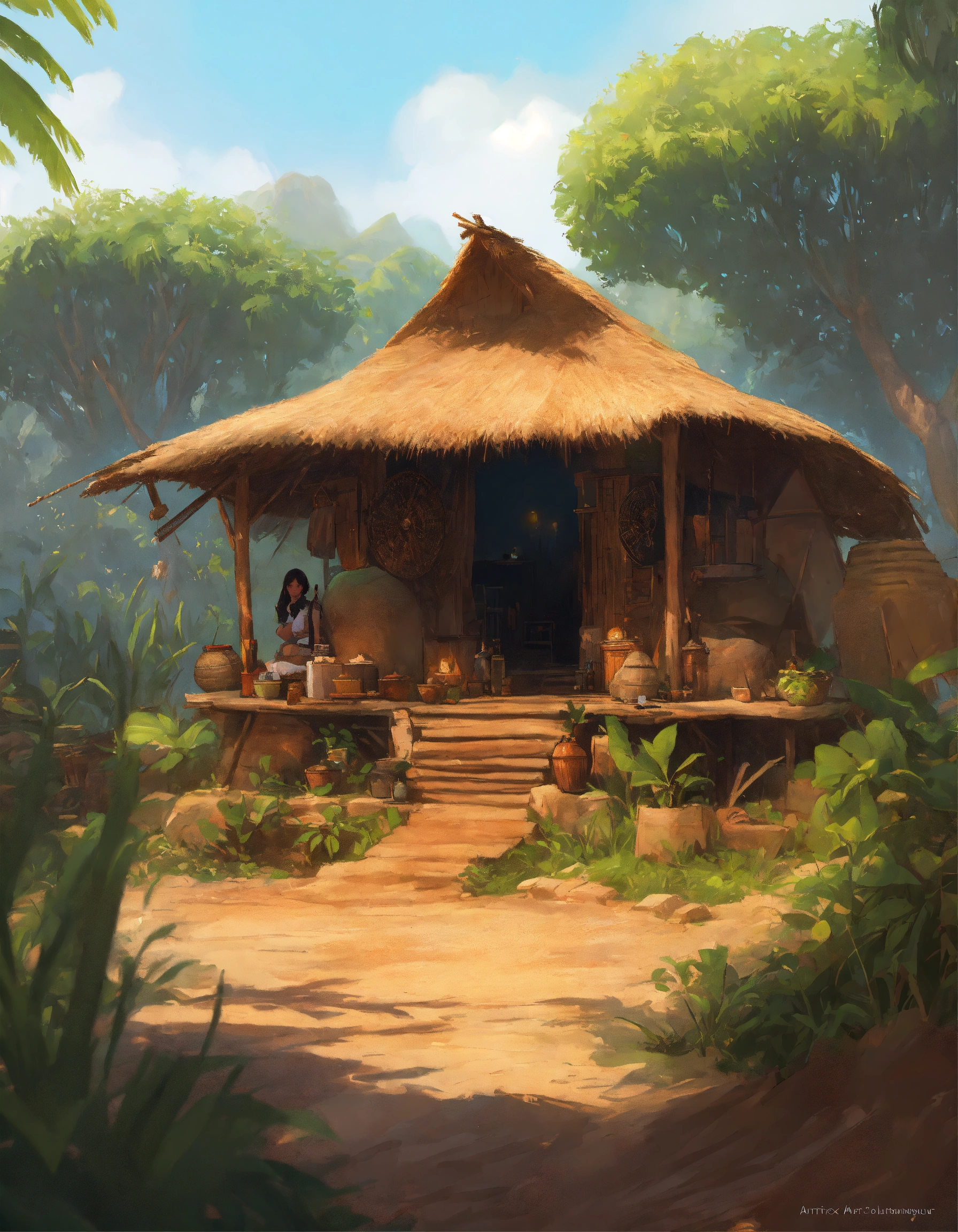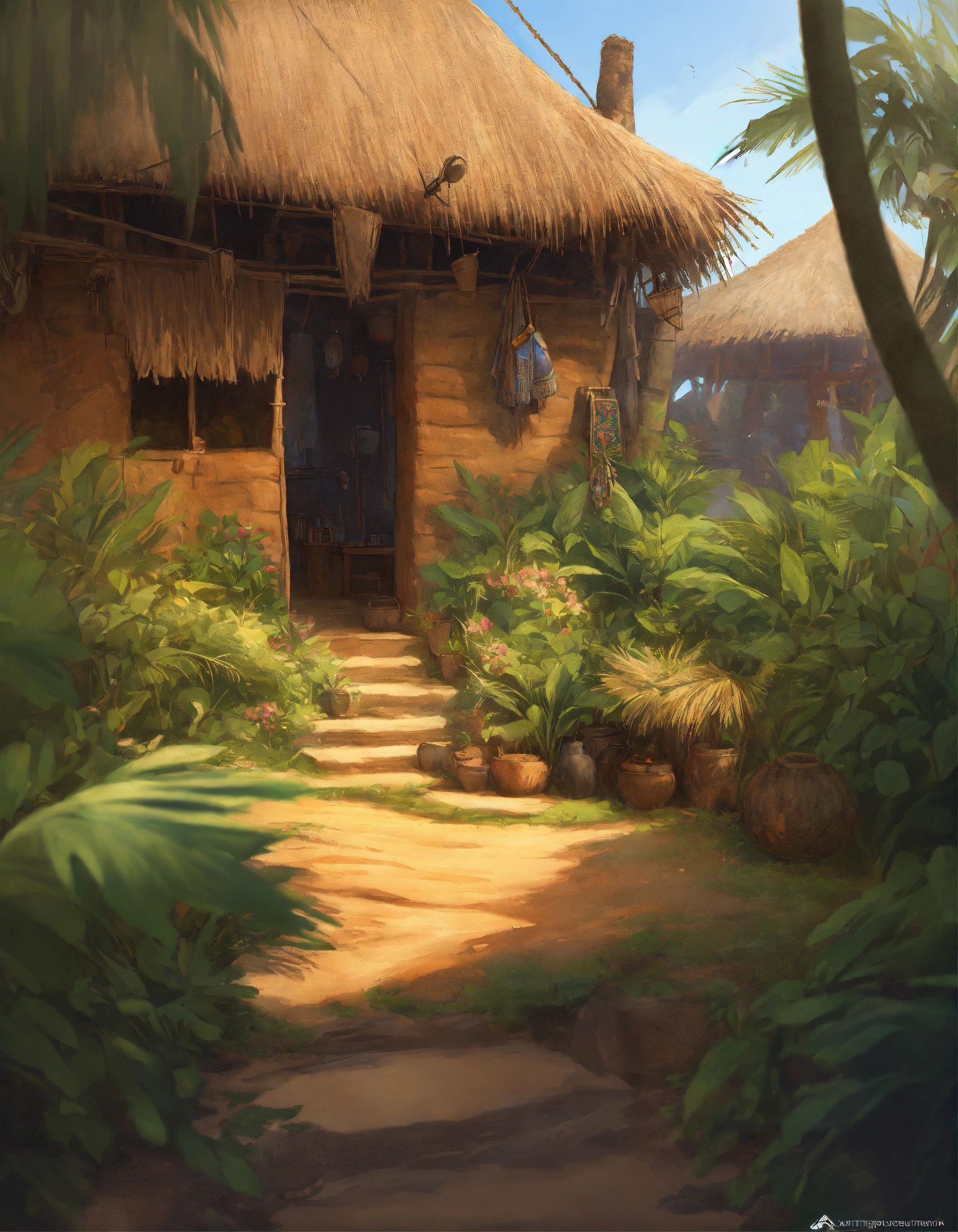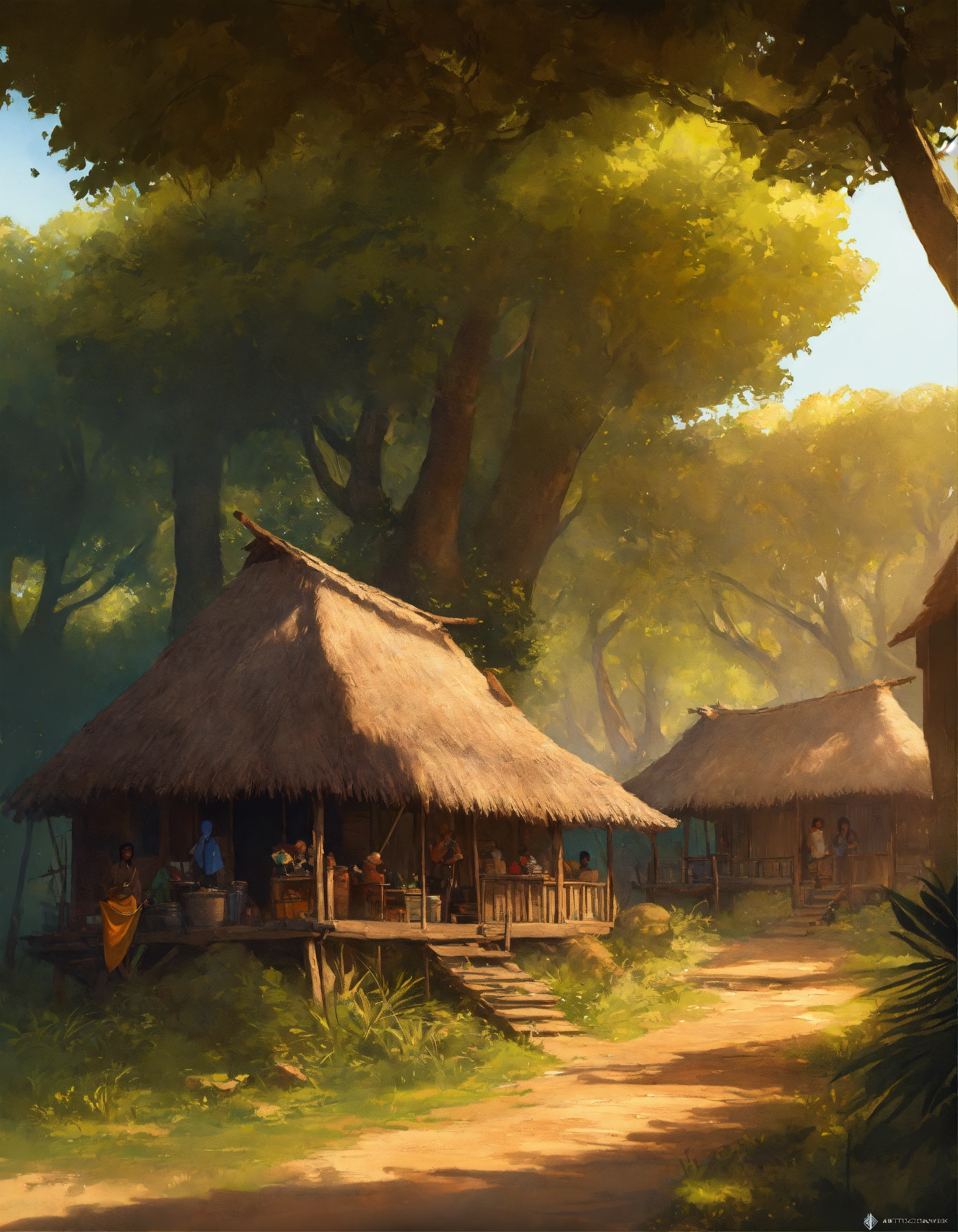 African village, outside the humble thatched-roof, highly detailed, digital painting, artstation, concept art, smooth, sharp focus, illustration, art by artgerm and greg rutkowski and alphonse mucha - lexica aperturev3