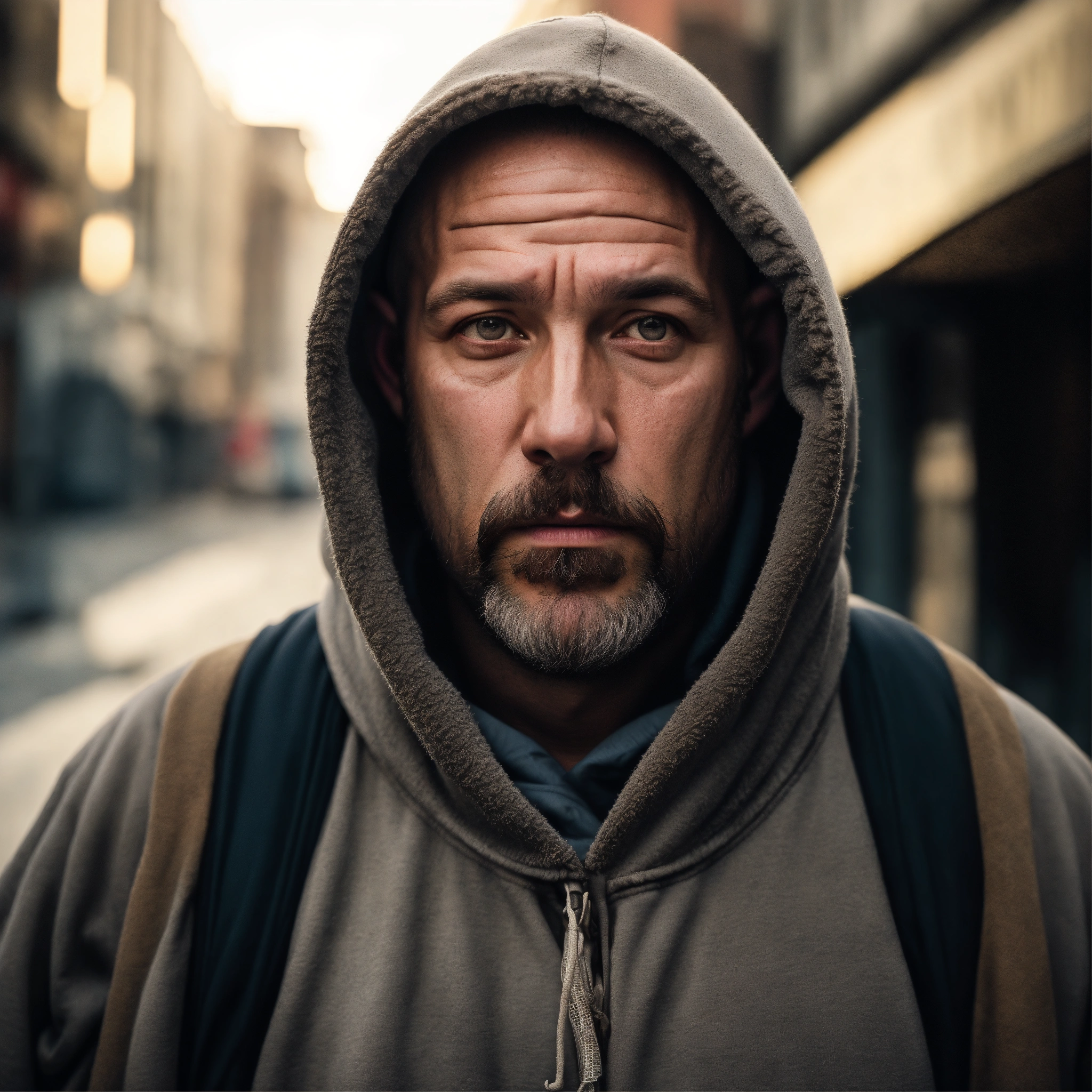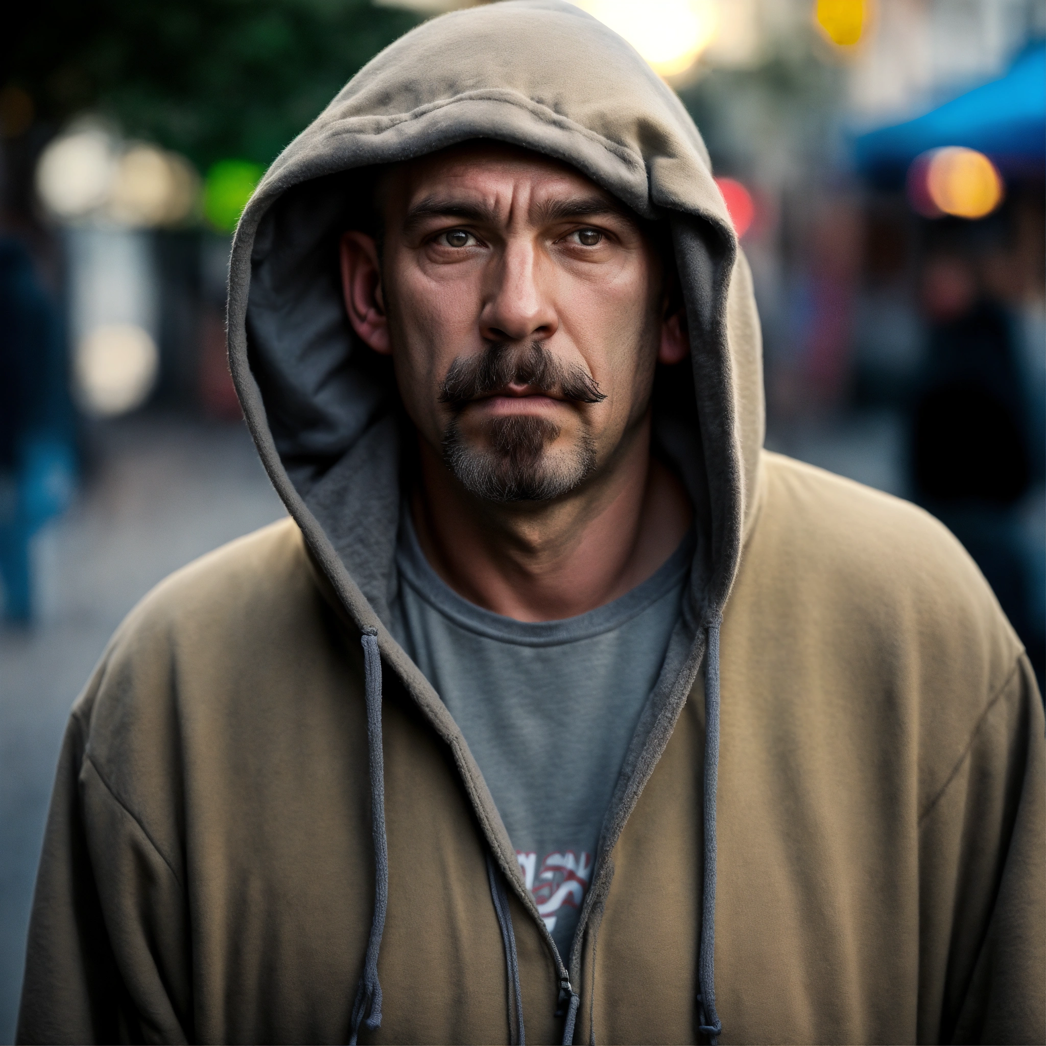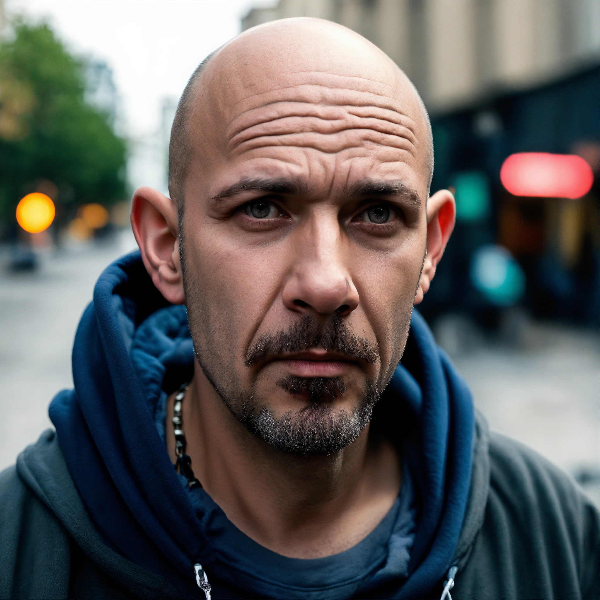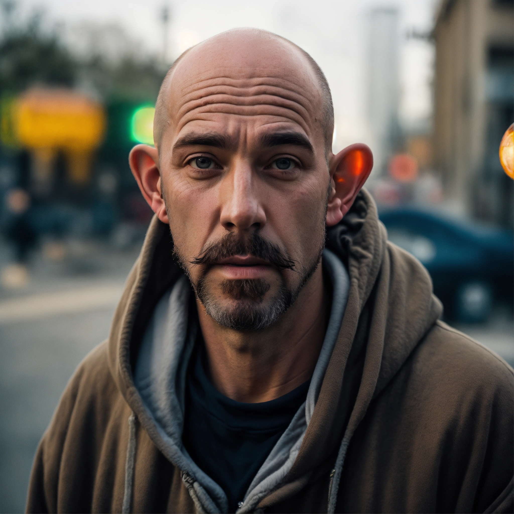 A homeless huge man with a huge lumpy bald head, a tiny goatee, no mustache, protruding forehead, sunken light gray eyes, crooked mouth, large ears, wearing a hoodie up over his head, no mustache, standing in the street