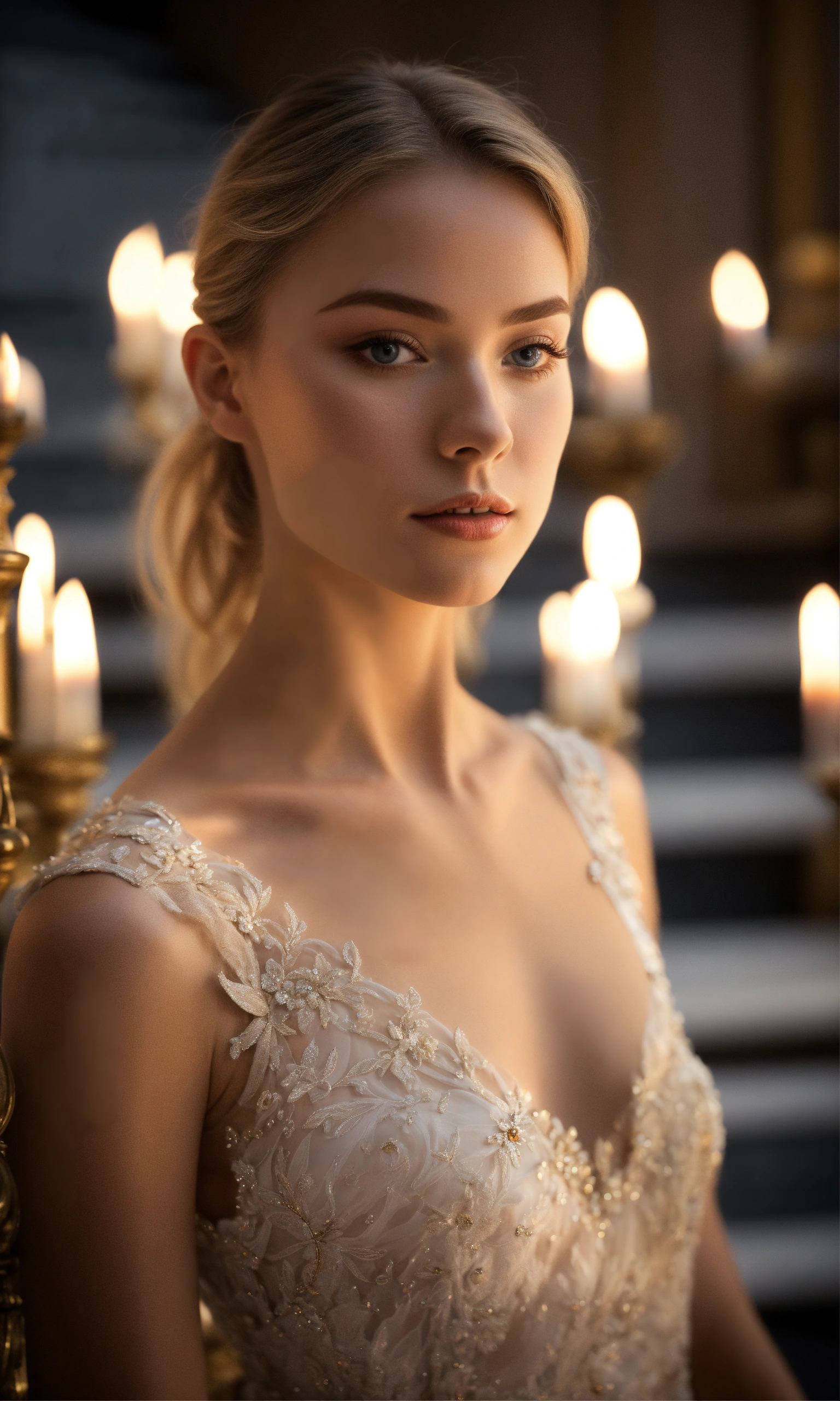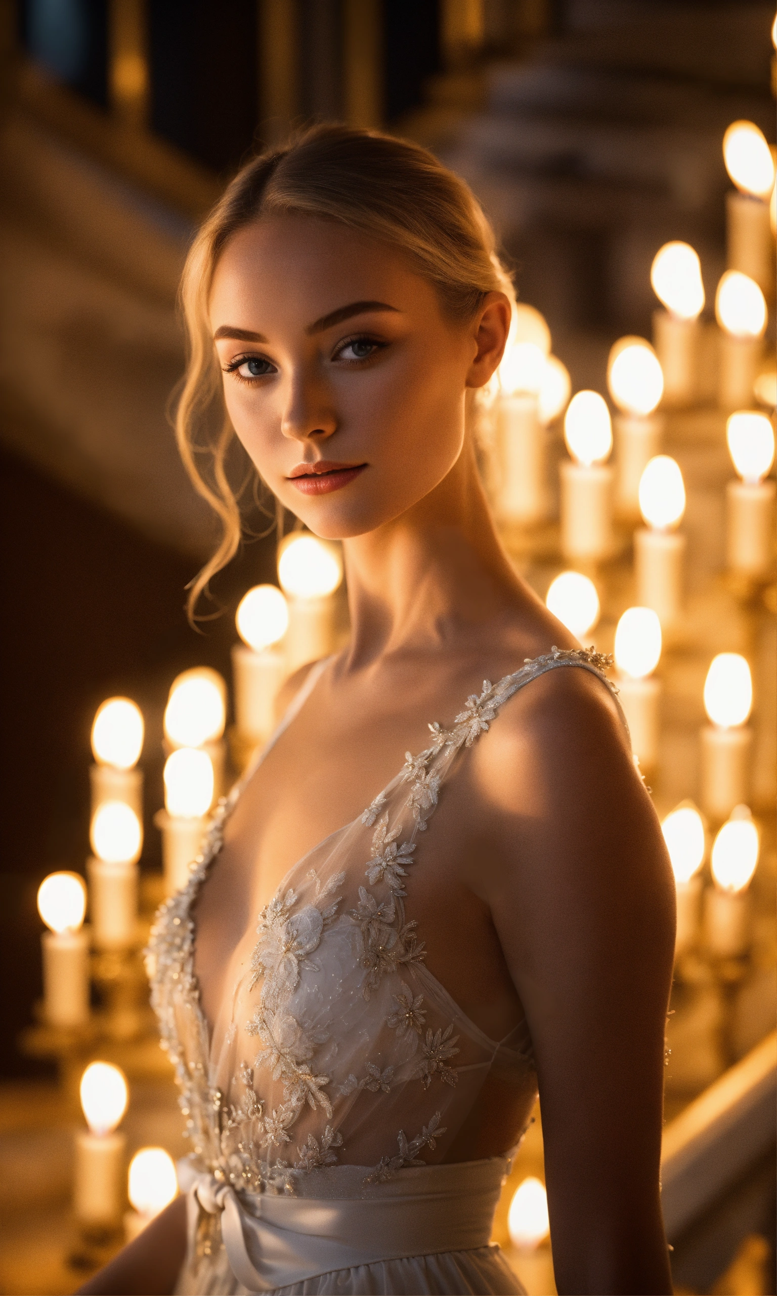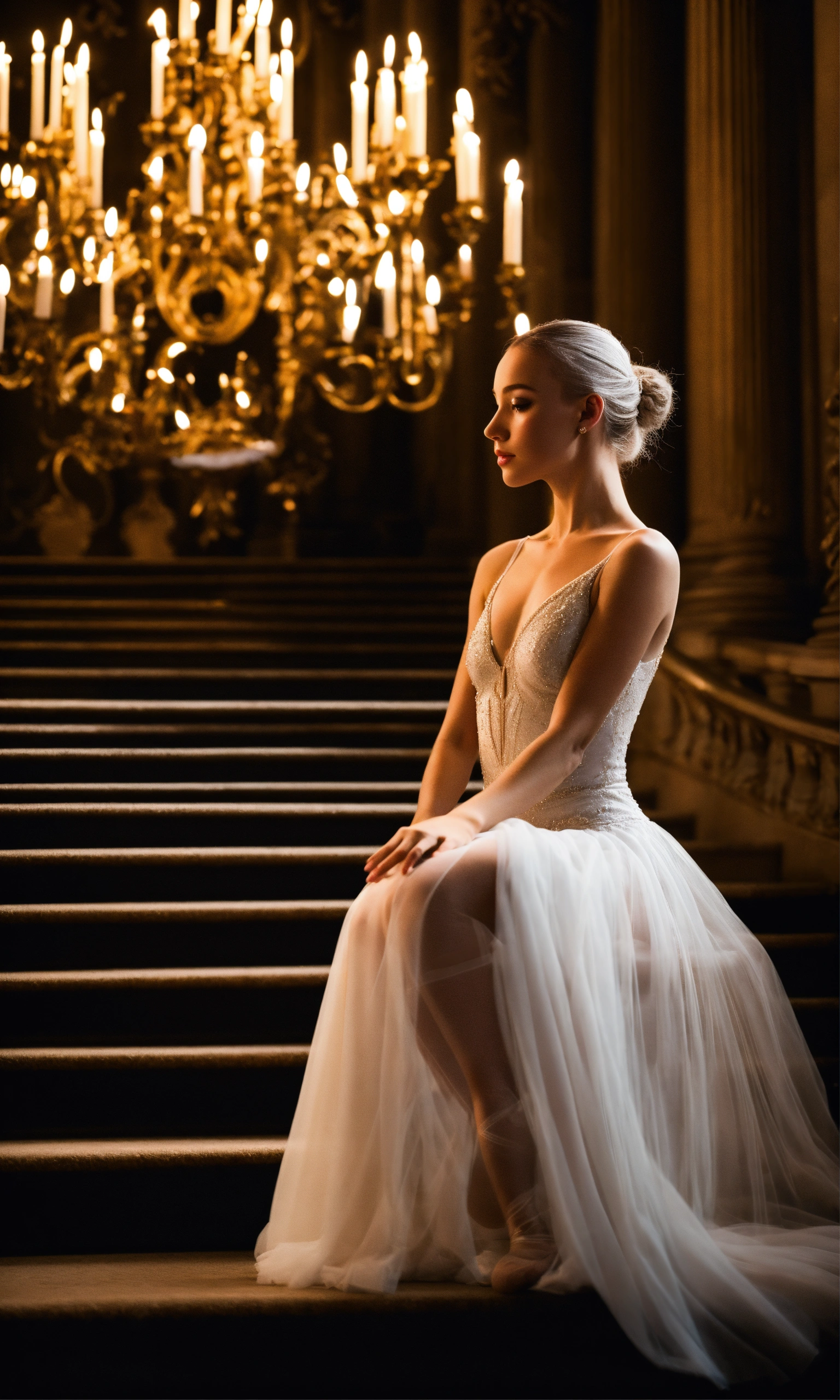 Focus on the face, close-up on the ballerina, ballet dancer, blonde woman, with ballerinas, with a beautiful short white dress with a transparent design, backlighting behind the dancer, photograph, on a staircase of the palace of versailles, with candles, ultra quality, realistic photographic rendering, cinematic, photo with canon eos 5d mark iv, cinematic, realistic, black background, photo fusion, sfx photo.