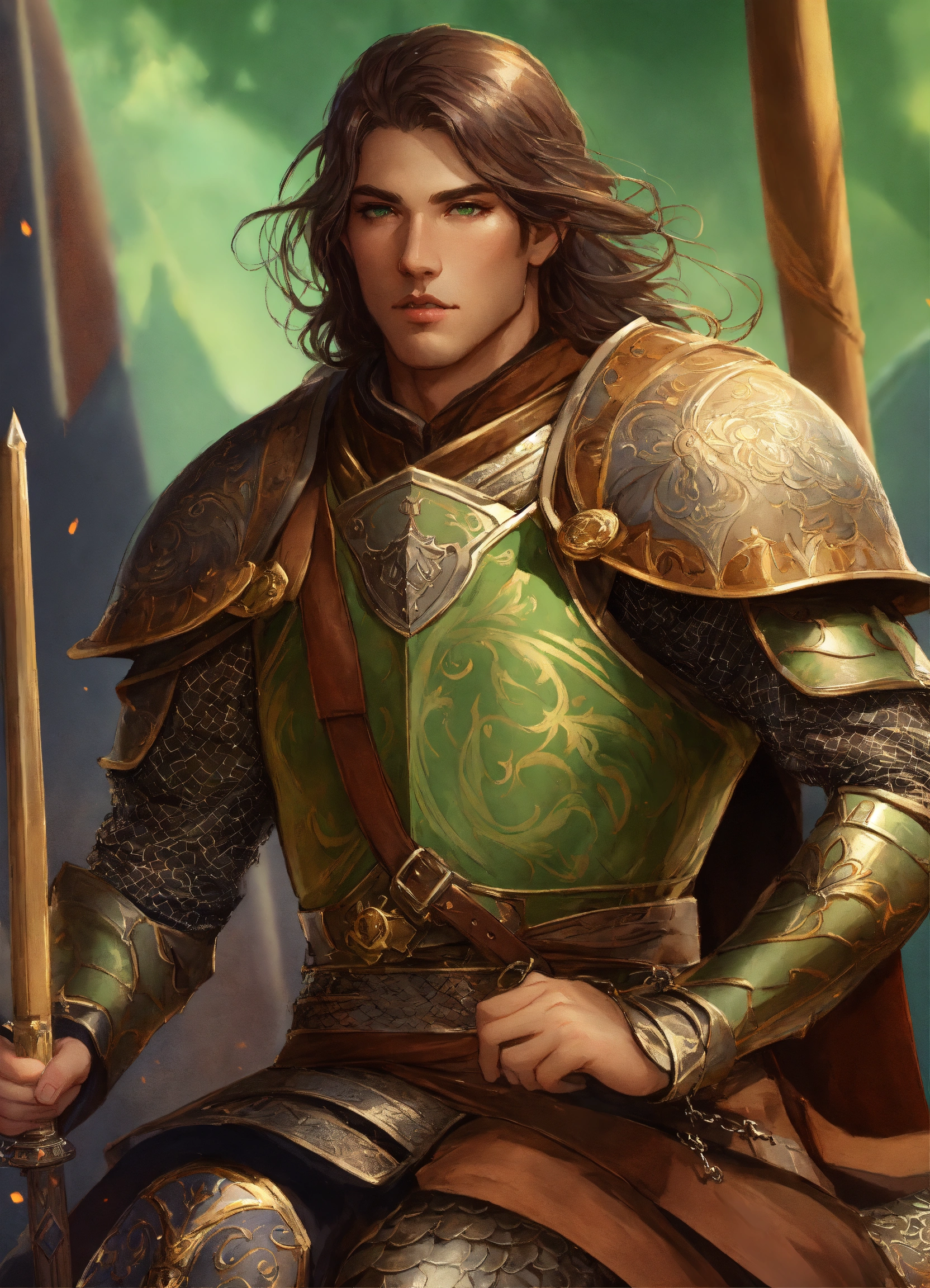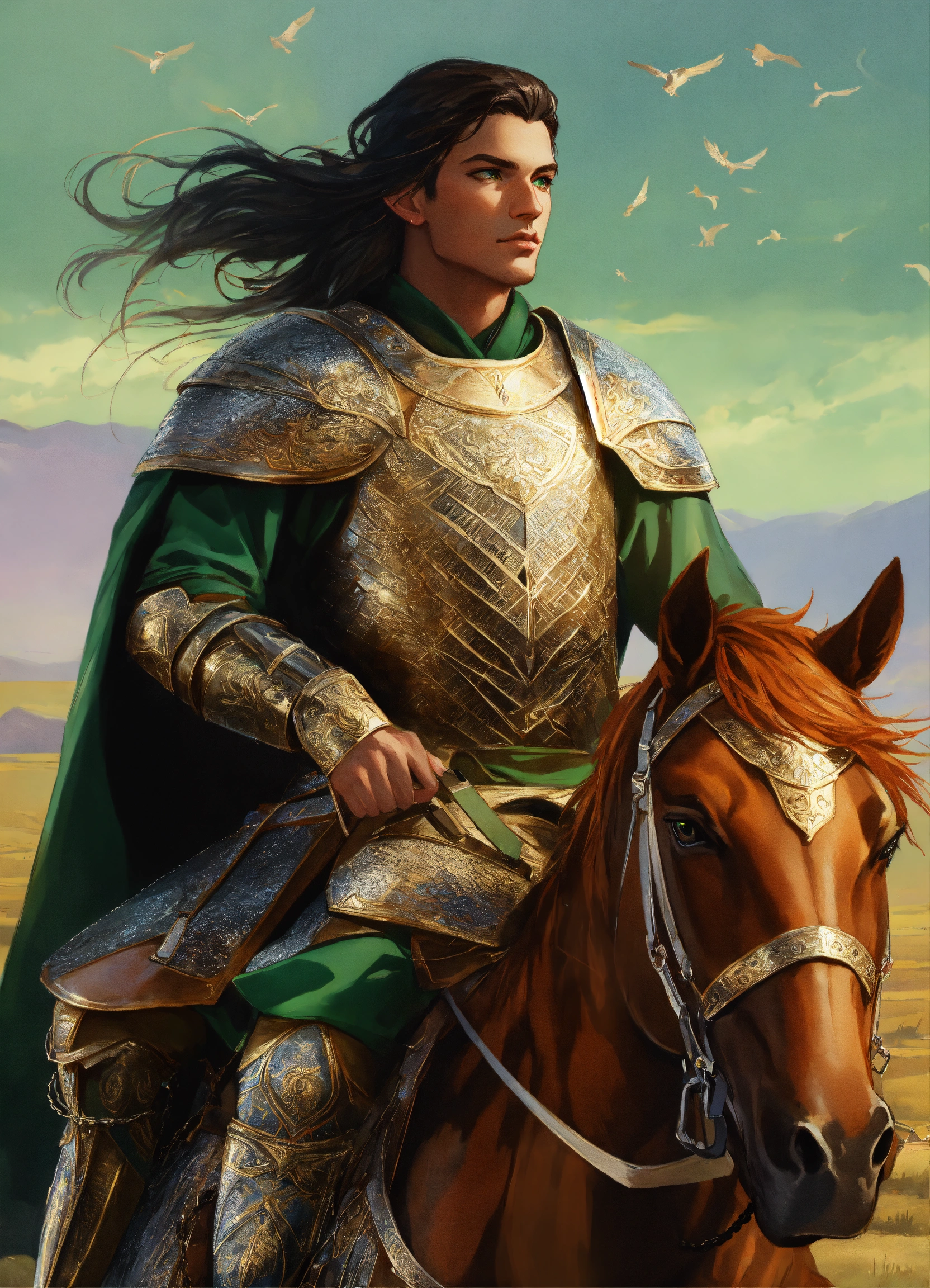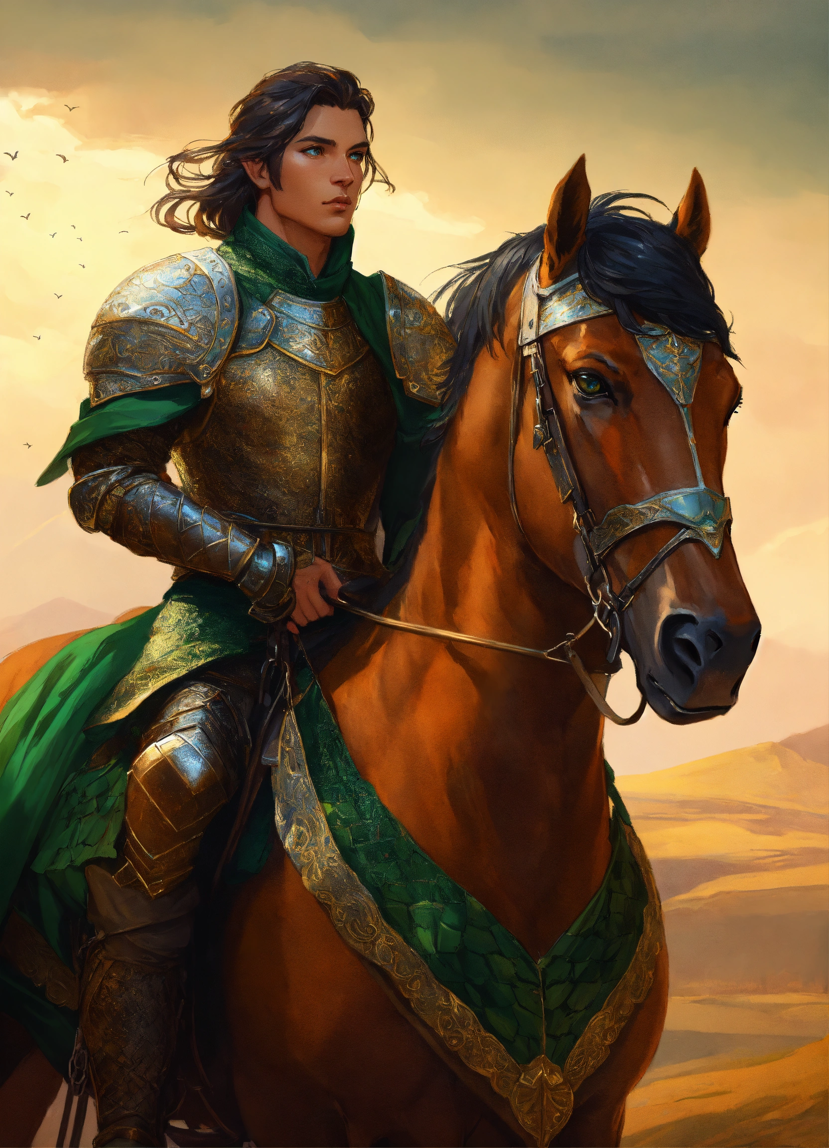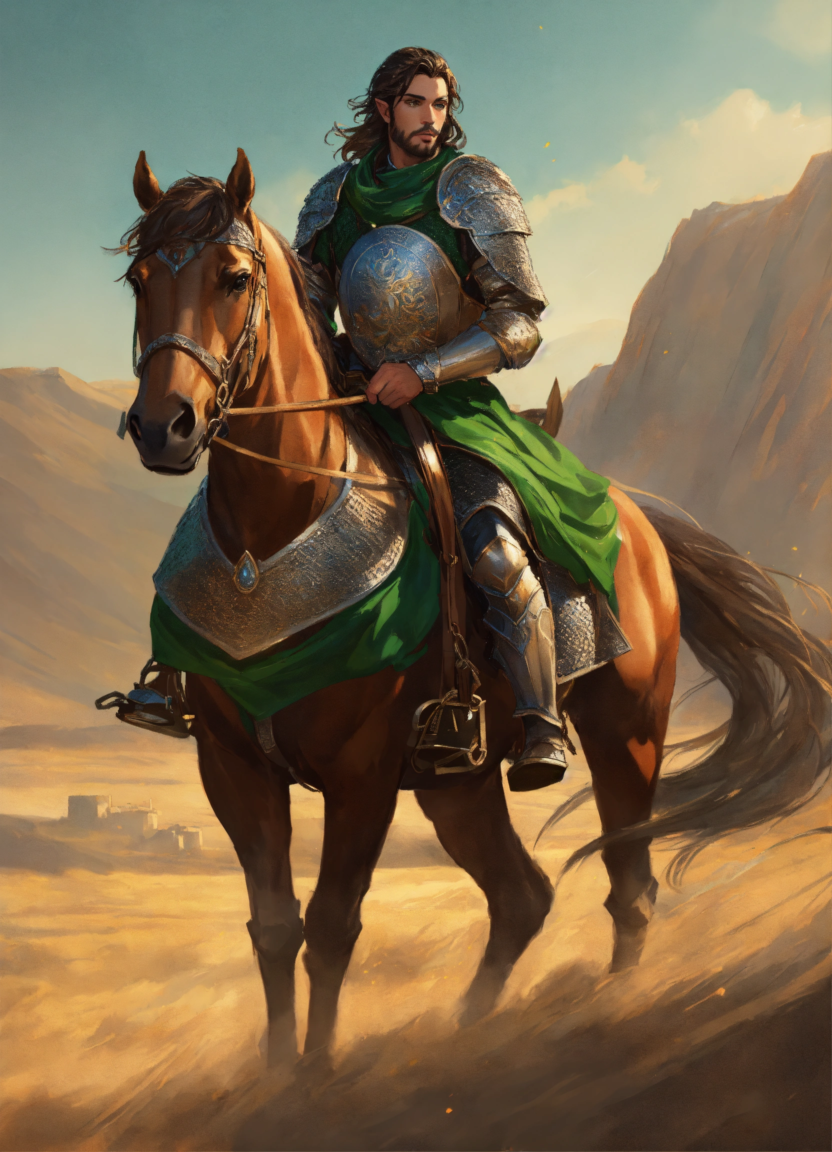 A heavily armored persian cataphract male elf in chain mail, riding a large brown horse that wears chainmail barding, dark brown hair, green eyes, background mongolian plains, exotic, pretty face, elegant, highly detailed, digital painting, artstation, concept art, smooth, sharp focus, illustration, art by artgerm and greg rutkowski and alphonse mucha, erte, 8 k