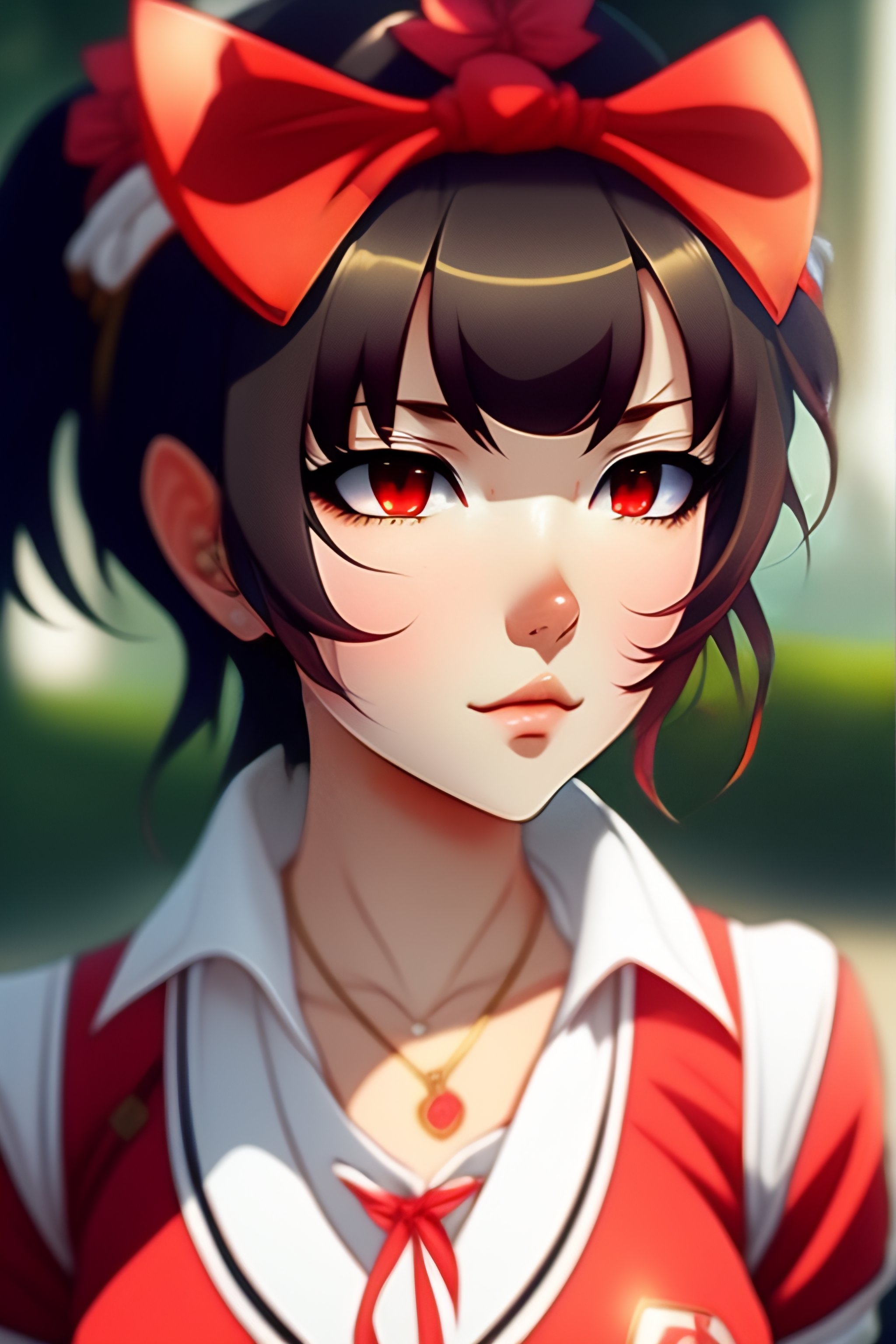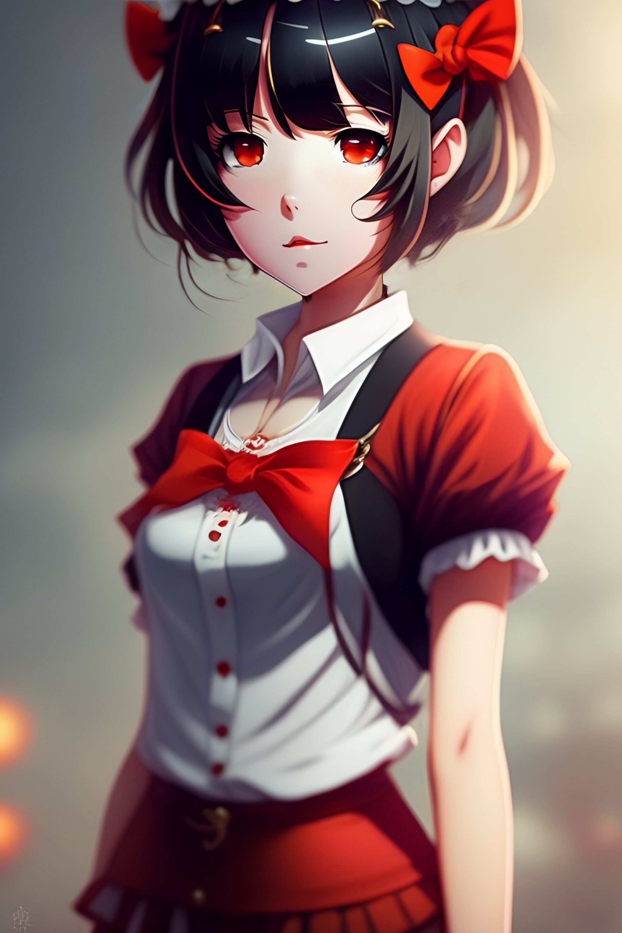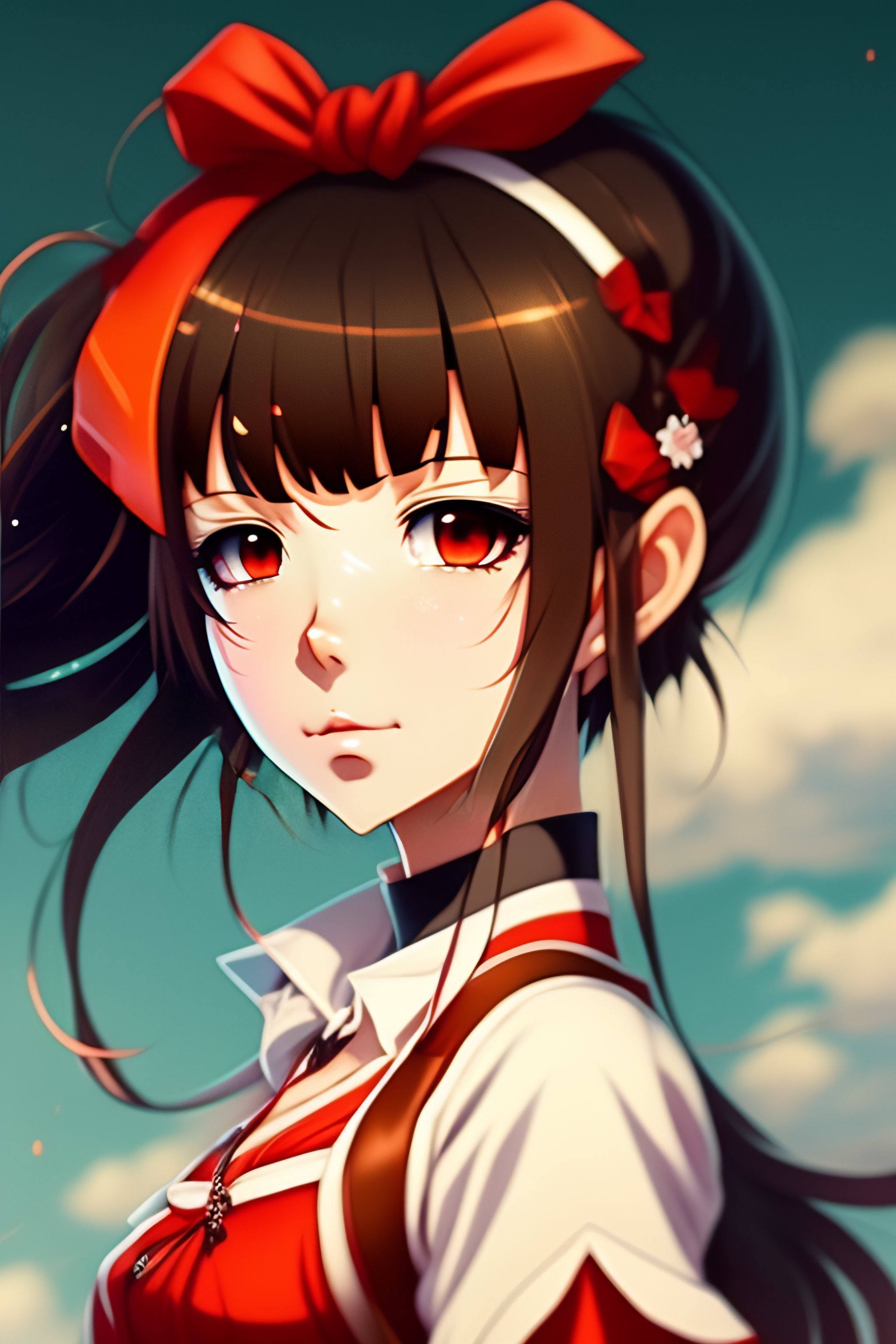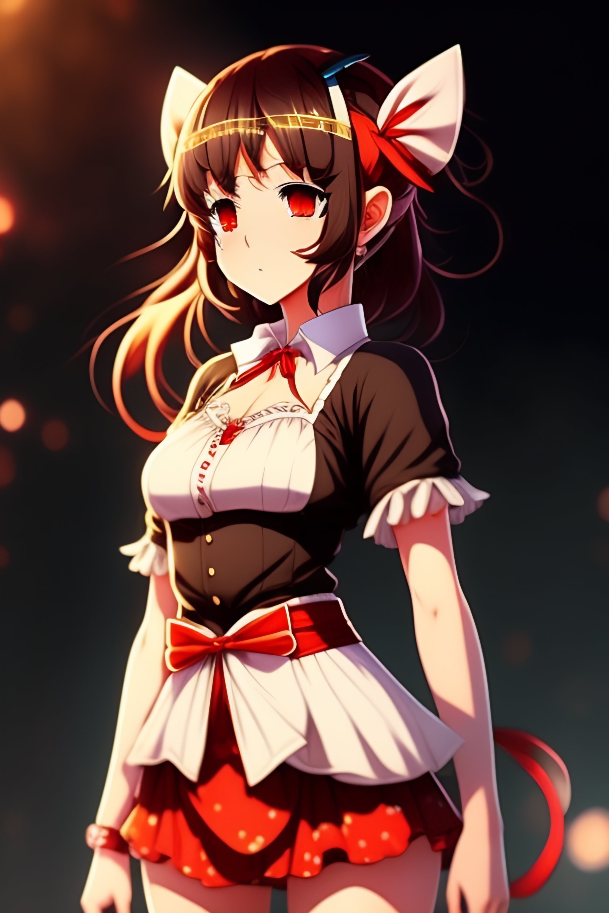 Anime girl, hairband with bow, demonic, loose white shirt with red accents, short red pants, short brown hair, brown eyes