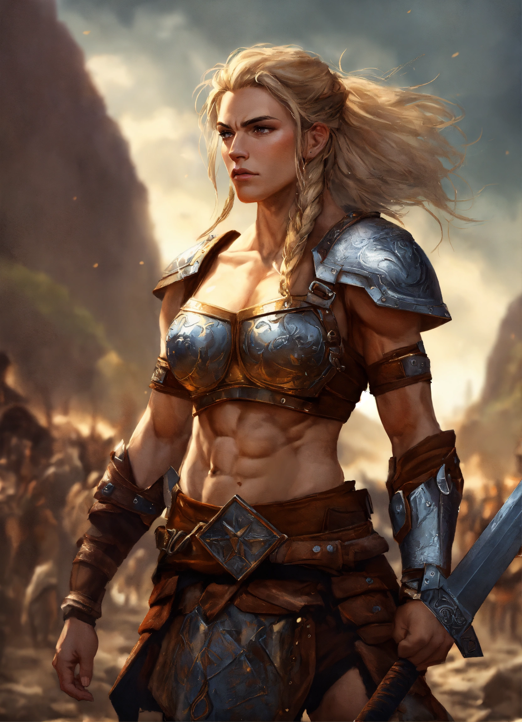 Character art, art station, strong, amazon warrior, handsome woman, tall, armored, big muscles, broad shoulders, broad chest, strong jaw, norse, barbarian fighter, tough, rugged, wide shot, no make up, realistic, fantasy, warhammer, ulric, athletic, buff, body shot, full metal armor, lagertha, big muscles, buff, huge shoulders, big battleaxe, ruthless, strong