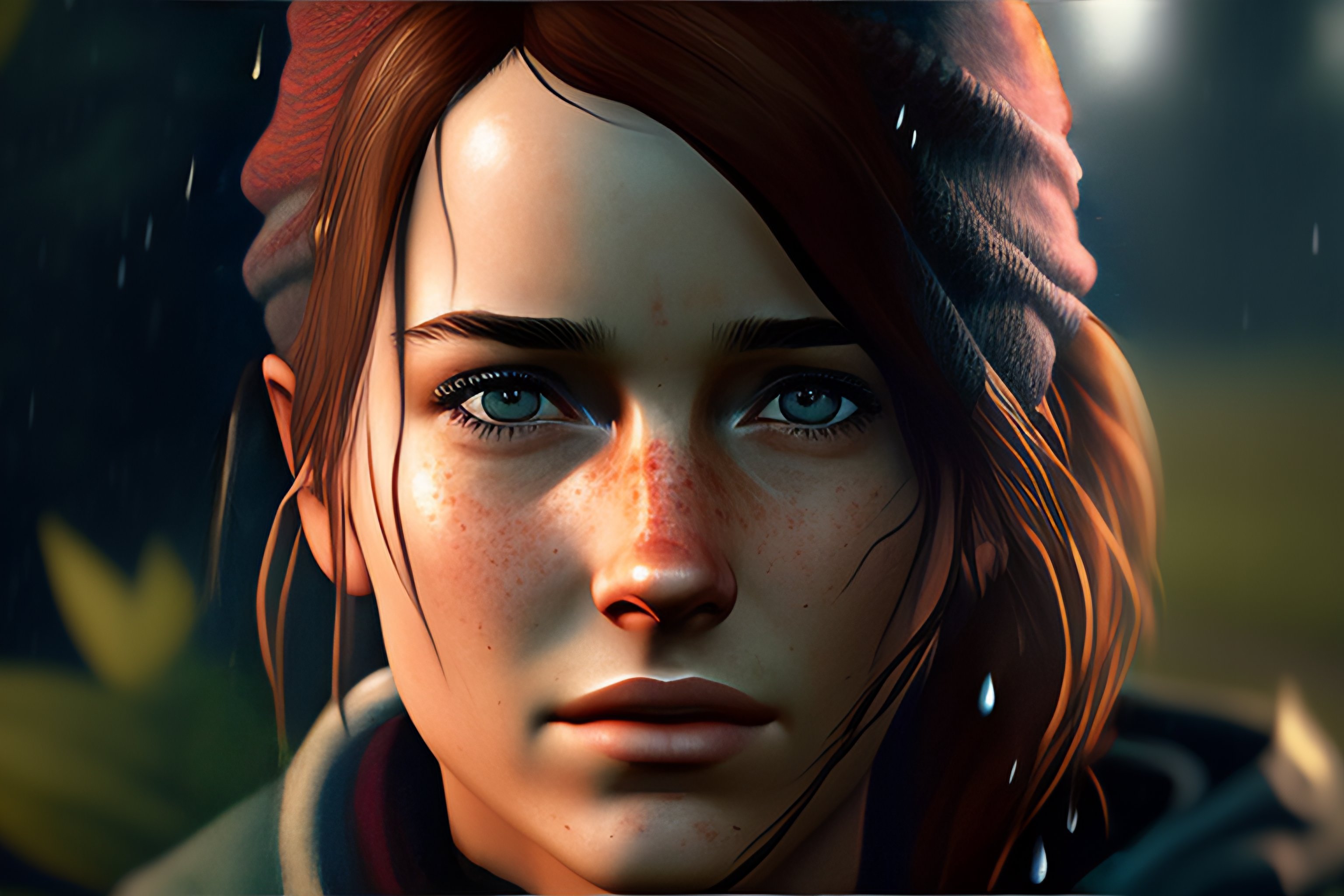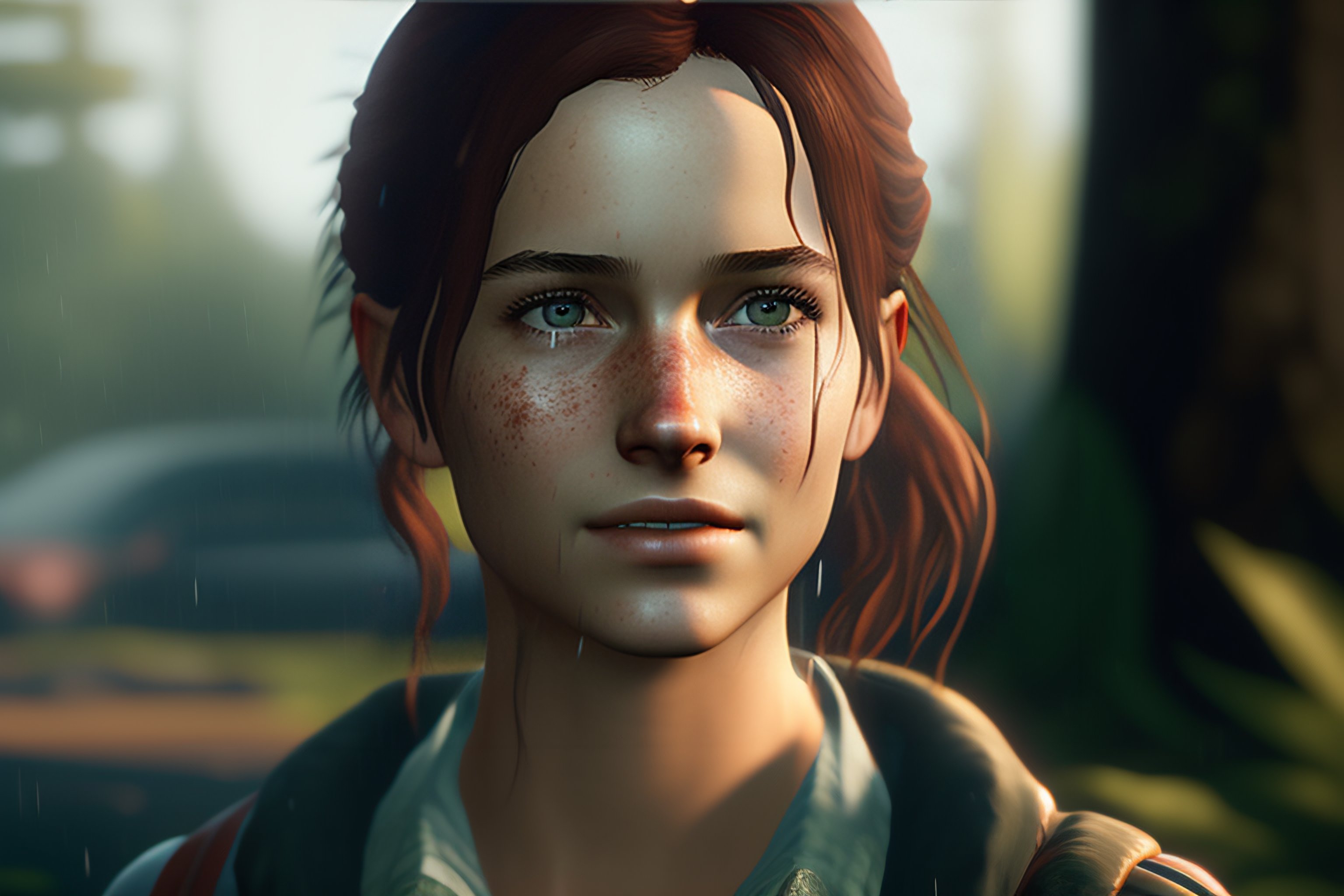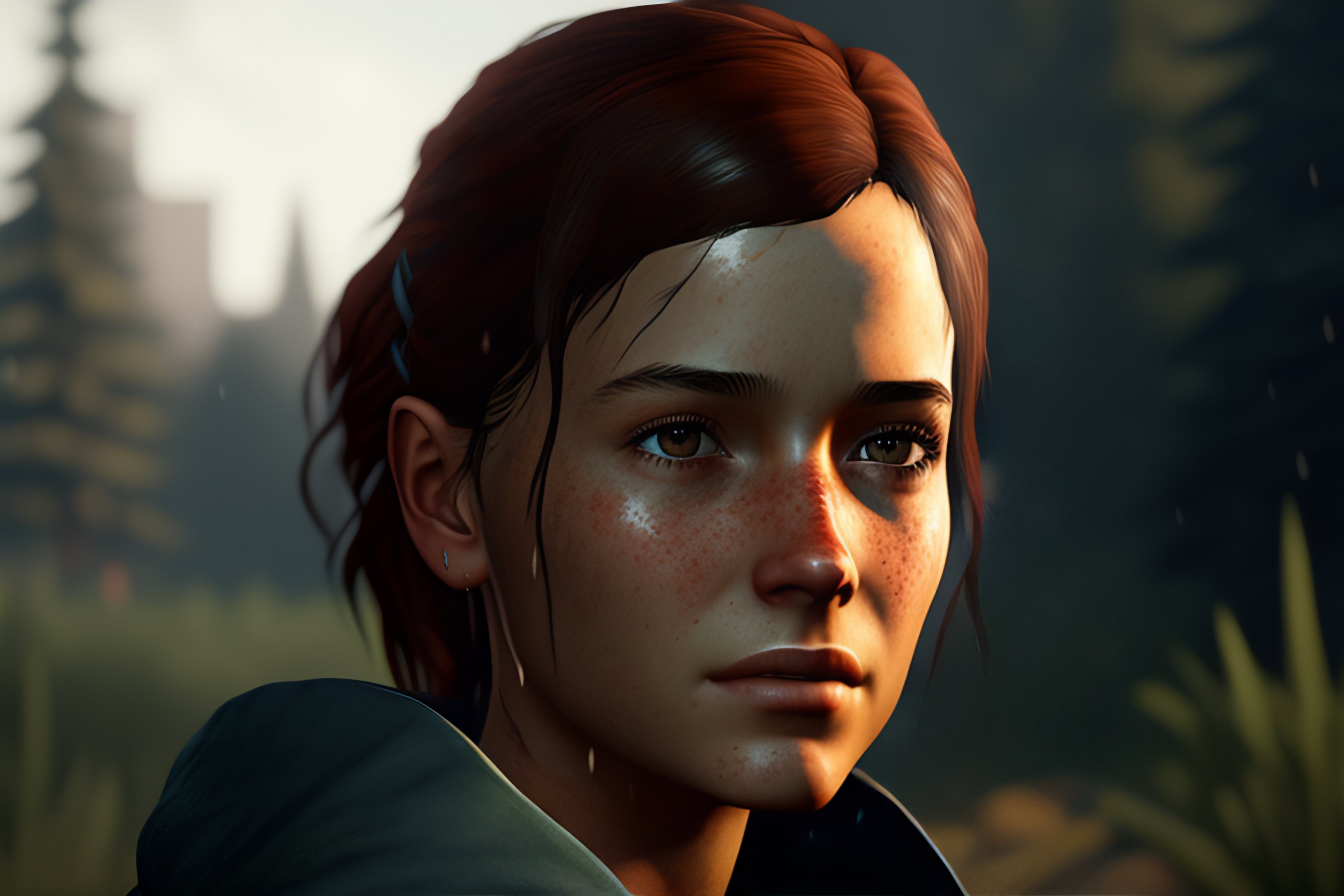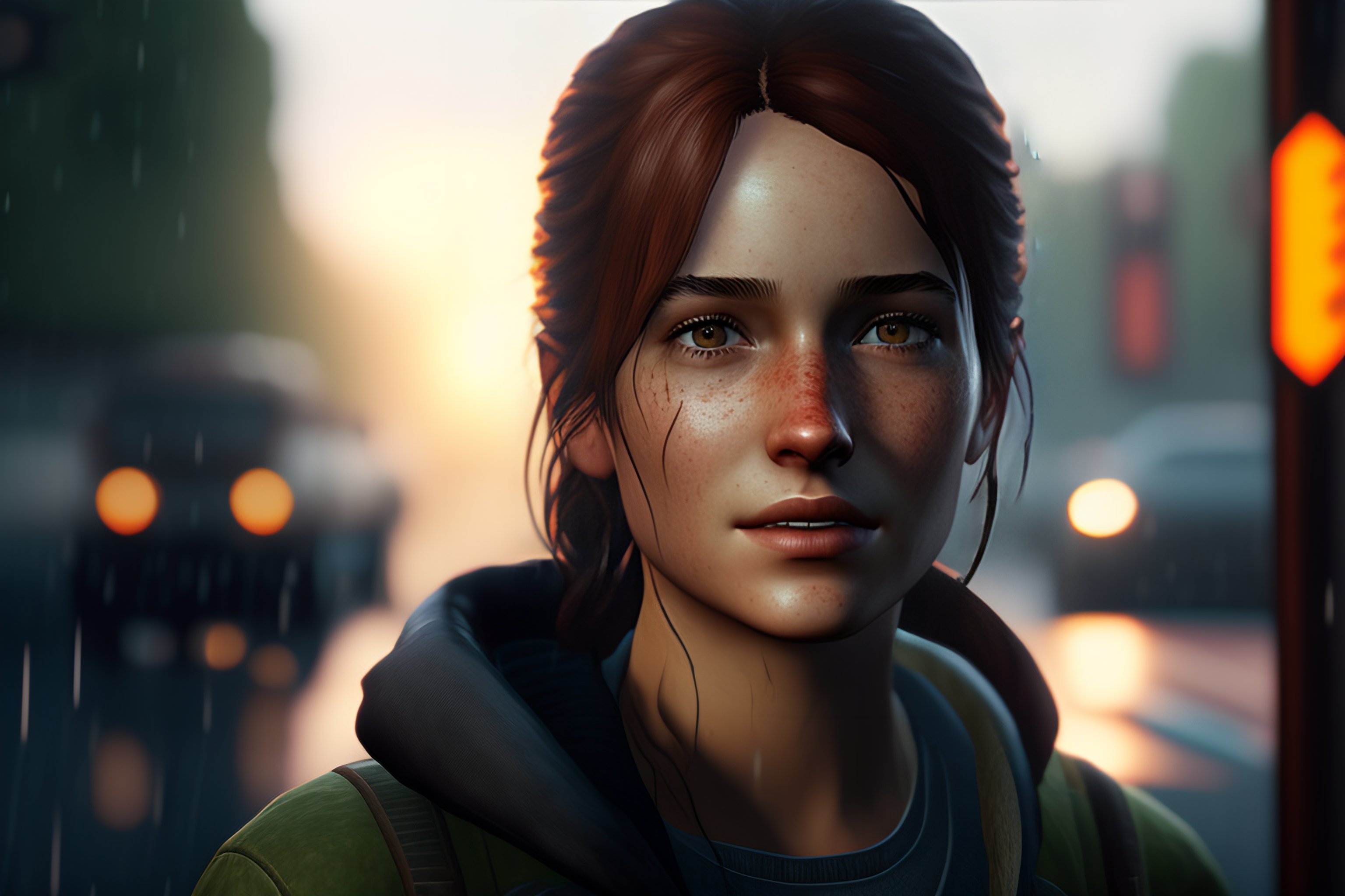 Portrait of adult ellie from the game the last of us 2, medium shot looking to the side, raining, traces of rain on her face --ar 16:9 --test