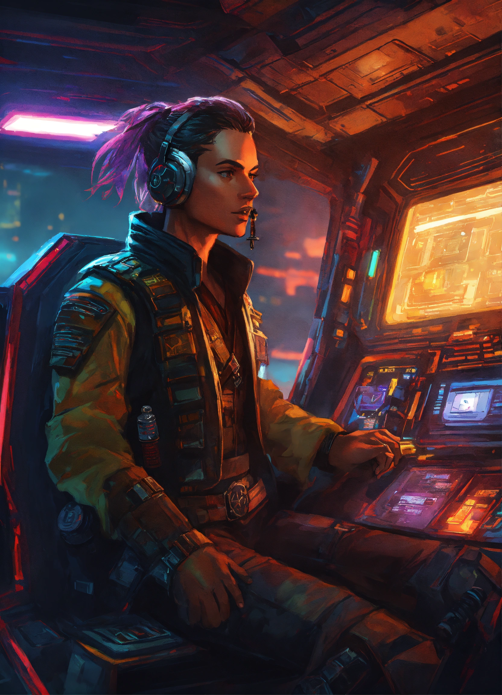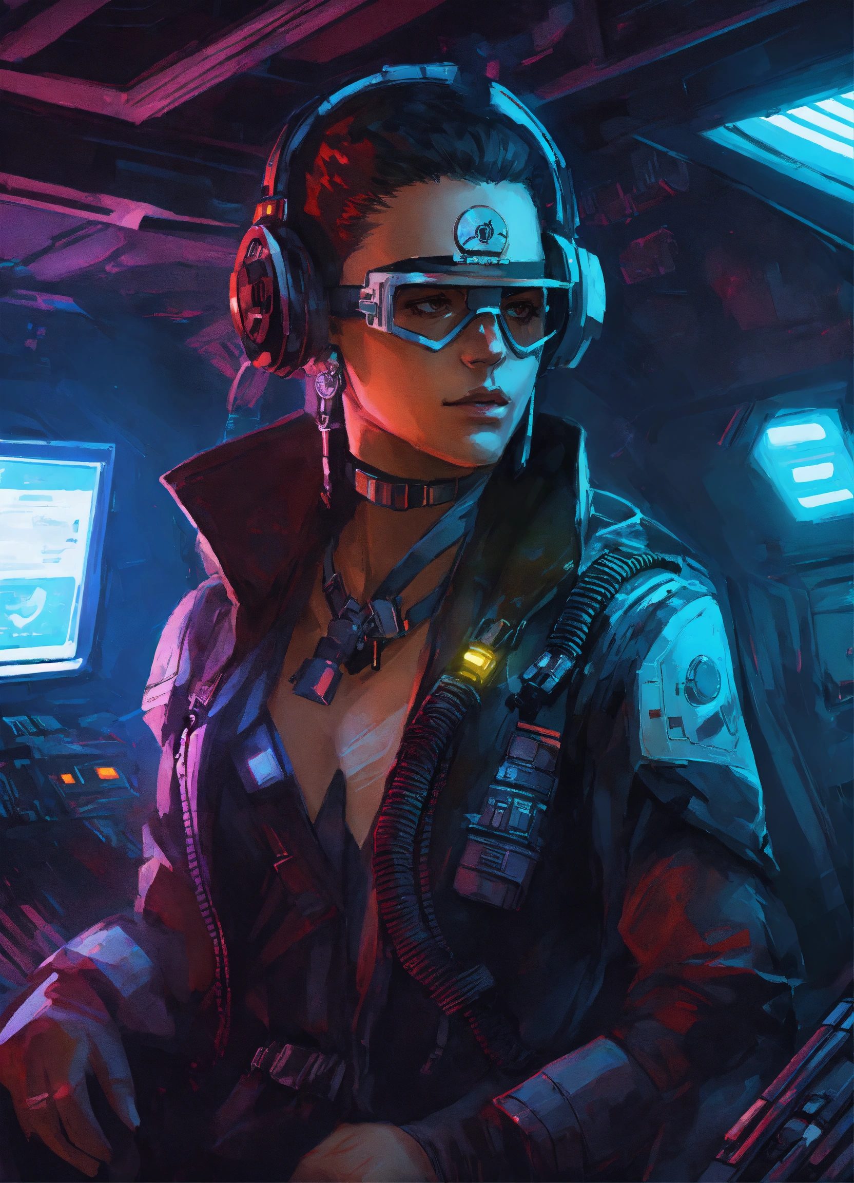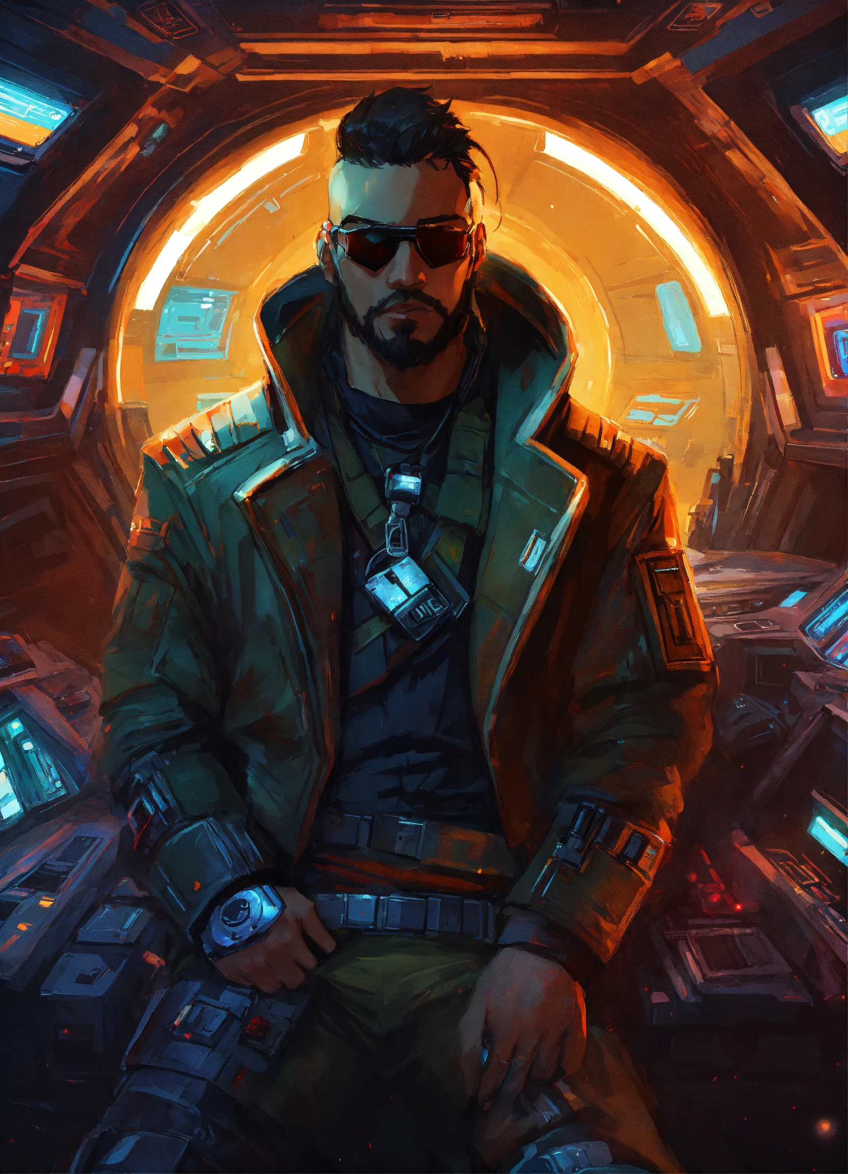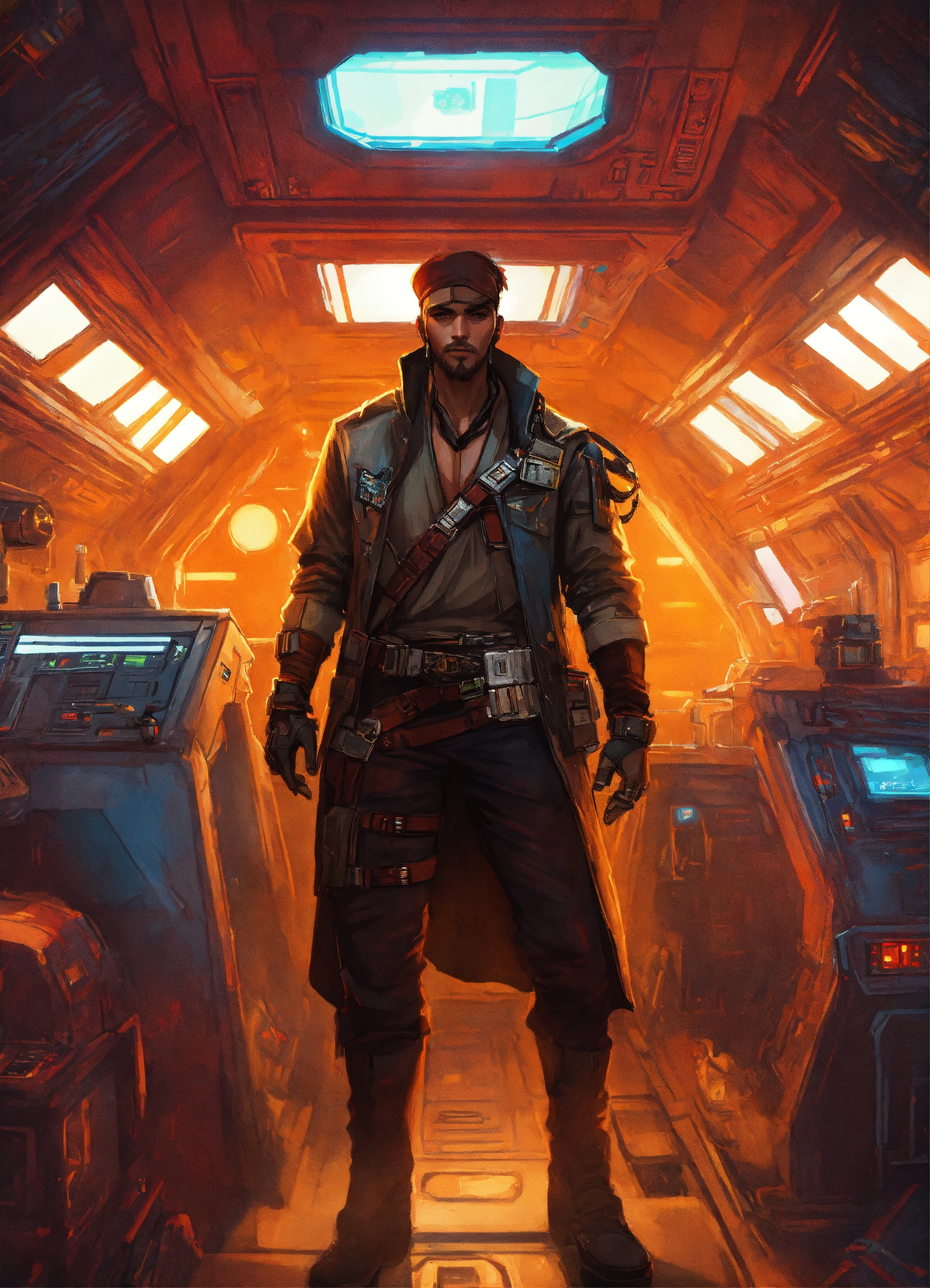 Digital character art of a cyberpunk pirate in a star wars spaceship