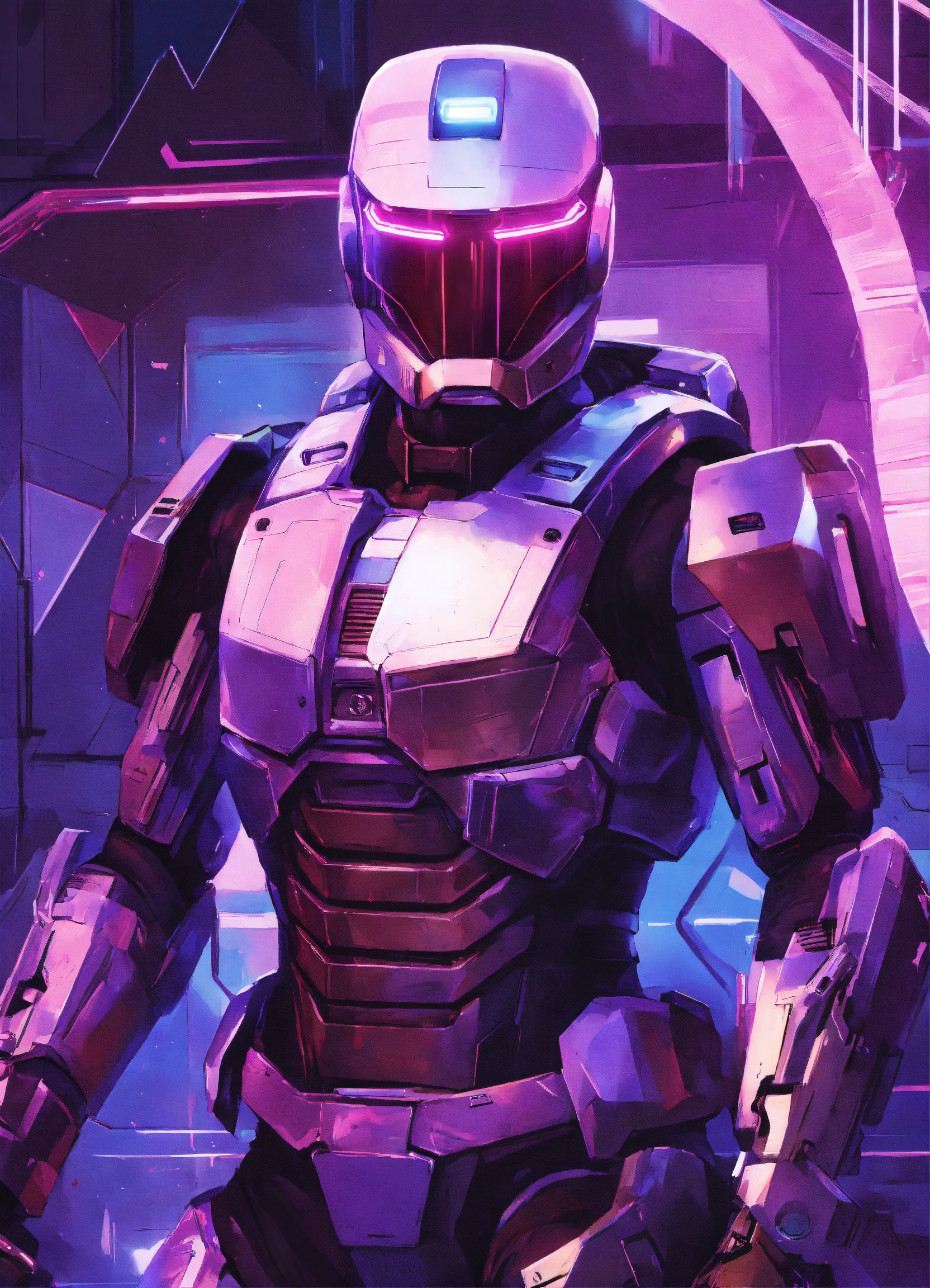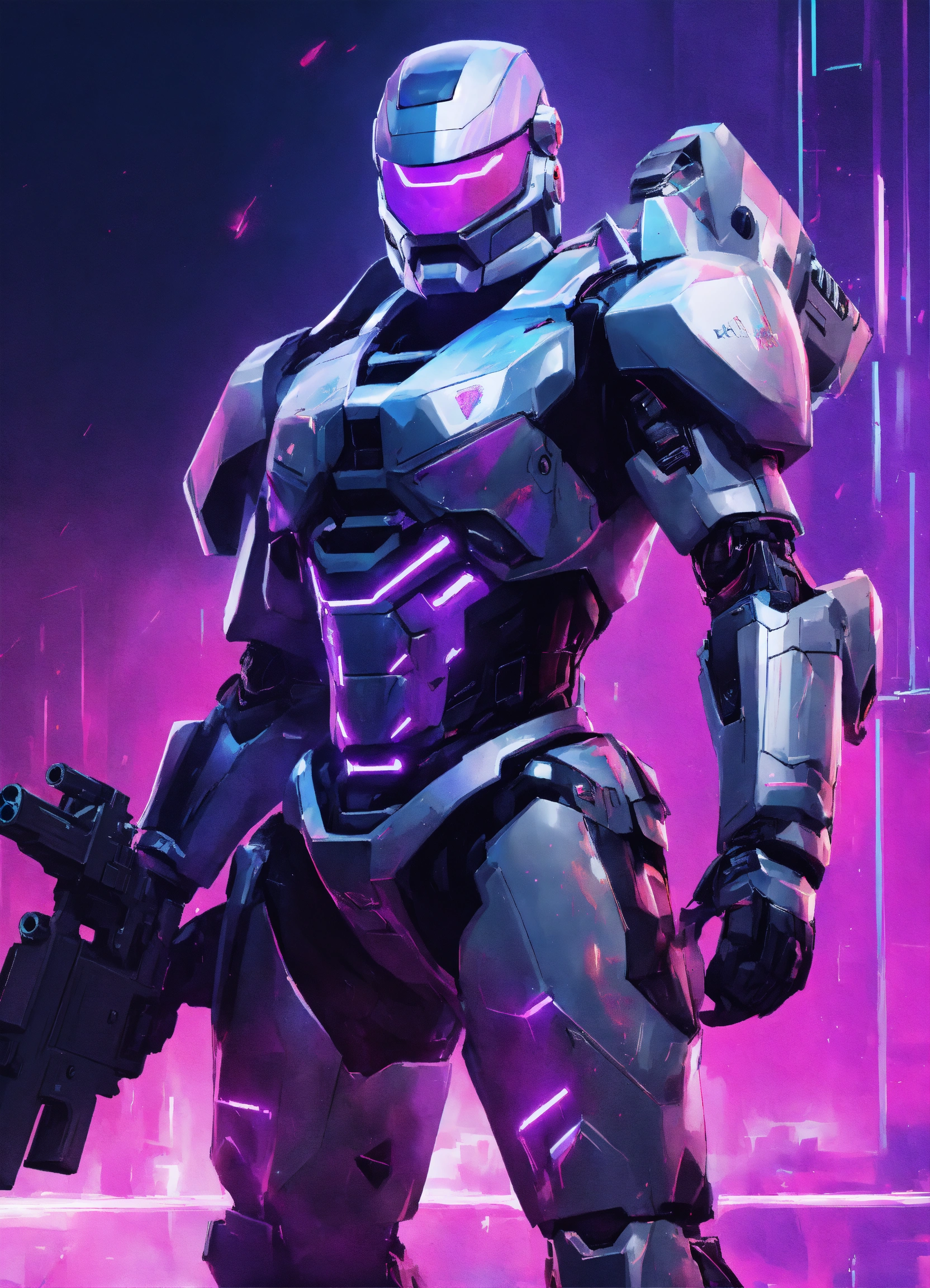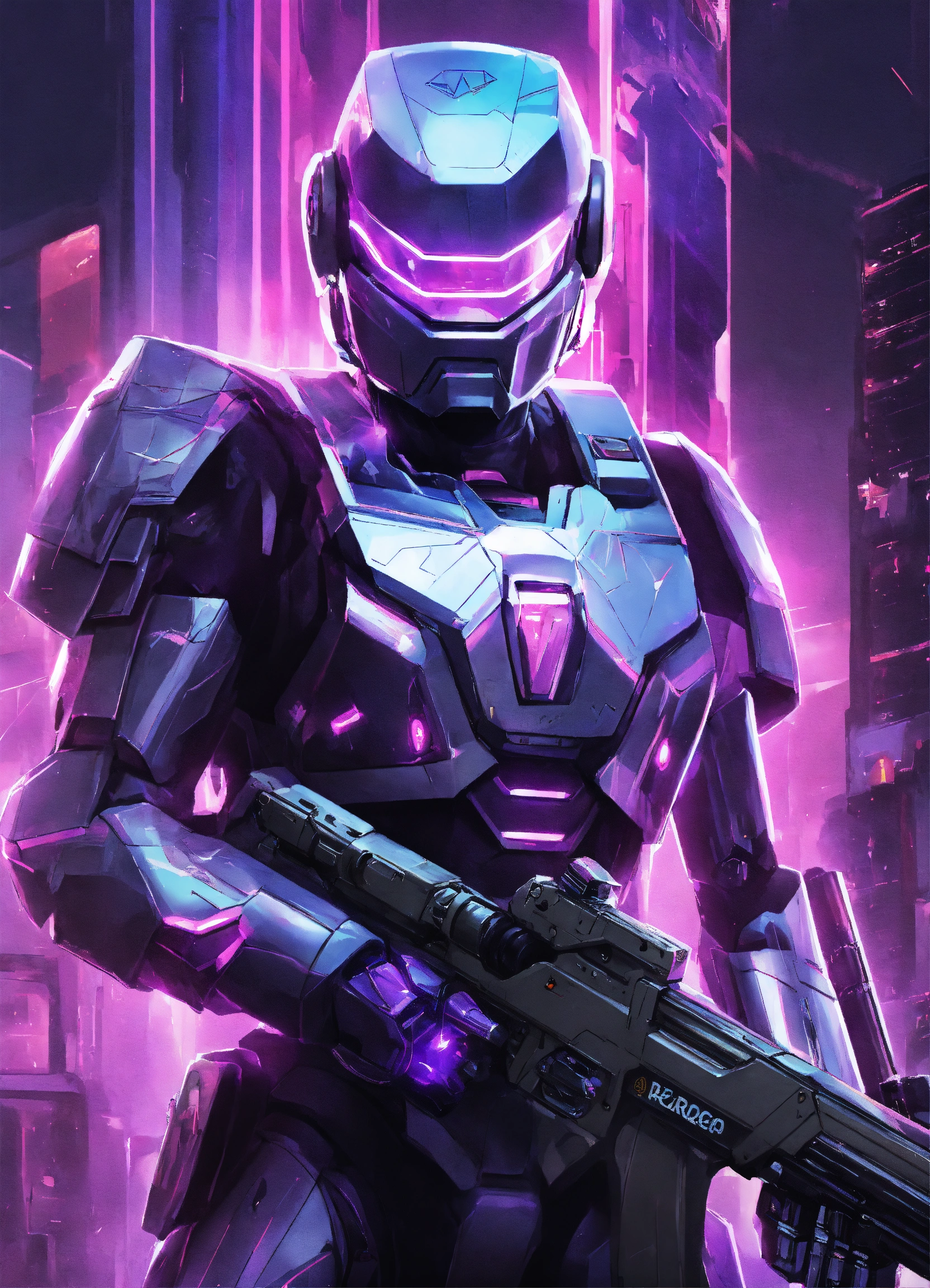 Kay/o, robocop, triangle pattern on face, holding big gun, electric details, electric aura, mechanical, art, grey and purple armor, valorant