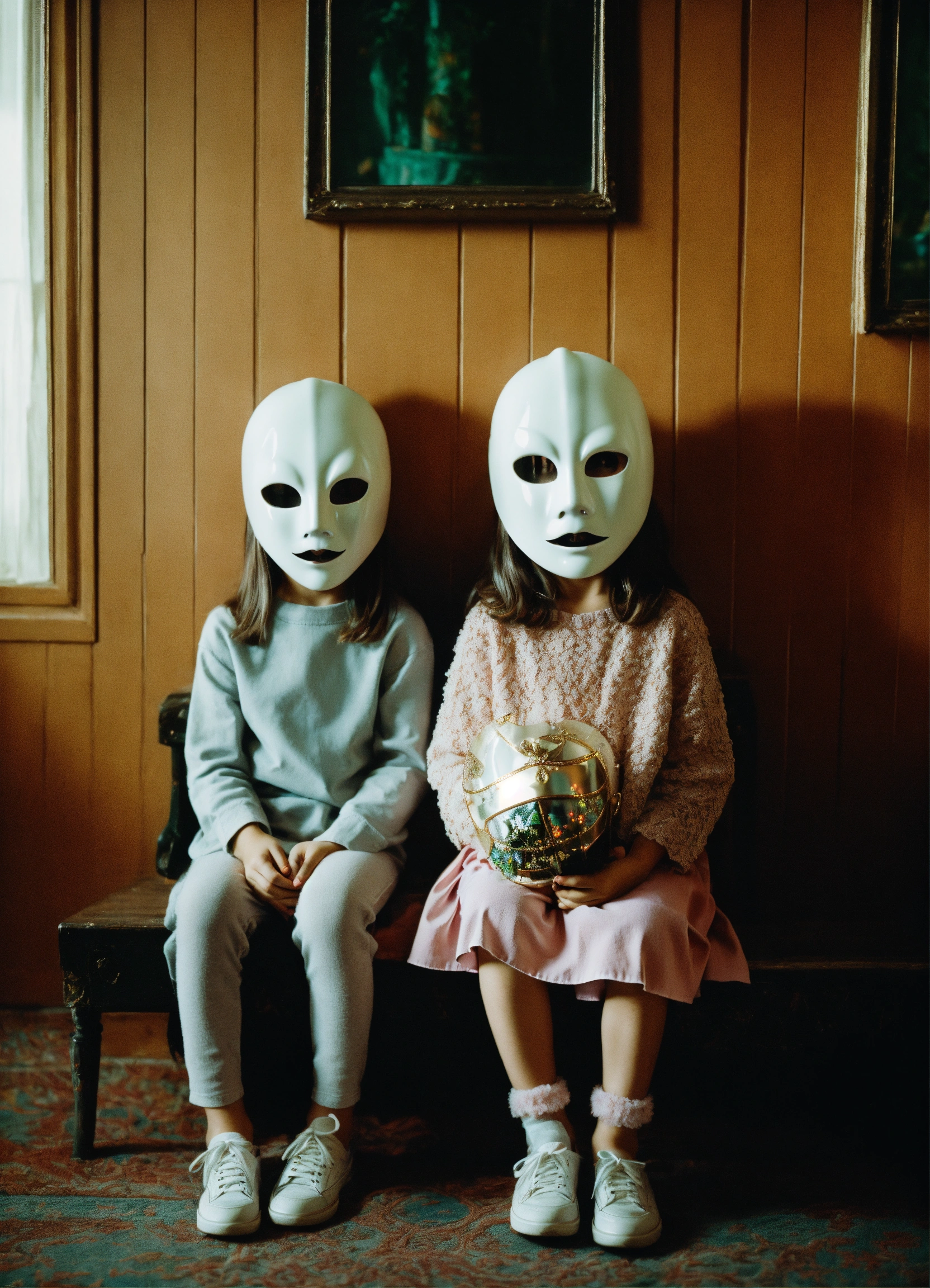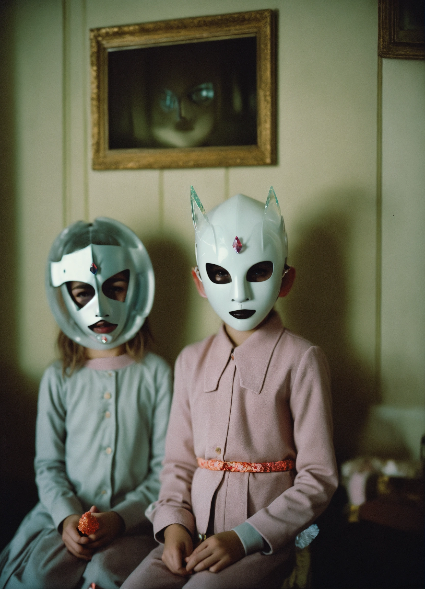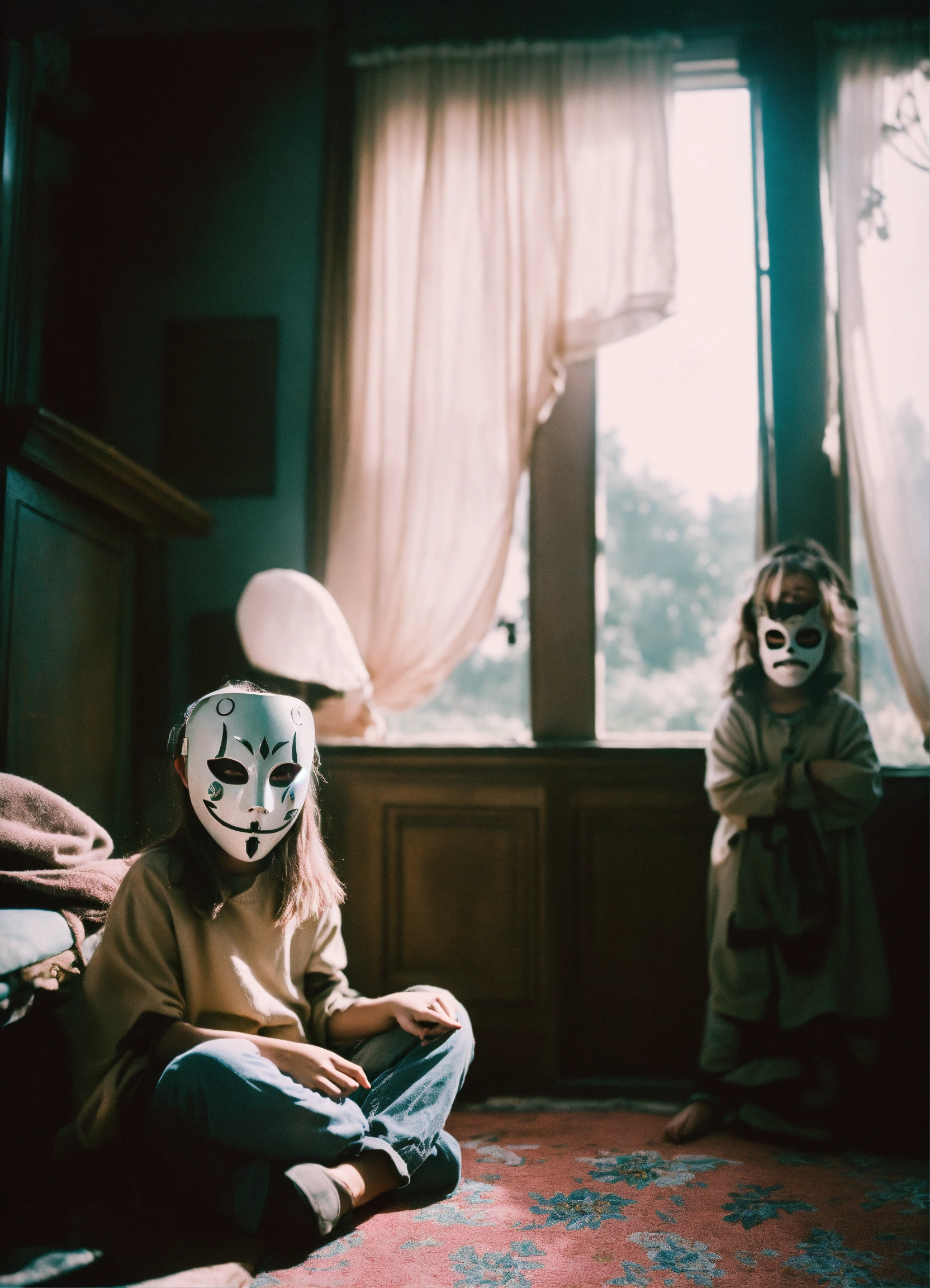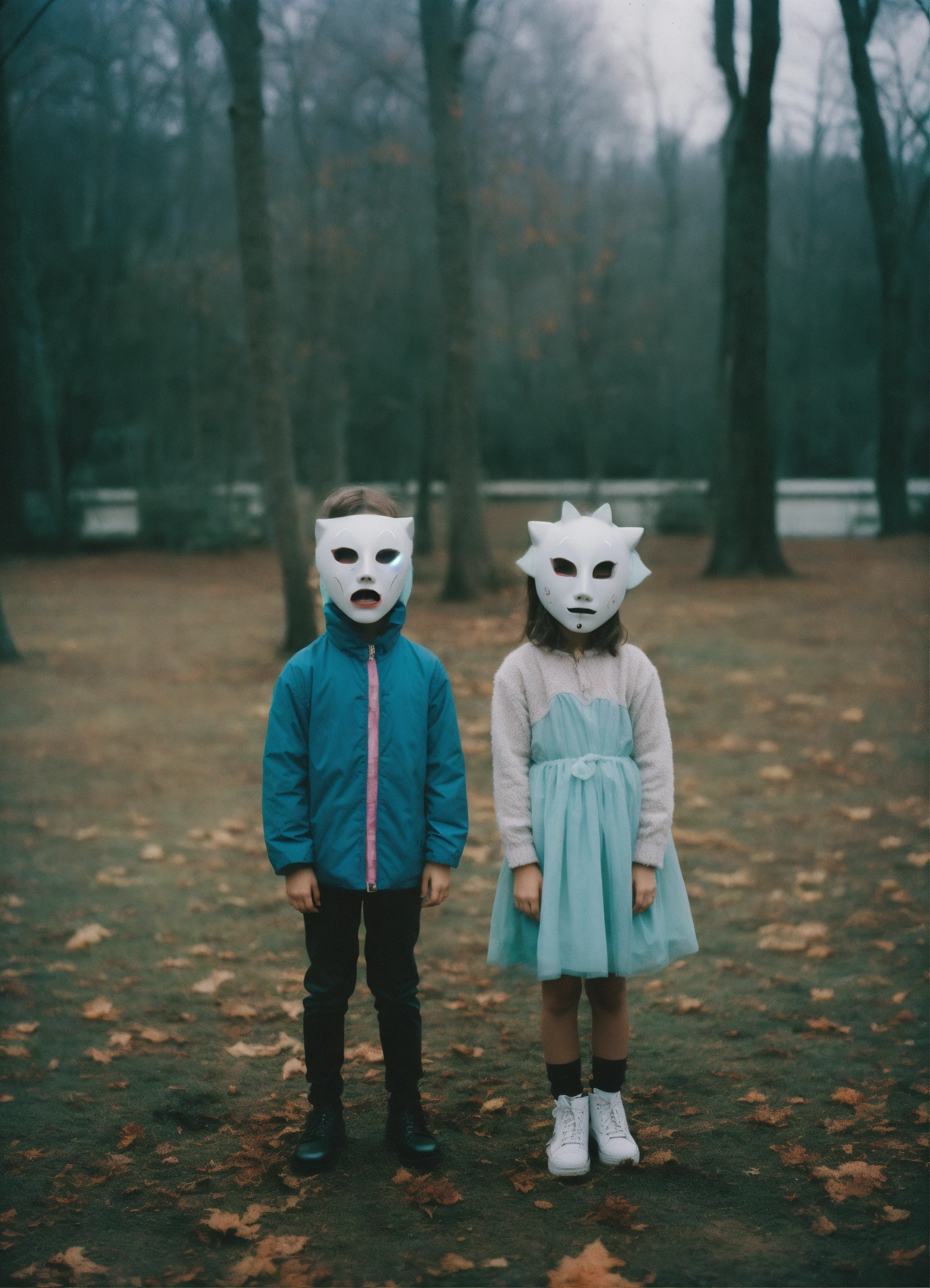 Crystal castle, analog photography, pale colors, moody ambient, sad energy, kids with scary masks in front of the camera