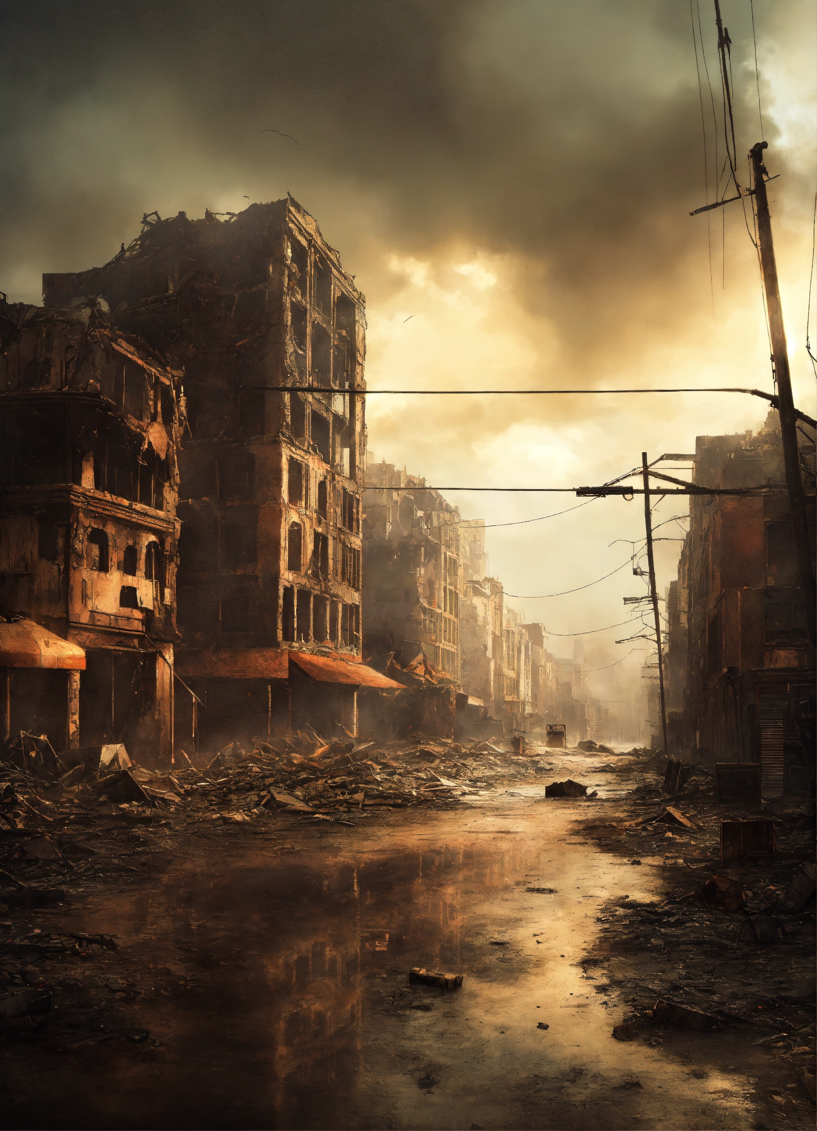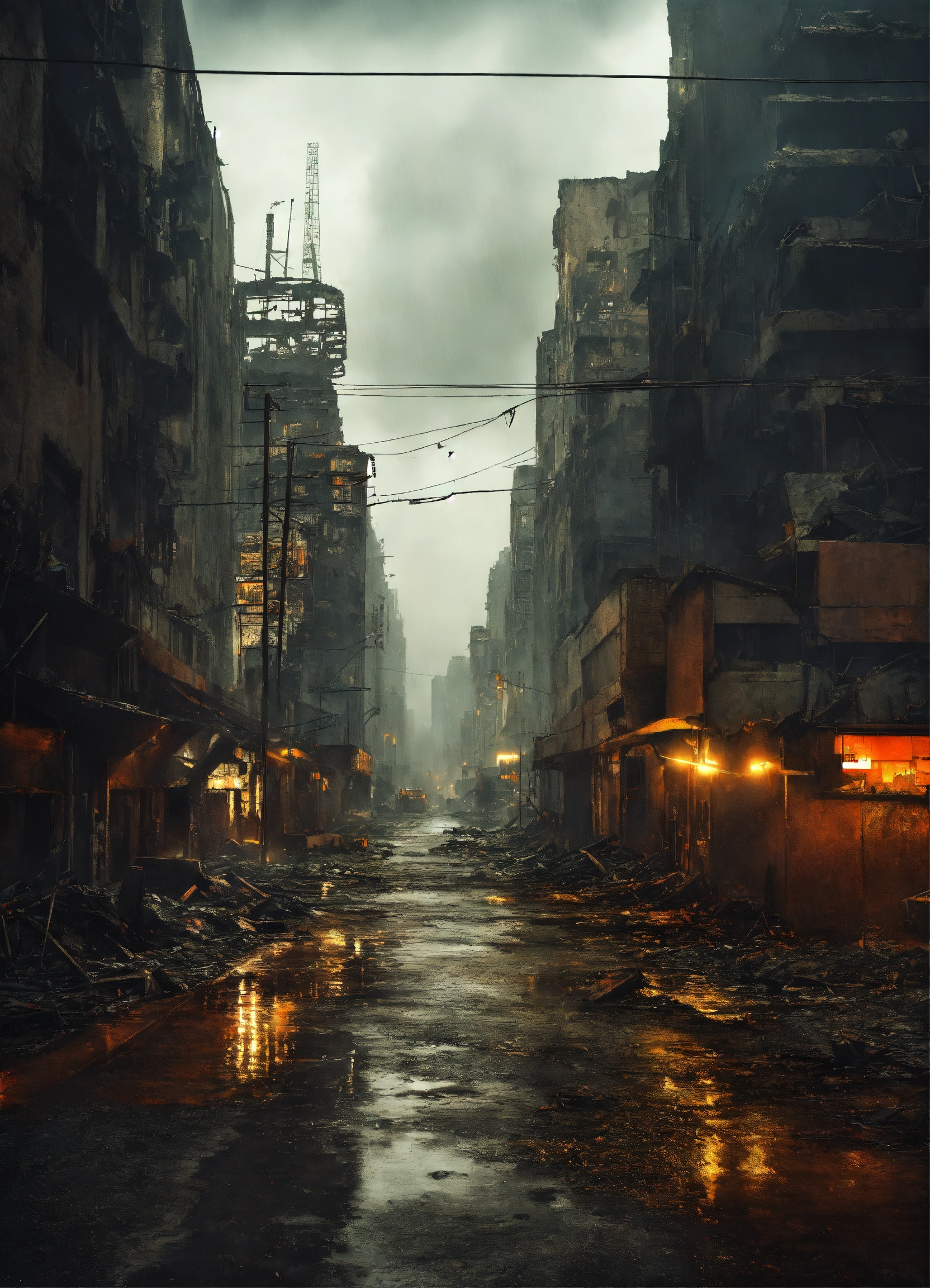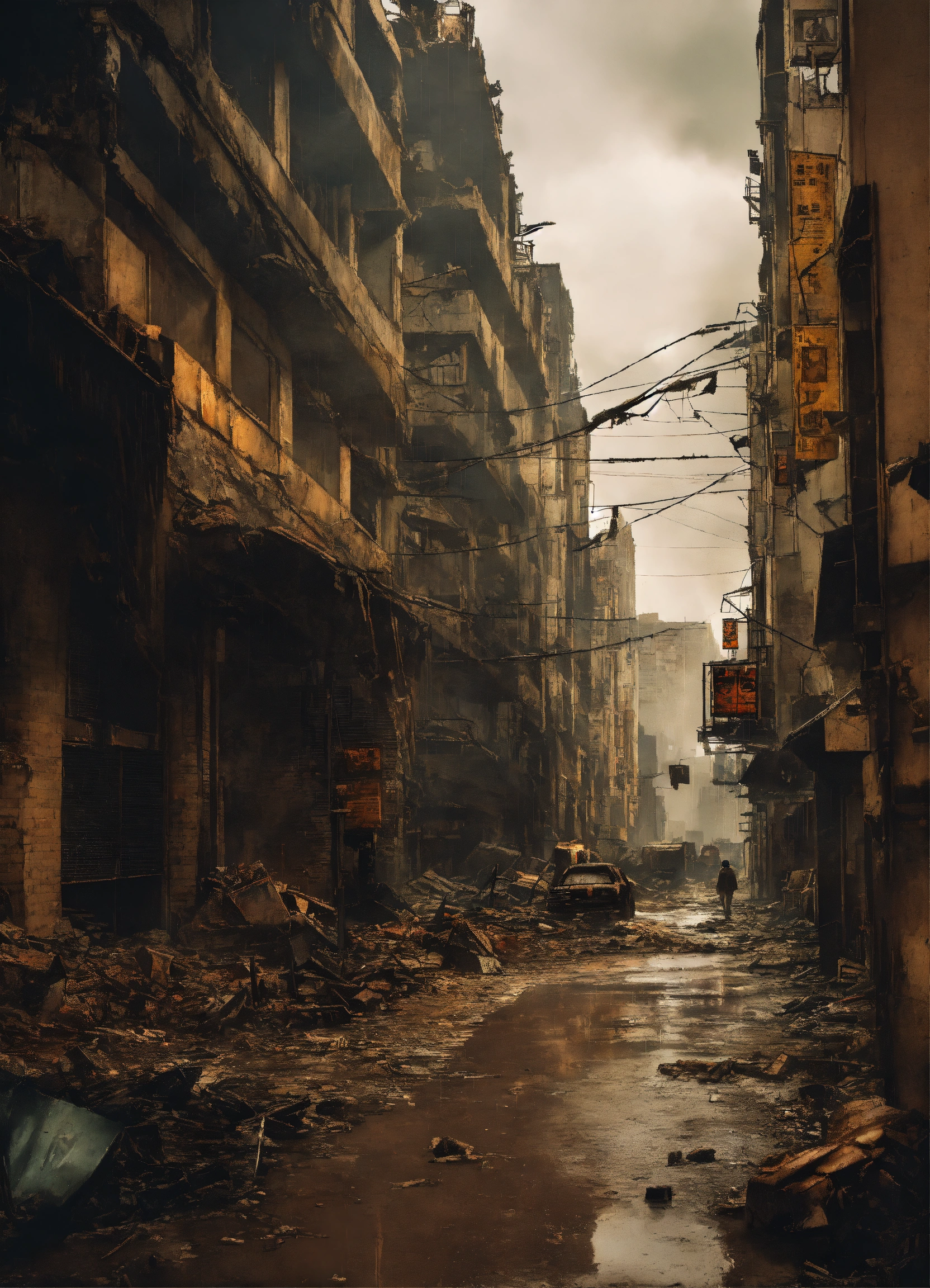 Apocalyptic destroyed city on a rainy day