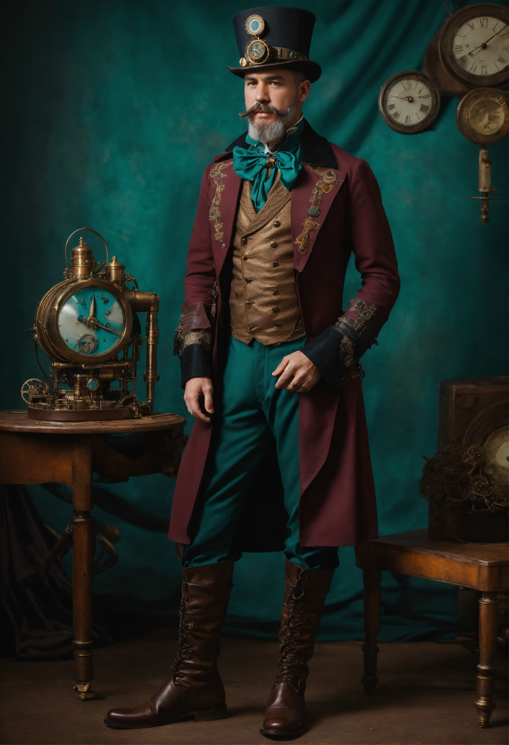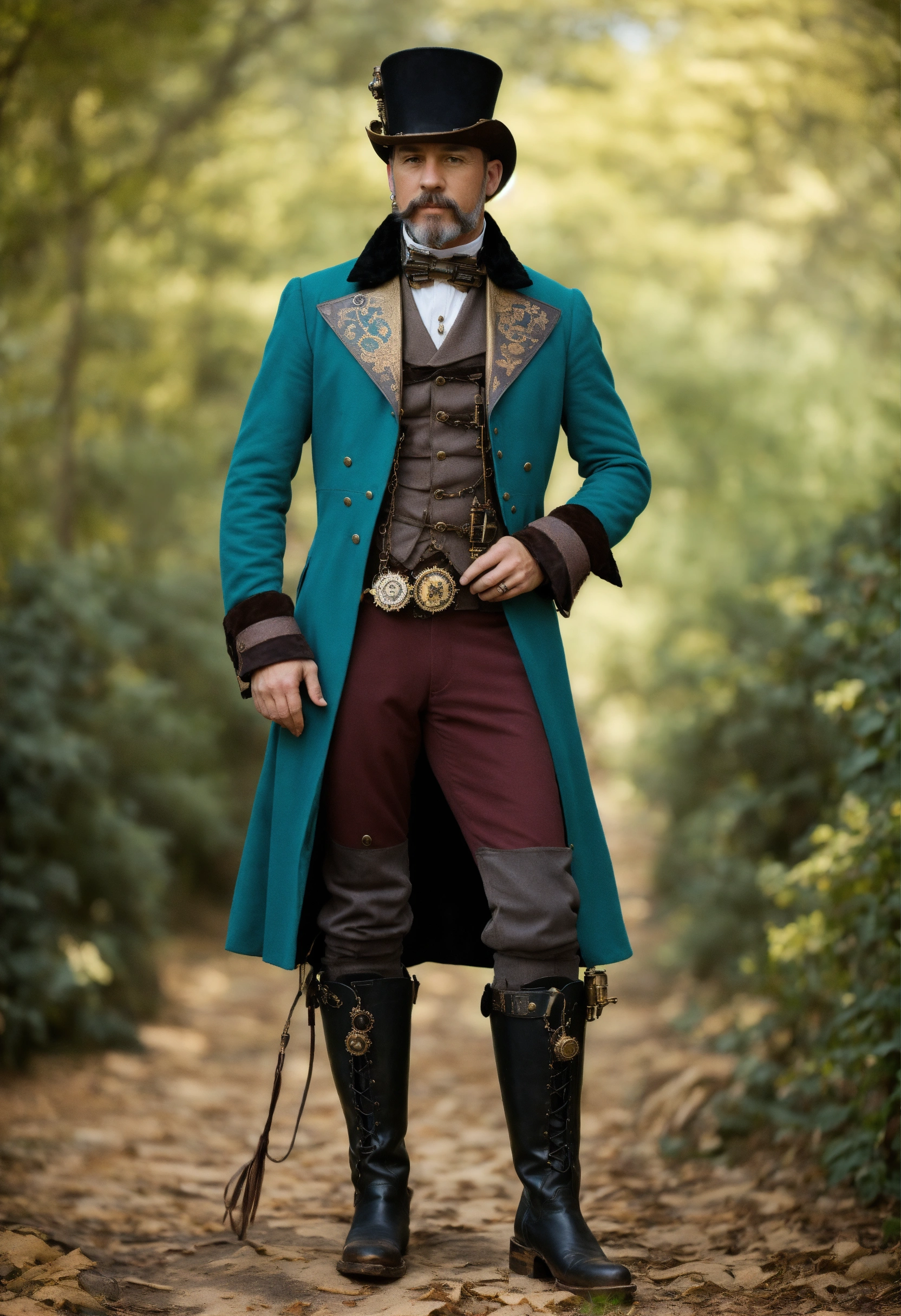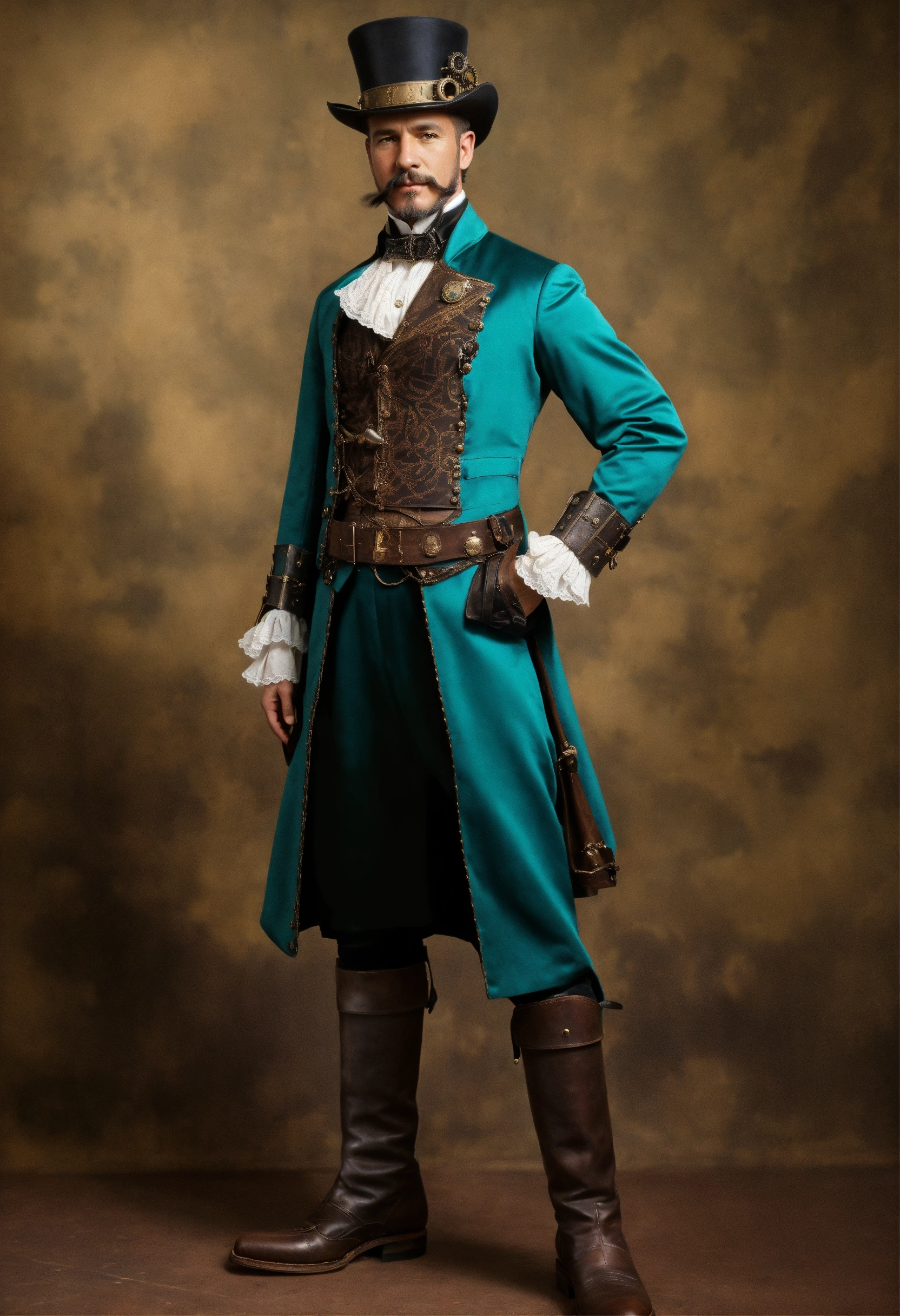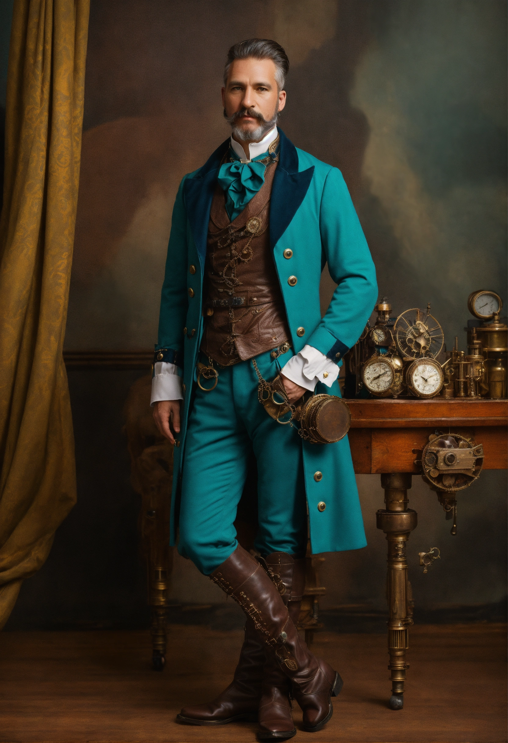 Full body image of a steampunk aristocrat, male, wearing a teal steampunk outfit and boots, caucasian, british, 1900s haircut and facial hair, 45 years old