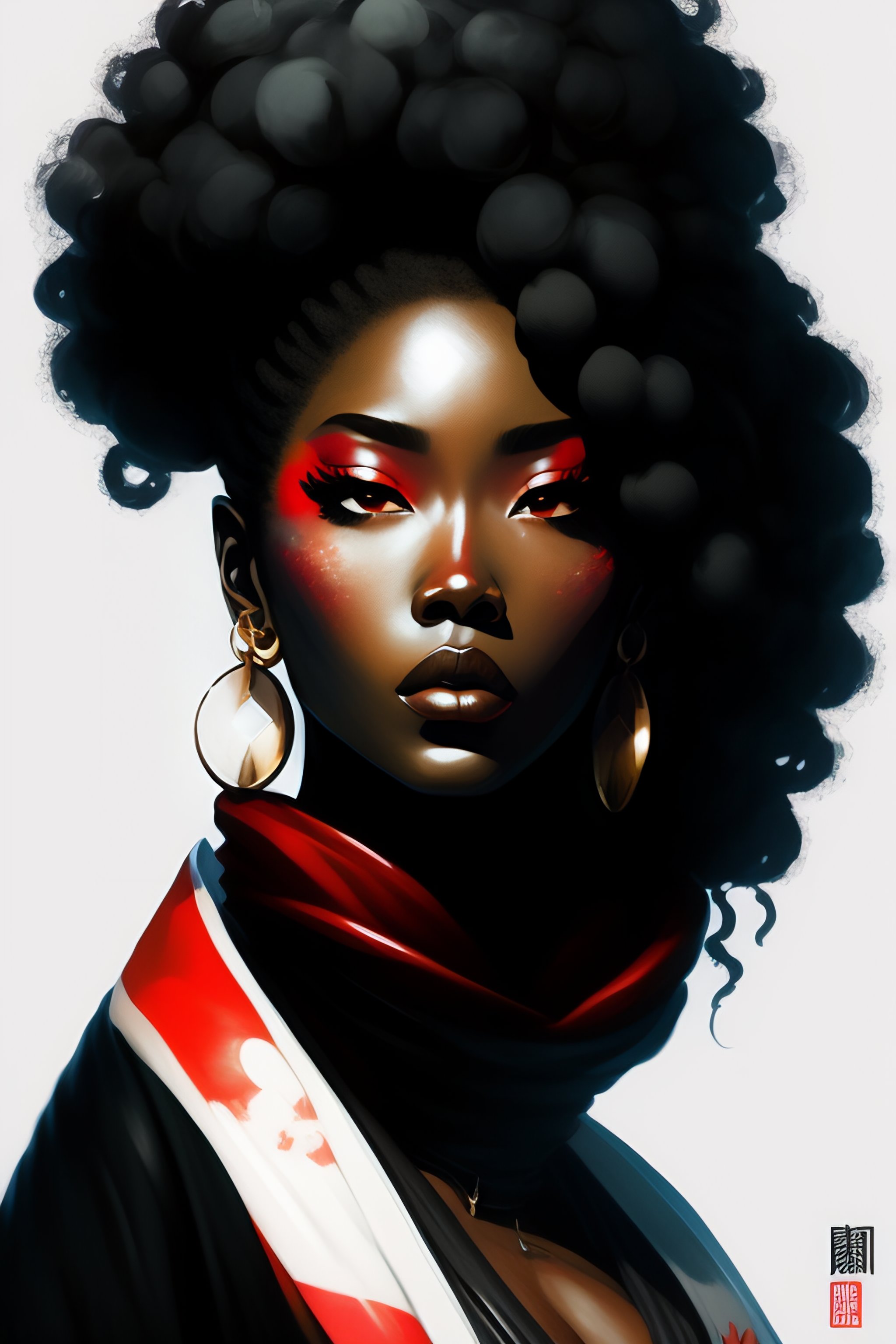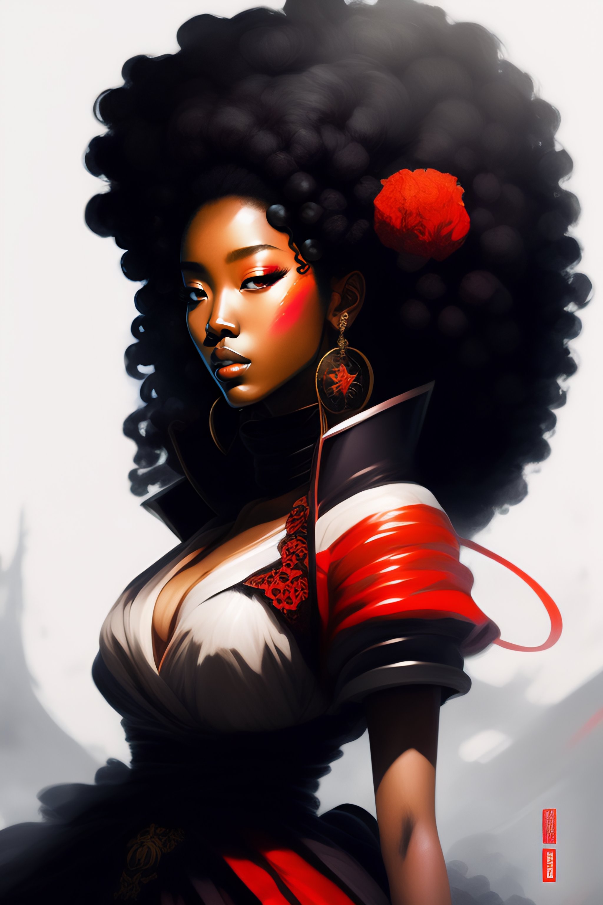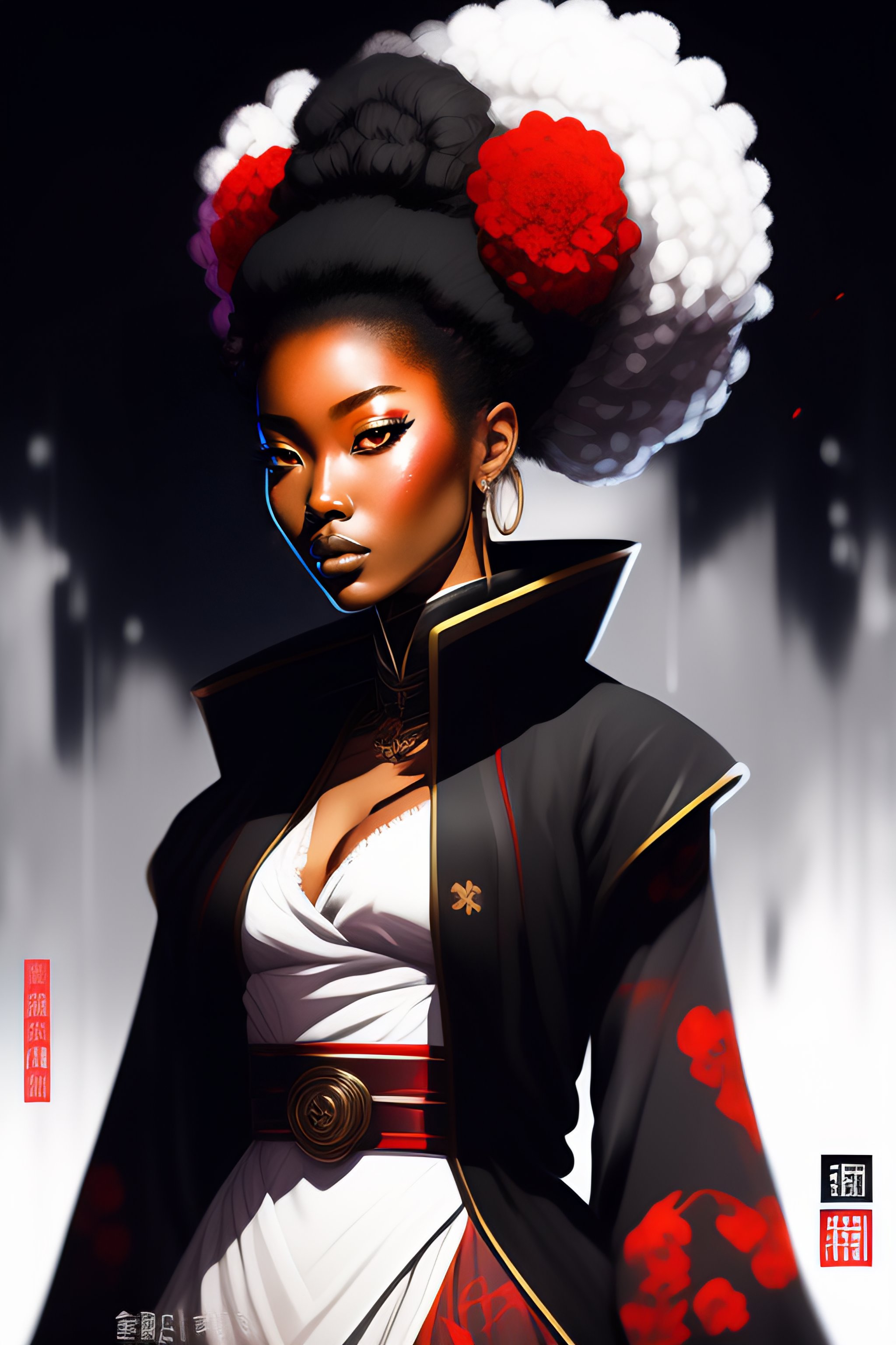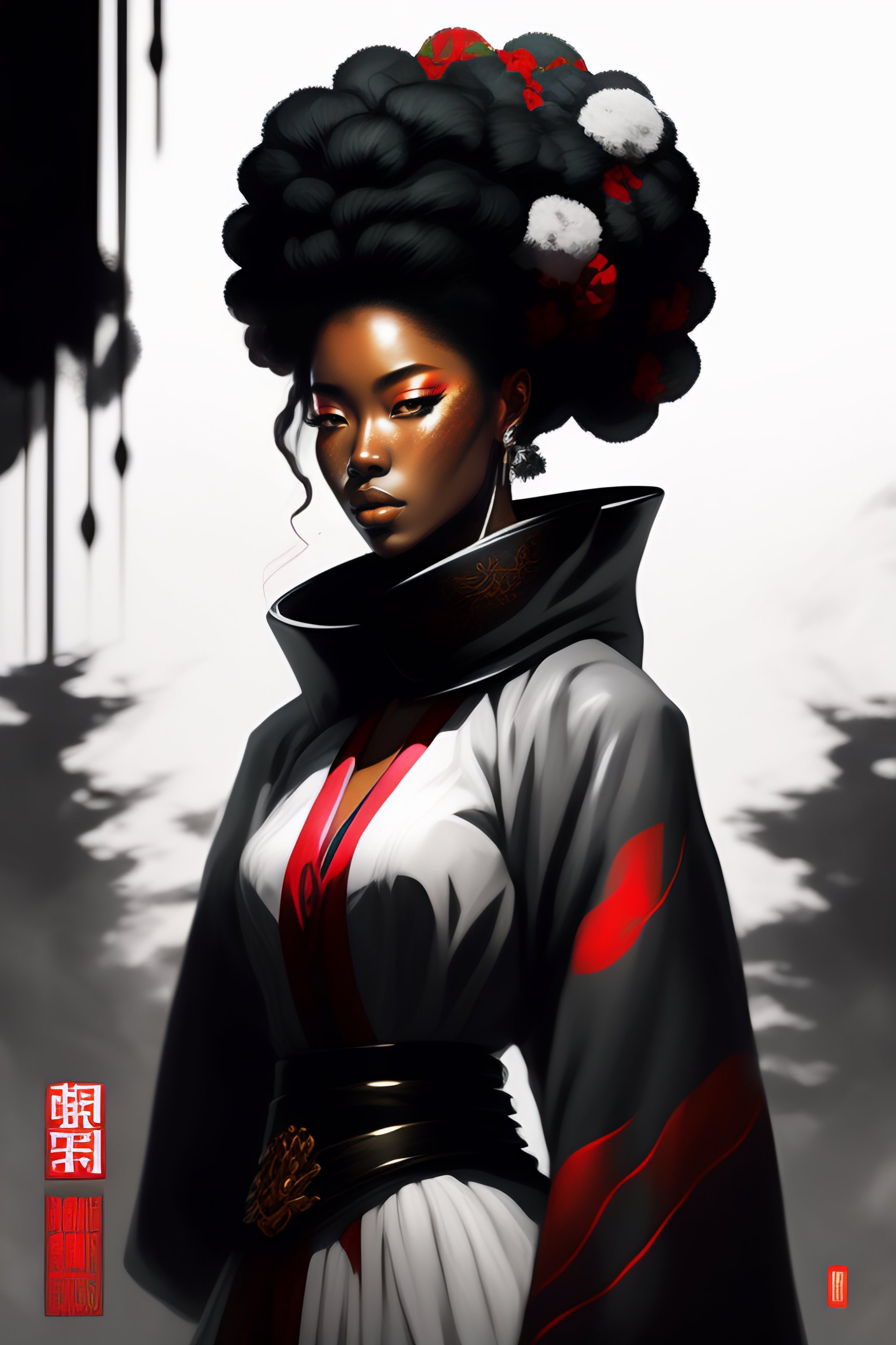 ((supervillain)) female afro samurai concept art, loose brush strokes, duotone digital painting, trending on art station, epic composition, large japanese characters, japanese language