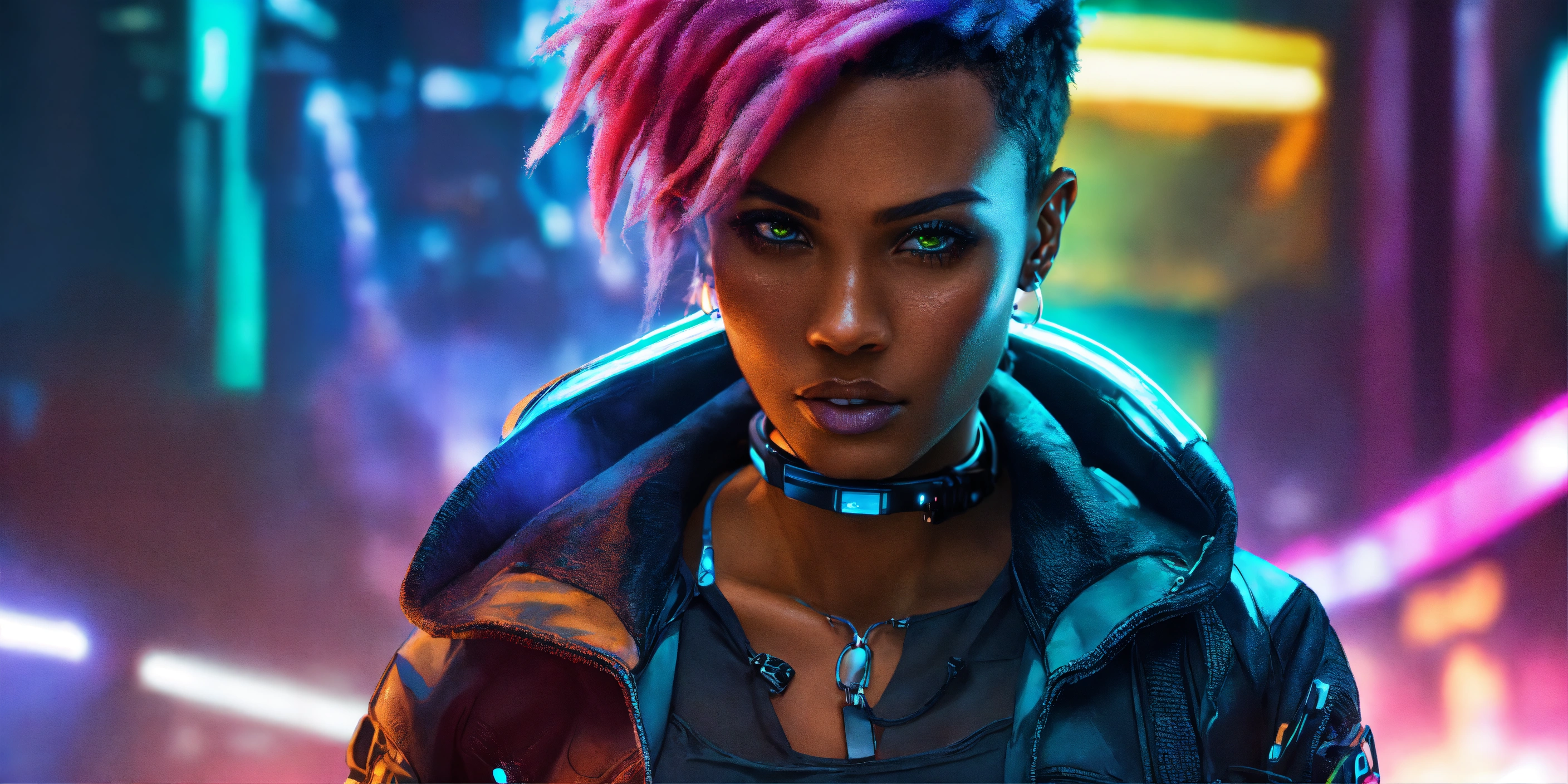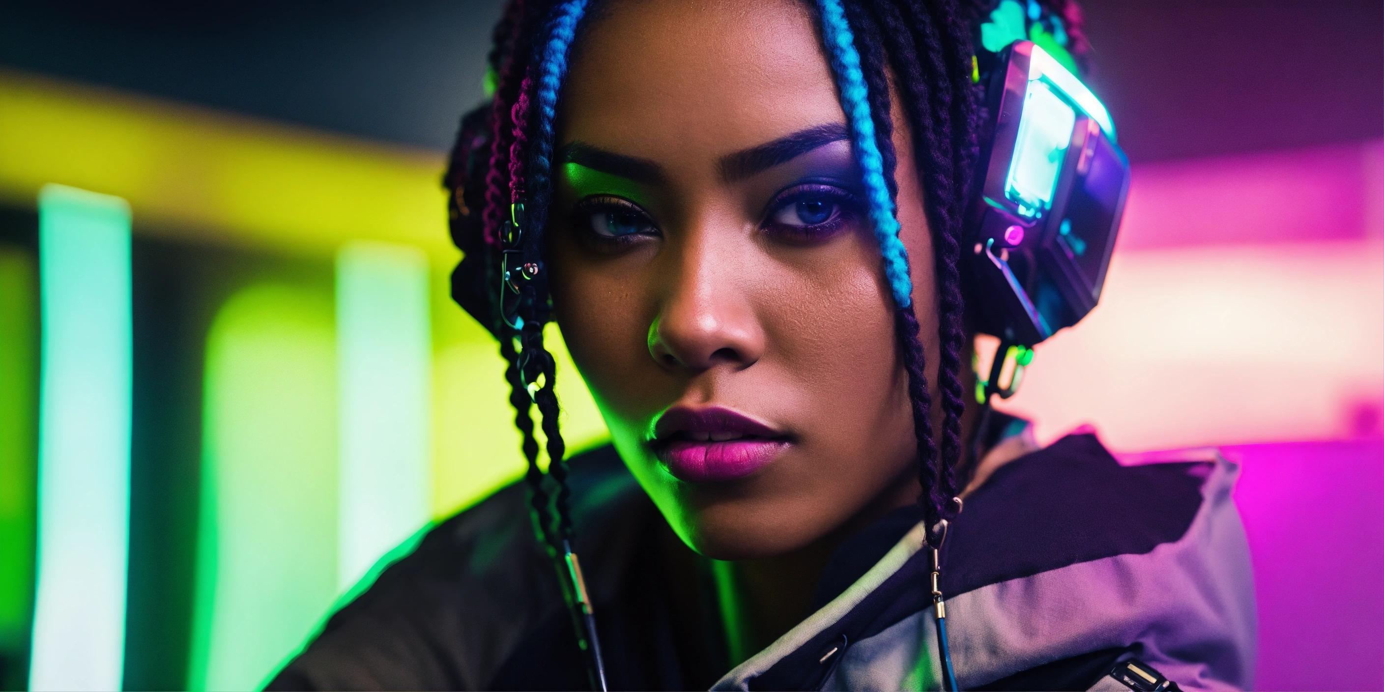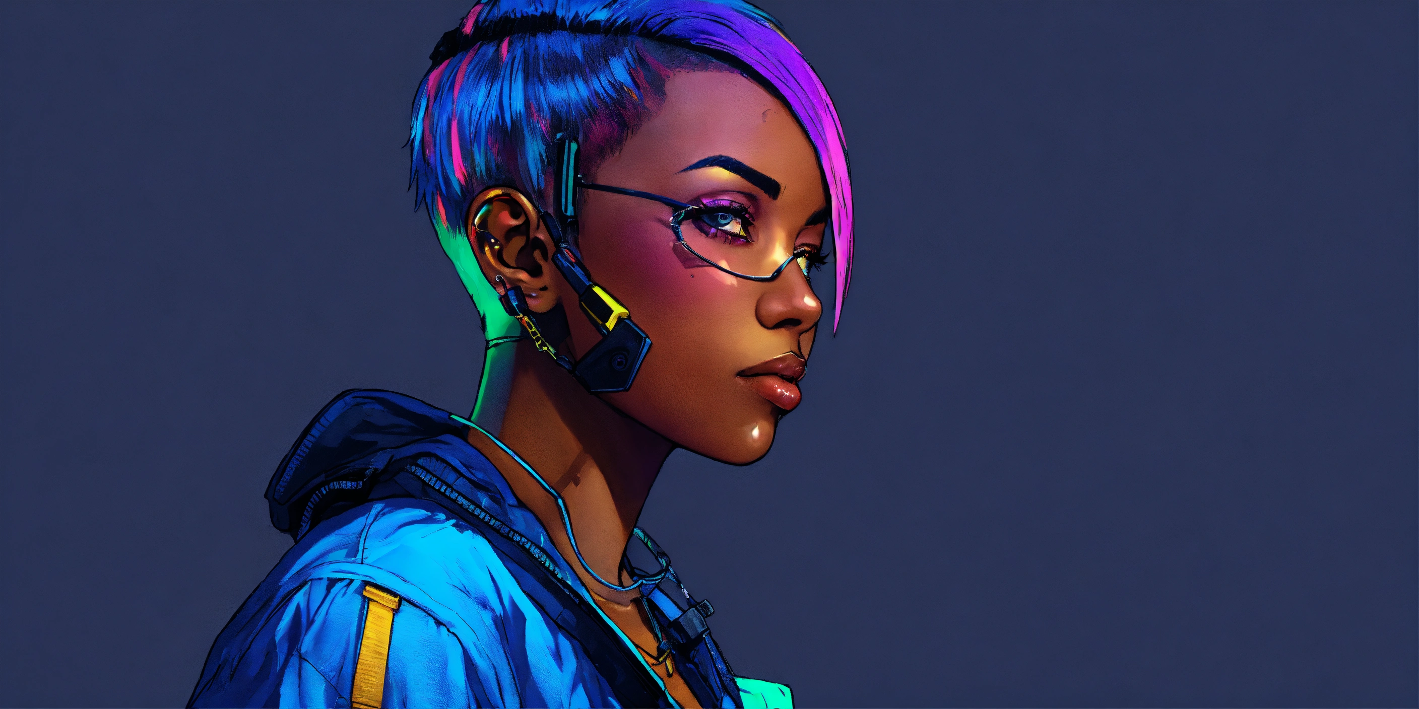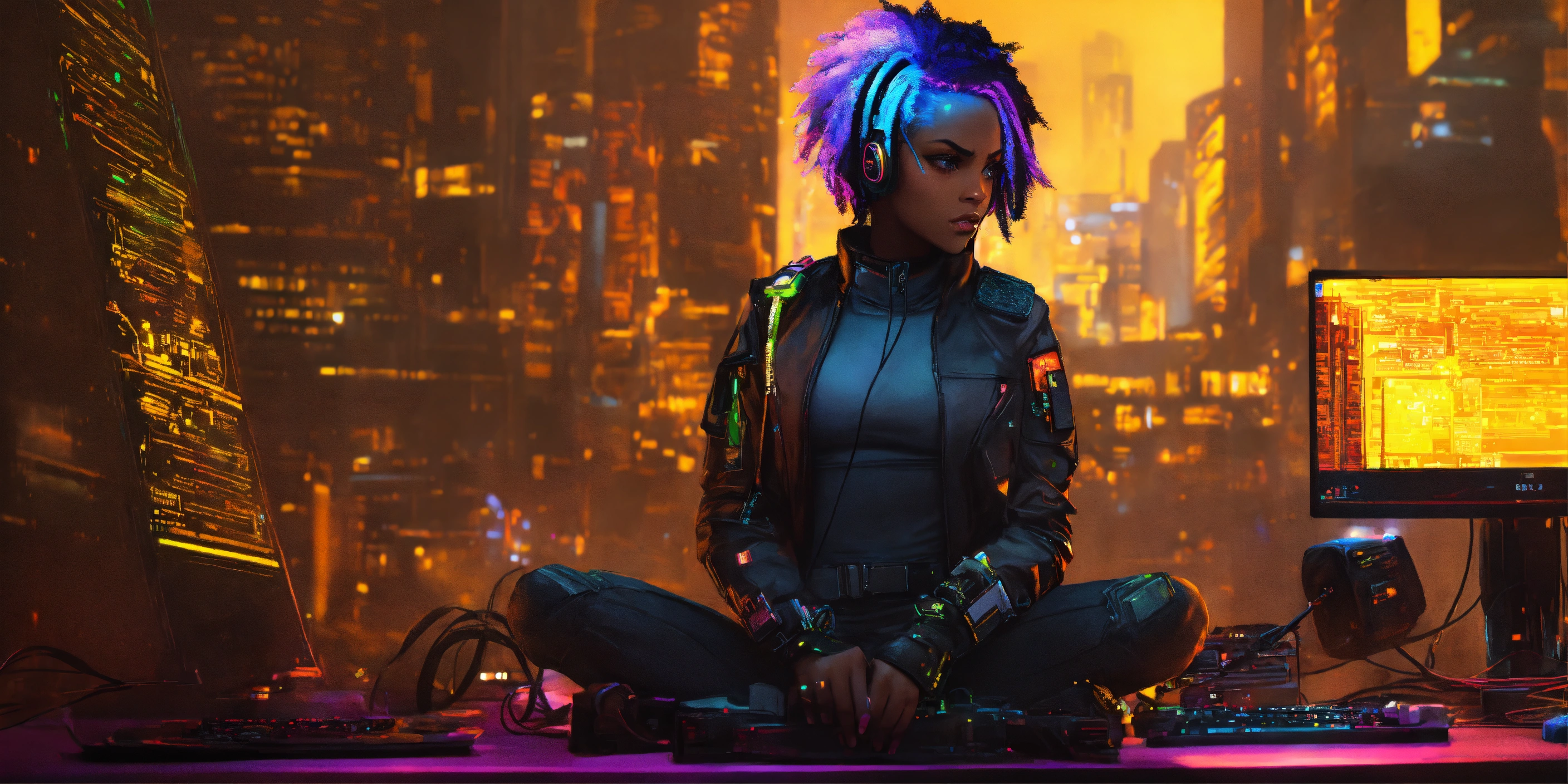 Female cyberpunk african american hacker with short multicolor hair