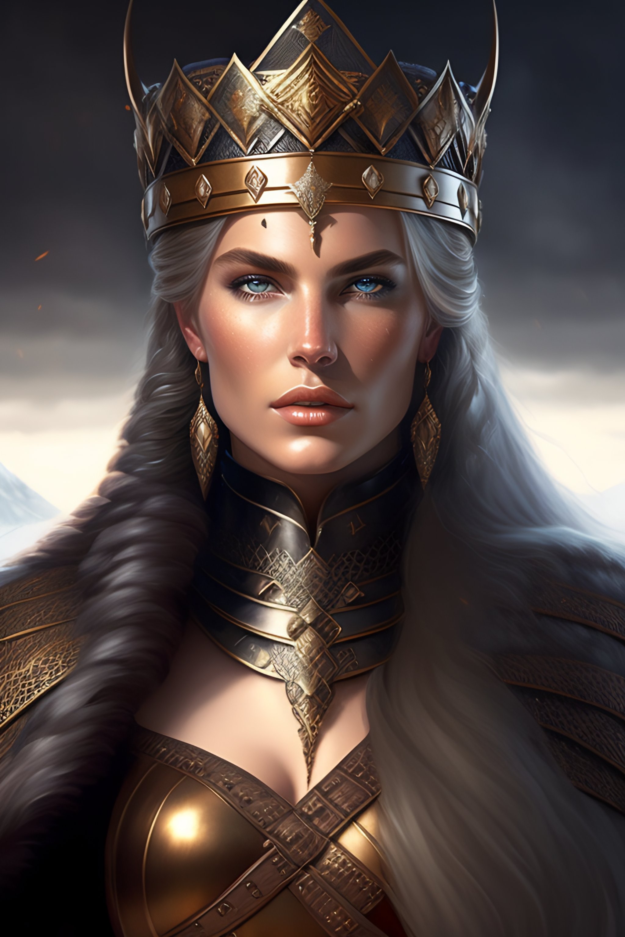 Medieval portrait of a viking warrior woman queen wearing a bronze crown and black chainmail armor and a cloak white long hair sharp features, grim, cold stare, dark colors, winds of winter, volumetric lighting, baroque oil painting epic angle by greg rutkowski, artgerm, wlop, alphonse mucha dynamic lighting hyperdetailed intricately detailed
