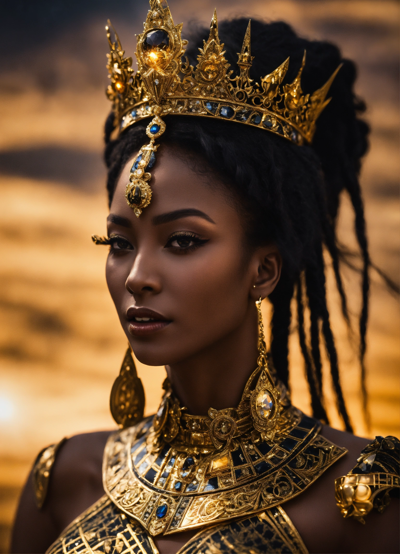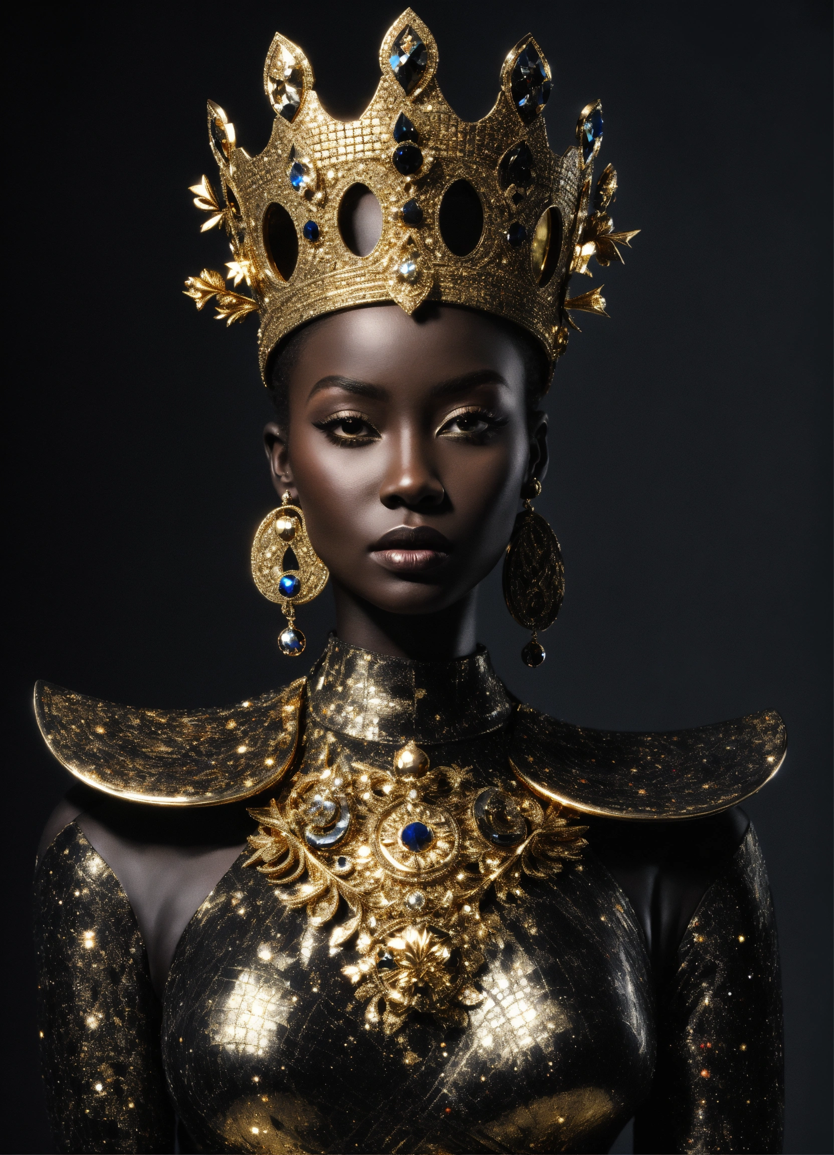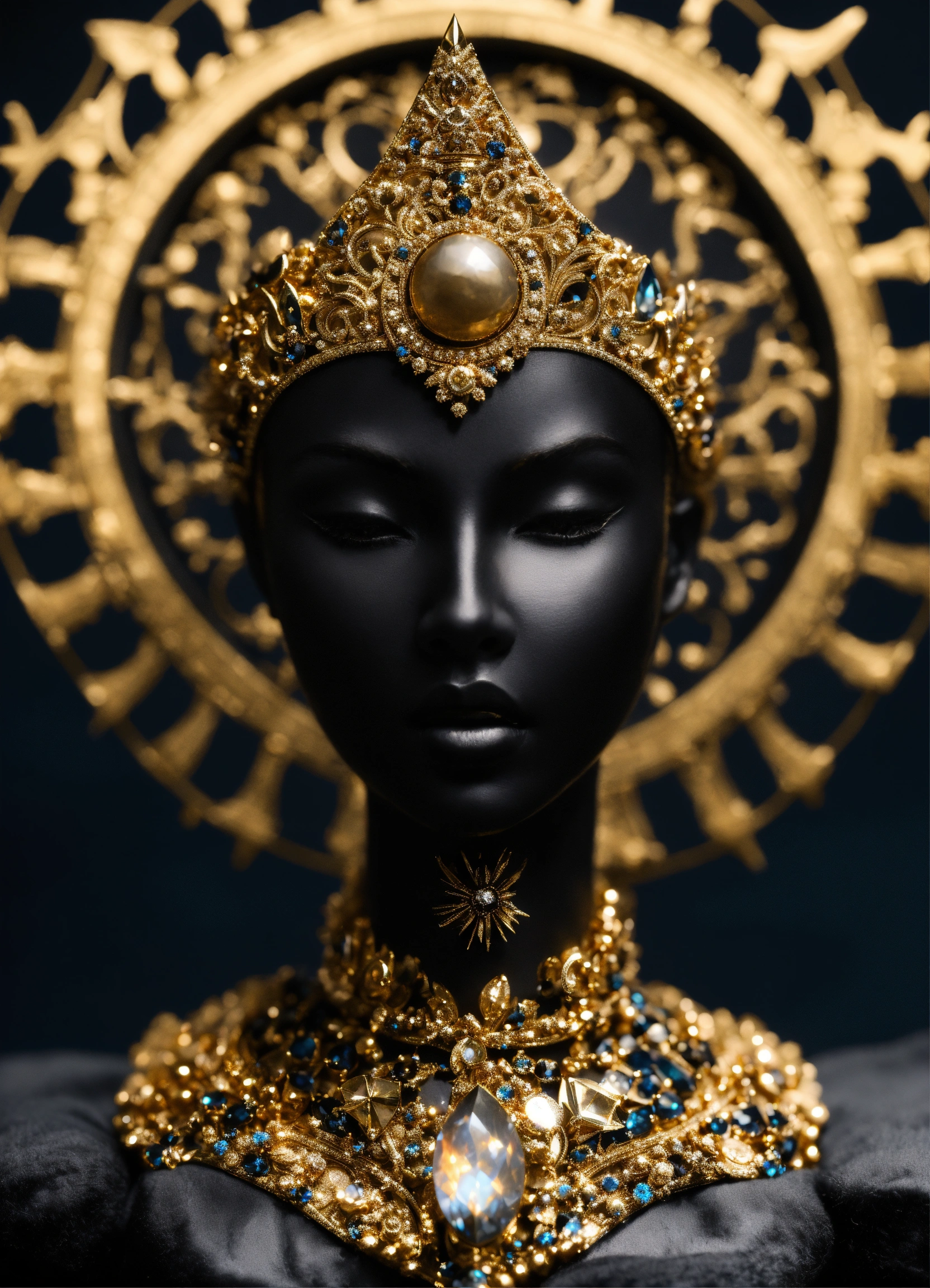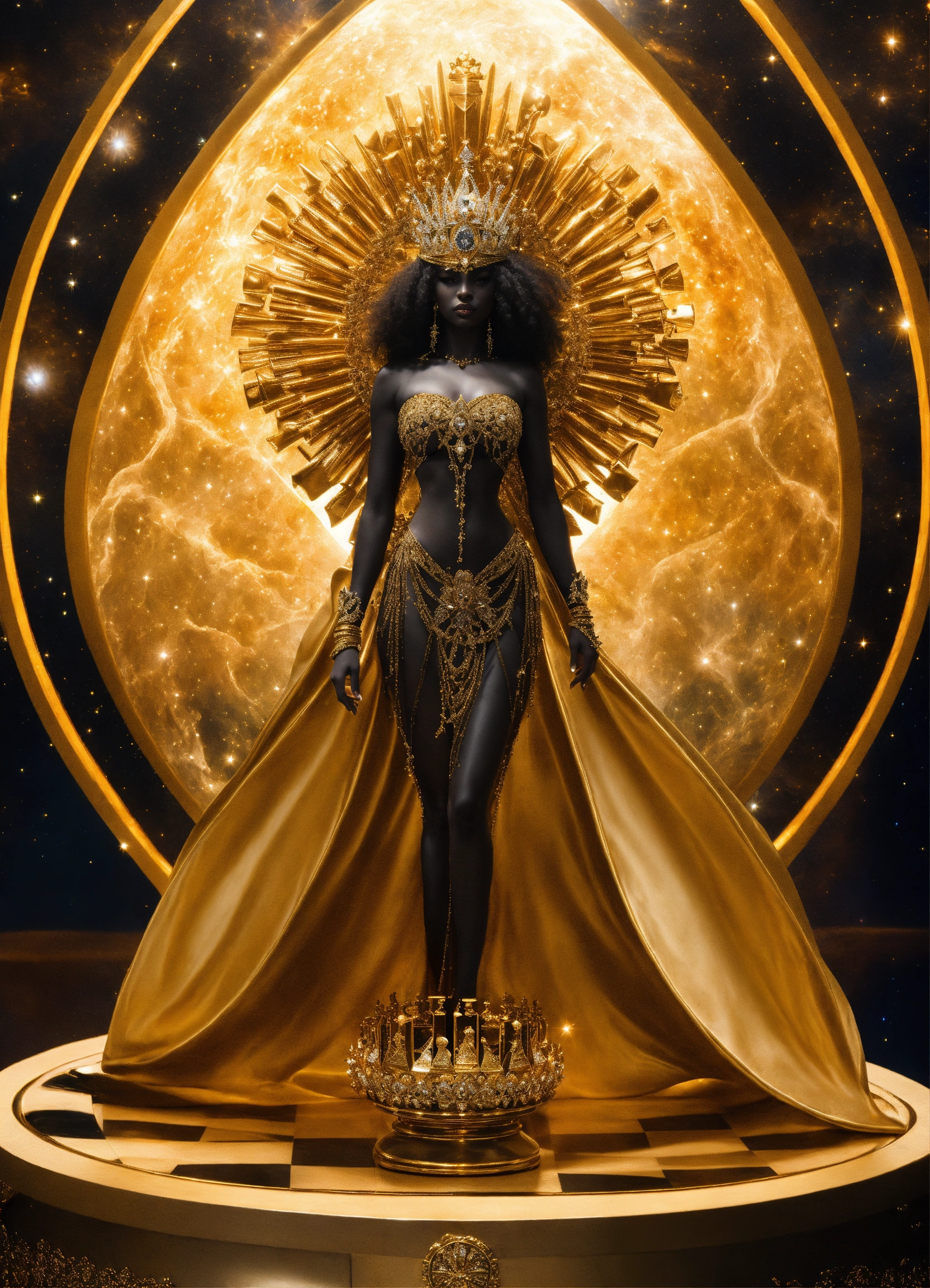 Minimalism. black solar queen with long oversized white flowing hair. as the pinnacle of celestial chess mastery, the "solar black queen” reigns supreme on the board. crafted from the most exquisite gold and adorned with diamonds that twinkle like distant stars, this opulent chess piece exudes an aura of unrivaled regal authority. her countenance is angelic, with chiseled features that bear the weight of cosmic sovereignty, and her eyes, like miniature suns, blaze with the brilliance of celestial power. the "solar black queen" stands as a testament to the grandeur of the universe, a symbol of cosmic mastery in the grand cosmic match. photography