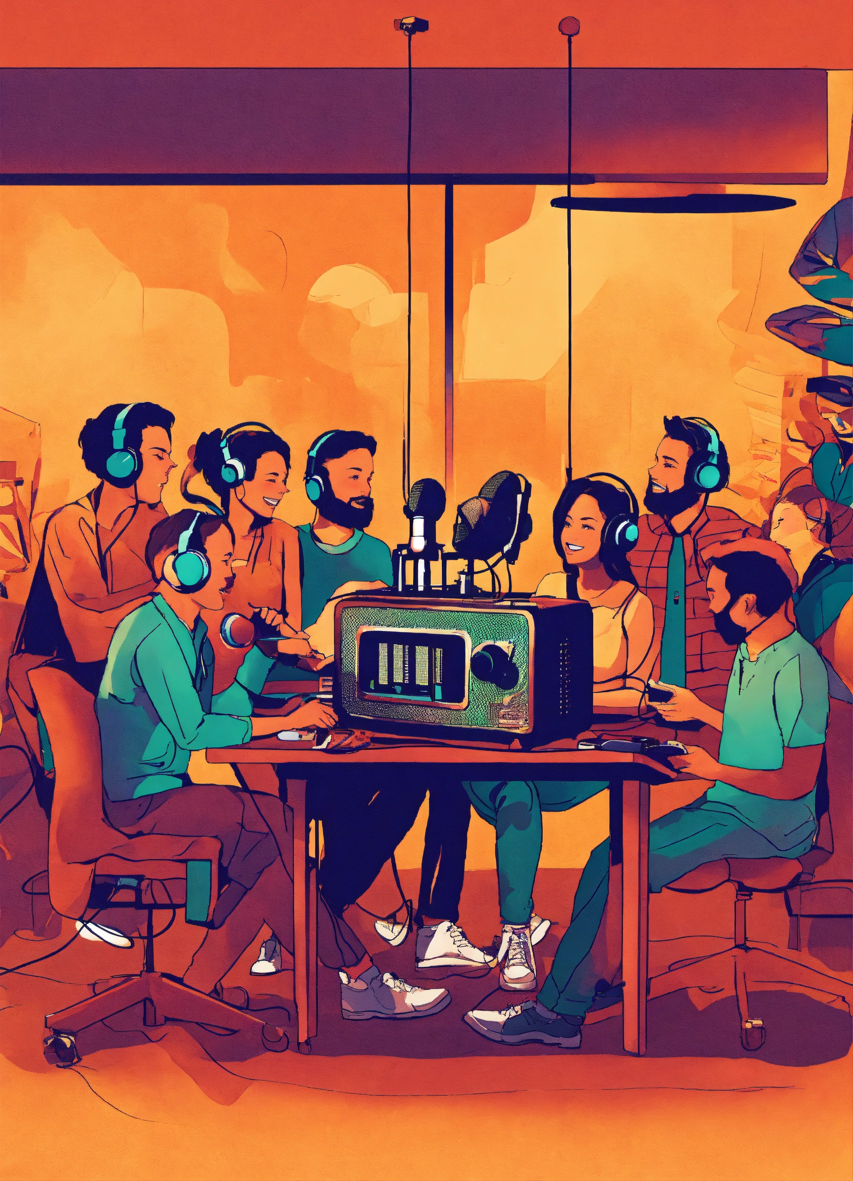 A group of 8 people doing a radio podcast session together