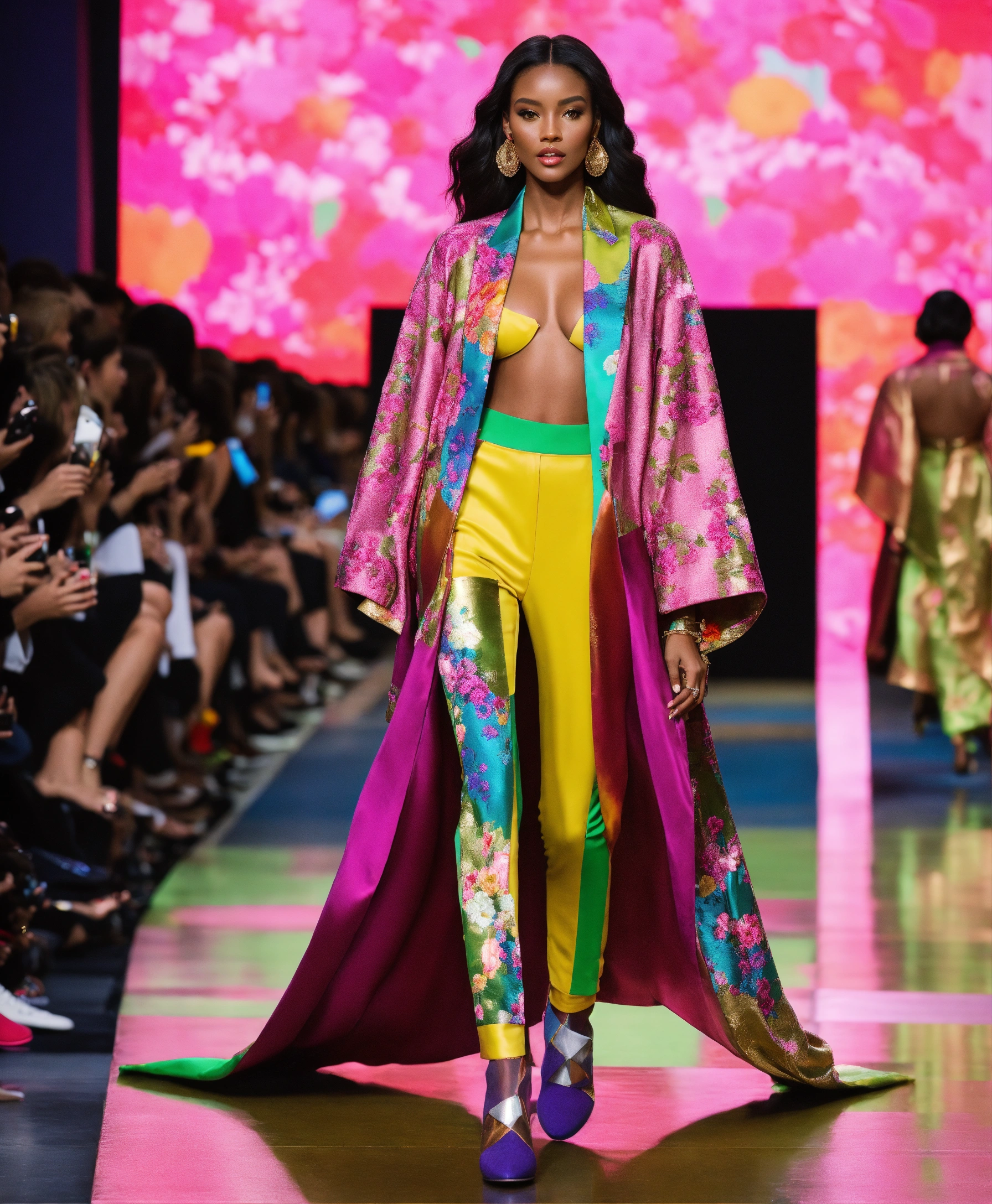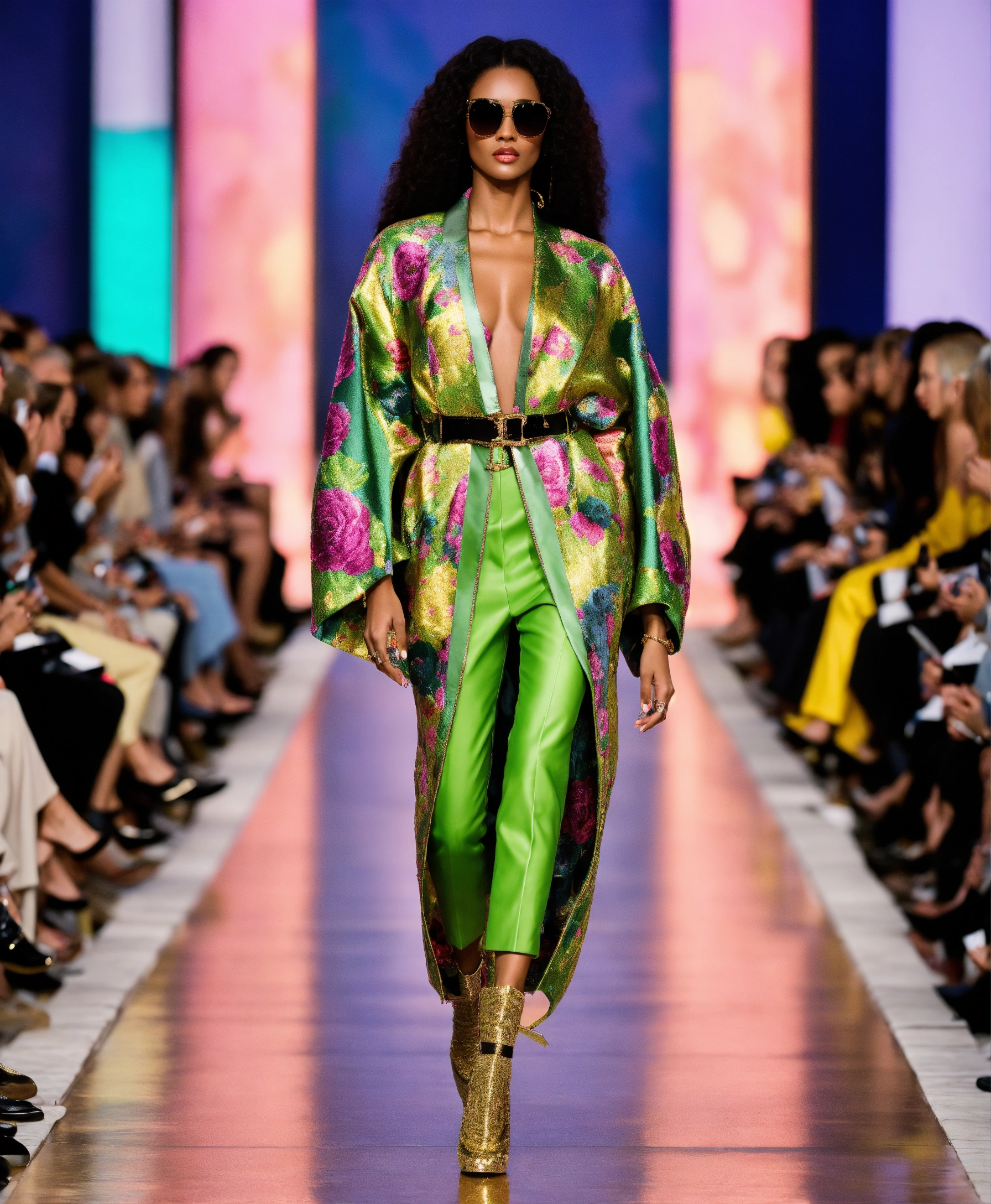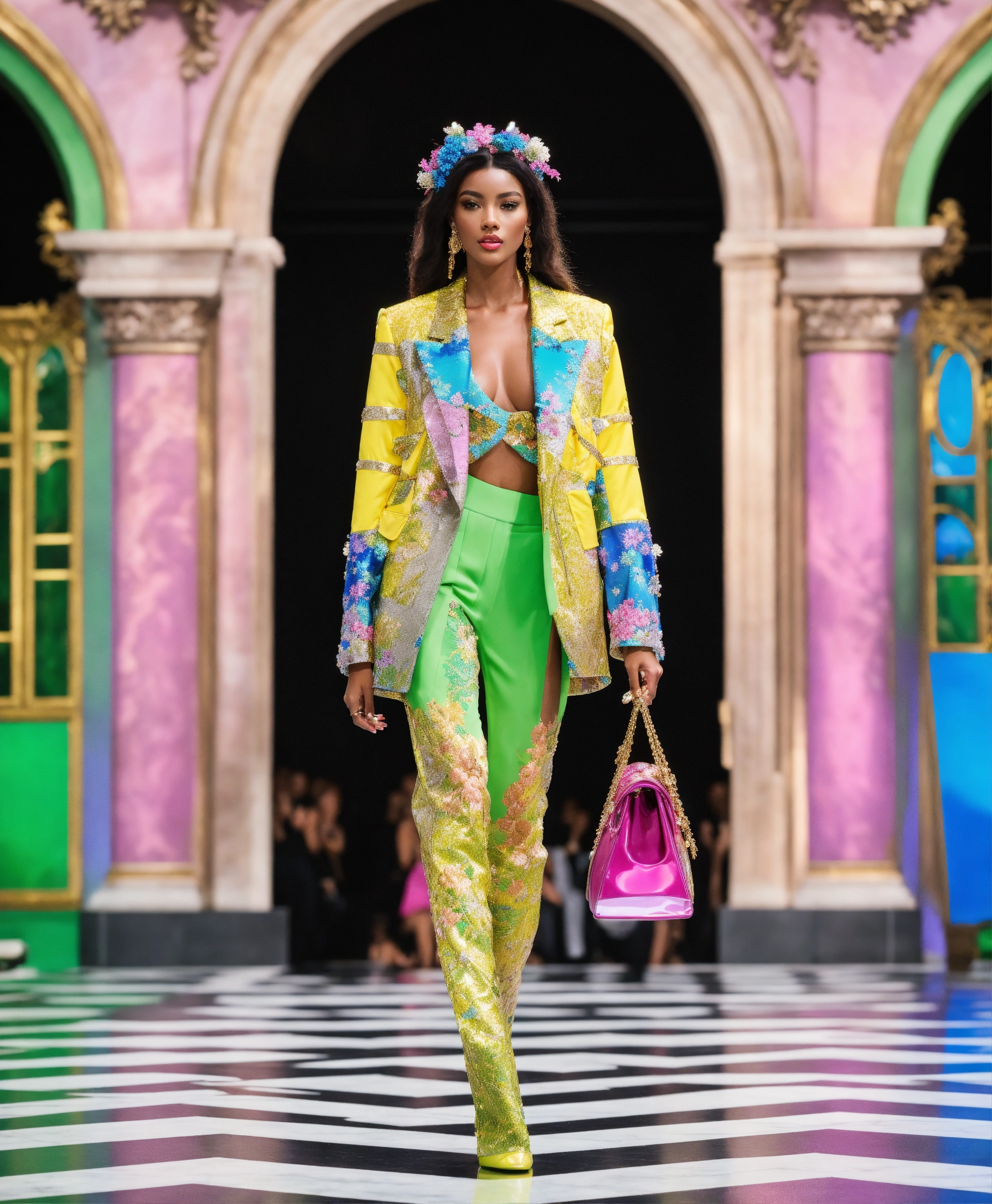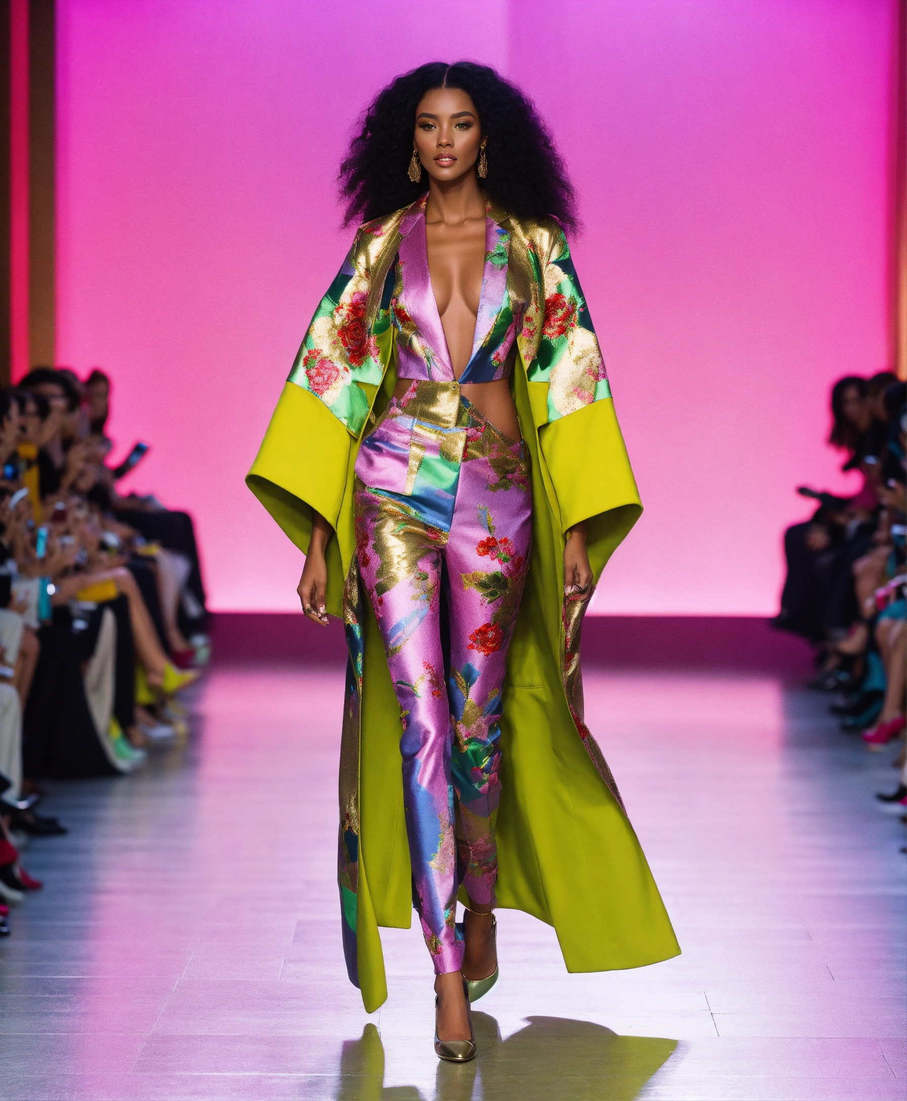 Ultra realistic full body photo of a trendy american model voluminous hair walking the runway modeling summer designer novelty interesting complex unusual street sporty classy modern dolman sleeve outfit brave, paris versailles details cutouts and and gold geometric pattern floral structured tailored jacket pink gold green lilac peridot silver magenta lime fuchsia yellow blue black gray copper mauve bronze haute couture ultimate elegance beautiful luxurious awesome wealthy resplendent magnificent sublime 12k