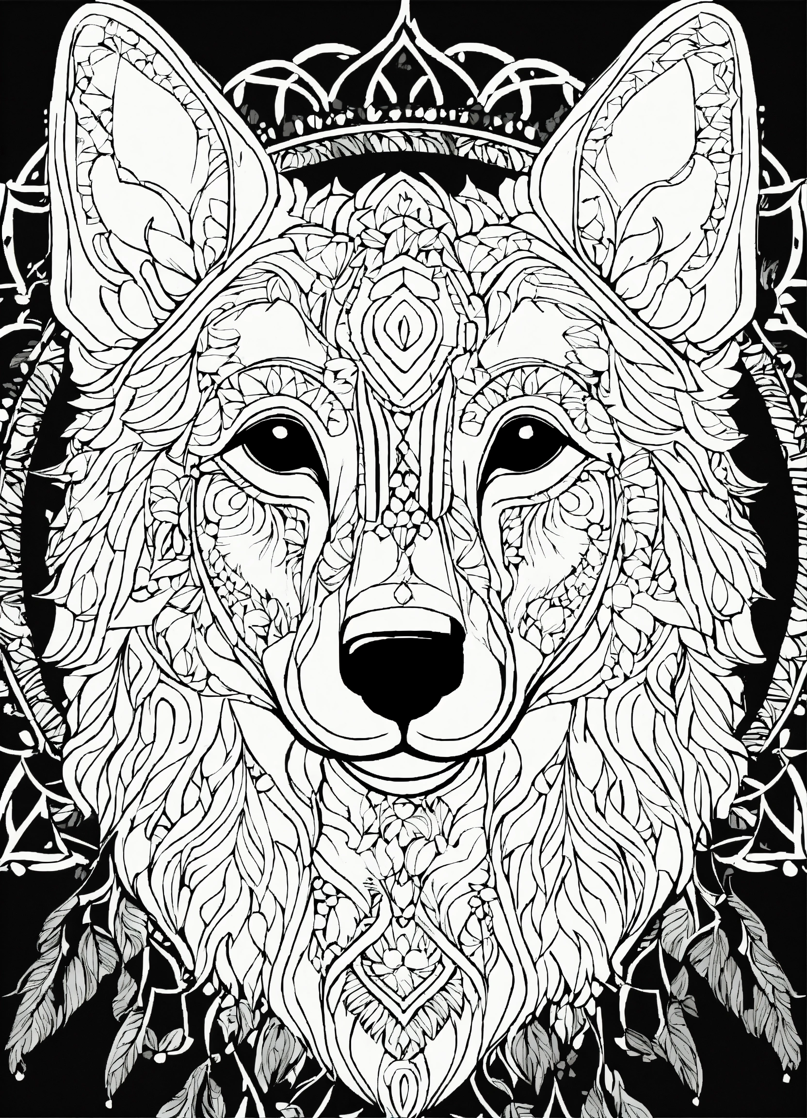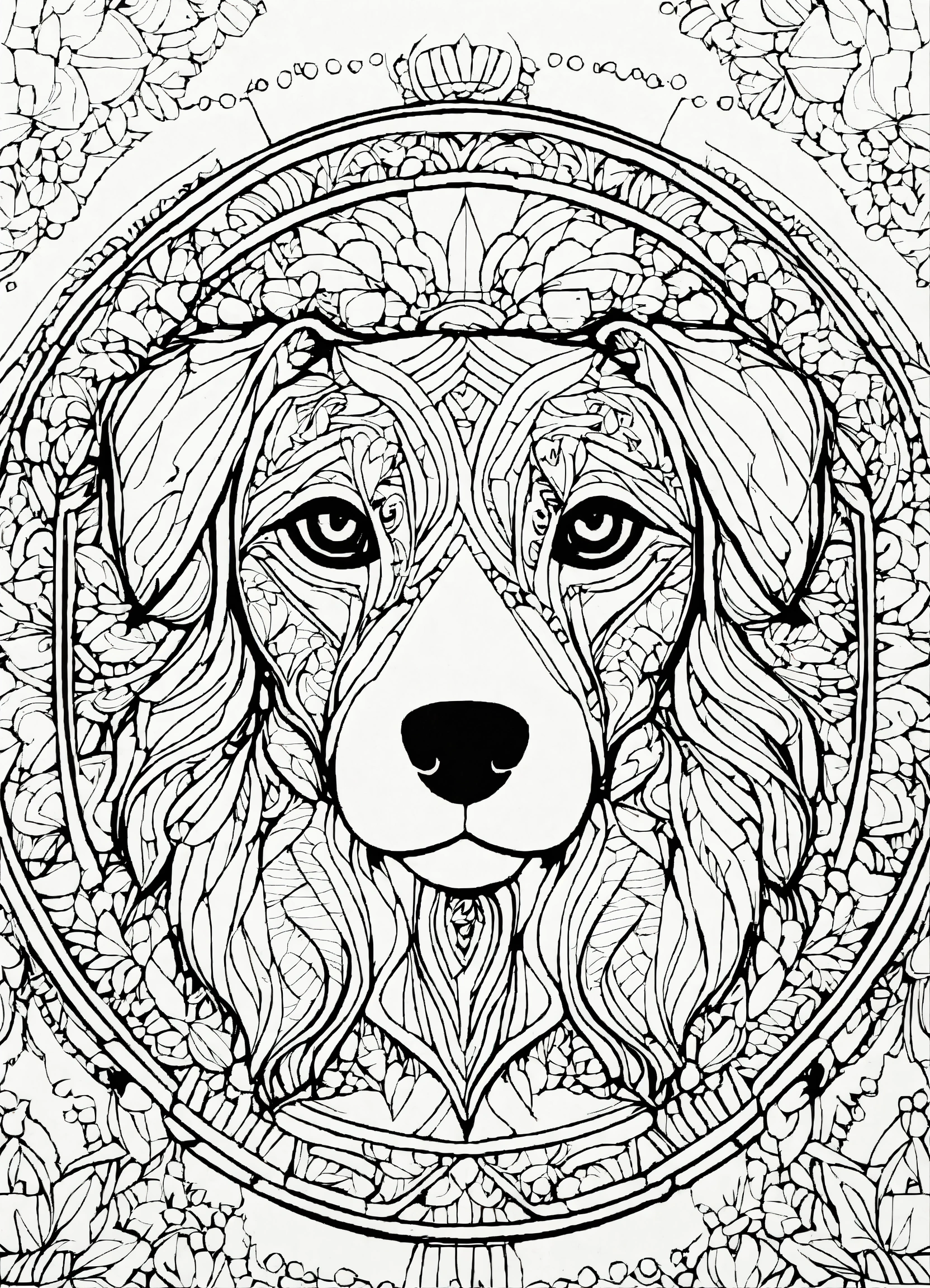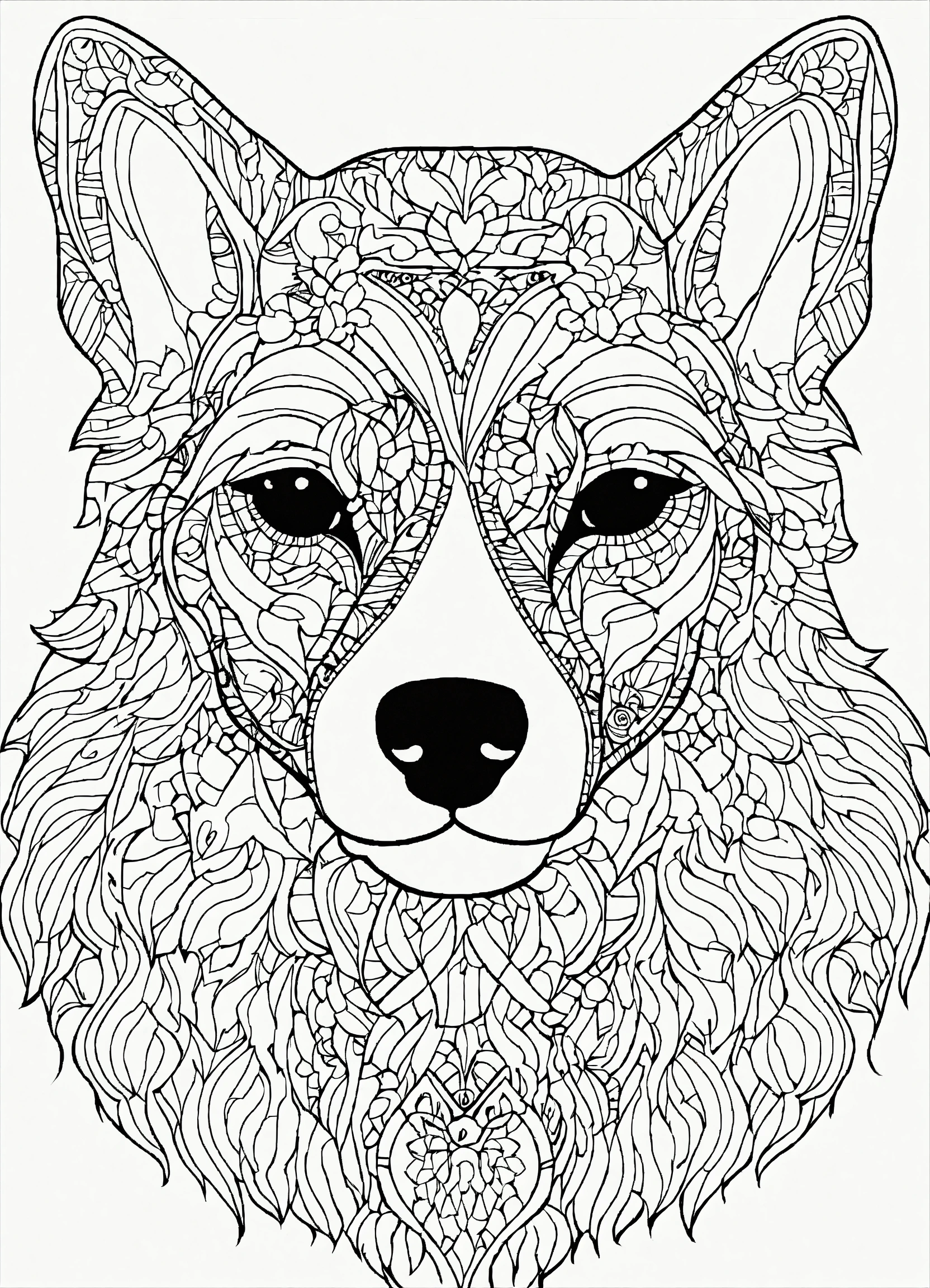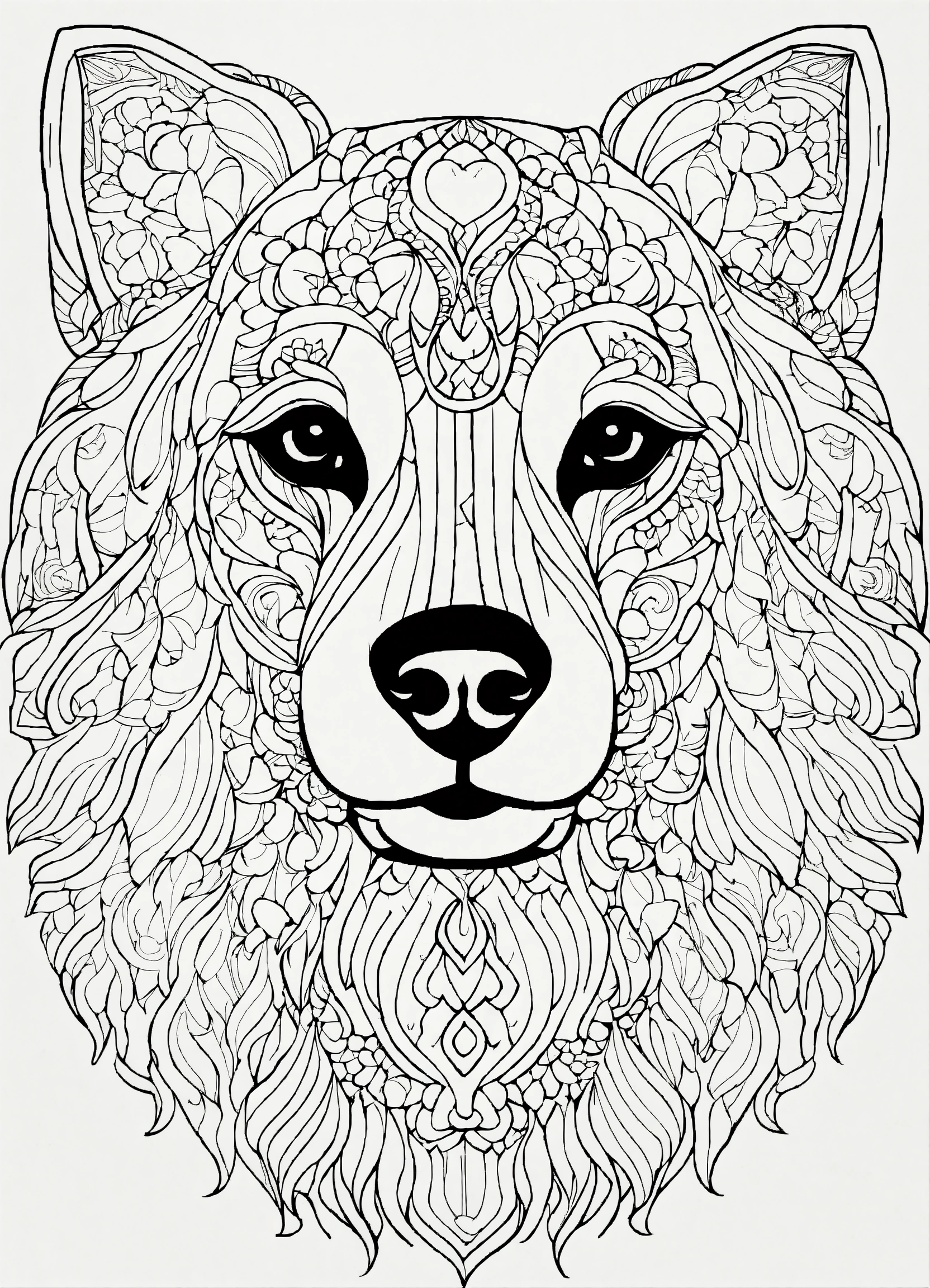 Coloring page for adults, bold lines, dark lines, mandala puppy body, mandala dog pomerânia face, mandala face, symmetrical, white background, clean line art, fine line art