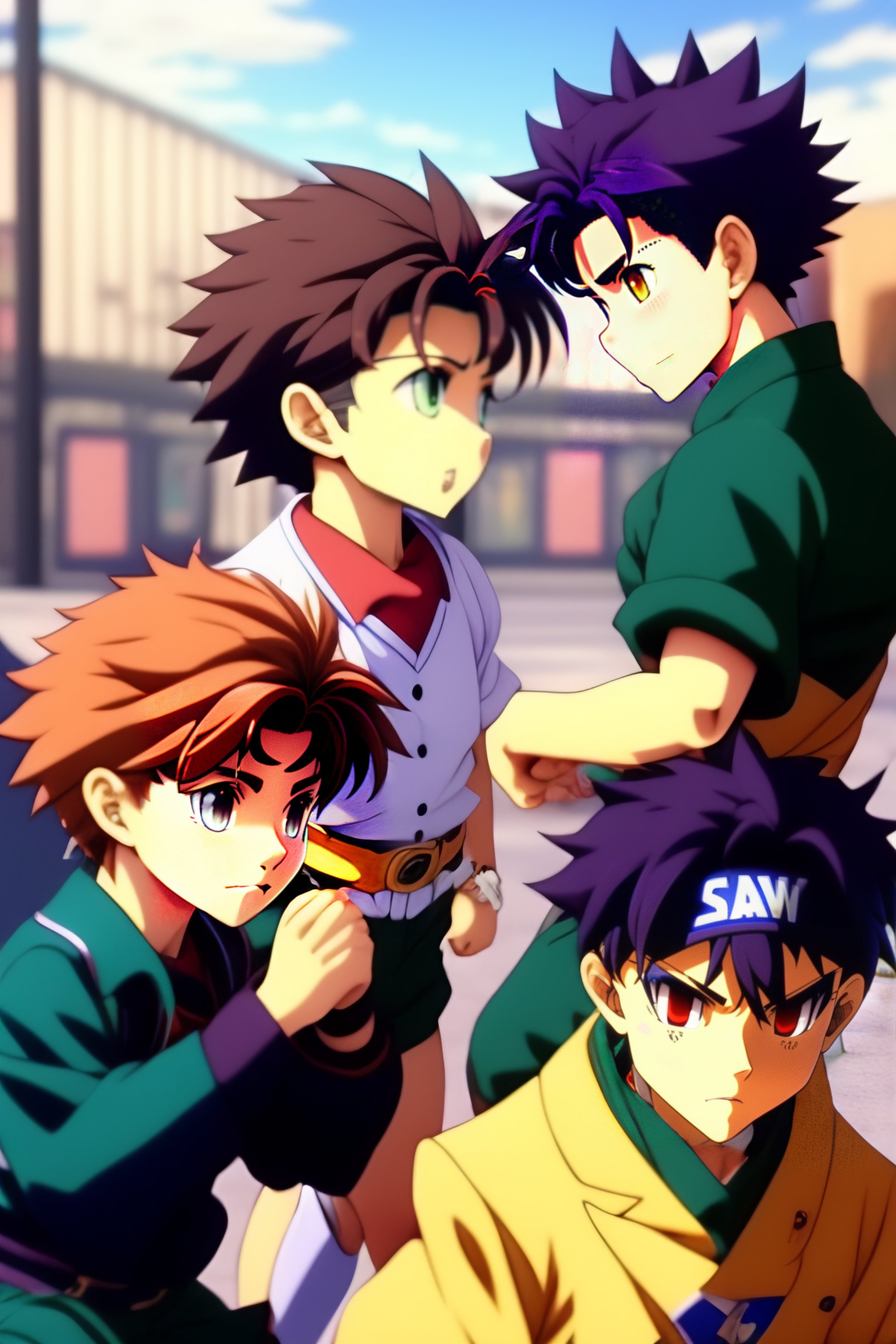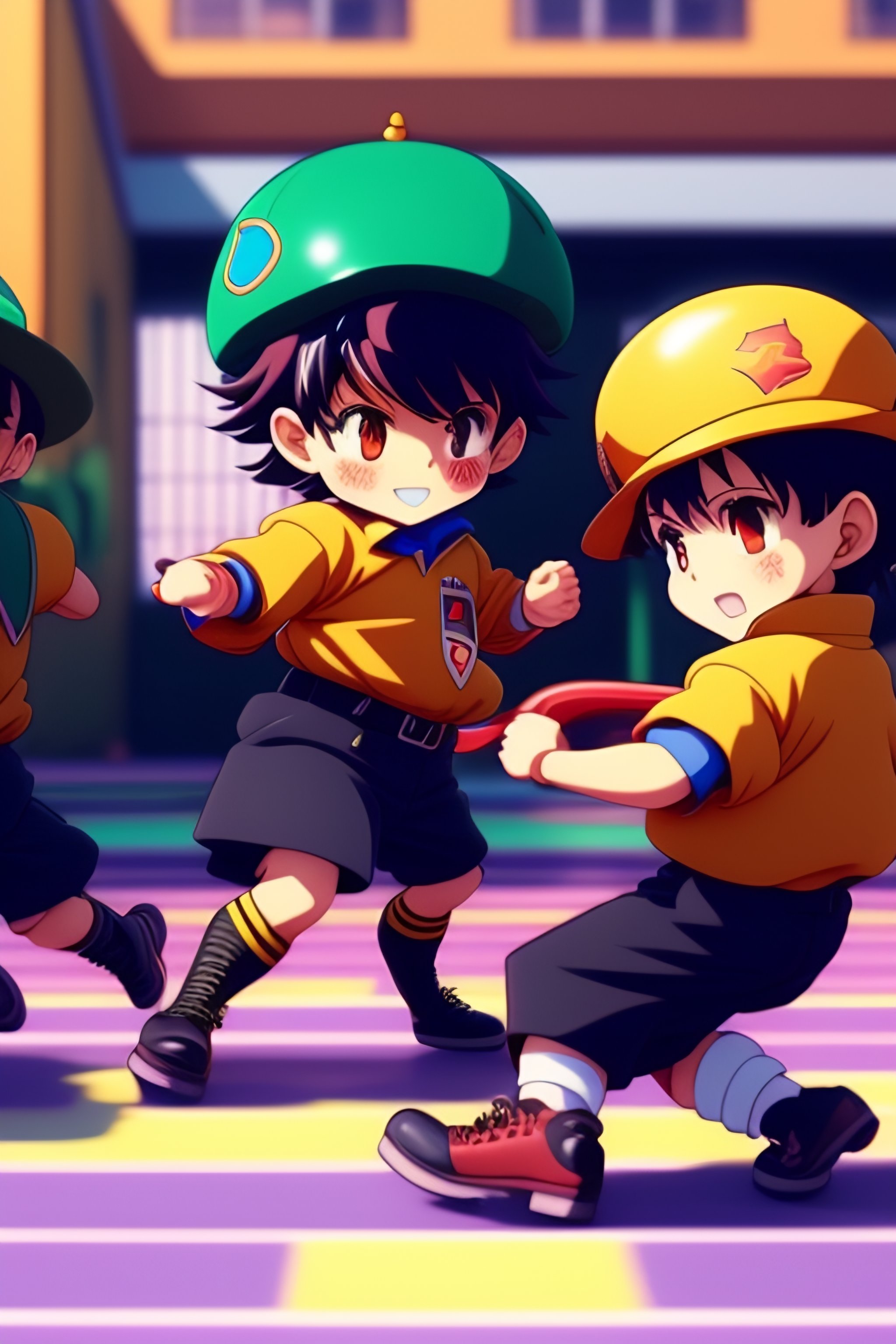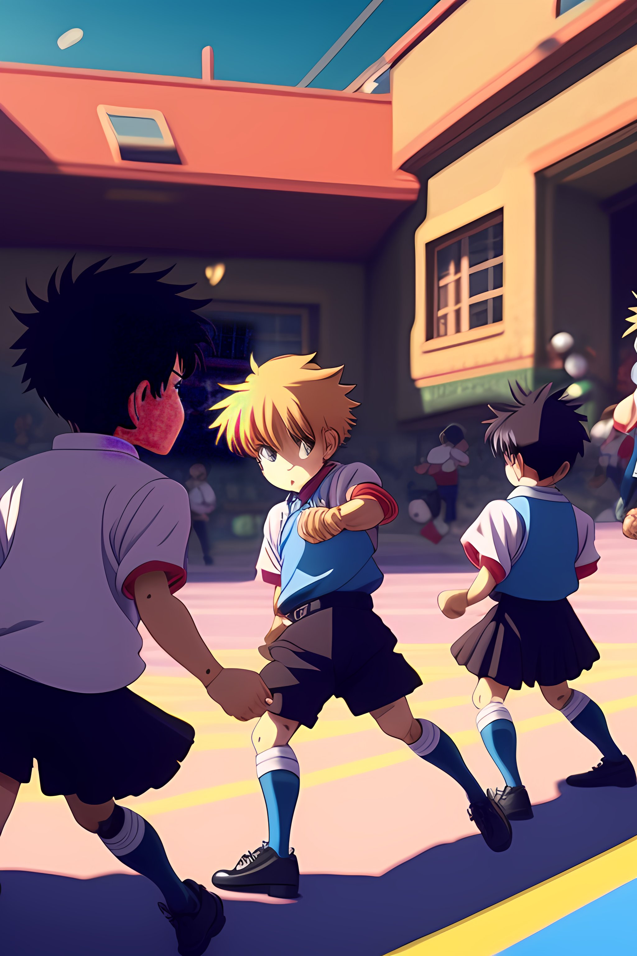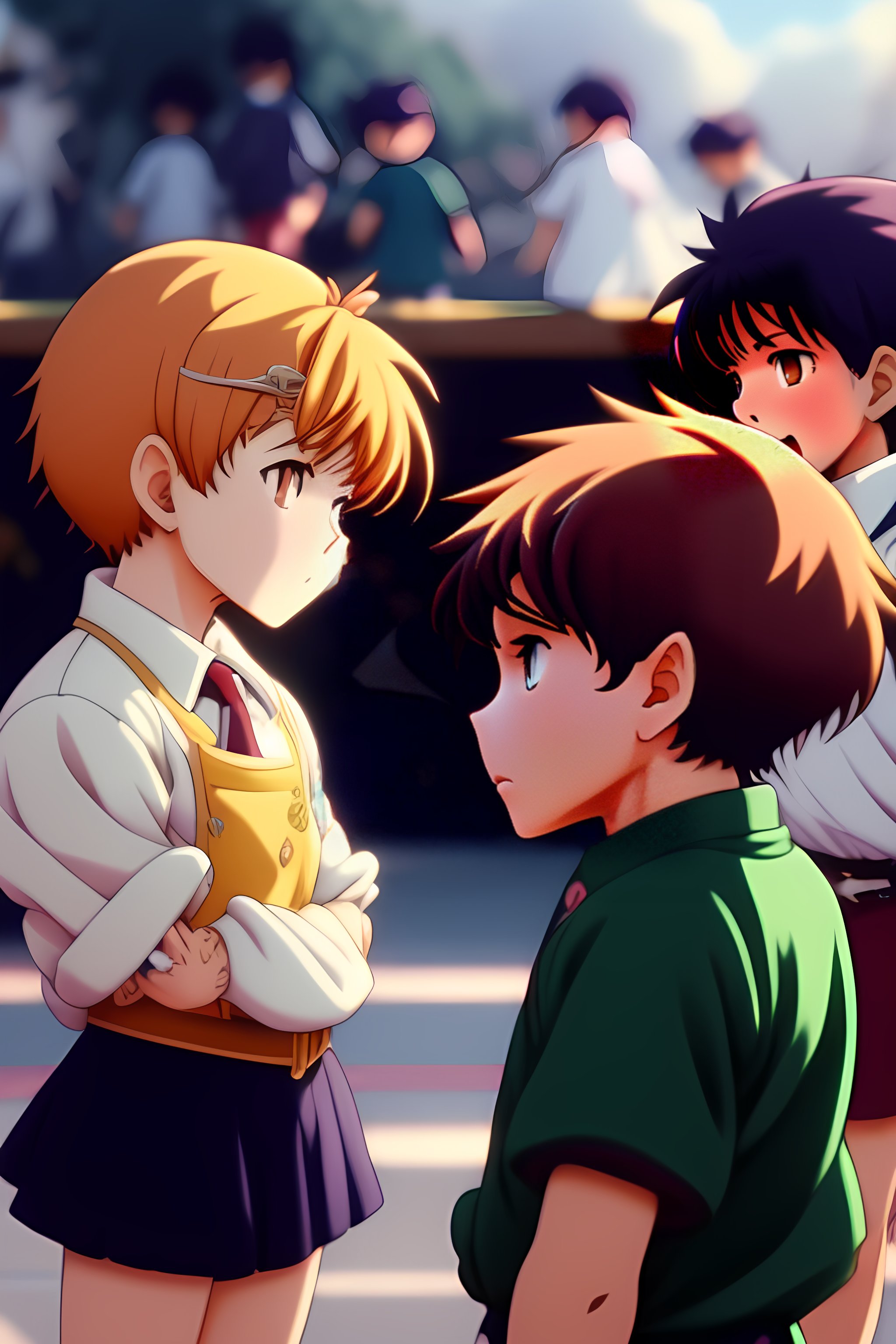 Small children fighting in the school playground in the style of vintage 1990's anime
