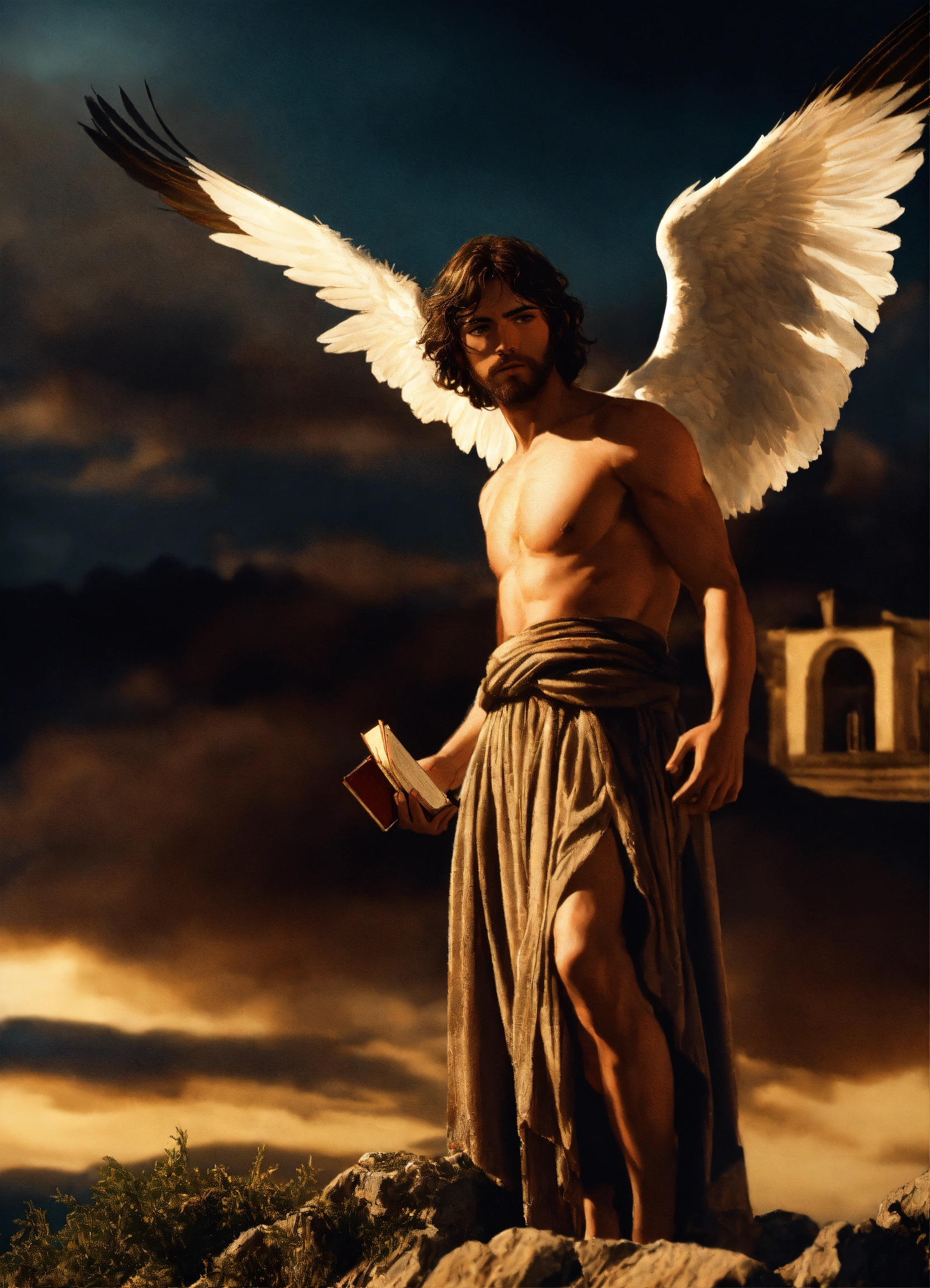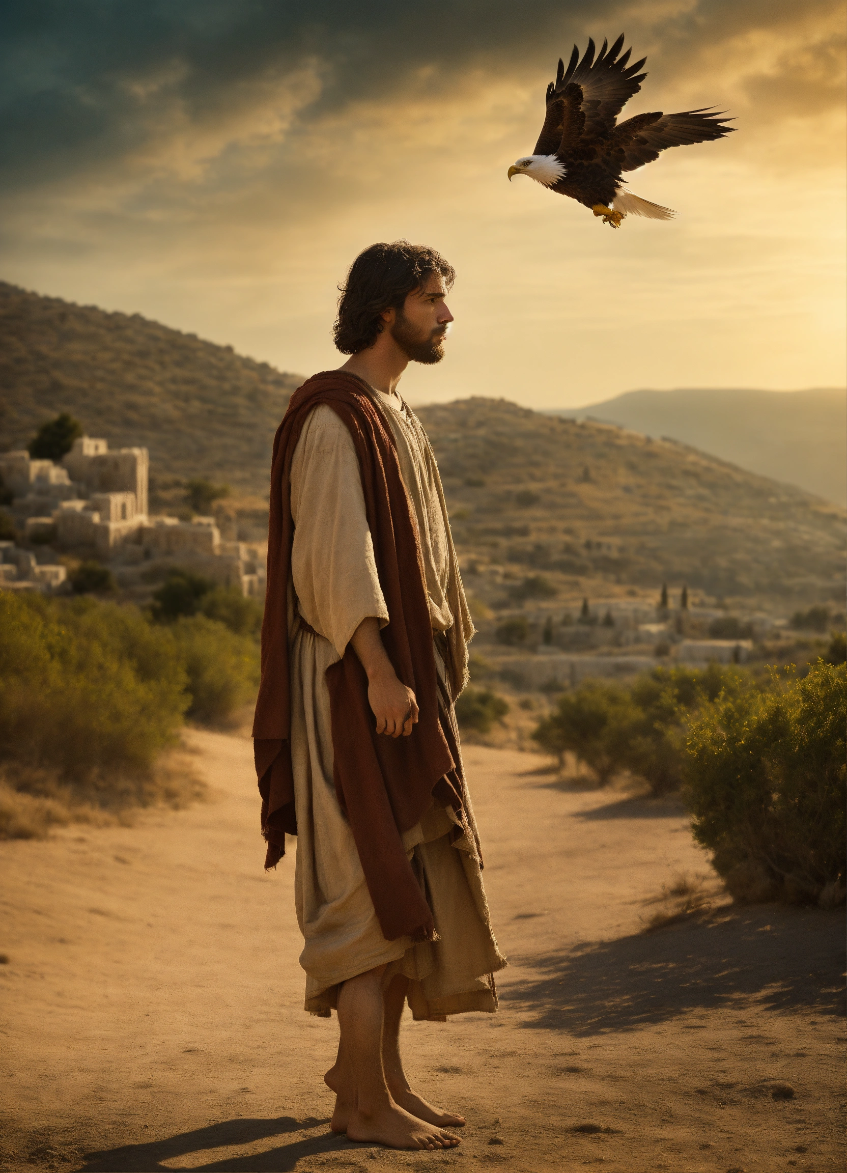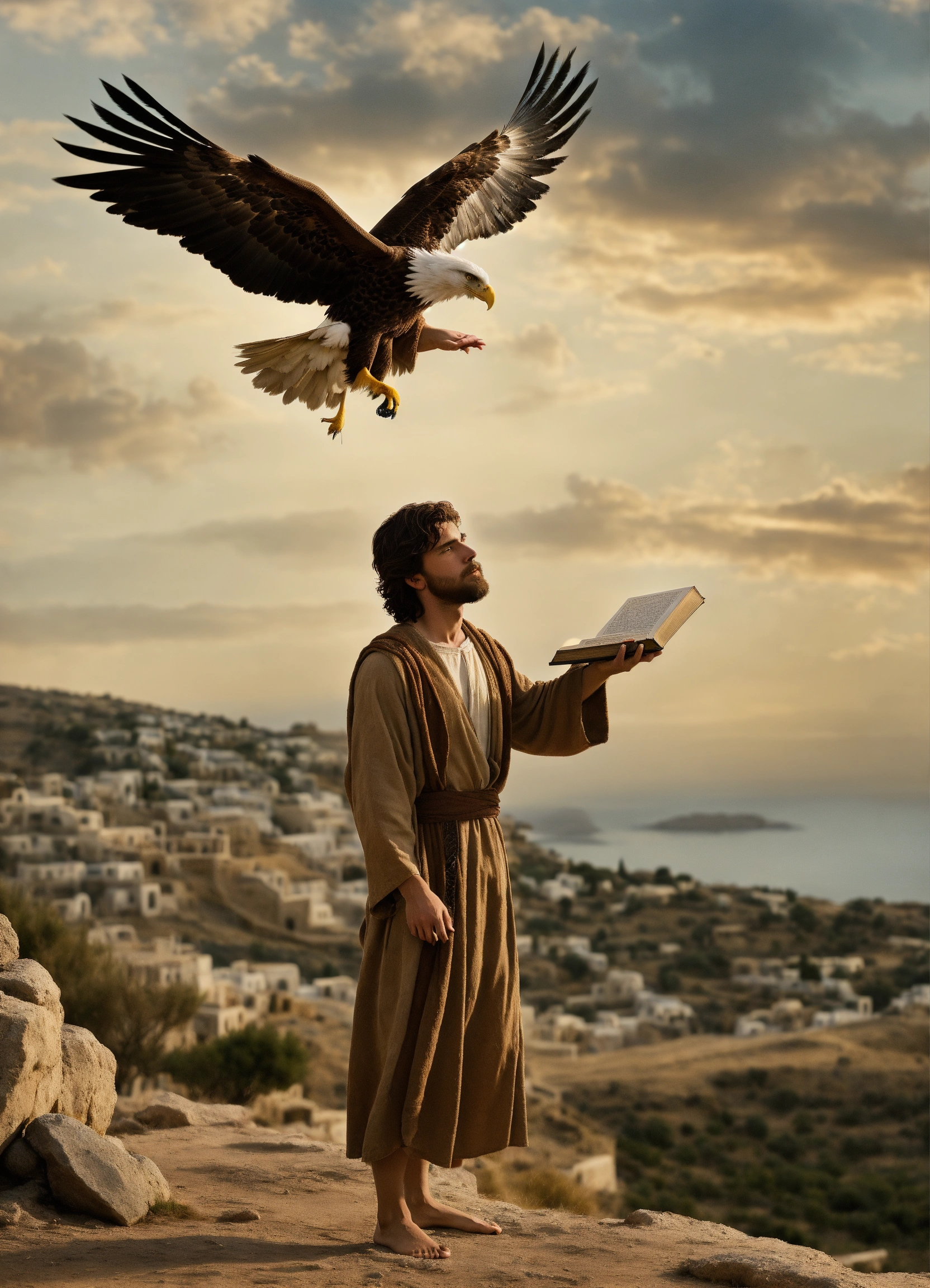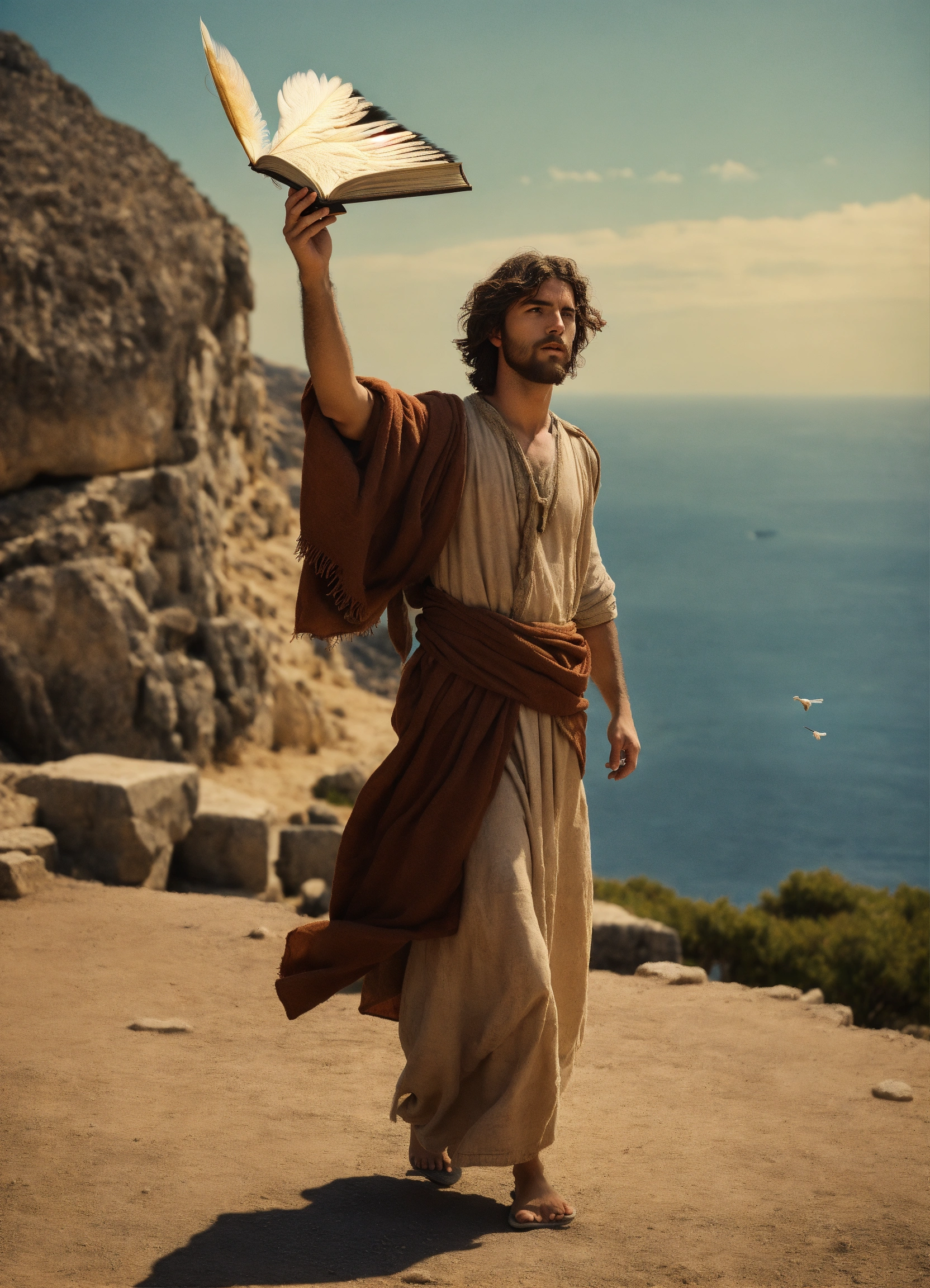 Movie still from the ressurection of jesus of nazareth. full body shot of john the apostle (young, 20 years old, short hair) looking to the sky, a book on his hand, a feather on the other hand, on patmos island. eagle flying over head. dramatic classical greek pose. 8k.