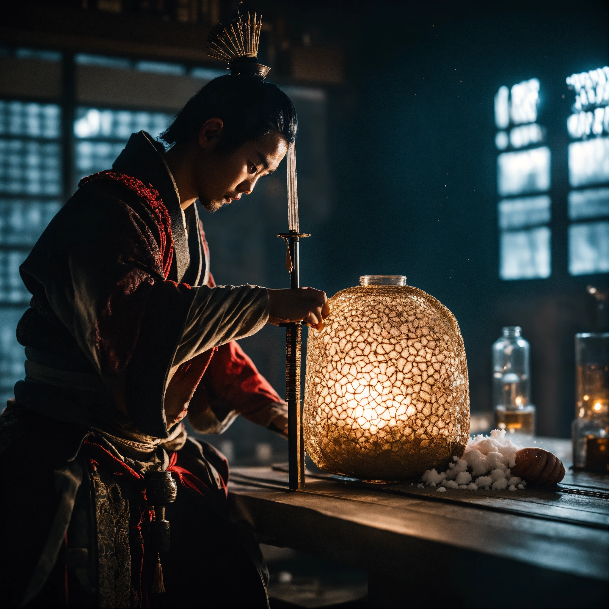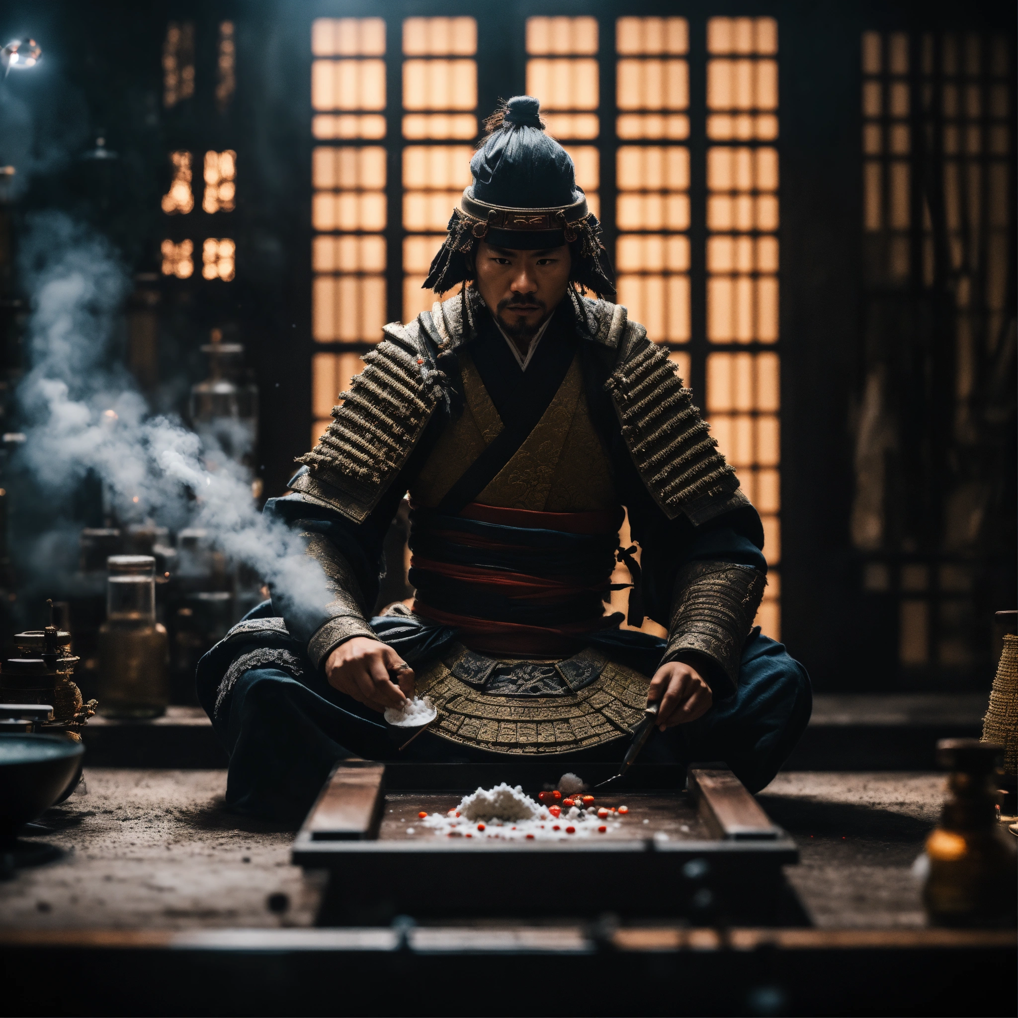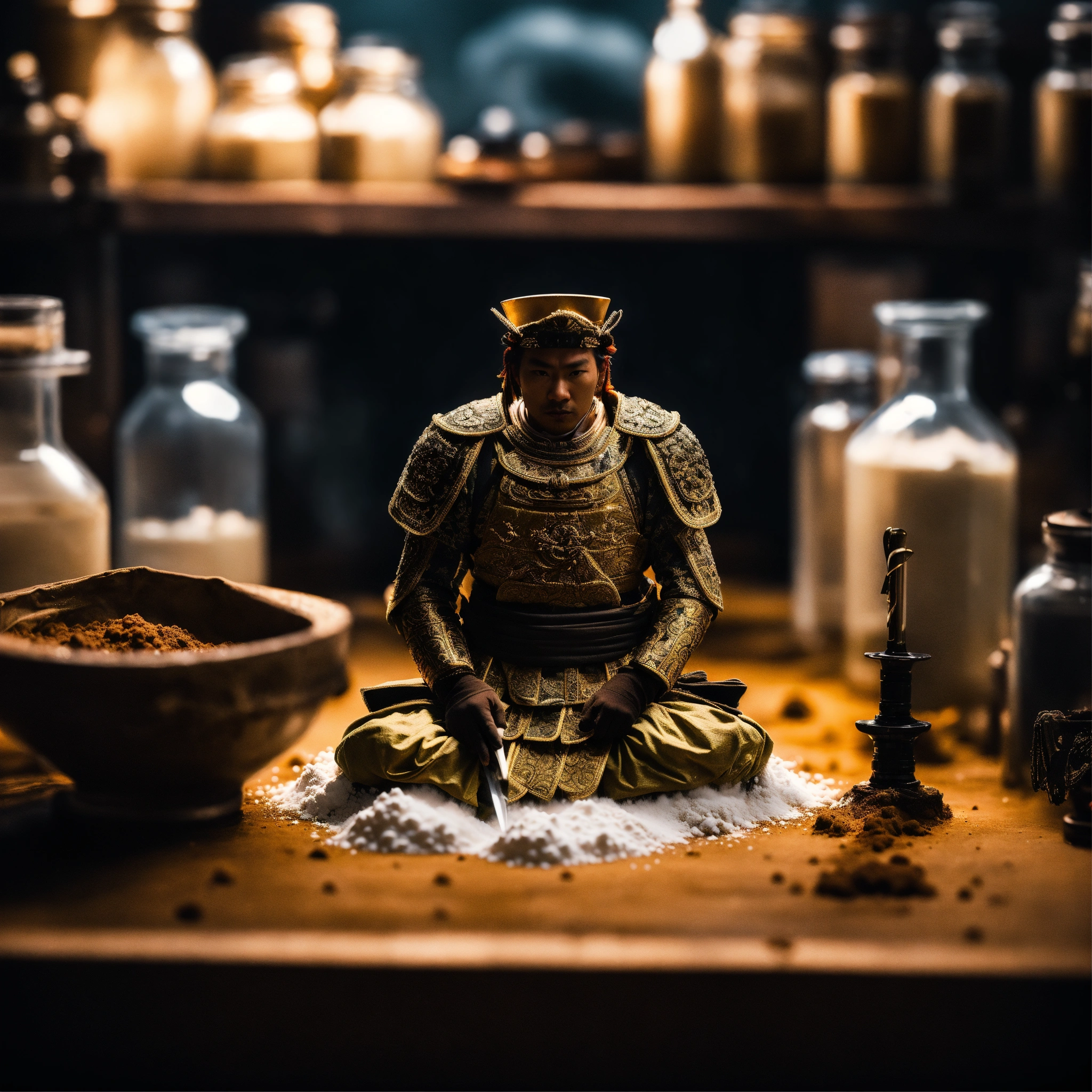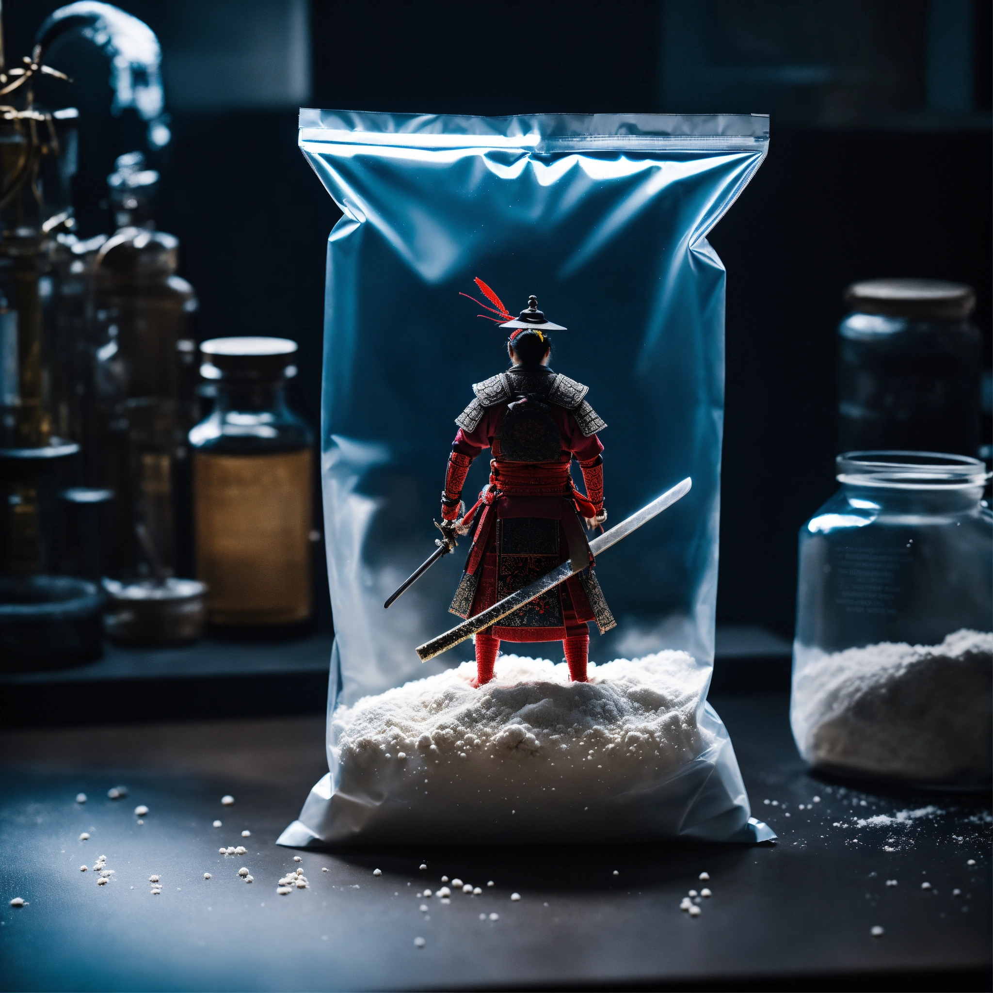Samurai, intricate, sharp focus, fantasy, cinematic lighting, other worldy, surreal 8k photo, dark moody, packing white powder in a ziplock bag in the laboratory