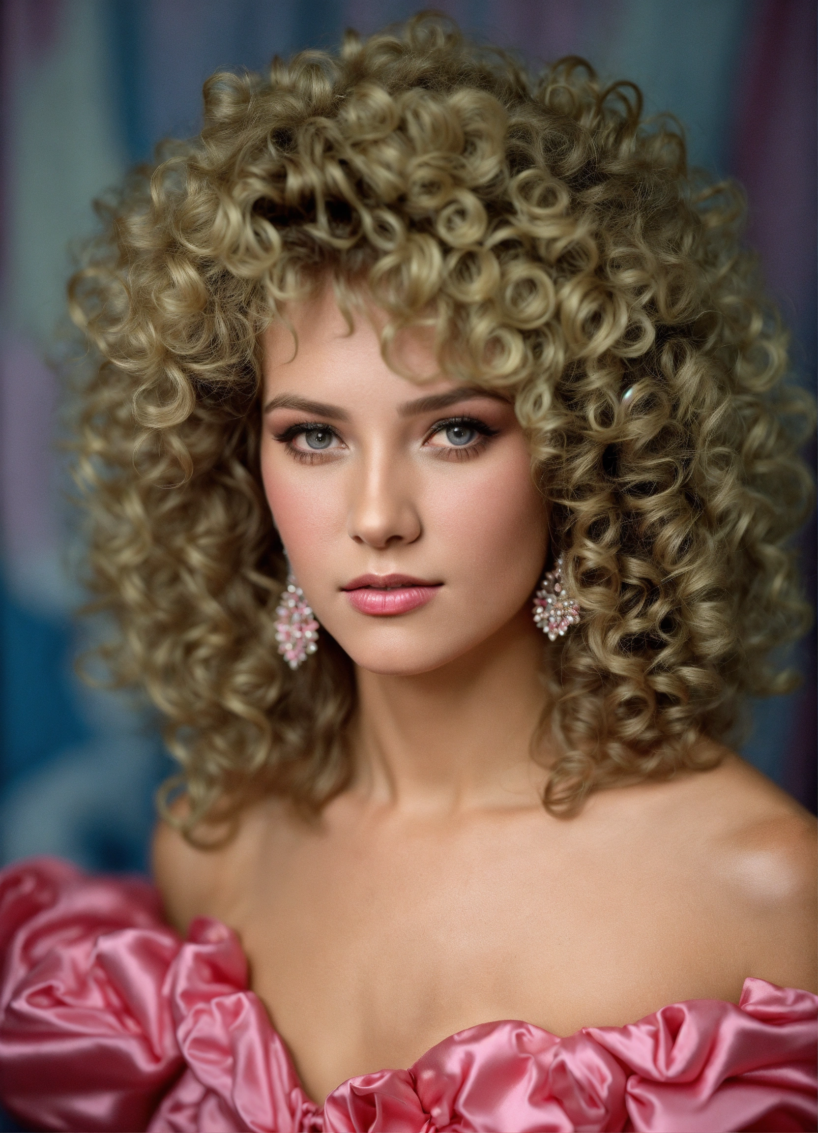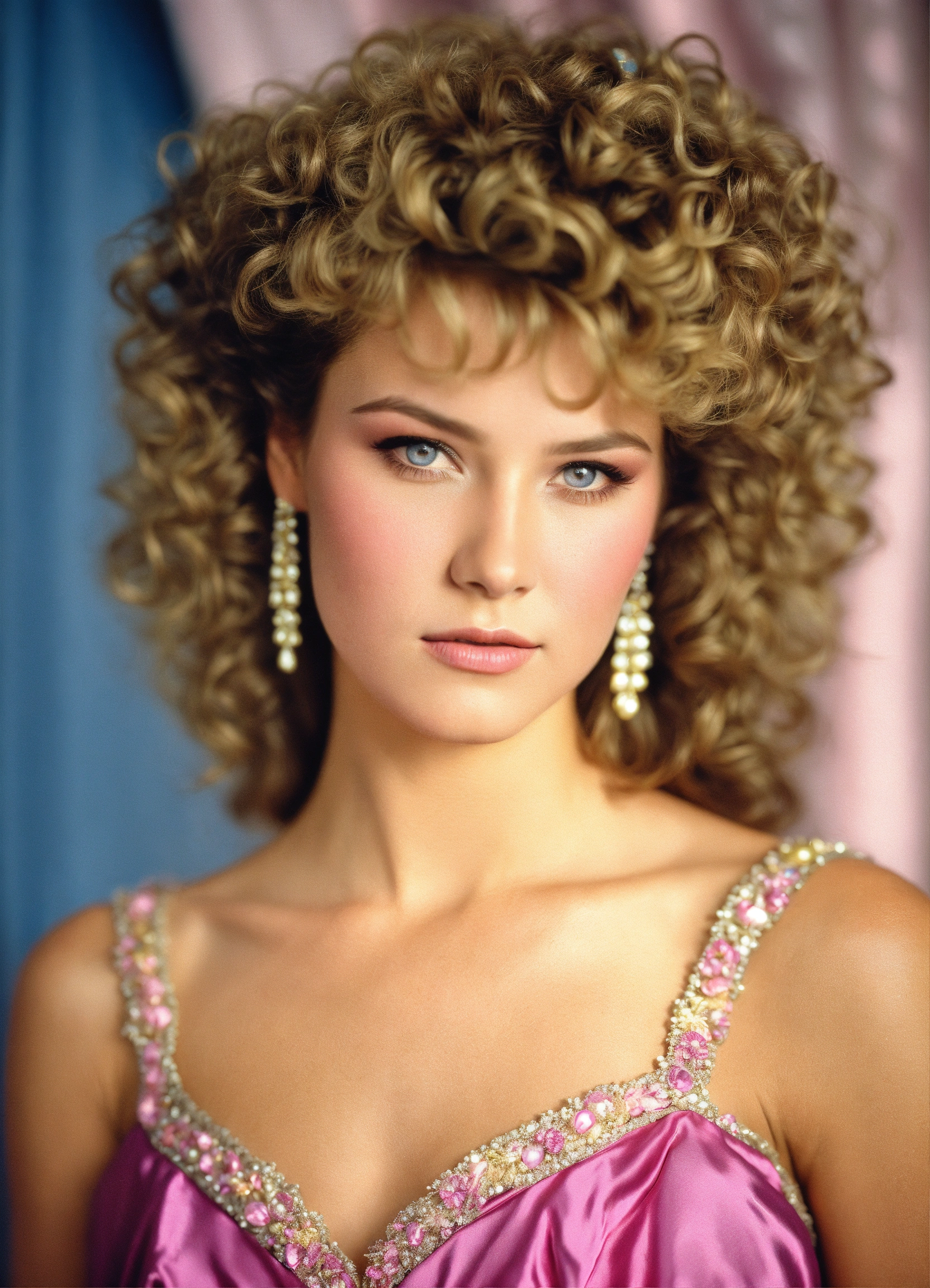 "pretty 80s prom queen", 80s perm curls, puffy 80s prom dress, taffeta, head and shoulders portrait, intricately detailed eyes