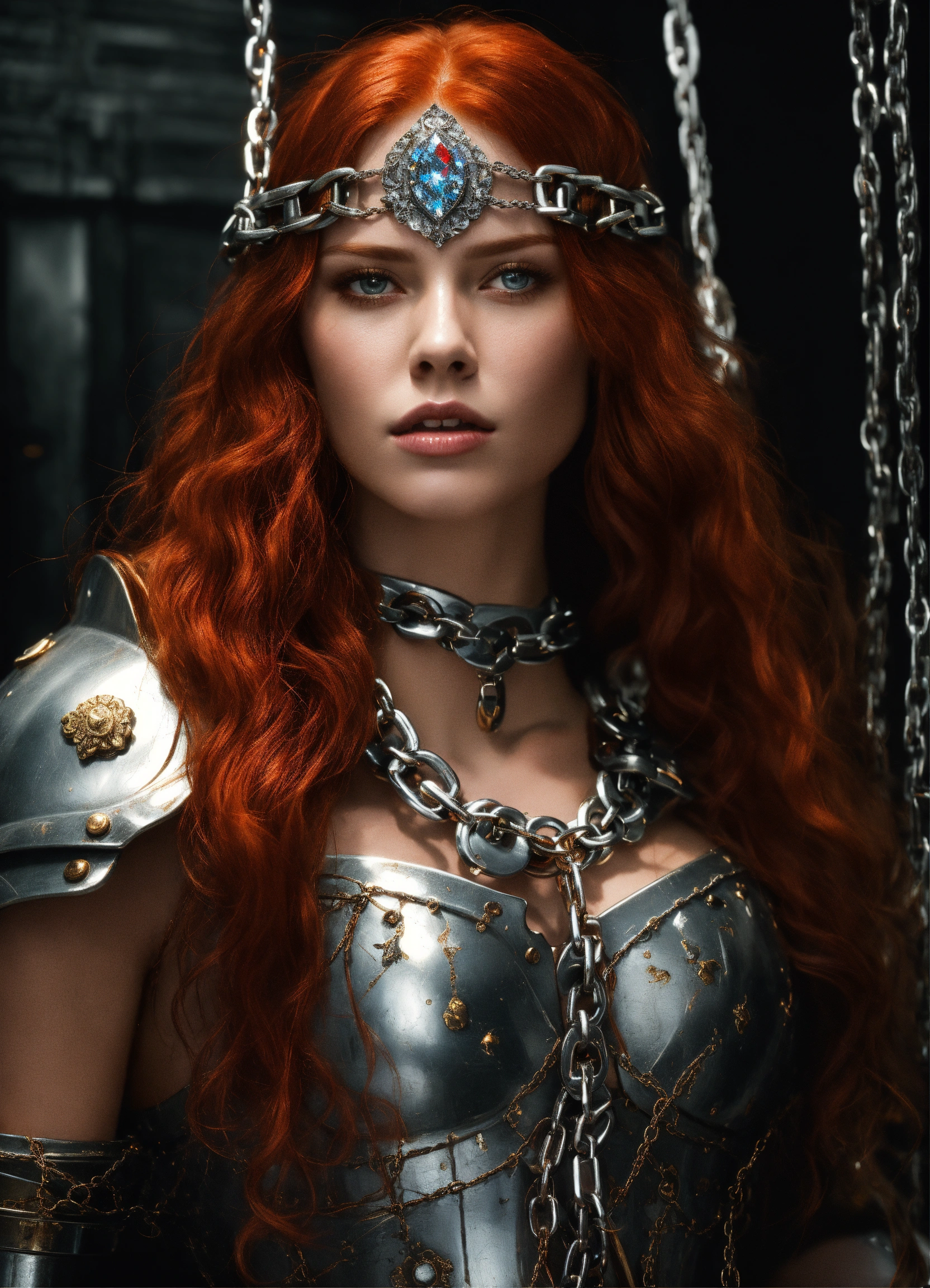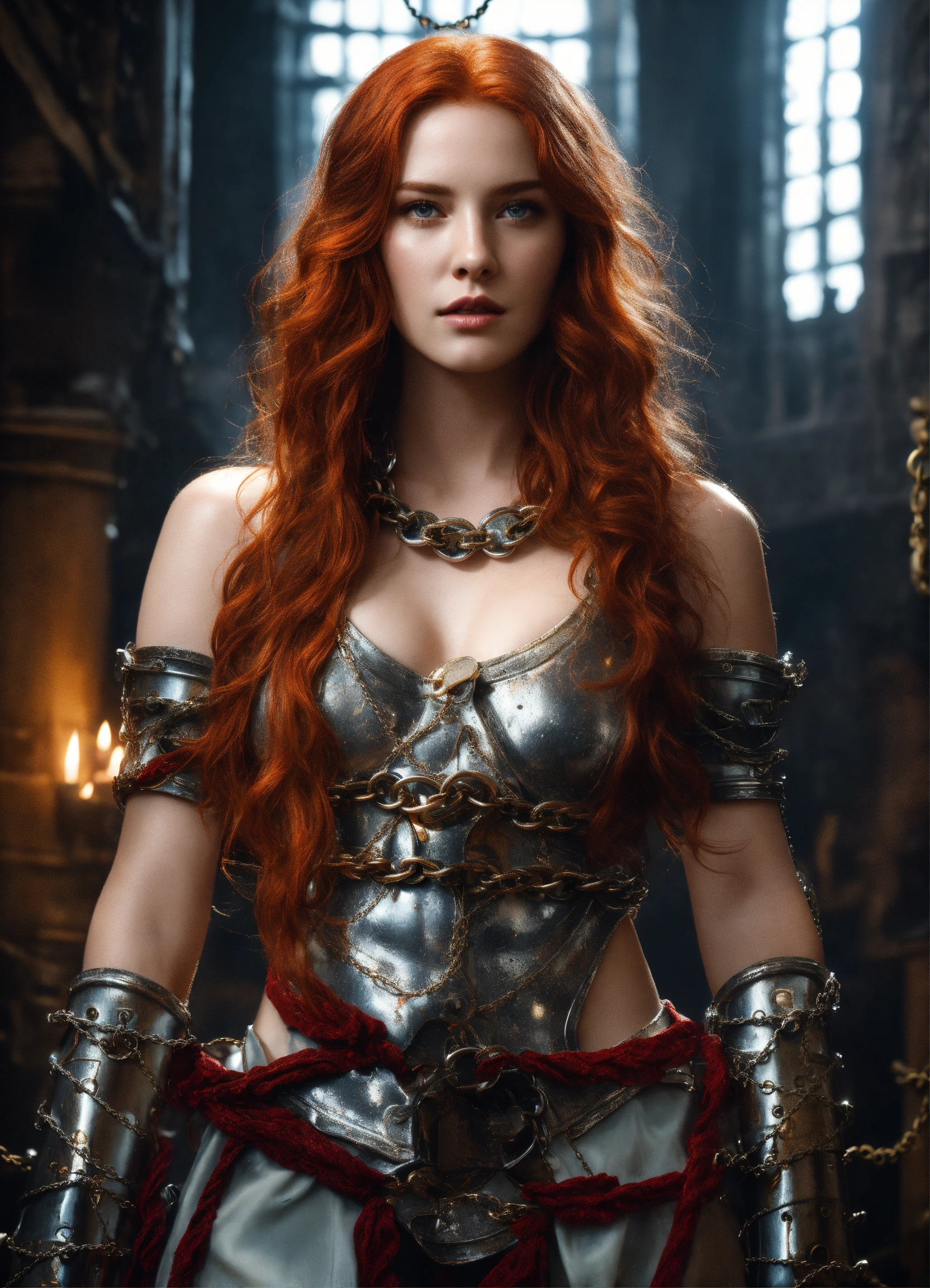 Full body beautiful redheaded goddess chained by enemies chained to the ceiling of a dark dungeon hands chained above her, beautiful white woman with red hair, beautiful perfect face, shapely hour-glass figure long flowing hair, fully clothed sparkling silver armor and silver accessories, chained by enemies chained to the ceiling of a dark dungeon hands chained above her, high detail, realistic photo, high detail, digital painting, cinematic, stunning, hyper-realistic, sharp focus, high resolution 8k, insanely detailed