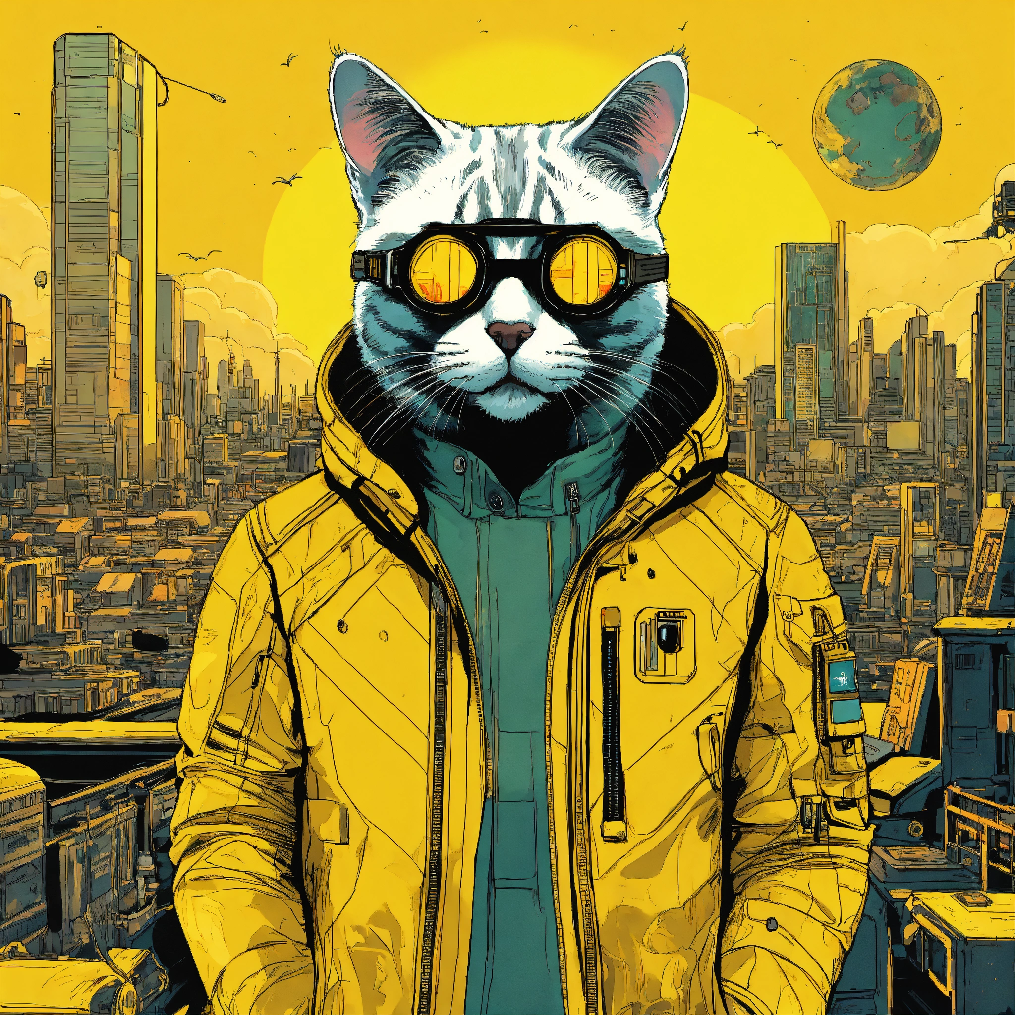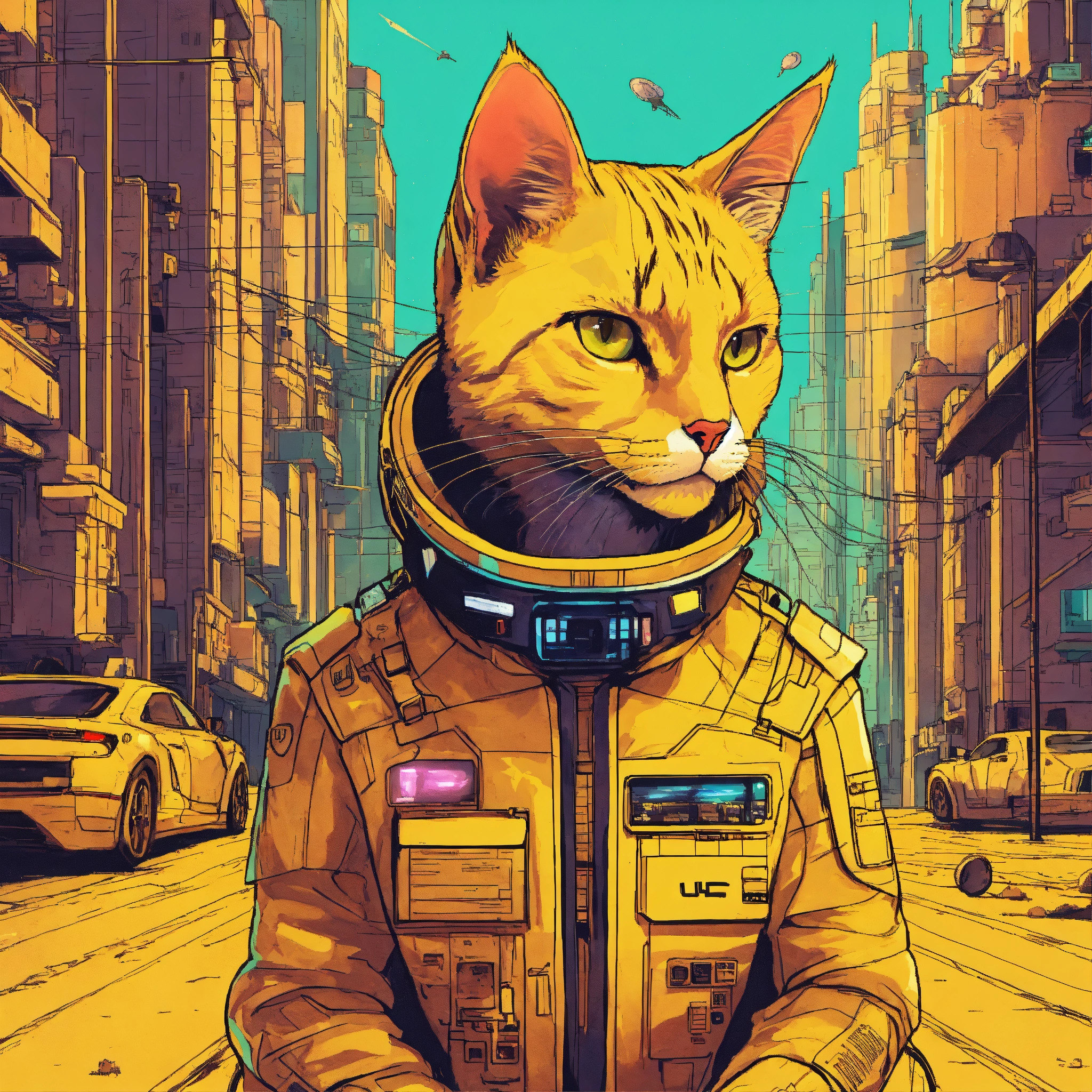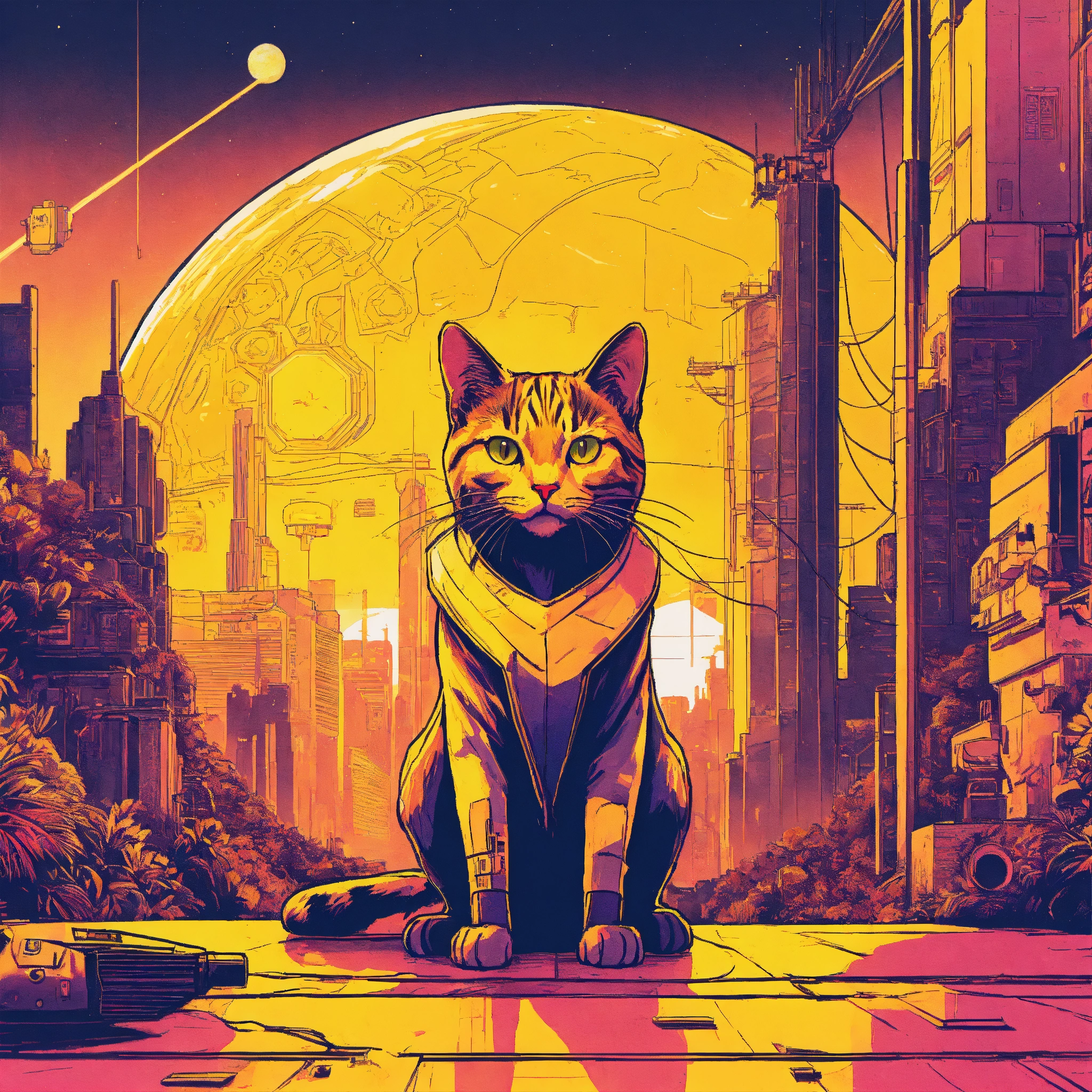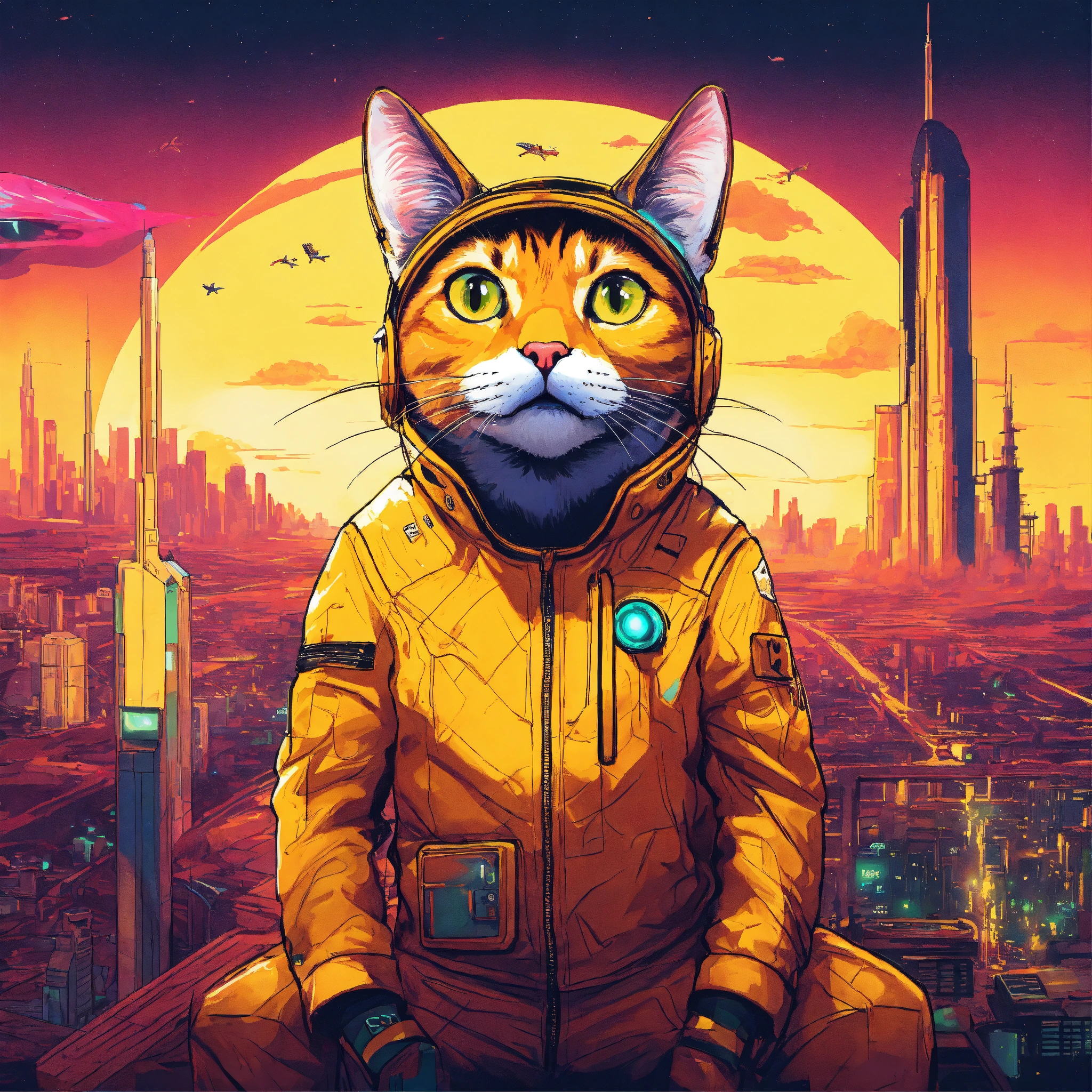 Ilustração de um gato com elon musk na frente de uma cidade, planeta dos gatos, style cyberpunk, background space, color yellow