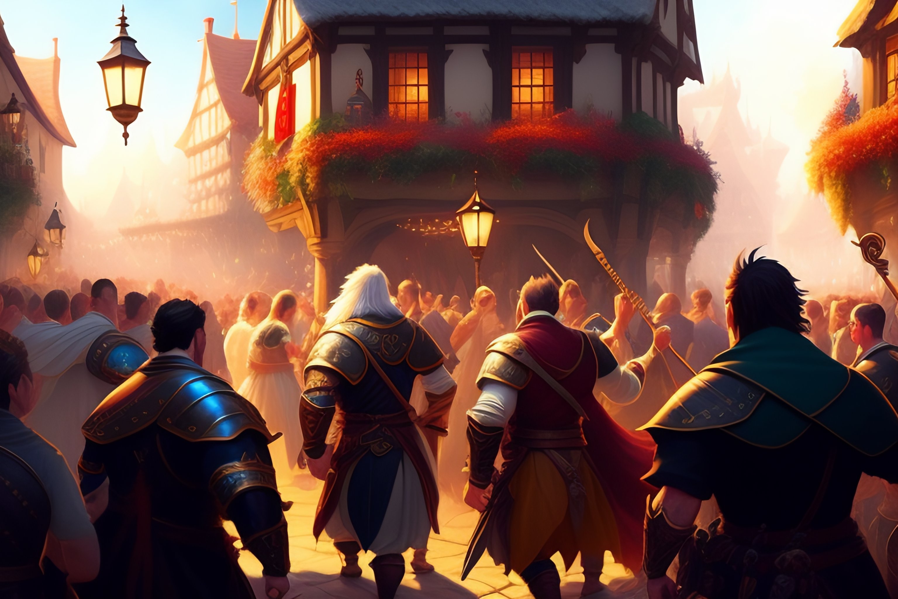 Drunken cheering crowd in town square, medieval, high fantasy capital city outside, greg rukowski, jordan grimmer, artgerm, artstation