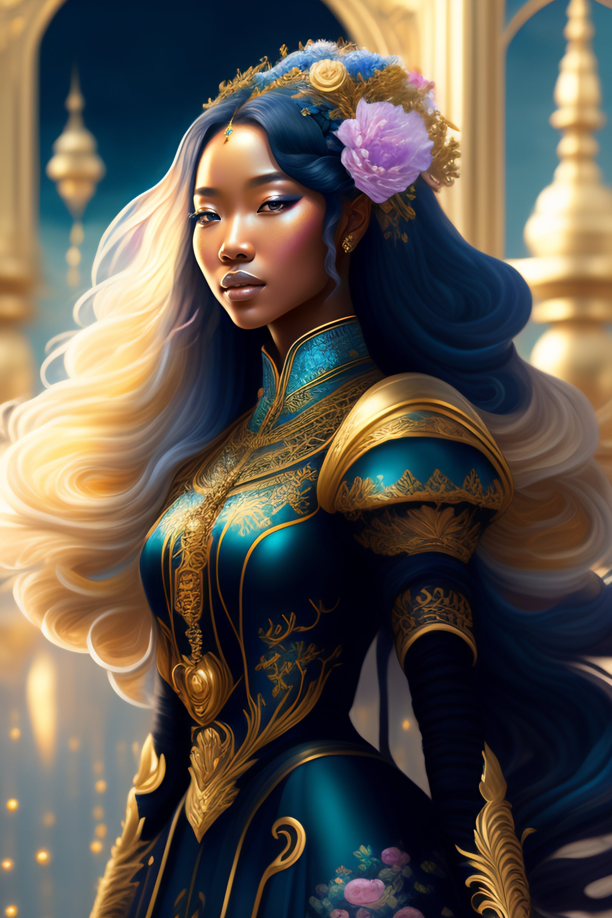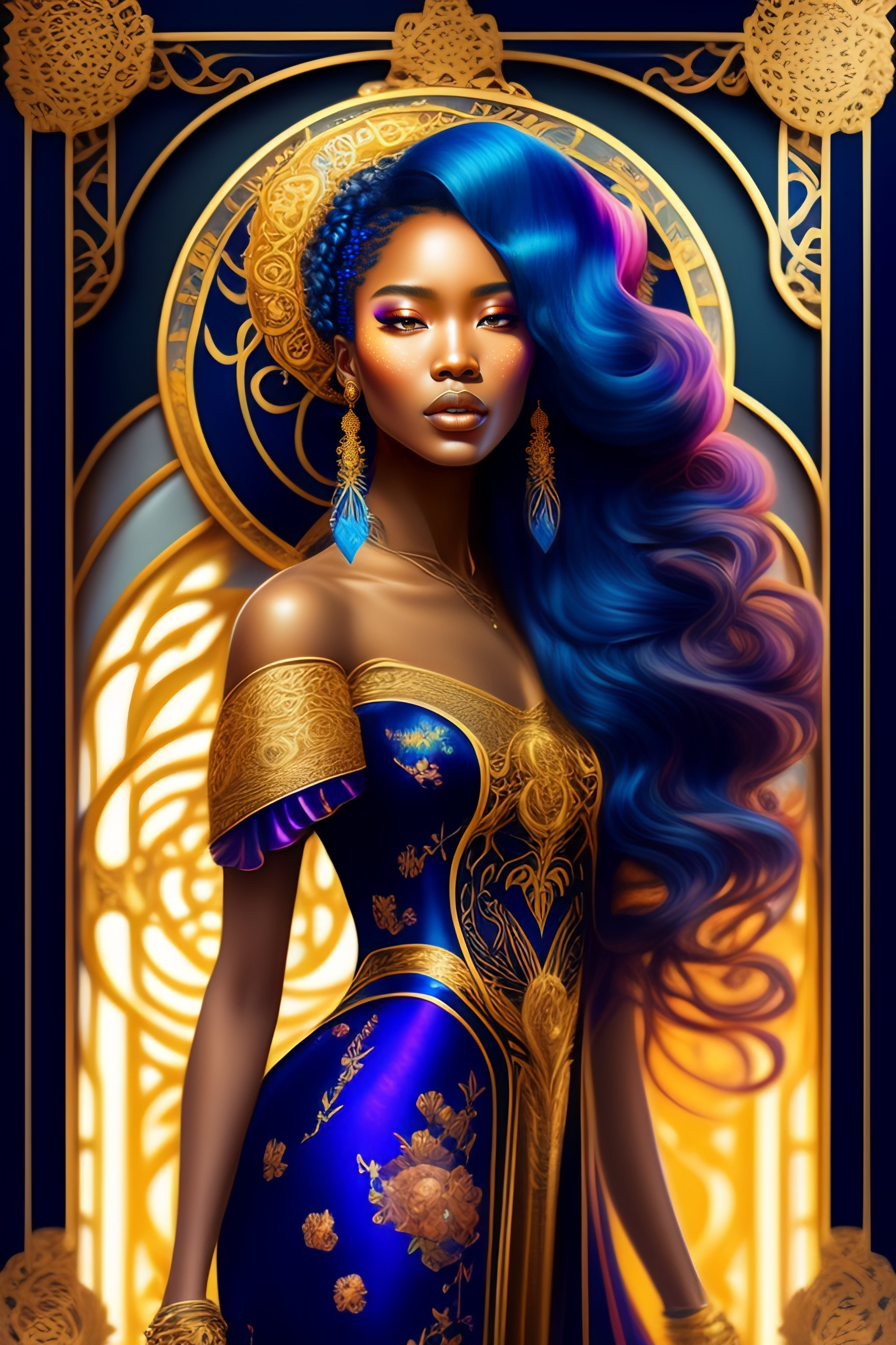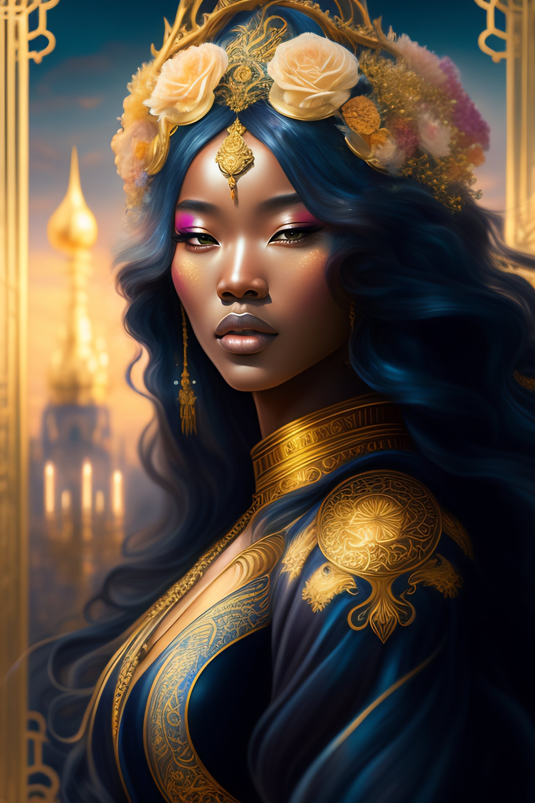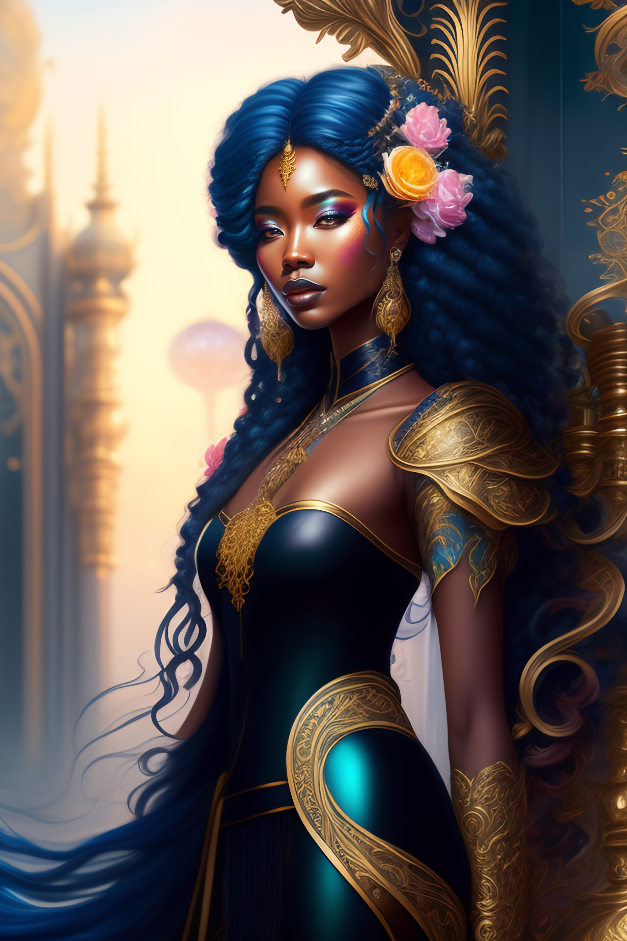 Breathtaking detailed painting by pilyeon and yuumei art, a full shot black queen with long flowing bright blue hair, gold and filigree, long dress and pastel flowers petals and golden tumultuous clouds, symmetrical facial features, at dawn in front of a pristine golden art nouveau cathedral, elegant, highly detailed, artstation, concept art, matte, sharp focus