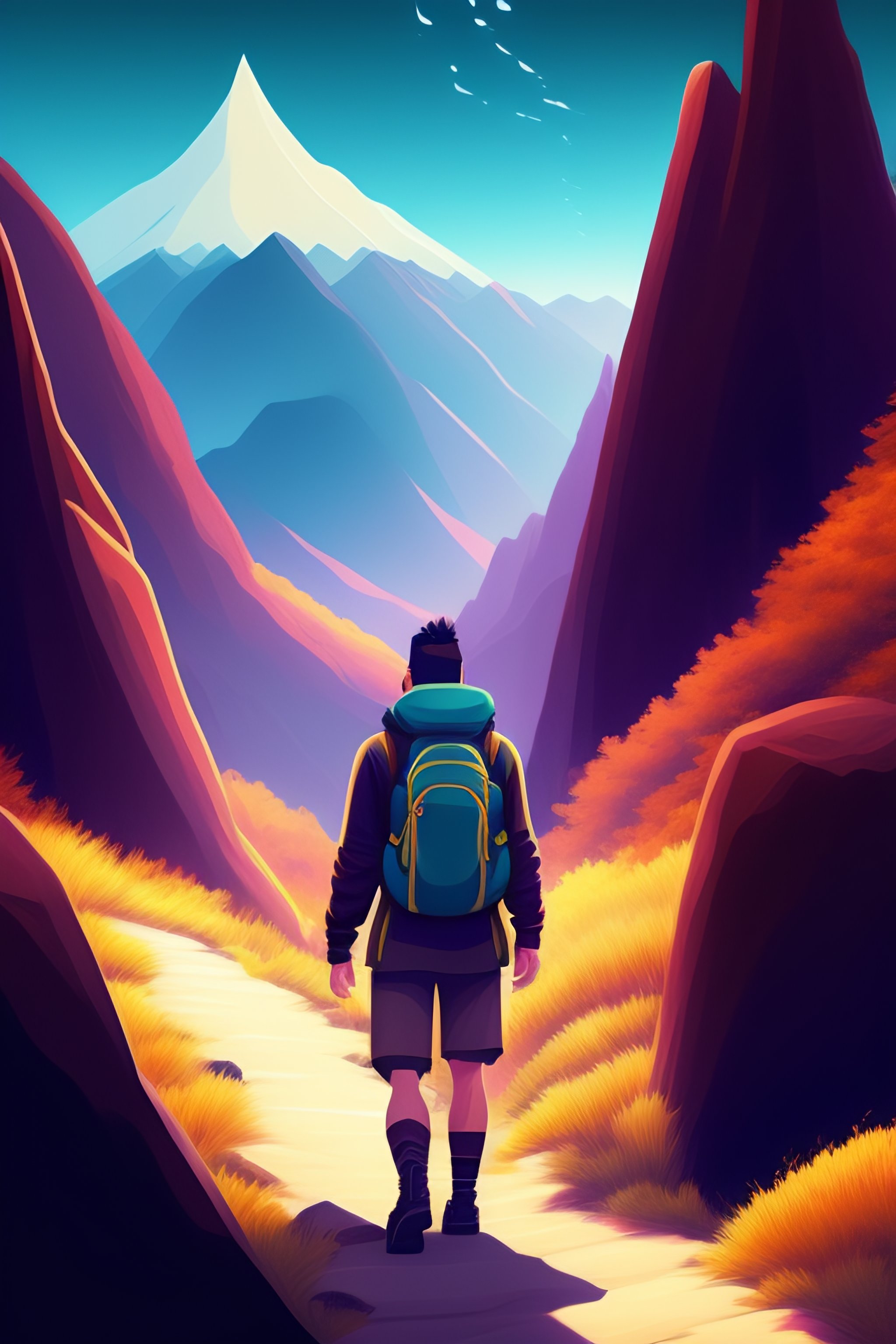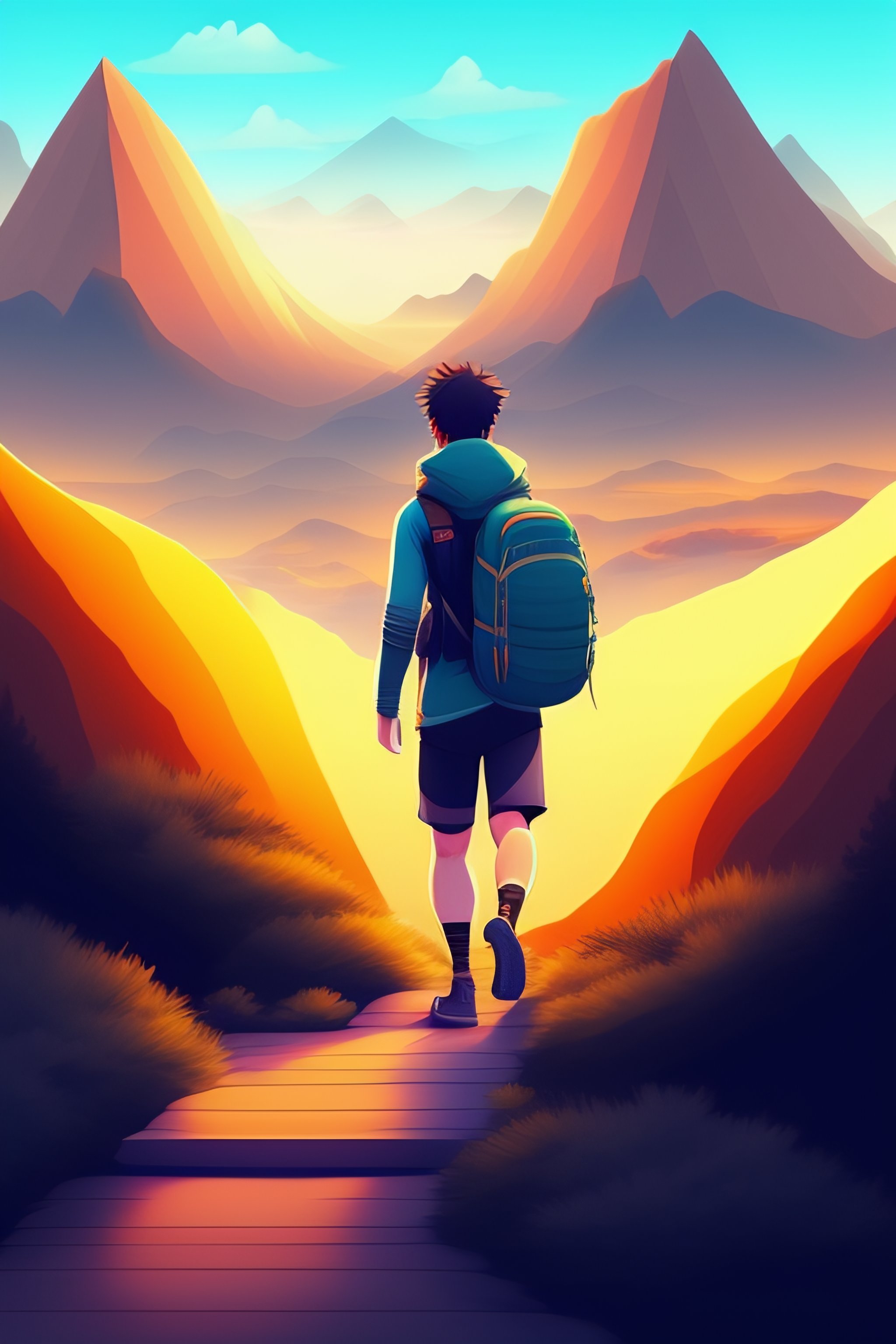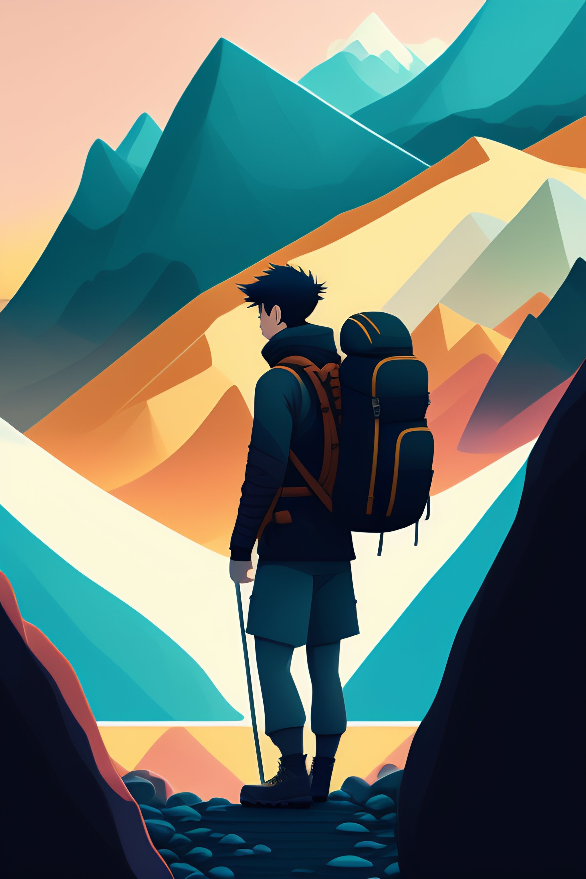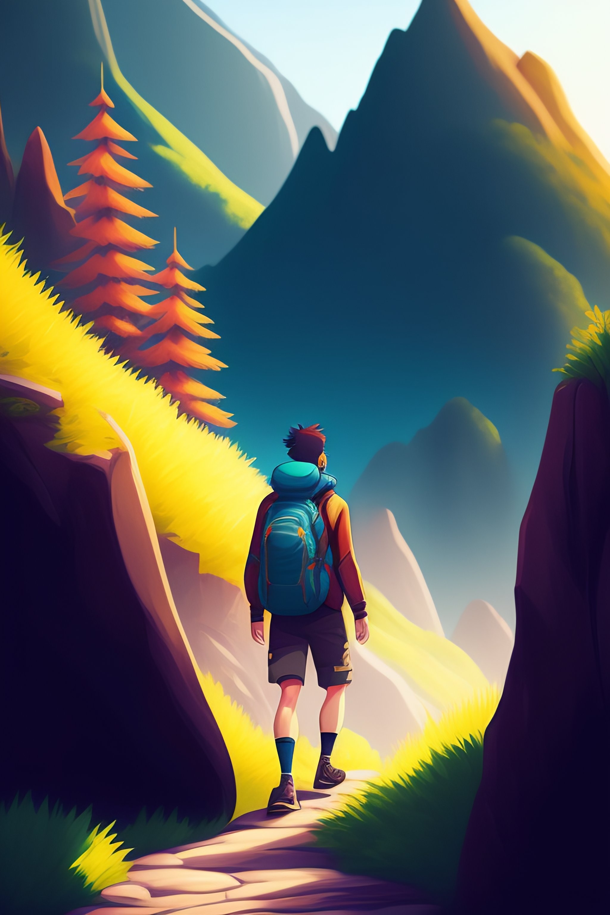 Man hiking in a mountain illustration pokemon anime art style