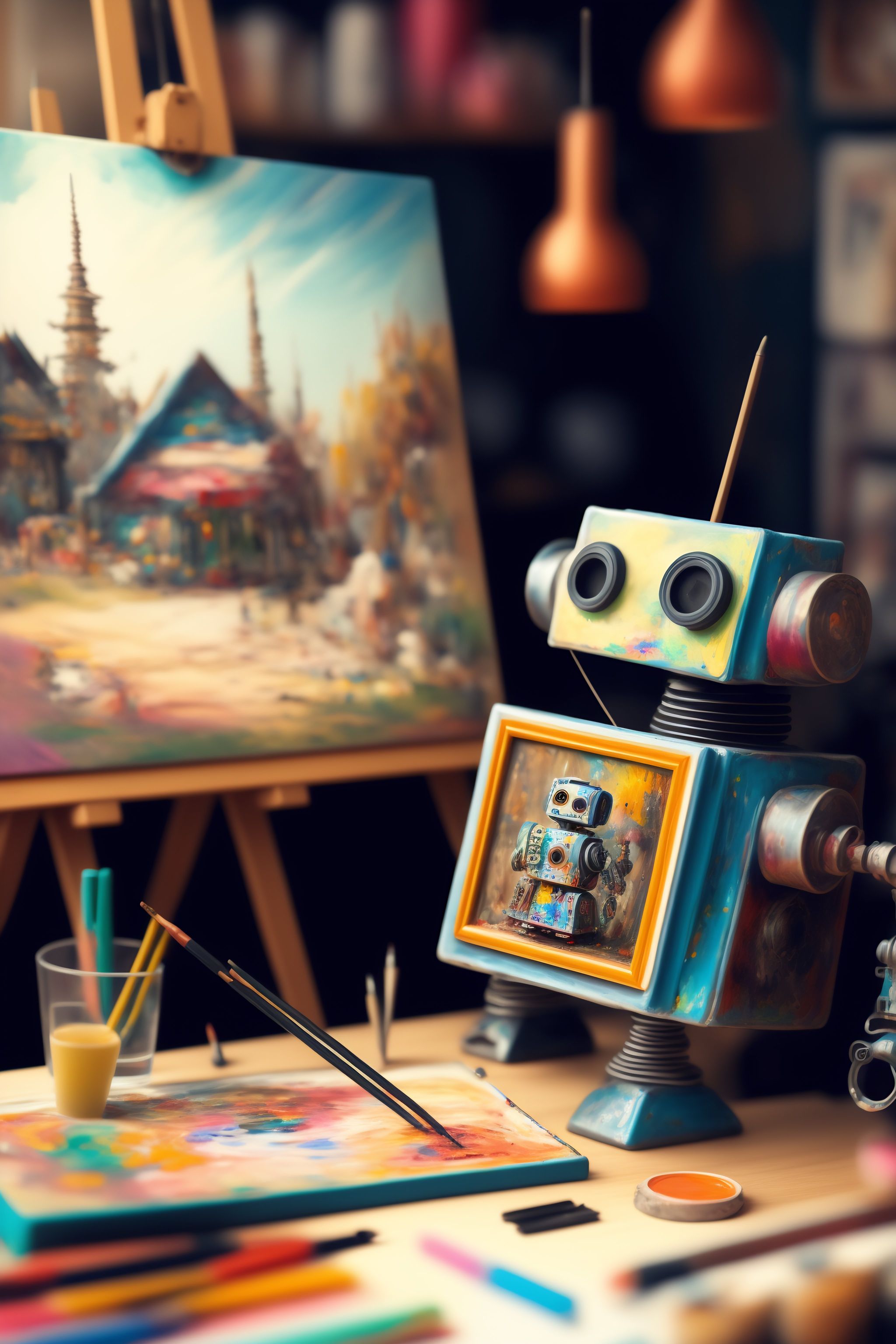 A messy, chaotic artist's workshop, inside is a cute robot painting a picture. the picture is of another robot
