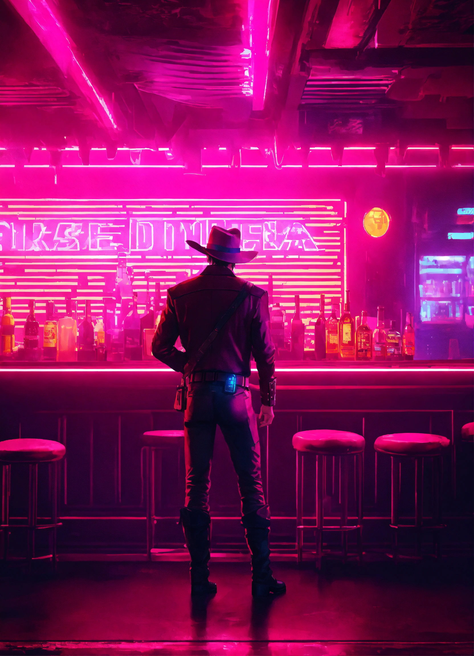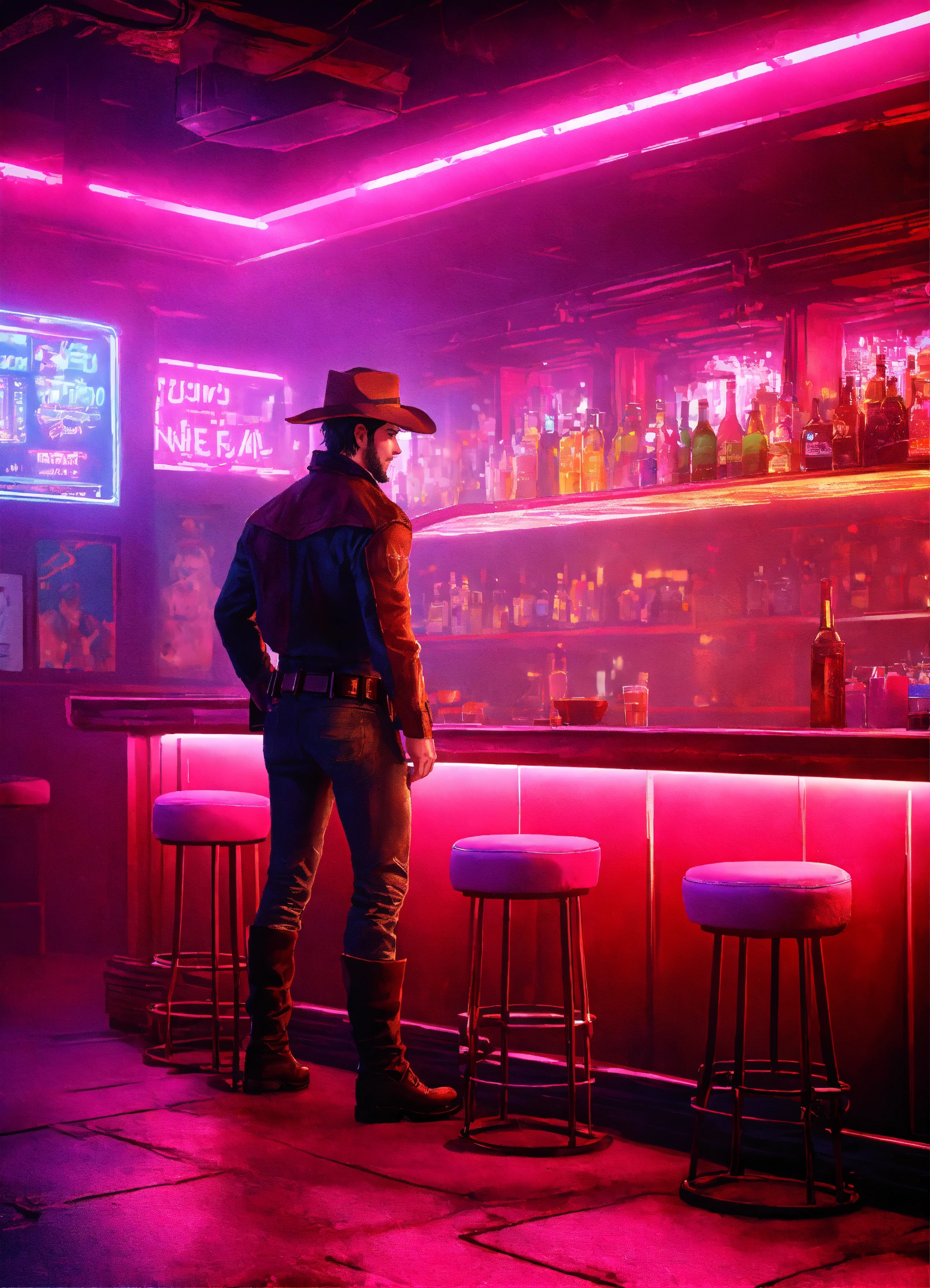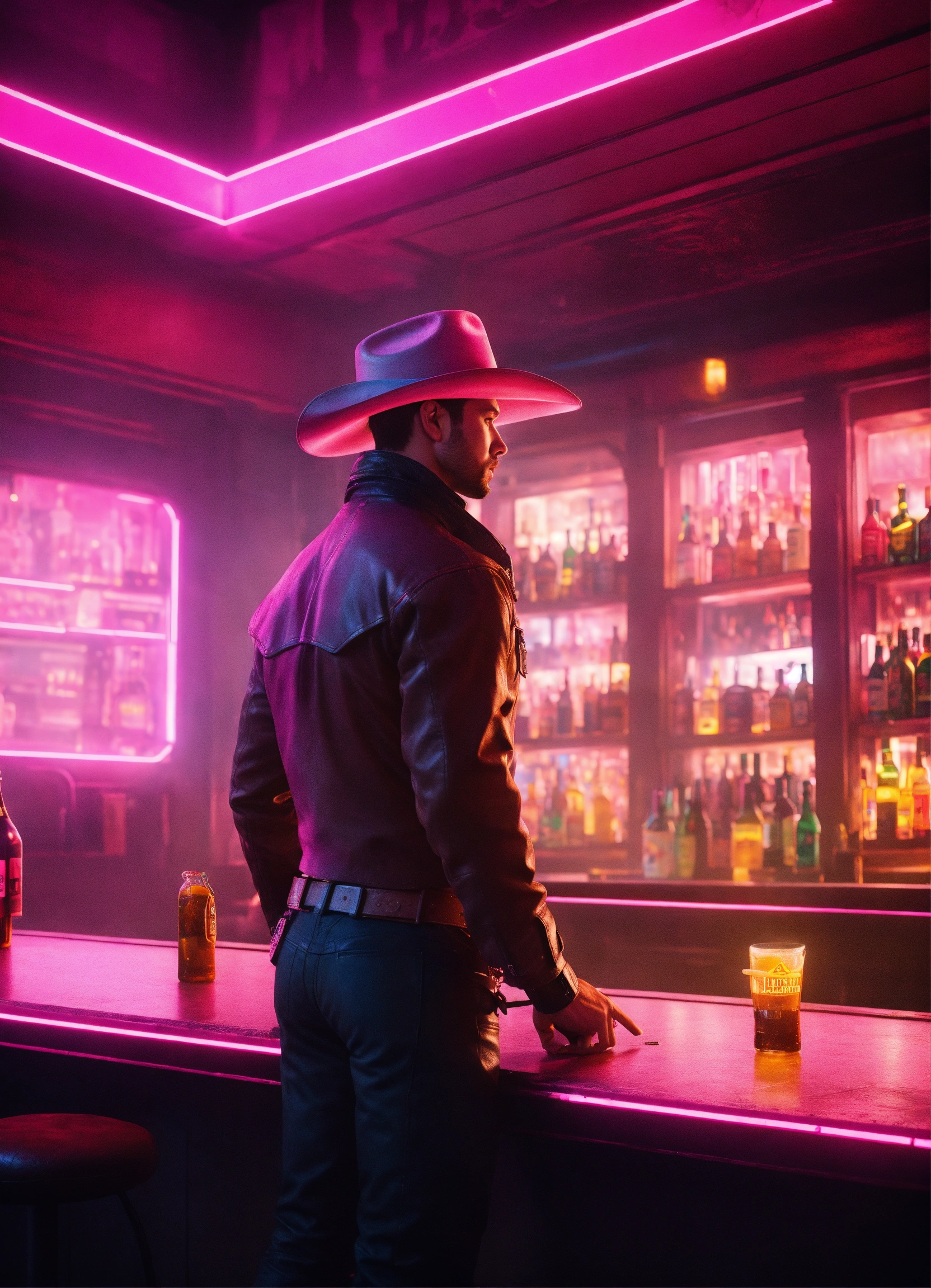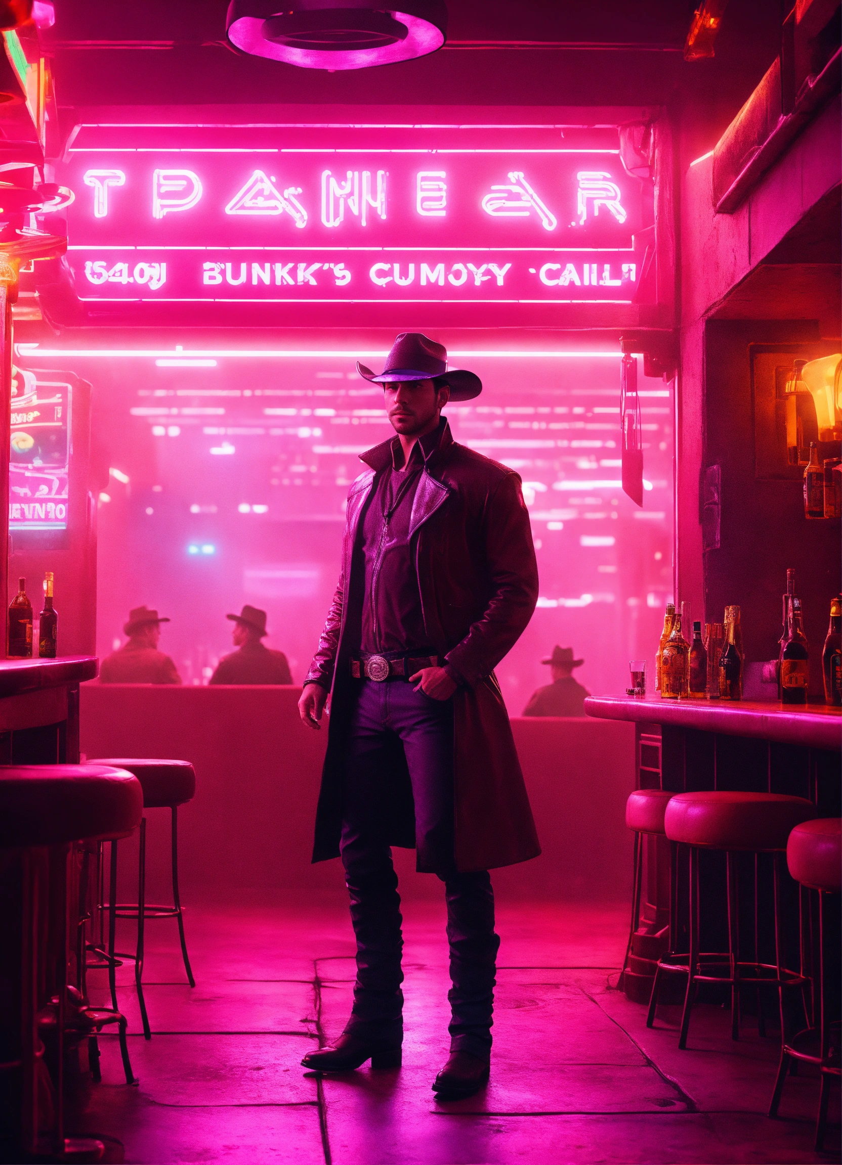 A cowboy standing in a cyberpunk bar, he wears a light pink cowboy hat and light pink belt buckle, blade runner 2049, unreal engine