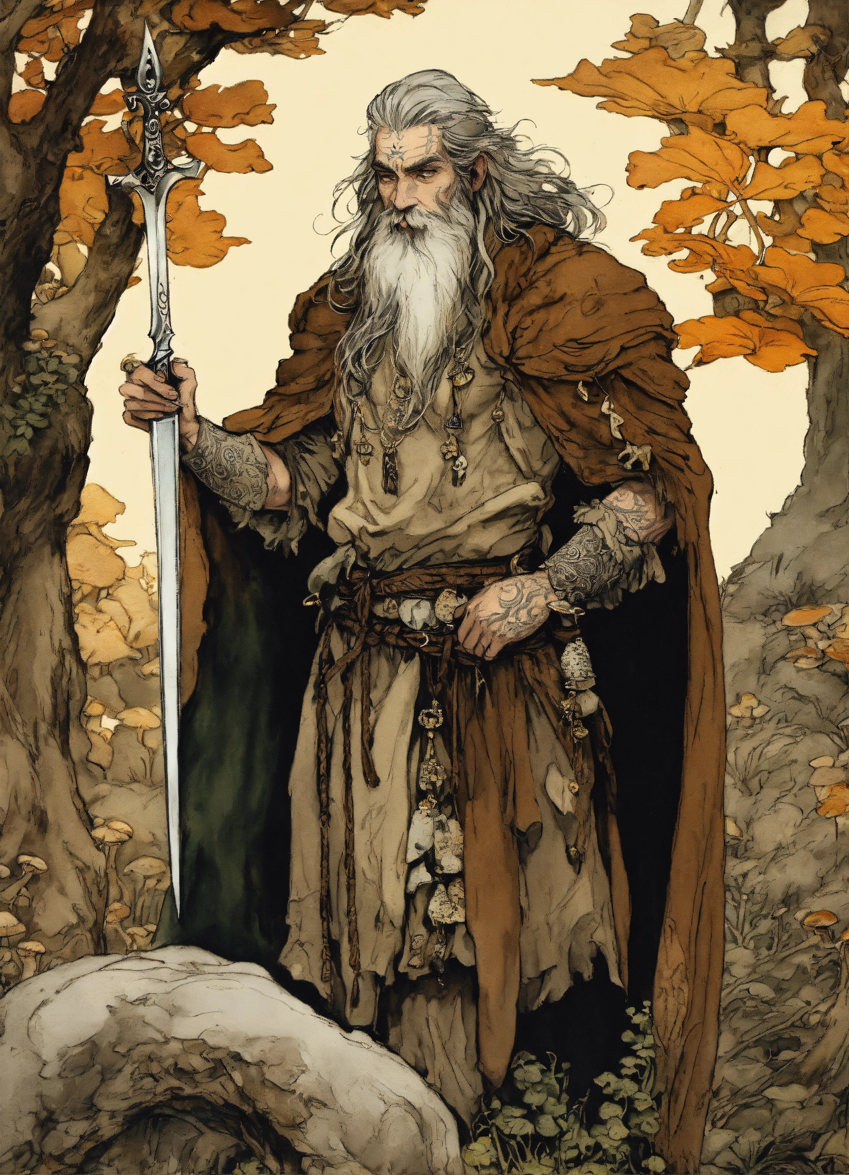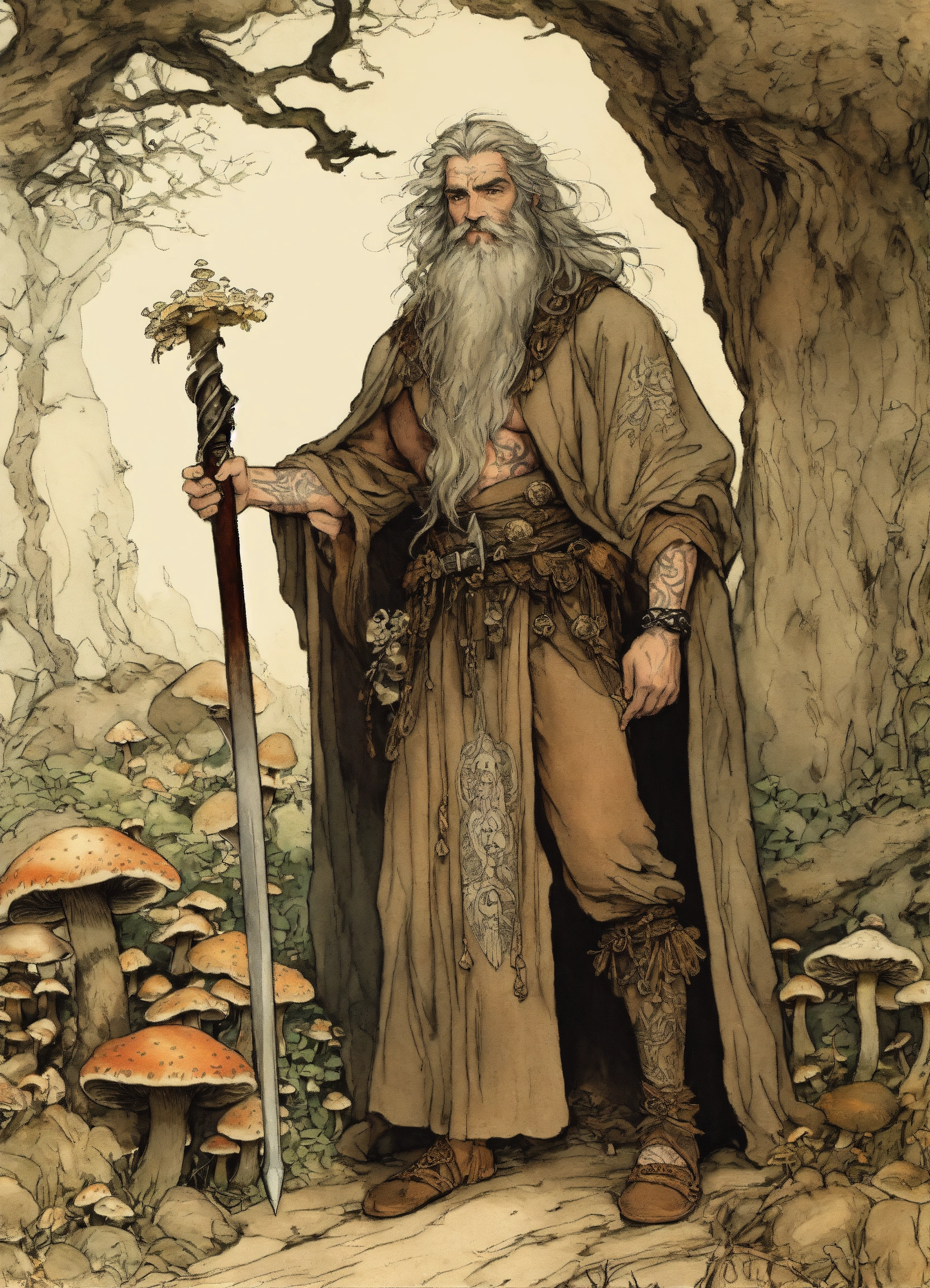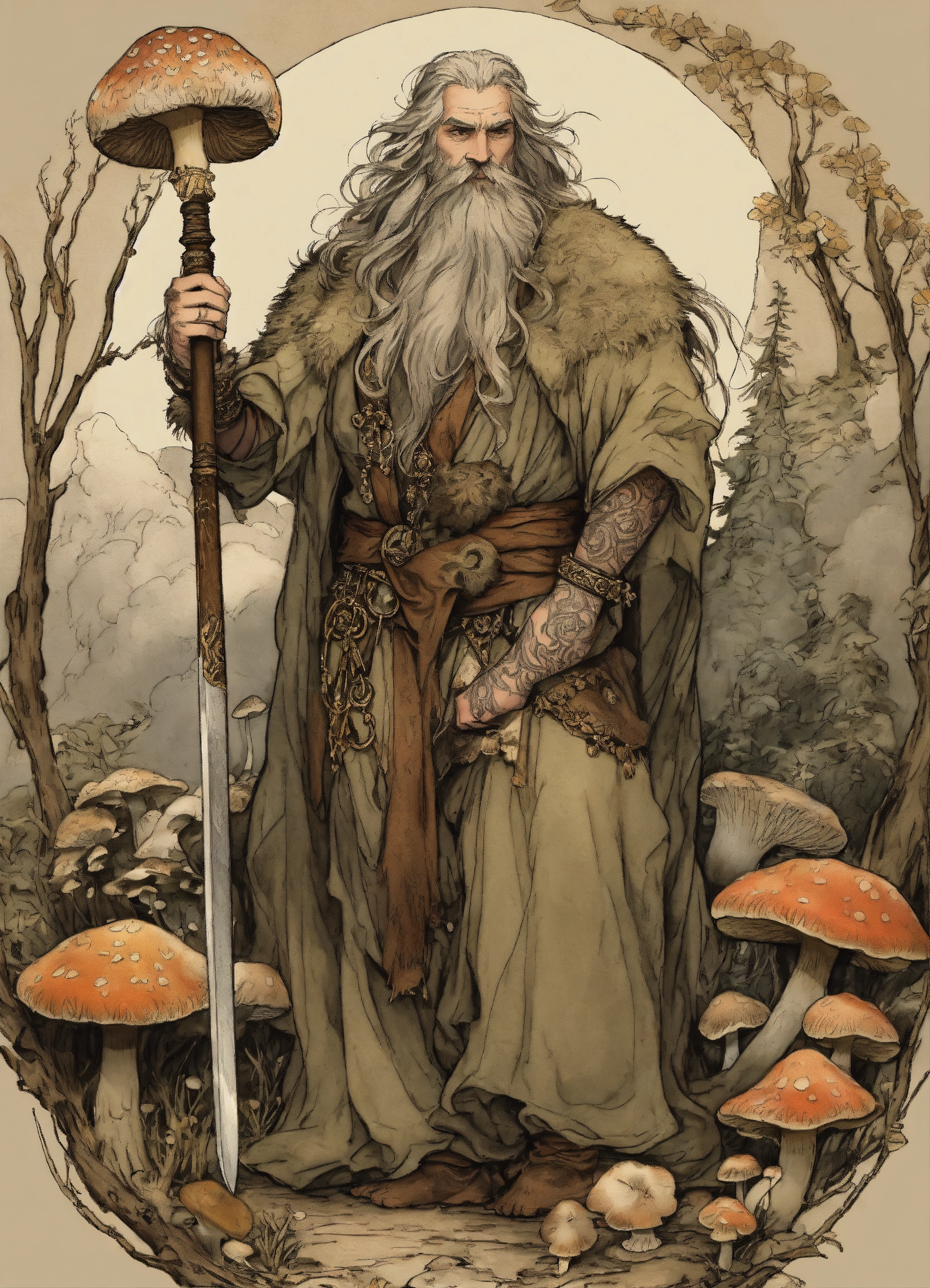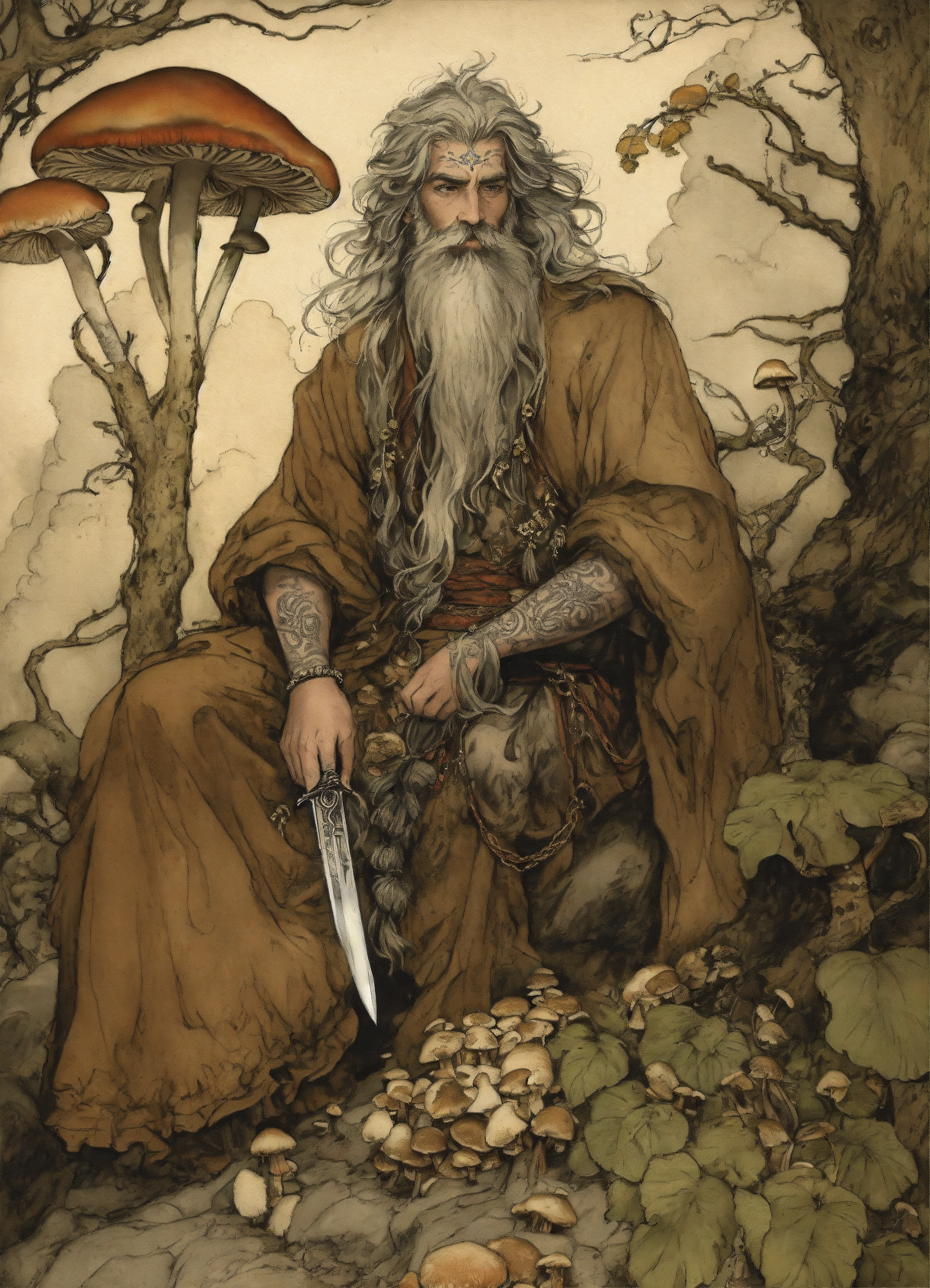 Illustration by arthur rackham, druid, ruggedly handsome, shirtless, bearskin robe, tattooed 40 year old bearded man, fungus, mushrooms, druidic jewelry, bone dagger, long gray hair, intricate details, highly detailed, enkidu, in the style of arthur rackham, 8k, brown auburn black, trichromatic printing