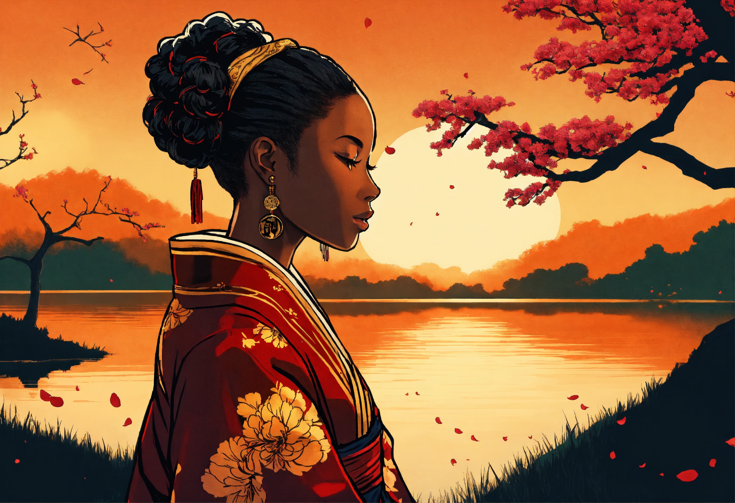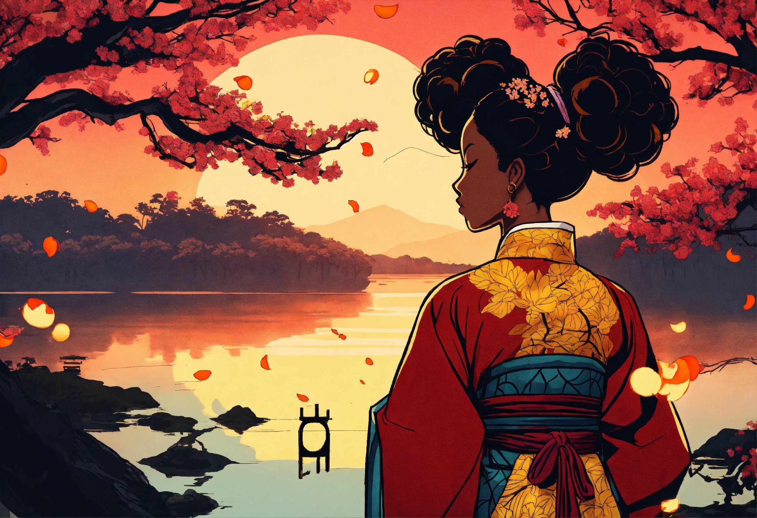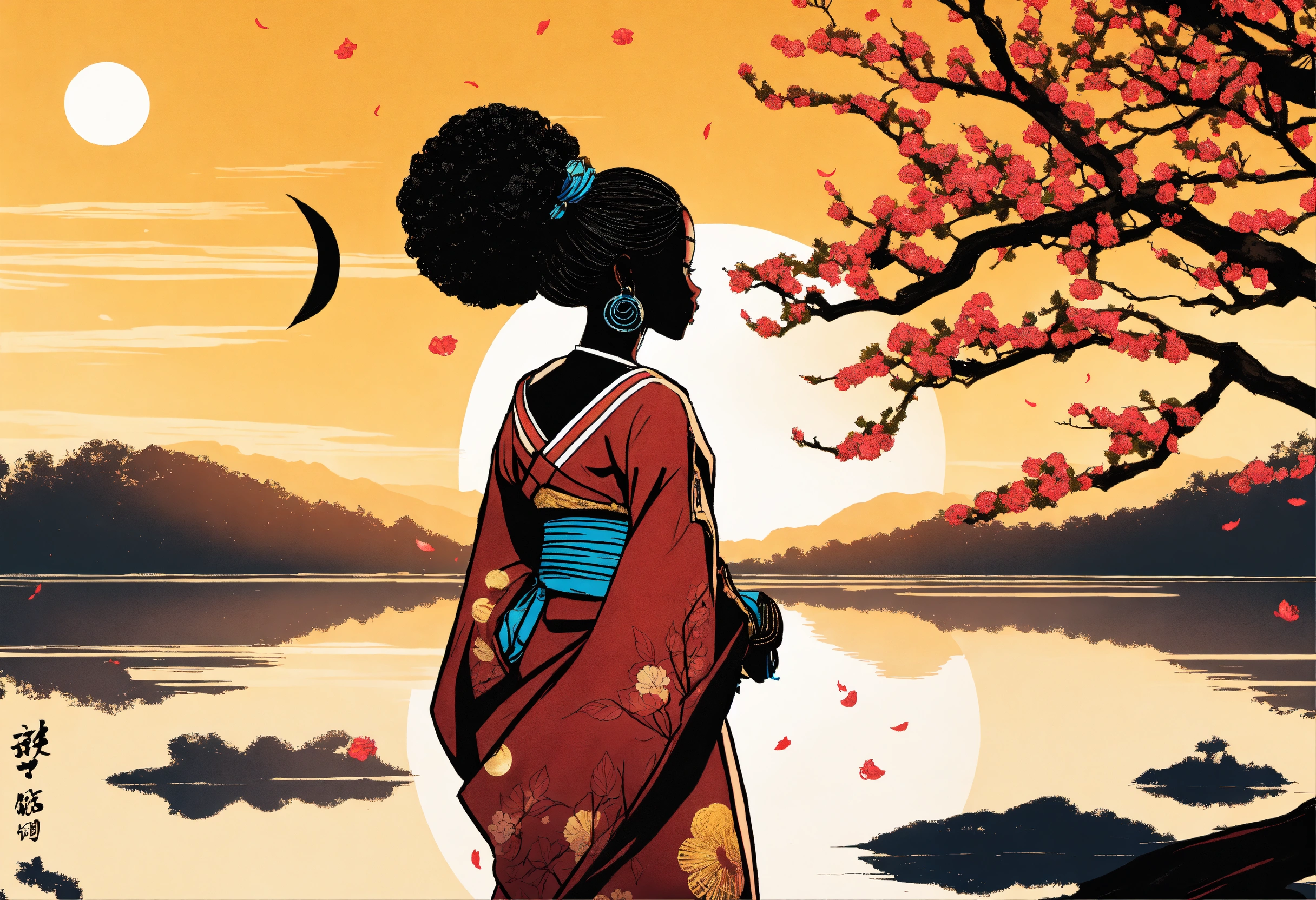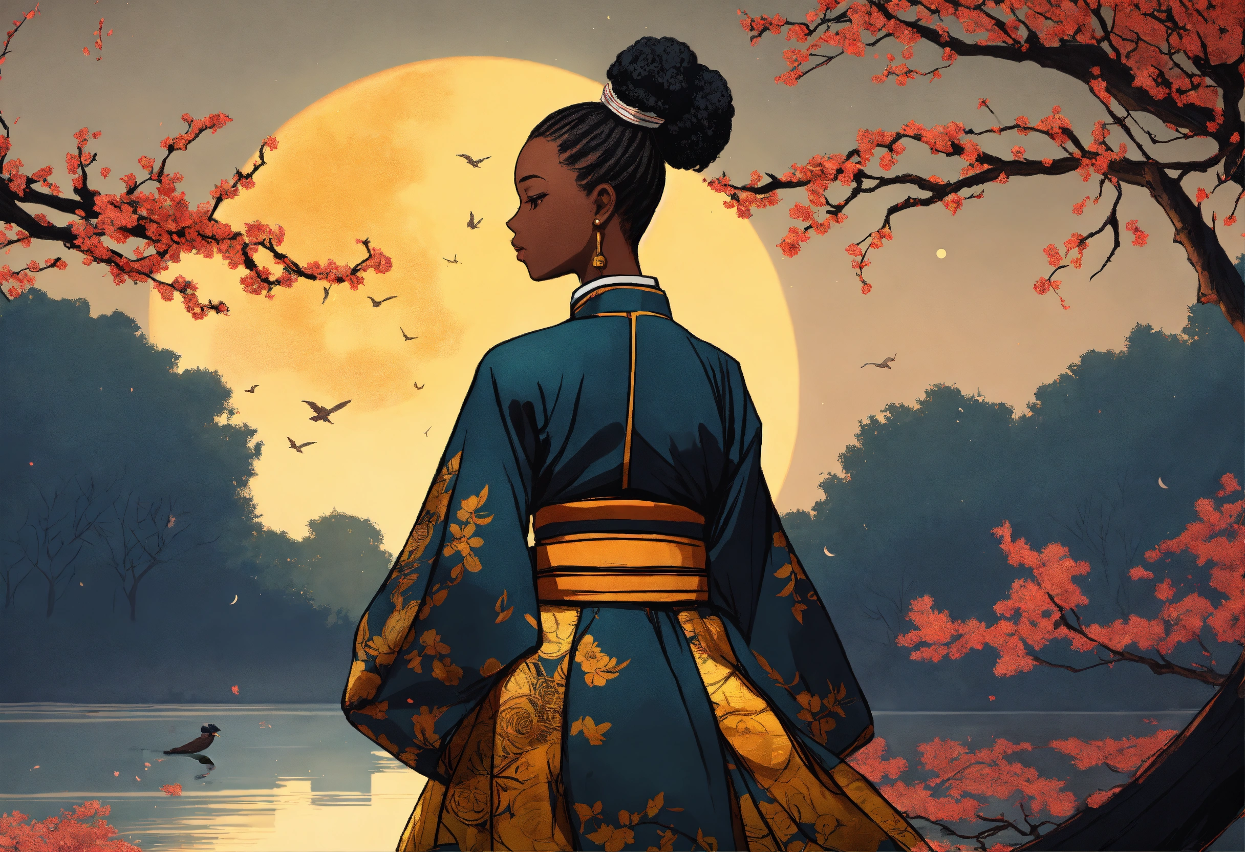 African american woman wearing traditional hanbok, with afro puff ponytails with a blazing tattoo on the nape of her neck. cherry tree lifts its branches over the lake, in which the golden moon is reflected, strong contrast. black color silhouette. afrocentric. manga line drawing. short angle shot