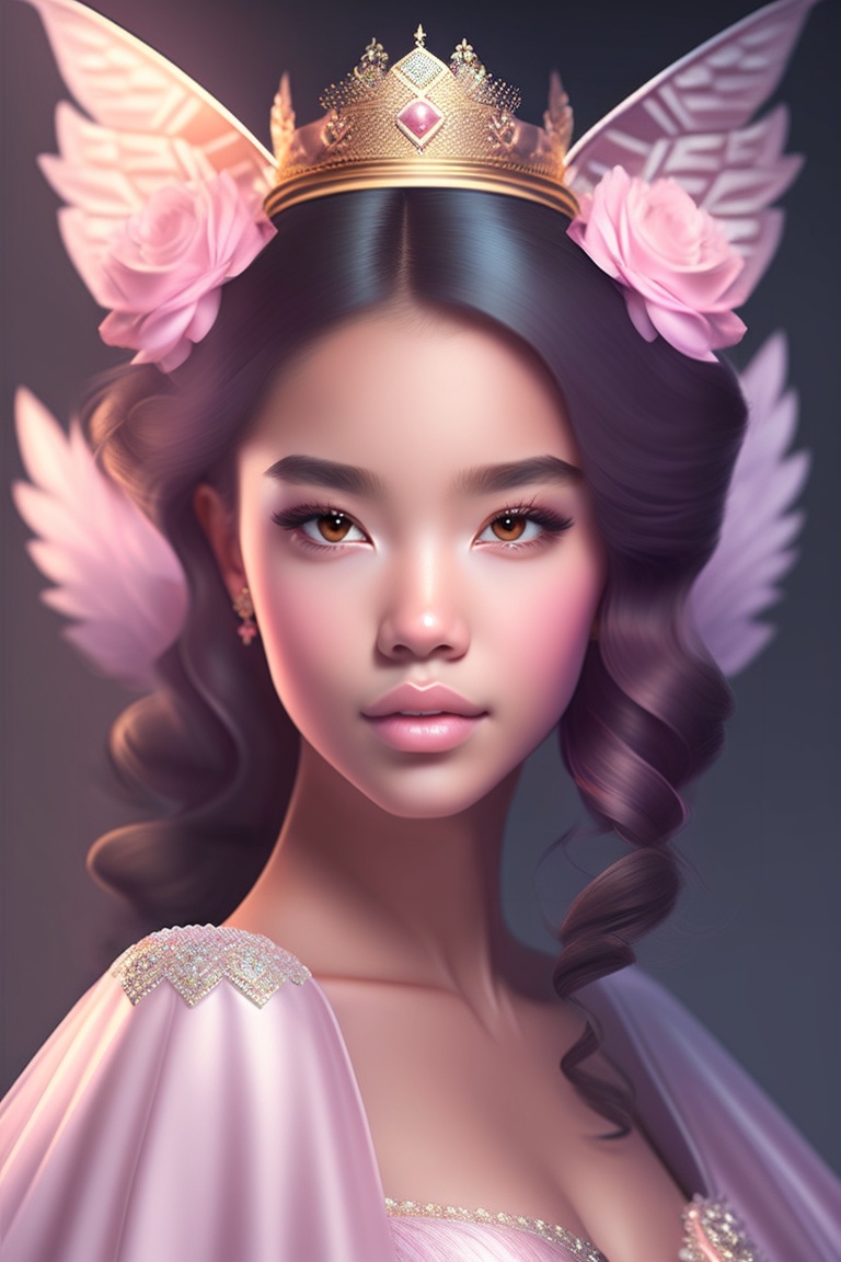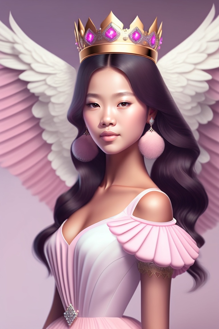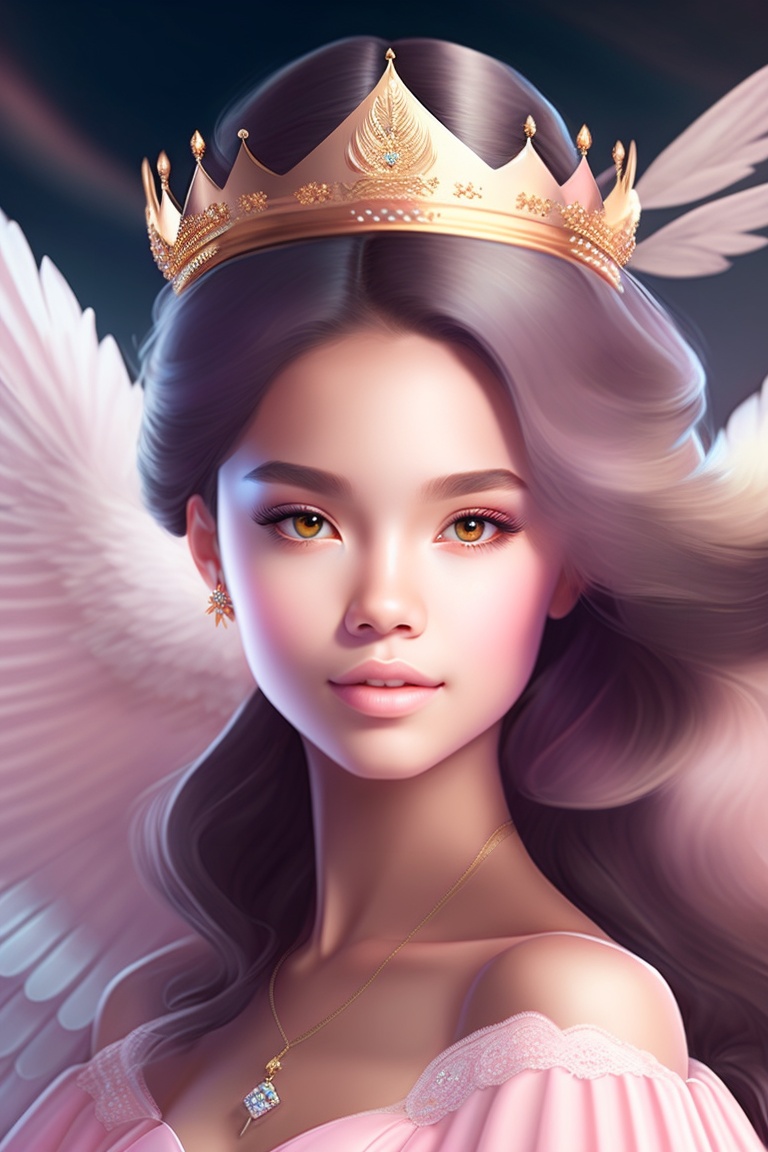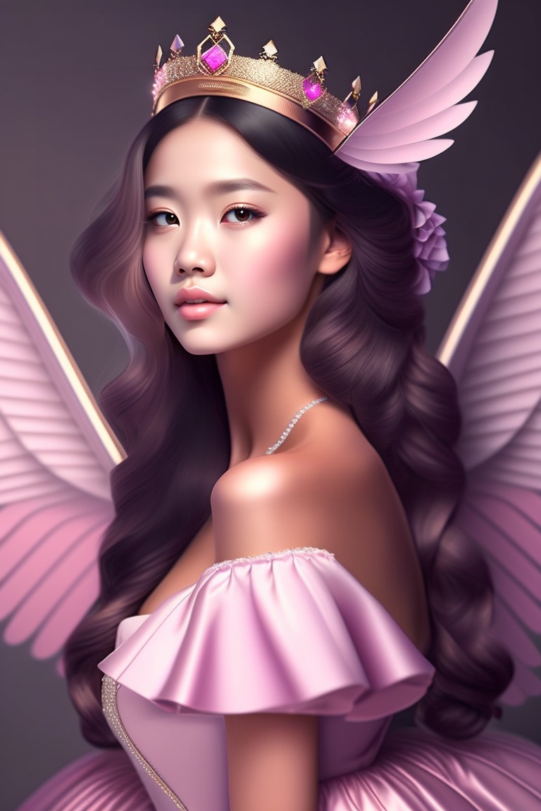 A cute girl princes with wings in light pink dress, beautiful crown, beautiful hairstyles long and curve eyelashes, black eyes, hair colour black, skin tone fair, slim body