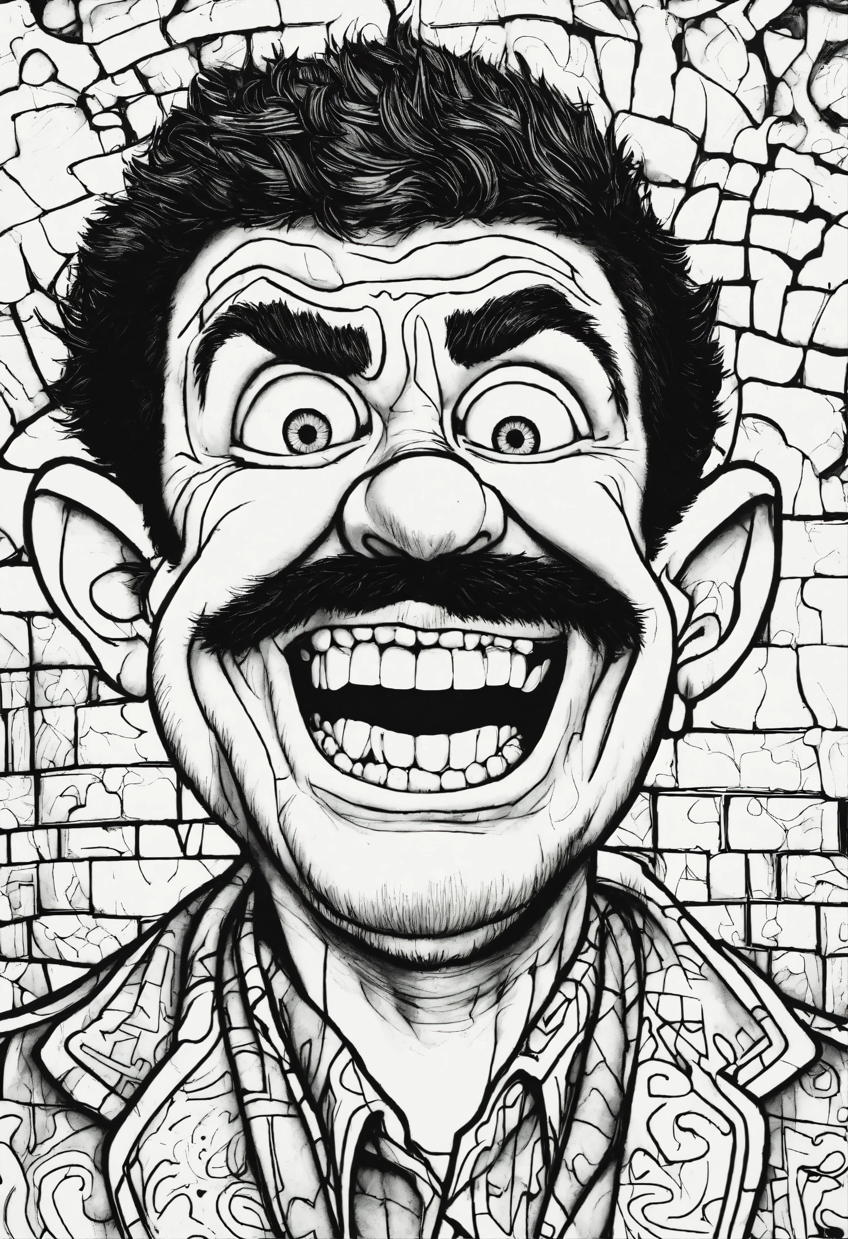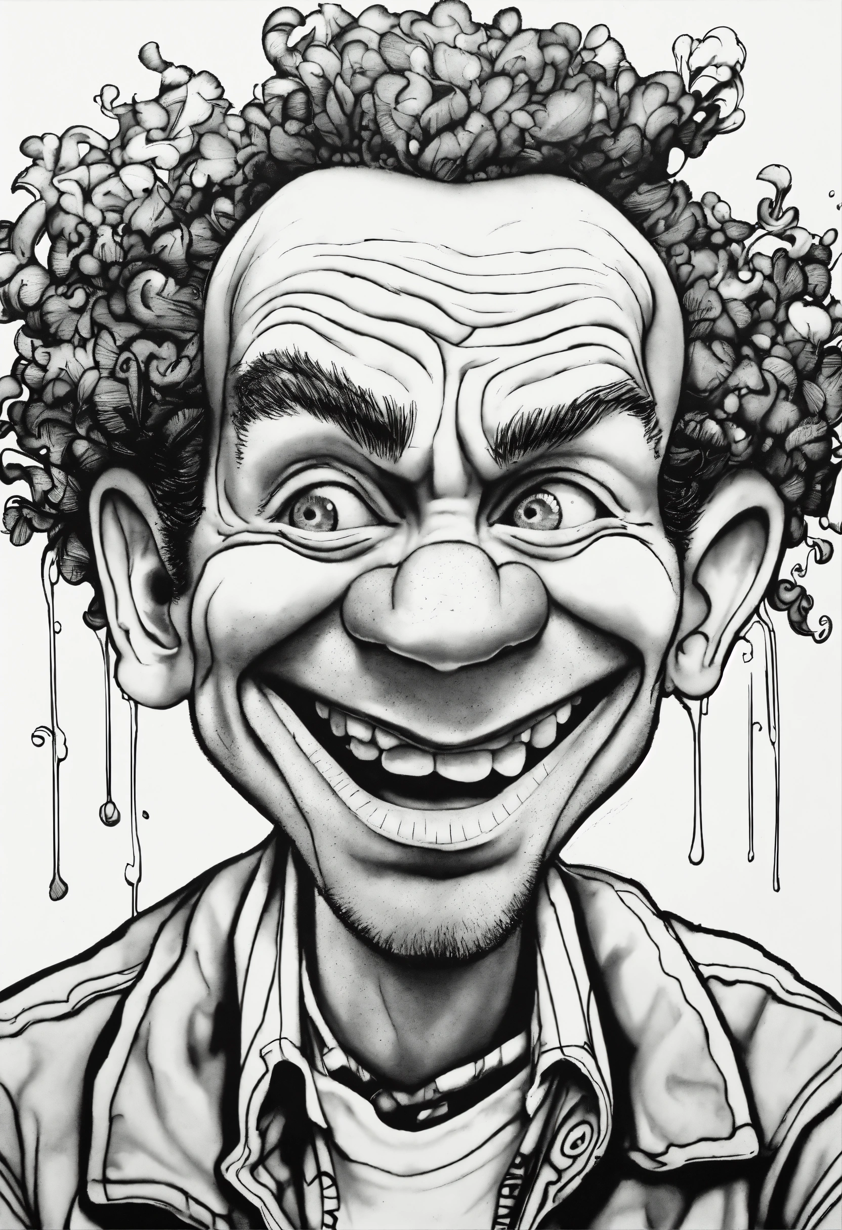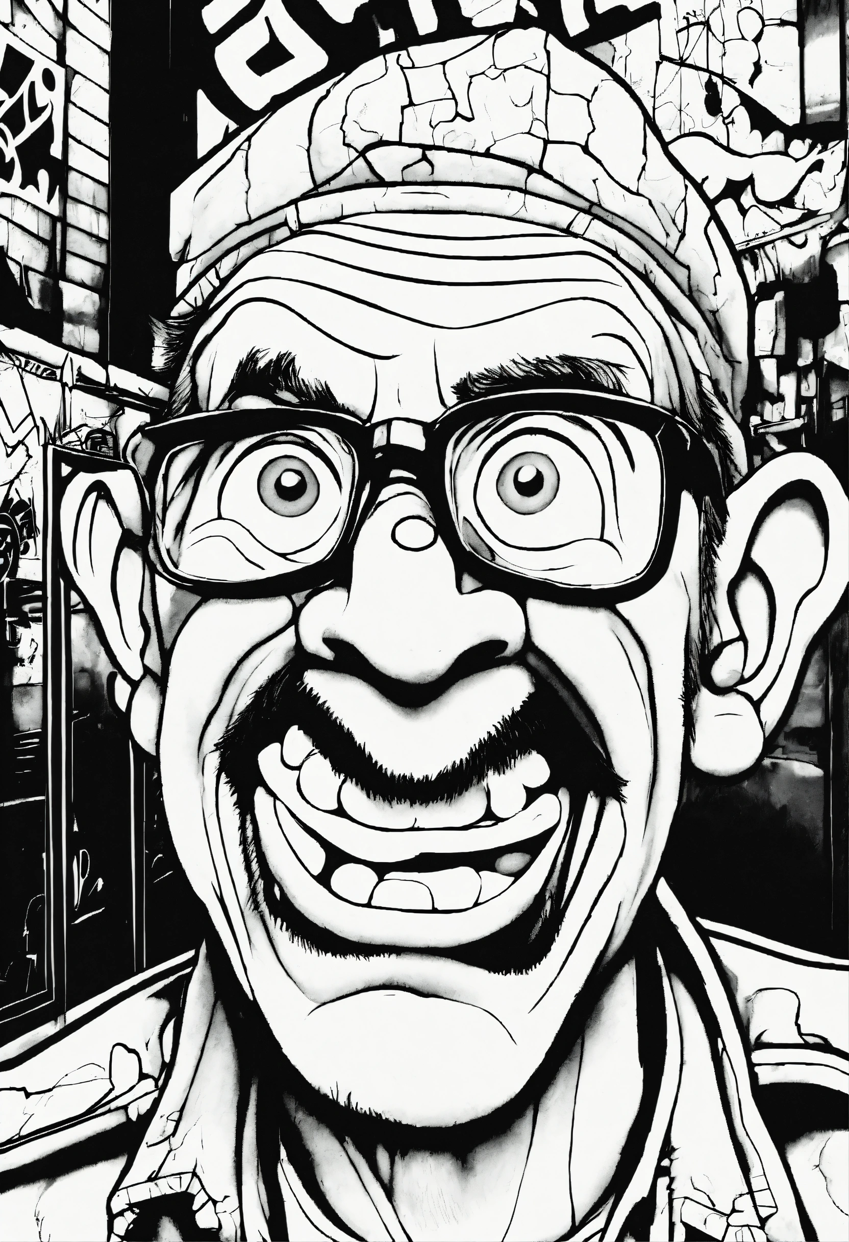 Coloring page for adults, graffiti art, mad magazine character idiot face, black and white, caricature, white background