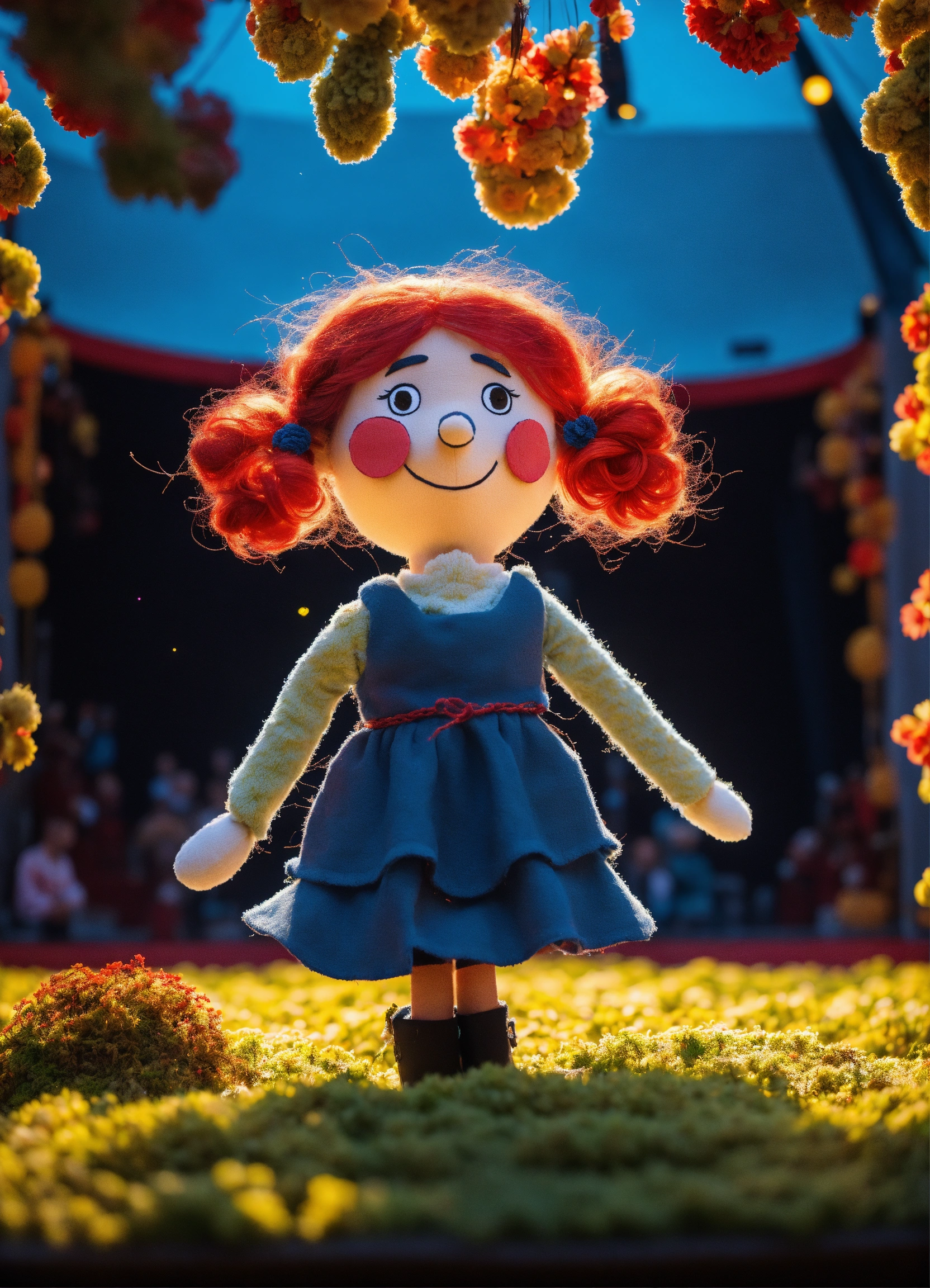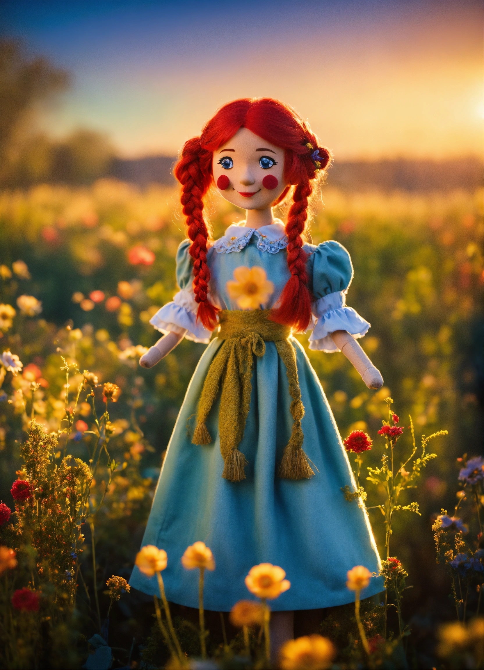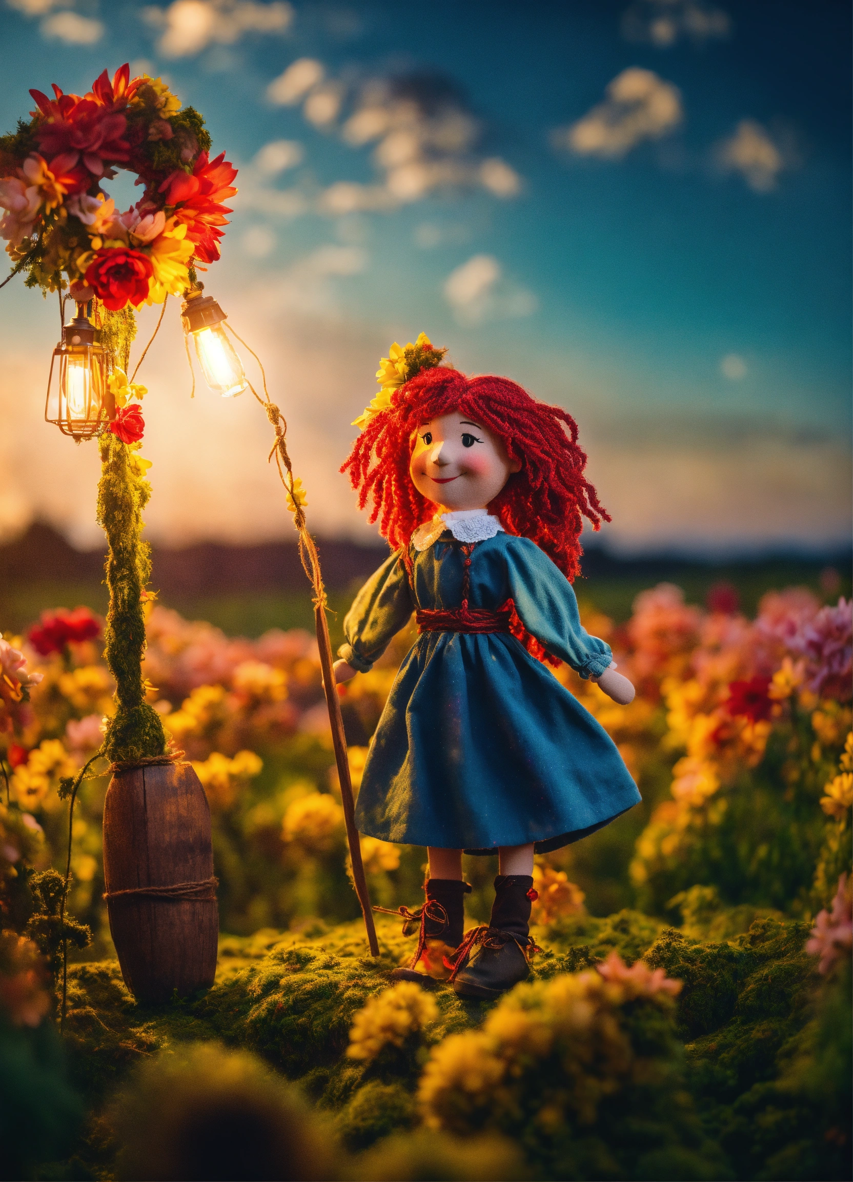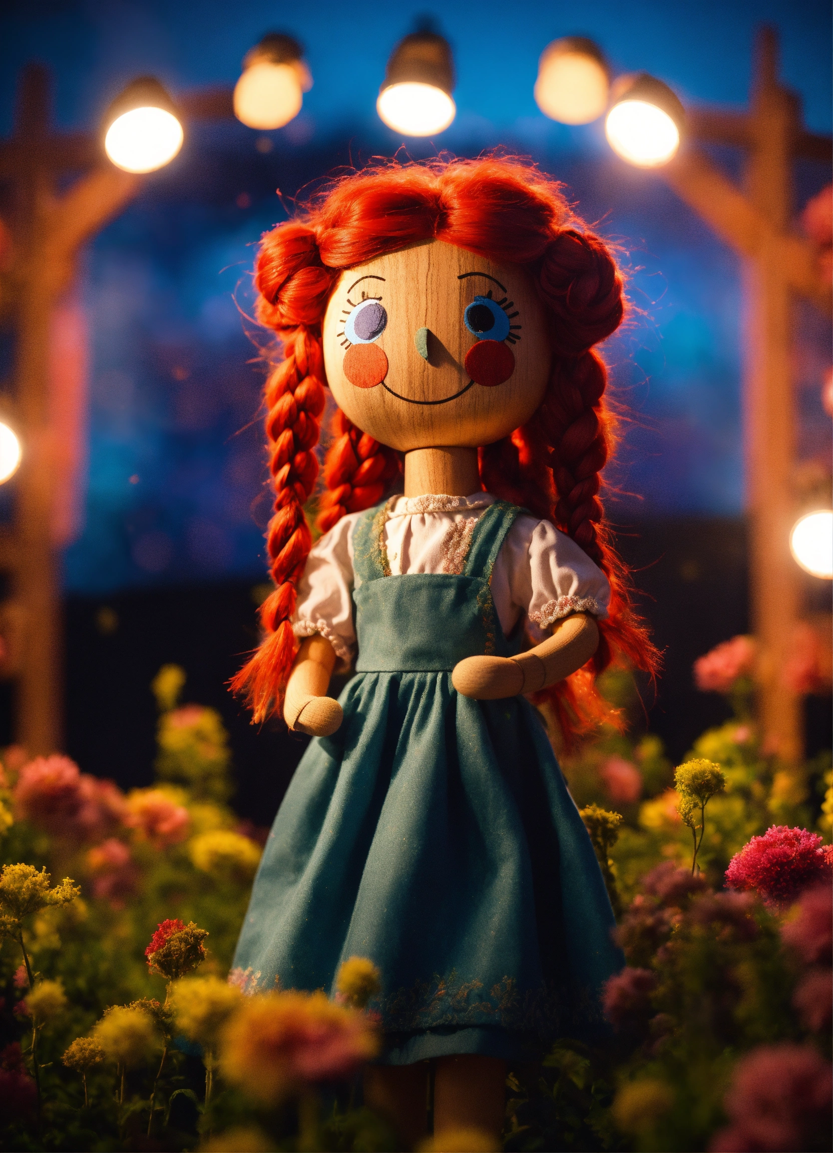 One wooden puppets, a red-haired girl with braids, happy, dressed in october festival, on a theater stage with a beautiful light, surrounded by a blue sky on a flower field. a beautiful light theater stage cinematic lighting, ultra 4k hd, illuminated by irridescent moss