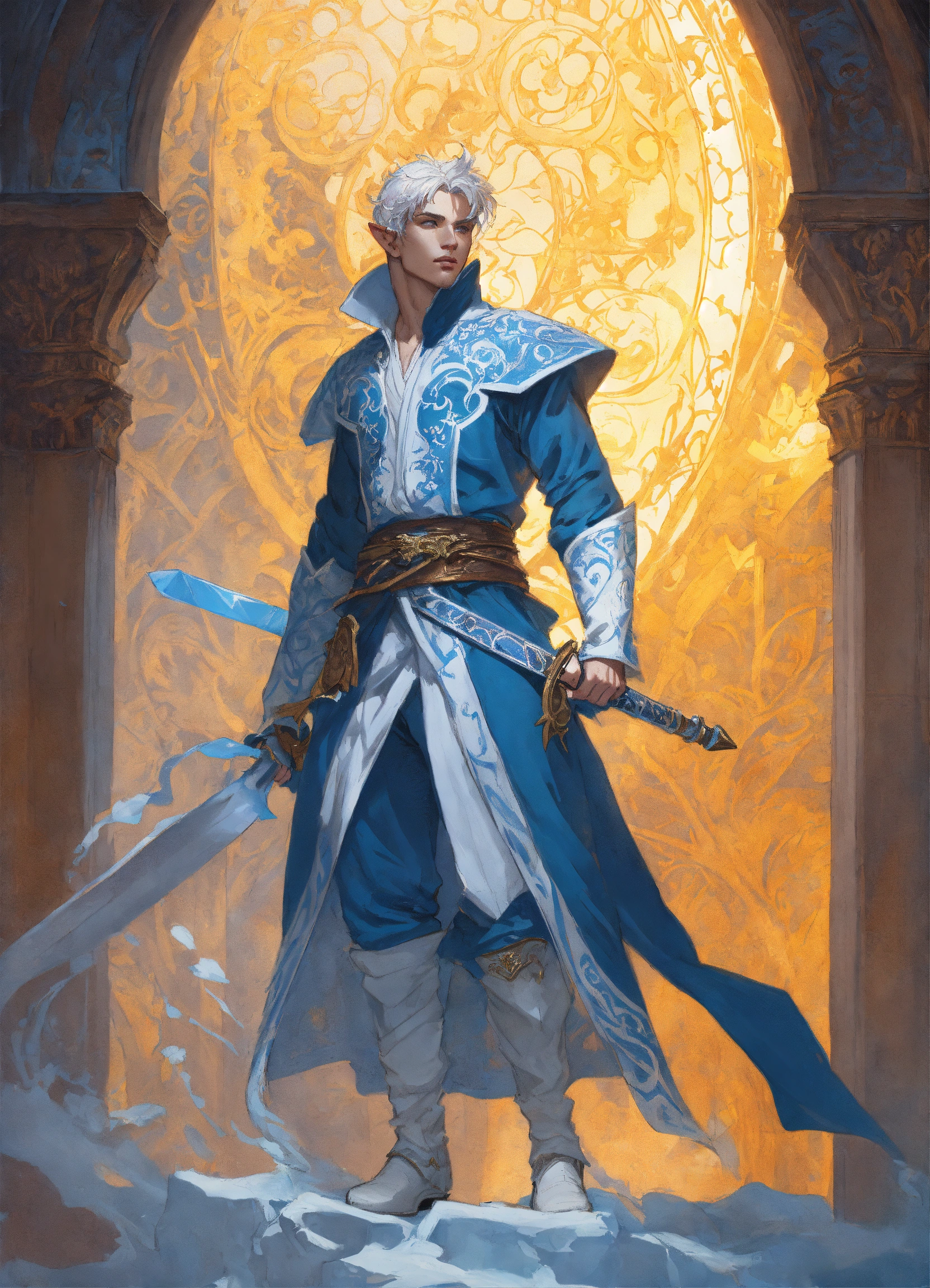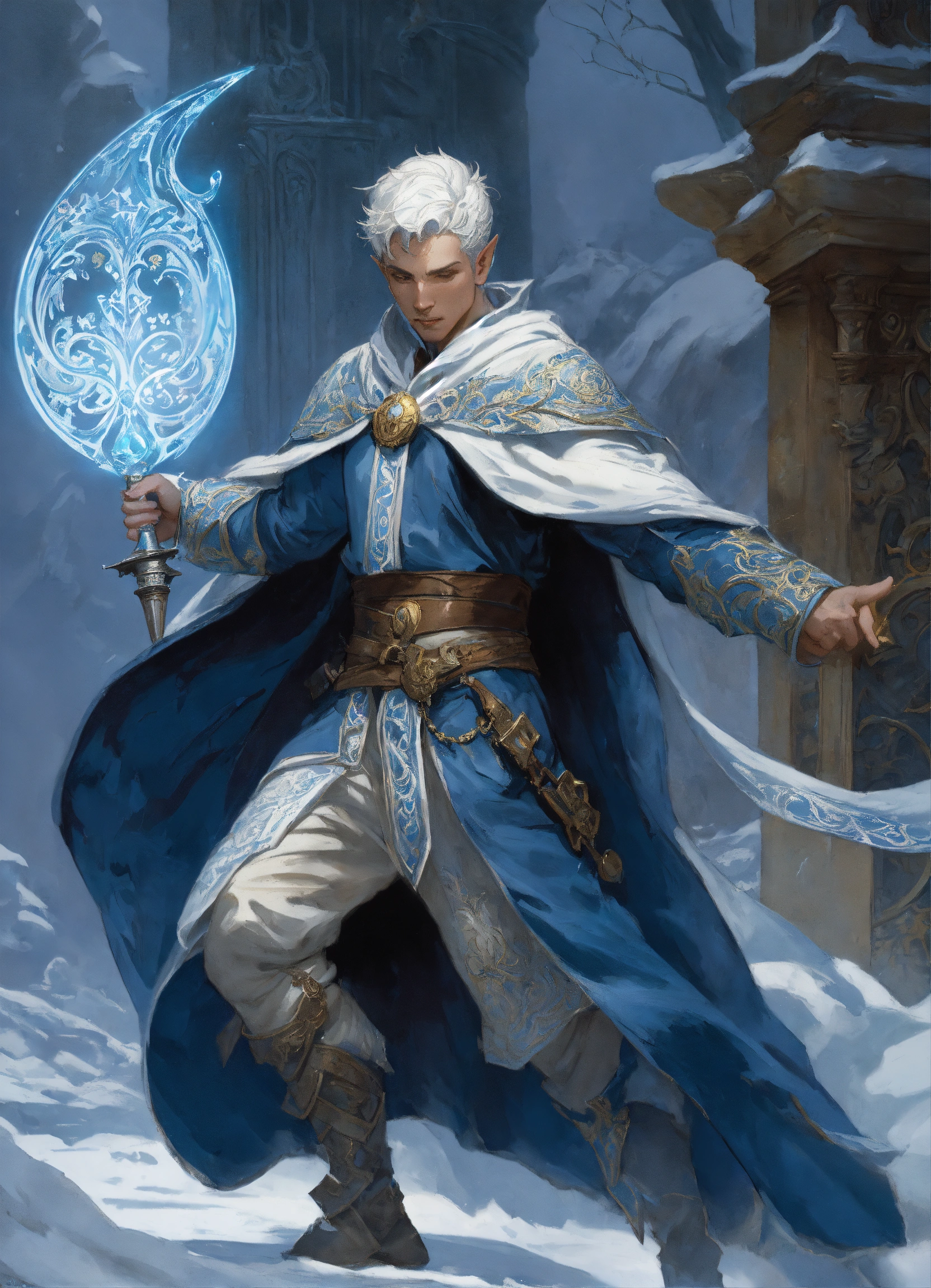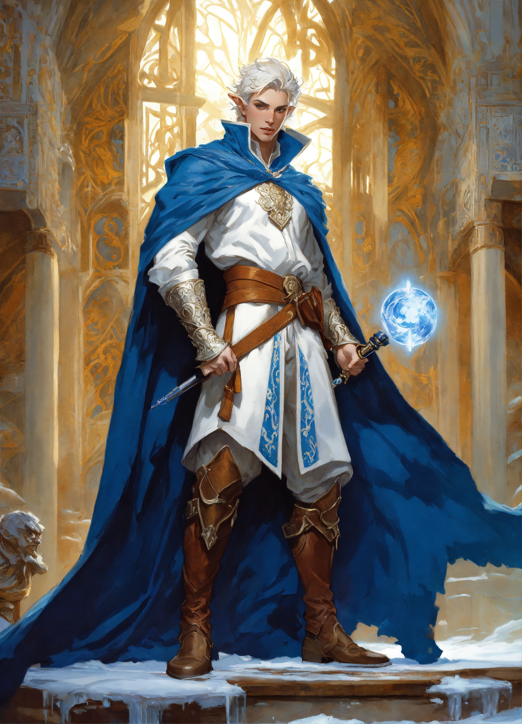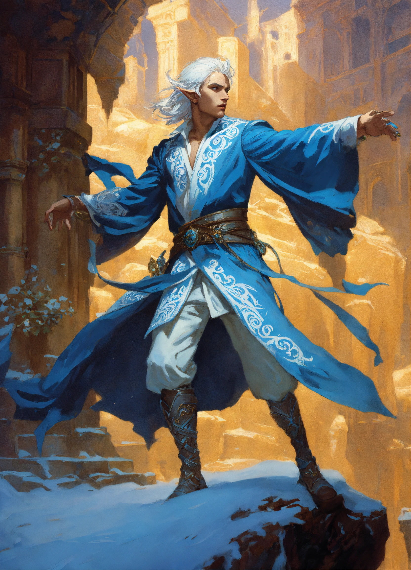 Male elf, ice skin, white white short hair, wearing blue and white rogues robes, fighting pose, full body, concept art, intricate details, highly detailed by greg rutkowski, michael whelan, and gustave dore, alphonso mucha