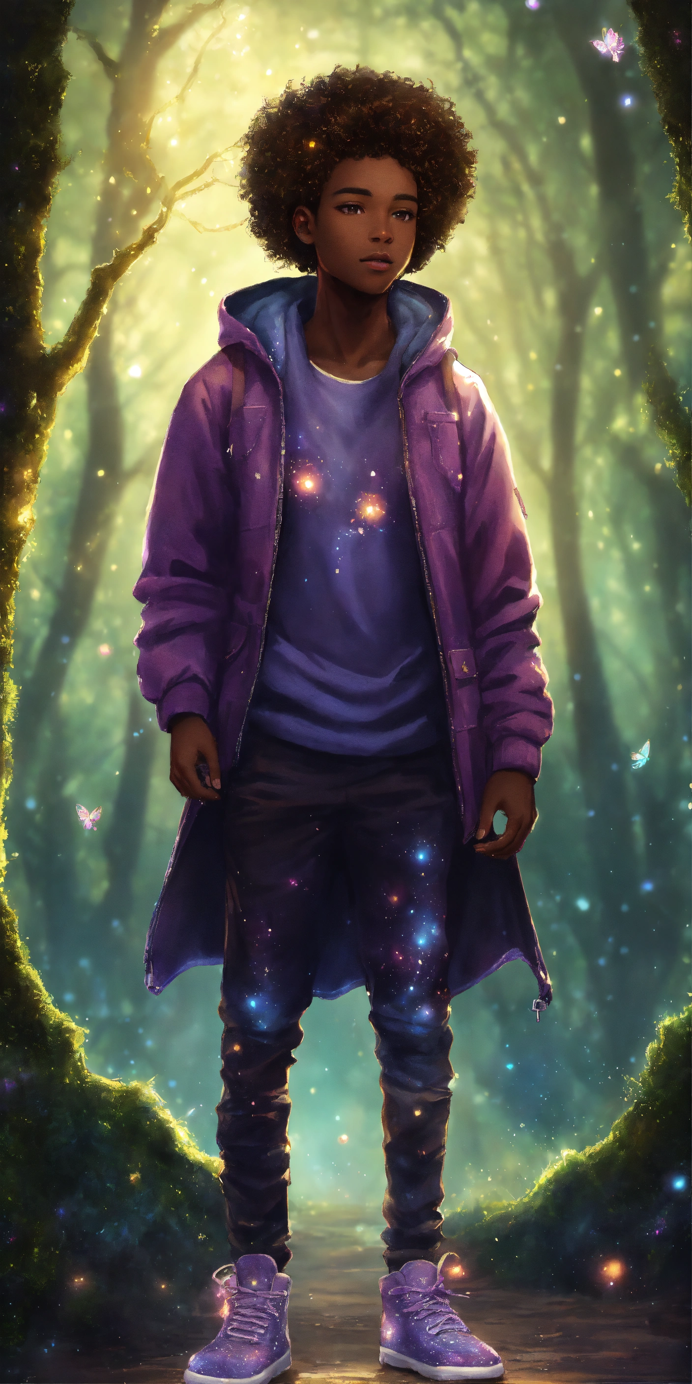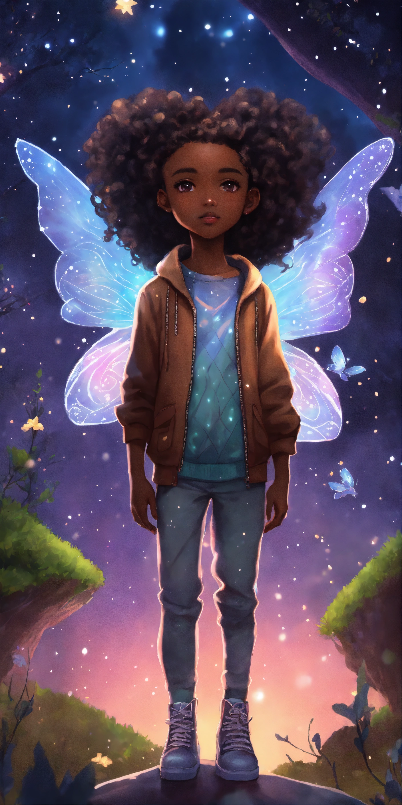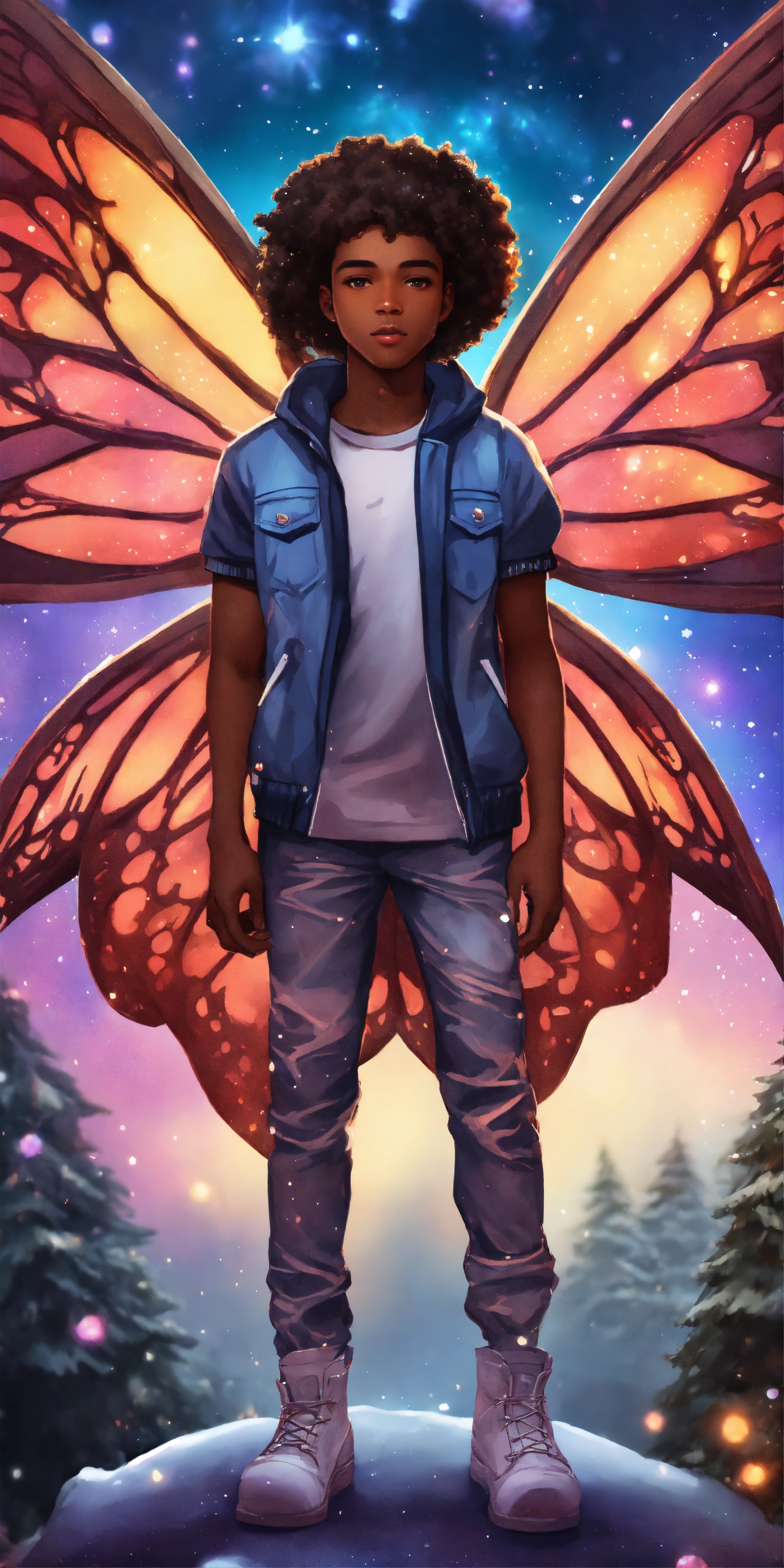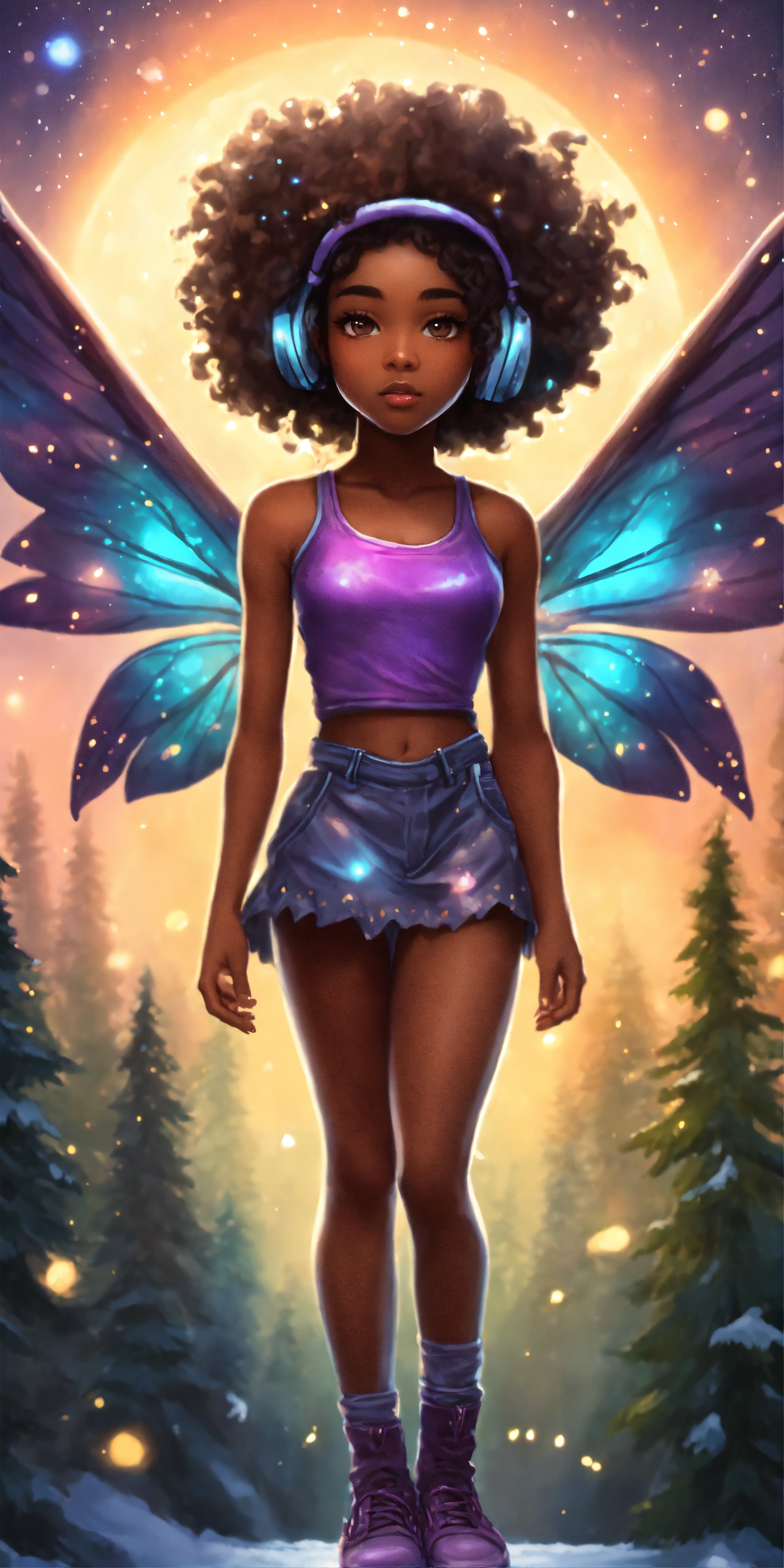 Dark dark complexion african american male, realistic healthy glossy well defined wavy hair texture, full body shot, rule of thirds centered subject placement, storybook, dreamlike, galaxy background cartoon, illustration, winter theme, woodland fairy punk girl, fairywings, urban fairy