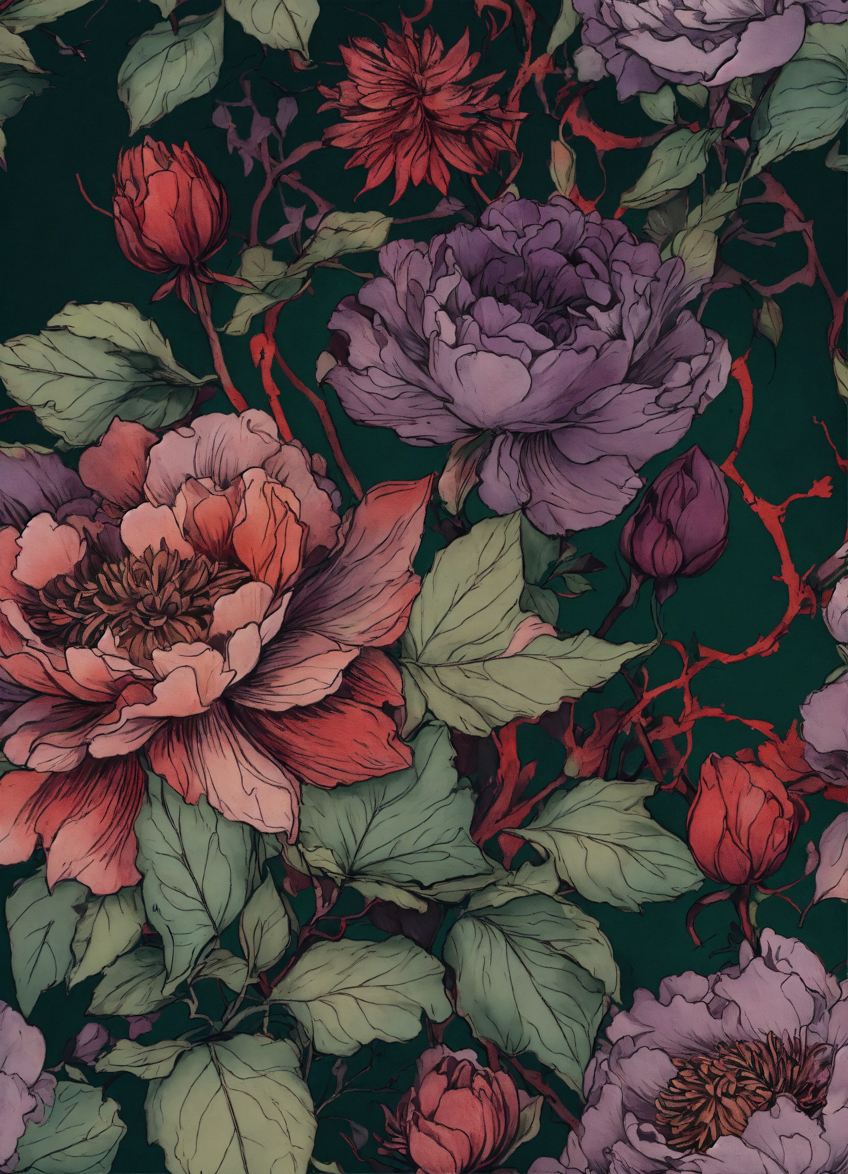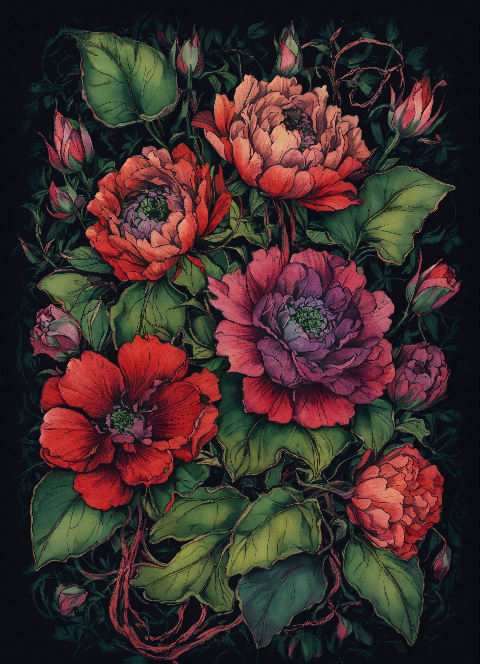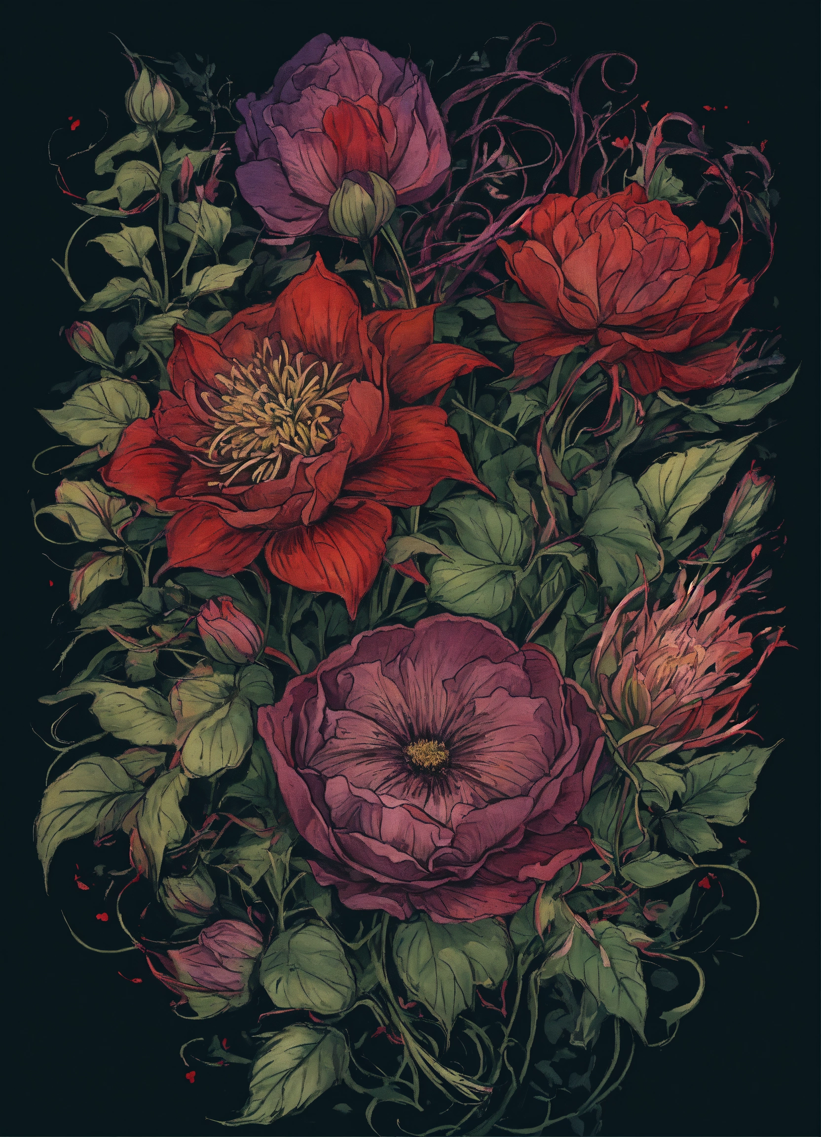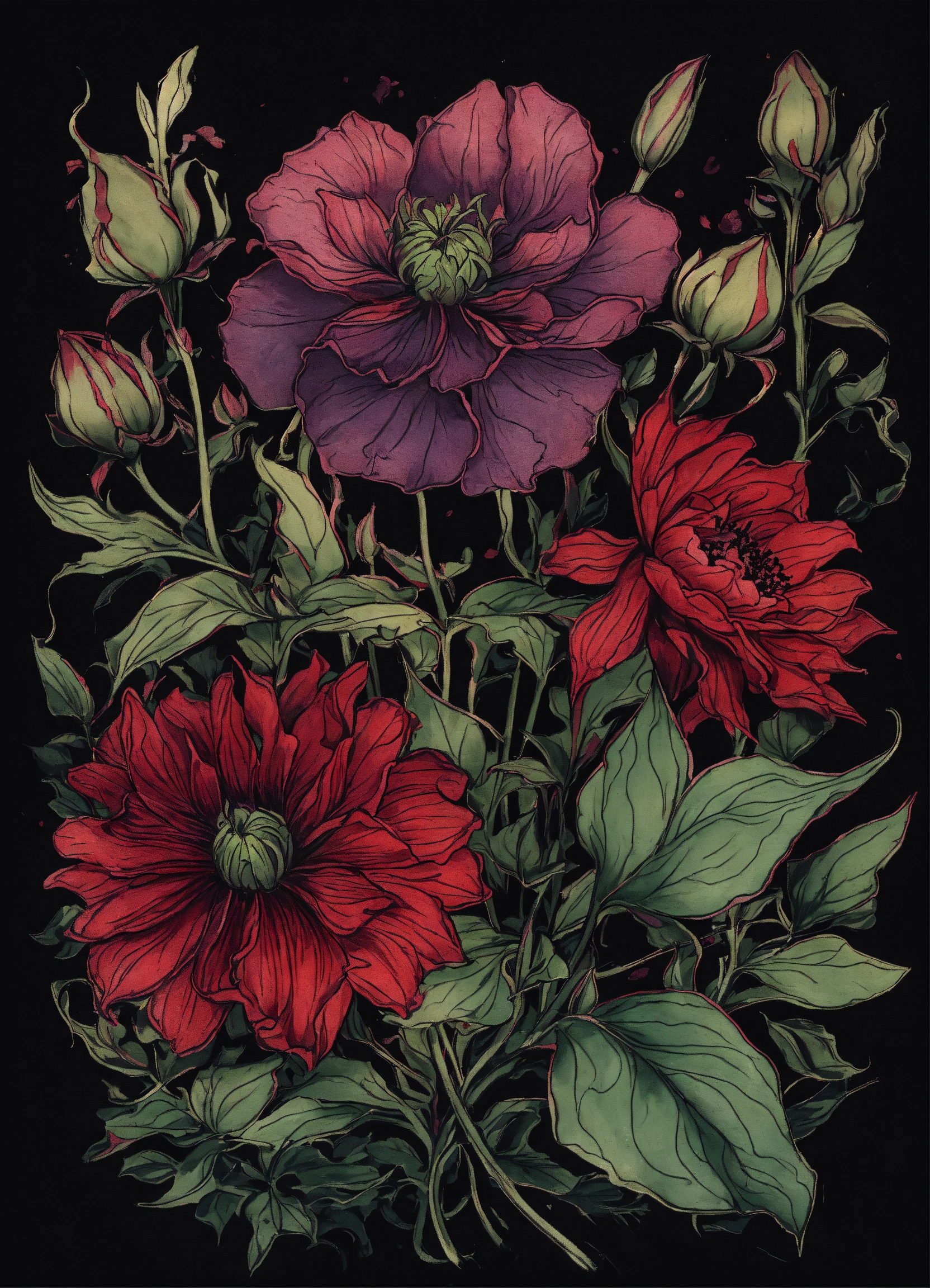 T shirt graphic, ink drawing tattoo, gothic style image of faded flowers in dark muted green, purple and red with stems and leaves entwined into black background