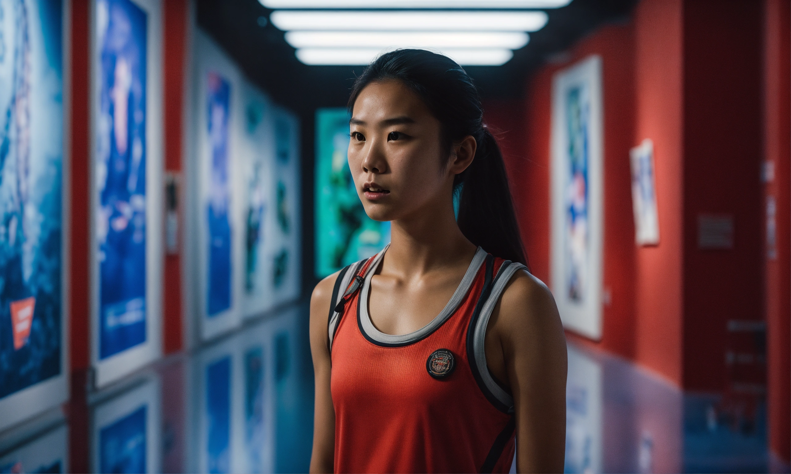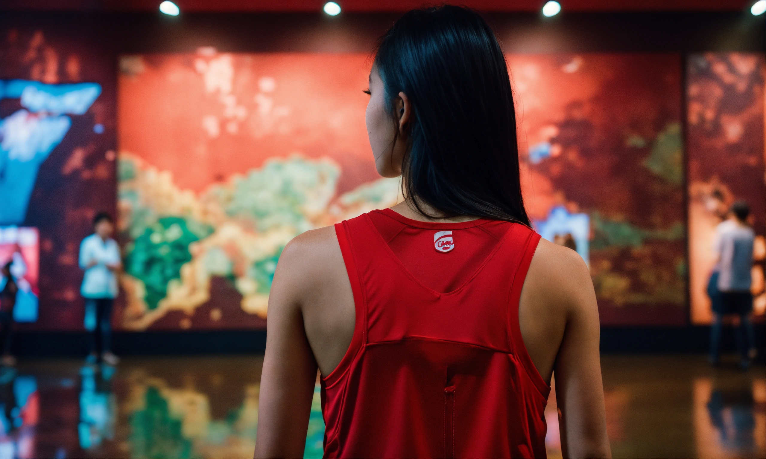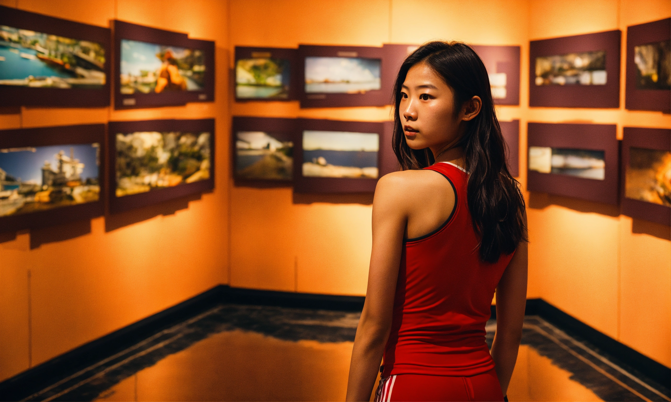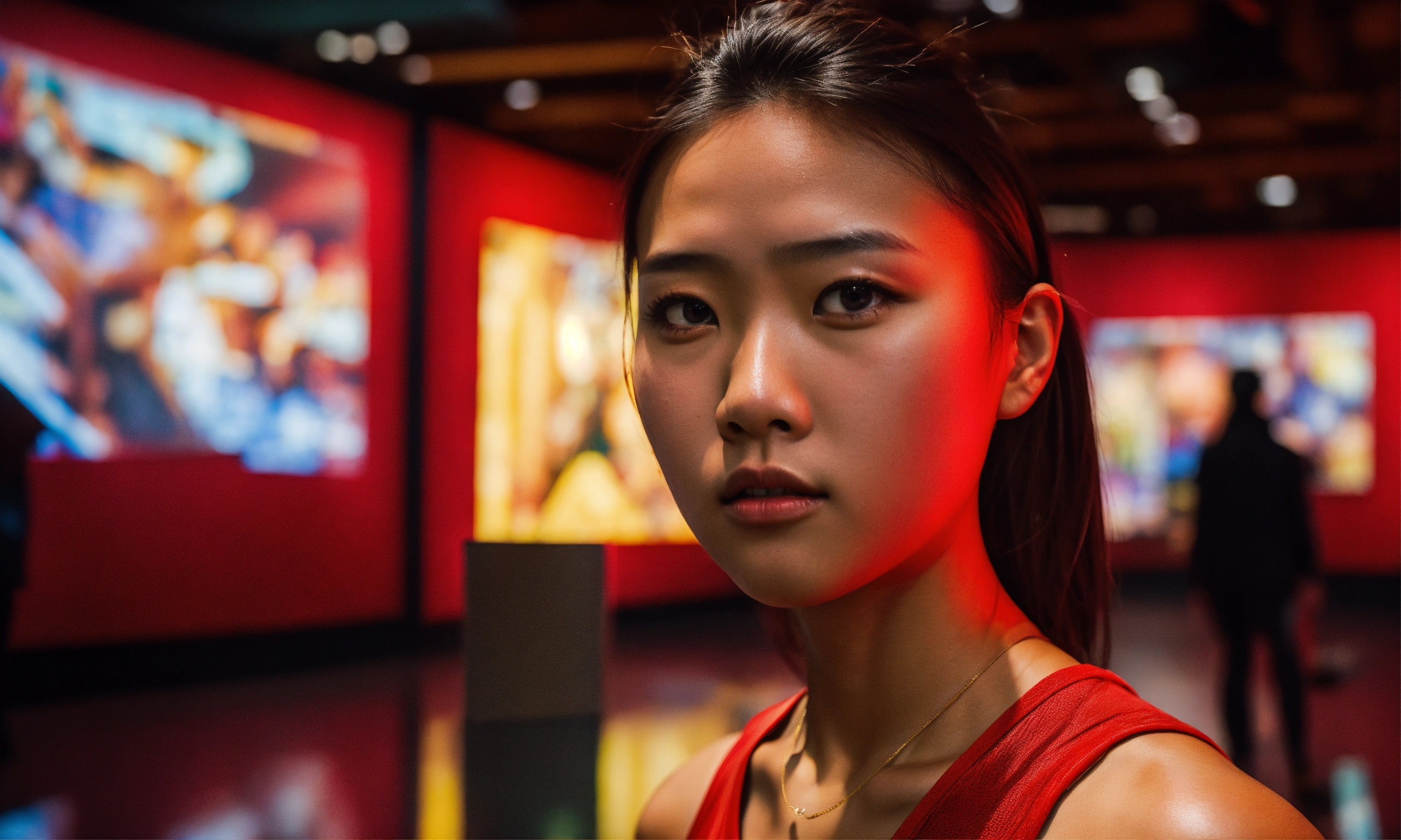 Ultra-realistic back medium shot of a tanned 18-year old asian female athlete, surprise expression, plain red singlet in a next-gen museum in singapore, in a room with highly detailed augmented reality screen as walls playing a fishing village, sci-fi, modern nostalgia, breathtaking, highly detailed, cinematic, 70mm camera, portra 800 film, film grain, reflections on glossy museum floor
