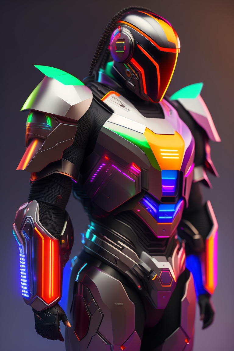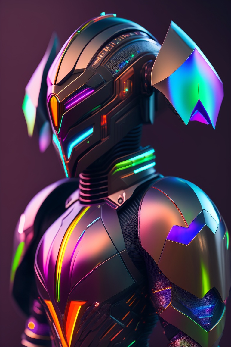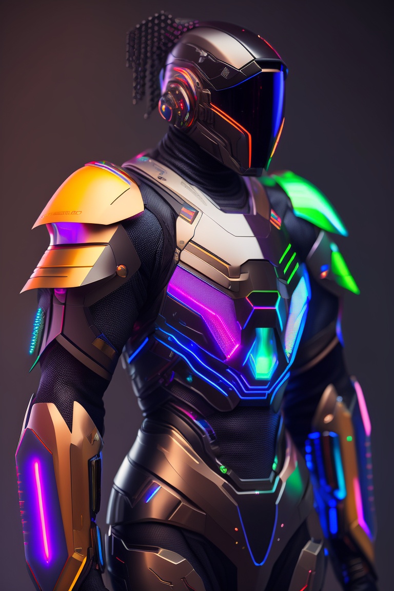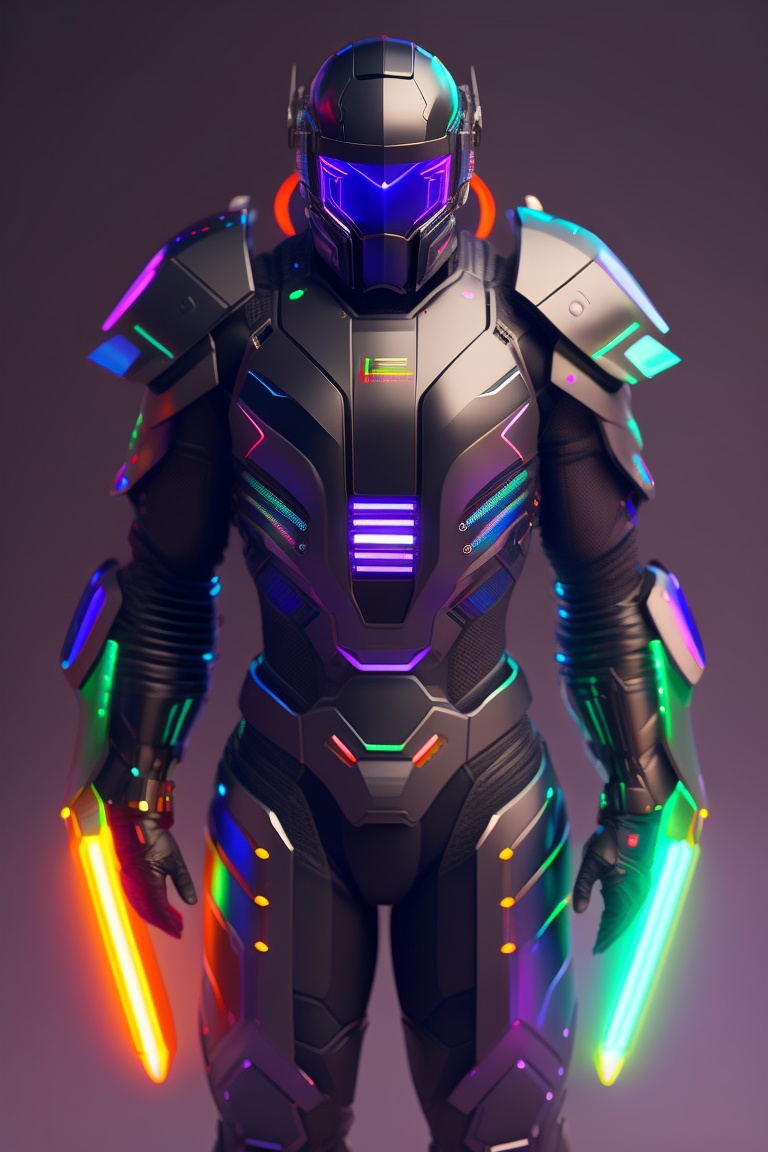A photograph of a cyberpunk armour made of black titanium and some crystal, rgb leds rainbow, power suit, gradient, crystal, visible wires and microchip, holograph, crystal transparent torso, imposing, elegant, for men, modern minimalism, low poly lines, glitch core, dreamy, colorful, dystopia, godlike, mysterious