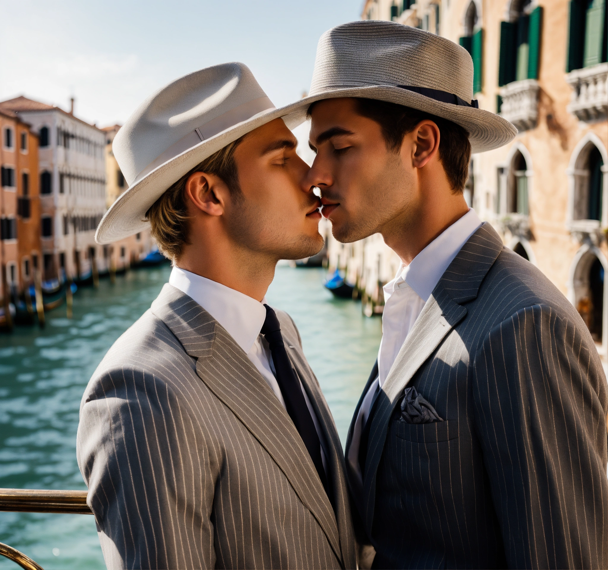 Two young blonde businessmen in light grey pinstripe suit, white borsalino hat, kissing on a balcony in venice